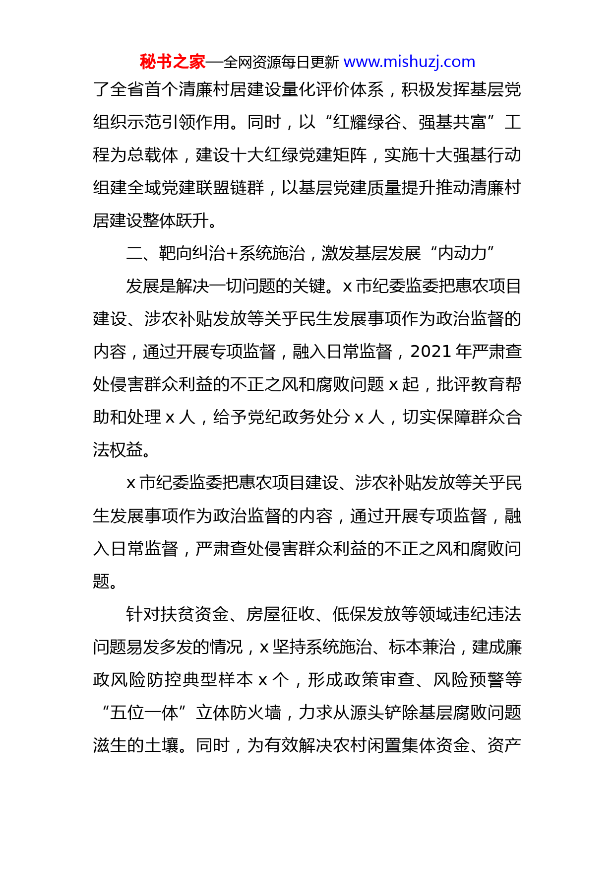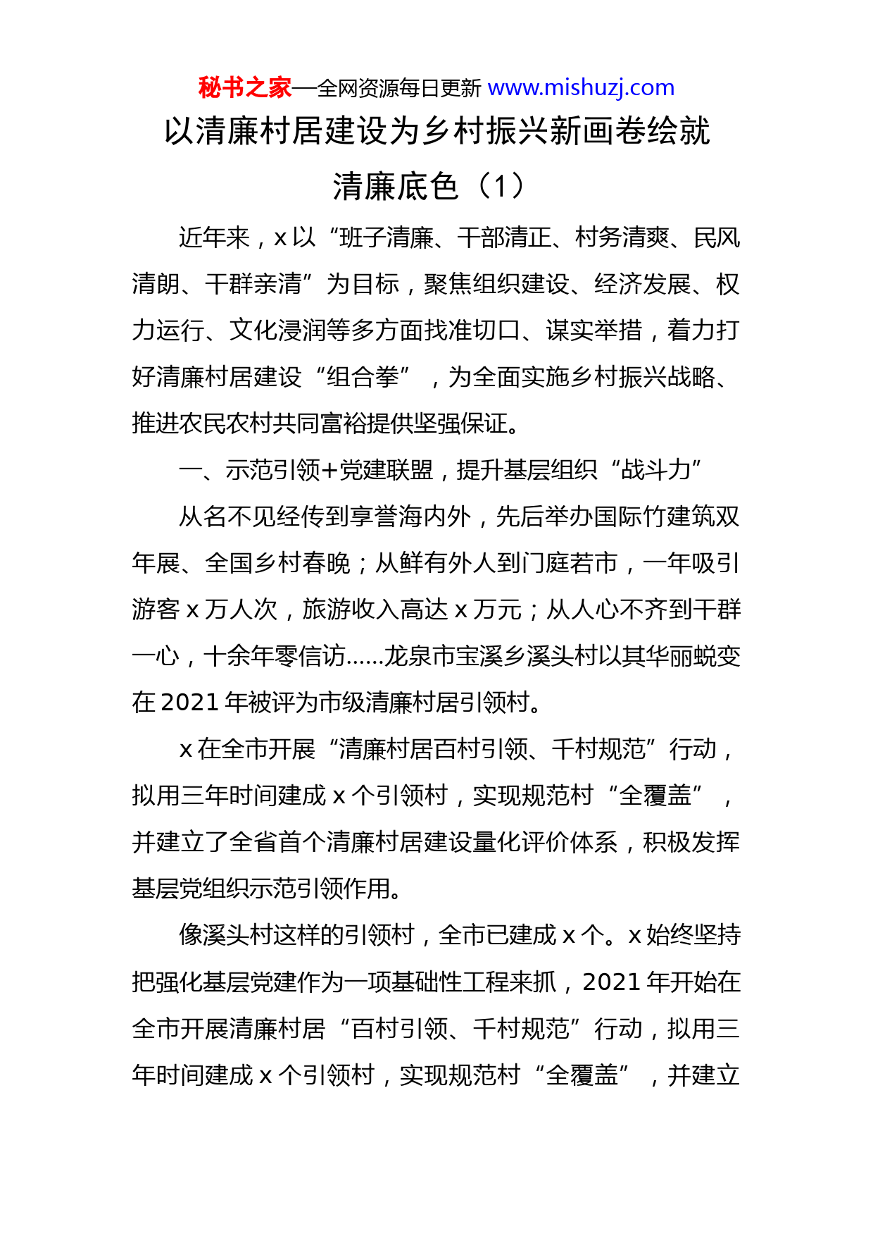 秘书之家—全网资源每日更新www.mishuzj.com以清廉村居建设为乡村振兴新画卷绘就清廉底色(1)近年来,x以“班子清廉、干部清正、村务清爽、民风清朗、干群亲清”为目标,聚焦组织建设、经济发展、权力运行、文化浸润等多方面找准切口、谋实举措,着力打好清廉村居建设“组合拳”,为全面实施乡村振兴战略、推进农民农村共同富裕提供坚强保证。一、示范引领+党建联盟,提升基层组织“战斗力”从名不见经传到享誉海内外,先后举办国际竹建筑双年展、全国乡村春晚;从鲜有外人到门庭若市,一年吸引游客x万人次,旅游收入高达x万元;从人心不齐到干群一心,十余年零信访……龙泉市宝溪乡溪头村以其华丽蜕变在2021年被评为市级清廉村居引领村。x在全市开展“清廉村居百村引领、千村规范”行动,拟用三年时间建成x个引领村,实现规范村“全覆盖”,并建立了全省首个清廉村居建设量化评价体系,积极发挥基层党组织示范引领作用。像溪头村这样的引领村,全市已建成x个。x始终坚持把强化基层党建作为一项基础性工程来抓,2021年开始在全市开展清廉村居“百村引领、千村规范”行动,拟用三年时间建成x个引领村,实现规范村“全覆盖”,并建立秘书之家—全网资源每日更新www.mishuzj.com了全省首个清廉村居建设量化评价体系,积极发挥基层党组织示范引领作用。同时,以“红耀绿谷、强基共富”工程为总载体,建设十大红绿党建矩阵,实施十大强基行动组建全域党建联盟链群,以基层党建质量提升推动清廉村居建设整体跃升。二、靶向纠治+系统施治,激发基层发展“内动力”发展是解决一切问题的关键。x市纪委监委把惠农项目建设、涉农补贴发放等关乎民生发展事项作为政治监督的内容,通过开展专项监督,融入日常监督,2021年严肃查处侵害群众利益的不正之风和腐败问题x起,批评教育帮助和处理x人,给予党纪政务处分x人,切实保障群众合法权益。x市纪委监委把惠农项目建设、涉农补贴发放等关乎民生发展事项作为政治监督的内容,通过开展专项监督,融入日常监督,严肃查处侵害群众利益的不正之风和腐败问题。针对扶贫资金、房屋征收、低保发放等领域违纪违法问题易发多发的情况,x坚持系统施治、标本兼治,建成廉政风险防控典型样本x个,形成政策审查、风险预警等“五位一体”立体防火墙,力求从源头铲除基层腐败问题滋生的土壤。同时,为有效解决农村闲置集体资金、资产秘书之家—全网资源每日更新www.mishuzj.com和资源增值利用难等制约基层发展的“老问题”,x在全市开展村集体债务专项化解、村集体大额资金存管专项治理盘活农村集体资金资产x亿元。三、流程再造+数字赋能,强化基层监督“管束力”“按照这张小微权力流程图,我们仅用42天就帮助x户农户完成建房审批放样,让农户早日开工建房,解了他们的燃眉之急。”松阳县裕溪乡驻村干部小李说。为规范基层权力运行和监督制约,x持续对村级小微权力流程再造、迭代升级,已梳理绘制“三资”管理、项目监管等x张流程图,让干部照图用权、群众照图监督,放大“公生明、廉生威”的综合效应。x市各级纪检监察机关以数字化改革为牵引,依托基层公权力大数据监督应用,努力探索监督数字化、可视化、便民化,进一步推动下沉监督、精准监督。数字化改革浪潮奔涌正盛,x在莲都区试点建立基层公权力大数据监督平台并在全市推广,有机融合公开亮晒、数据分析、廉情预警等权力监督制约措施,横向贯通了政法、民政、农业农村等x多个部门业务数据,形成了责任明晰、规范高效、智能协同的基层监督体系,荣获2021年度全省“基层公权力大数据应用”改革突破金奖。四、标准规范+本土特色,增强基层文化“浸透力”秘书之家—全网资源每日更新www.mishuzj.com今年5月,全国首个清廉村居建设市级地方规范在x“新鲜出炉”。该标准以x大体系为支撑、x项运行流程为规范、x项内容为履职红线,为清廉村居建设全域推进提供了有力技术支撑和指导,推动清廉思想、清廉规则在广大农村基层化风成俗、成为文化,成为涵养政治生态和自然生态两个“绿水青山”的源头活水。x把廉洁文化全面融入百姓生活,致力将“清廉村晚”打造成群众家门口的“廉洁文化节”,让清廉成为基层群众欢庆佳节的标配,寓教于乐,成风化人。百花齐放才是春。x鼓励各地在标准化基础上,深挖提炼本地传统文化、家风文化、红色文化中的清廉元素,培育更具本土特色的乡土廉洁文化。庆元县举水乡将“廉洁文化进村晚”融入月山春晚,以百姓喜闻乐见的文化载体记录新时代村居小康生活新图景,弘扬廉荣贪耻、积极向善的价值理念。清廉村居建设是全面从严治党向基层延伸的有力抓手,是顺民心、守民心的“秘钥良方”。接下来,我们将锲而不舍抓好清廉村居建设,牢牢抓住乡村振兴的良好机遇,持续推动村居高质量发展。x镇:打造“清廉村居”样板擦亮乡村振兴底色(2)今年以来,x镇纪委积极探索清廉村居新路径,按照秘书之家—全网资源每日更新www.mishuzj.com“政策清楚、资金清晰、项目清白、干部清正、民风清朗”的建设目标打造清廉村居样板,让清风廉意吹到村头山野,为乡村振兴注入“廉动力”。一是吹好“清廉风”。新溪村将宜居之美与清廉之风有机结合,打造清廉文化长廊,将廉画、廉廊和廉墙等廉文化