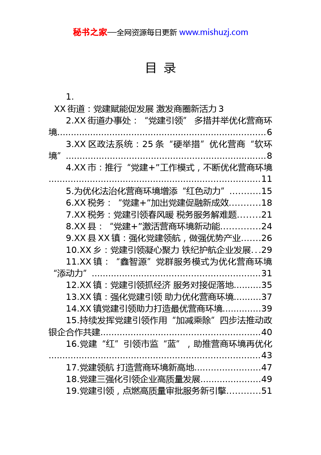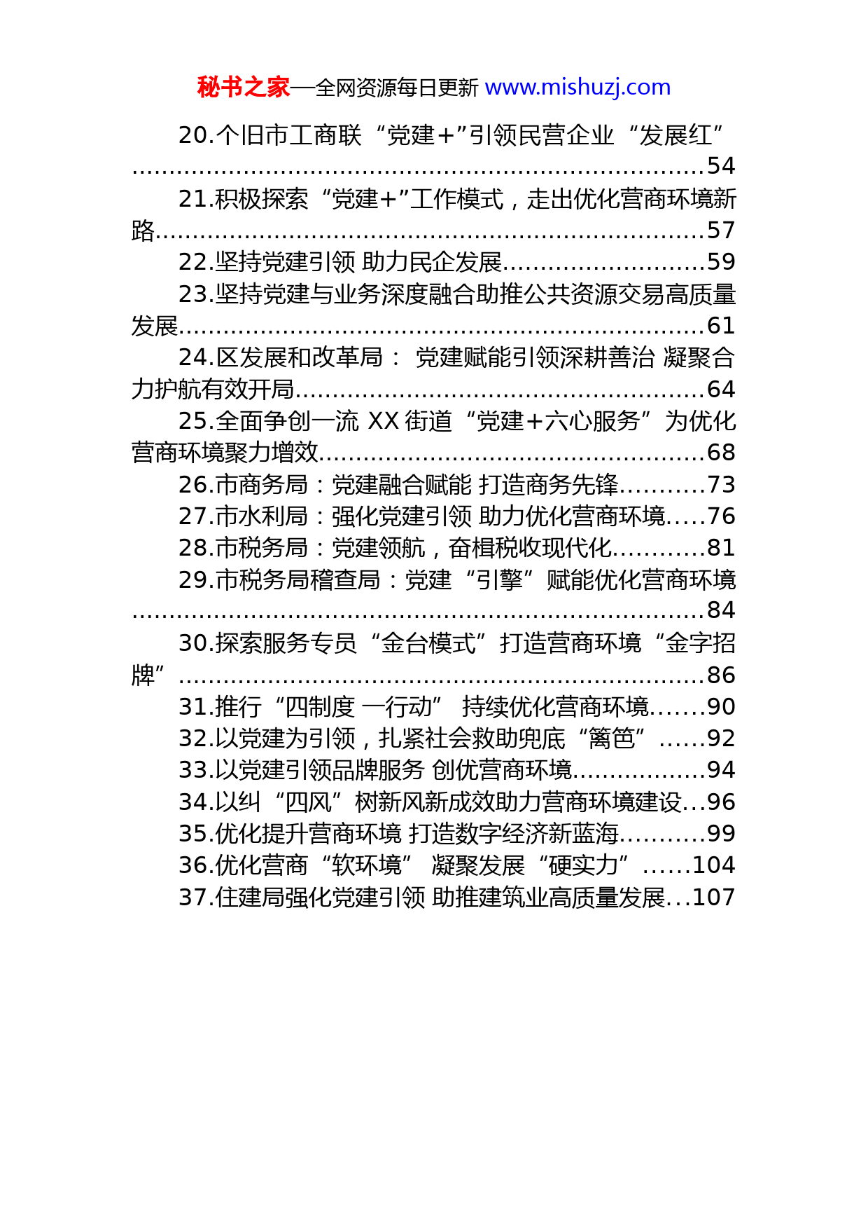 秘书之家—全网资源每日更新www.mishuzj.com目录1.XX街道:党建赋能促发展激发商圈新活力32.XX街道办事处:“党建引领”多措并举优化营商环境............................................................................63.XX区政法系统:25条“硬举措”优化营商“软环境”.........................................................................84.XX市:推行“党建+”工作模式,不断优化营商环境.............................................................................115.为优化法治化营商环境增添“红色动力”...........156.XX税务:“党建+”加出党建促融新成效...........187.XX税务:党建引领春风暖税务服务解难题........218.XX县:“党建+”激活营商环境新动能..............249.XX县XX镇:强化党建领航,做强优势产业.......2610.XX乡:党建引领凝心聚力铁纪护航企业发展...2911.XX镇:“鑫智源”党群服务模式为优化营商环境“添动力”.............................................................3112.XX镇:党建引领抓经济服务对接促落地..........3513.XX镇:强化党建引领助力优化营商环境..........3714.XX镇党建引领助力打造最优营商环境..............3915.持续发挥党建引领作用“加减乘除”四步法推动政银企合作共建..........................................................4016.党建“红”引领市监“蓝”,助推营商环境再优化.............................................................................4317.党建领航打造营商环境新高地........................4718.党建三强化引领企业高质量发展......................4919.党建引领,点燃高质量审批服务新引擎............51秘书之家—全网资源每日更新www.mishuzj.com20.个旧市工商联“党建+”引领民营企业“发展红”.............................................................................5421.积极探索“党建+”工作模式,走出优化营商环境新路..........................................................................5722.坚持党建引领助力民企发展...........................5923.坚持党建与业务深度融合助推公共资源交易高质量发展.......................................................................6124.区发展和改革局:党建赋能引领深耕善治凝聚合力护航有效开局.......................................................6425.全面争创一流XX街道“党建+六心服务”为优化营商环境聚力增效....................................................6826.市商务局:党建融合赋能打造商务先锋...........7327.市水利局:强化党建引领助力优化营商环境.....7628.市税务局:党建领航,奋楫税收现代化............8129.市税务局稽查局:党建“引擎”赋能优化营商环境.............................................................................8430.探索服务专员“金台模式”打造营商环境“金字招牌”.......................................................................8631.推行“四制度一行动”持续优化营商环境.......9032.以党建为引领,扎紧社会救助兜底“篱笆”......9233.以党建引领品牌服务创优营商环境..................9434.以纠“四风”树新风新成效助力营商环境建设...9635.优化提升营商环境打造数字经济新蓝海...........9936.优化营商“软环境”凝聚发展“硬实力”......10437.住建局强化党建引领助推建筑业高质量发展...107秘书之家—全网资源每日更新www.mishuzj.comXX街道:党建赋能促发展激发商圈新活力今年以来,XX市五华区XX街道按照区委组织部《五华区关于党建引领商业街区建设的实施方案》要求,积极探索商圈党建发展新路径,着力寻求党建工作与“商圈”发展的结合点,整合“商圈”党建资源、发挥党建引领作用,健全“四个一、两共一专、‘党建+’品牌打造”等措施,有力实现了街道党建引领商业街区建设的项目化和品牌化。党建引领促进商圈发展“零距离”建立一个“商业街区联盟”。会同商业街区内具有较强影响力的商业主体——XX顺城发展有限公司、拾翠市集等企业建立“顺城商业街区联盟”,定期召开议事协商会议,整合各方资源、协调各方力量,形成上下联动、企业参与的发展合力,着力解决街区商户生产经营中遇到的困难和问题,营造商业街区发展和谐环境。建立一个“商圈党群服务阵地”。在充分考虑拾翠文化氛围浓厚、开放性强、与其他企业联系多的基础上建立“商圈党群服务阵地”。组织开展系列主题活动。策划开展有益、有趣、有影响力的党建活动,同时联合街道总工会、团工委、妇联等群团组织助力稳企安企、留人引才。组建一支“楼宇管家服务团队”。在结合商圈实际和企业需求的基础上成立由街道班子成员示范带头任楼栋长联合辖区派出所、市场监管所、金融机构等“街道党建联盟”成员单位,组成9员入楼专门服务楼内企业,做好商圈党建的部门协调、企业落户、招商对接、人才引进等企业管理服务工作,不断开拓商圈党建工作新思路。秘书之家—全网资源每日更新www.mishuzj.com资源整合打造商圈发展“新名片”整合商圈企业资源,借助顺城购物中心、拾翠等企业策划团队优势,在中华传统佳节、顺城“会员日”等时机开展“兔befine嘉年华”“政银企联谊”“企业创意沙龙”“大有可观·春享春宴暨AR之旅”等活动。依托辖区企业、楼宇等场地资源,形成金融业党建联盟党群服务中心、金领党群服务中心等多阵地共同发力、覆盖辖区各领域、各行业企业的党群服务网,为“两新”党组织、企业提供一个政治学习、沟通交流、畅谈发