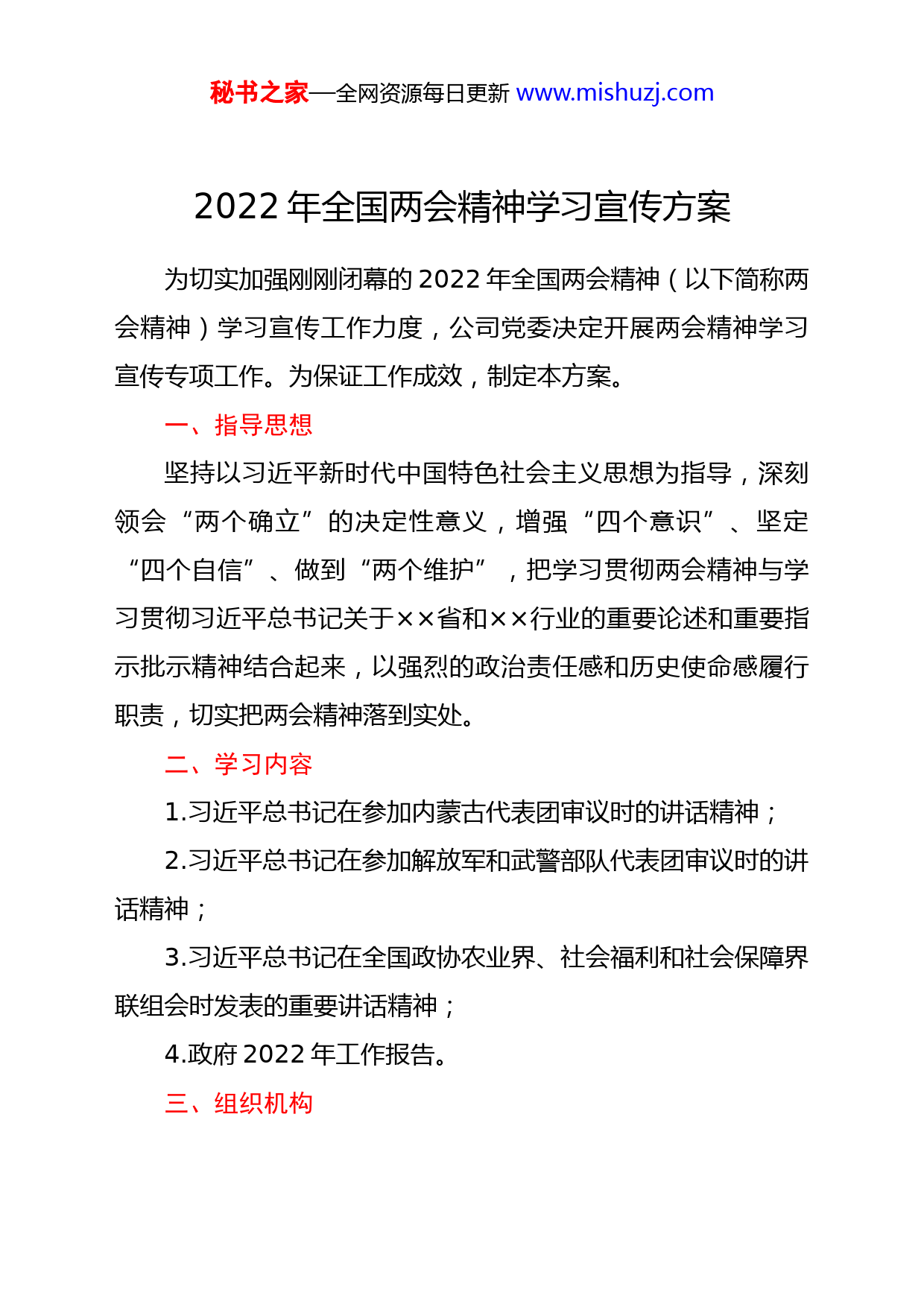 秘书之家—全网资源每日更新www.mishuzj.com2022年全国两会精神学习宣传方案为切实加强刚刚闭幕的2022年全国两会精神(以下简称两会精神)学习宣传工作力度,公司党委决定开展两会精神学习宣传专项工作。为保证工作成效,制定本方案。一、指导思想坚持以习近平新时代中国特色社会主义思想为指导,深刻领会“两个确立”的决定性意义,增强“四个意识”、坚定“四个自信”、做到“两个维护”,把学习贯彻两会精神与学习贯彻习近平总书记关于××省和××行业的重要论述和重要指示批示精神结合起来,以强烈的政治责任感和历史使命感履行职责,切实把两会精神落到实处。二、学习内容1.习近平总书记在参加内蒙古代表团审议时的讲话精神;2.习近平总书记在参加解放军和武警部队代表团审议时的讲话精神;3.习近平总书记在全国政协农业界、社会福利和社会保障界联组会时发表的重要讲话精神;4.政府2022年工作报告。三、组织机构秘书之家—全网资源每日更新www.mishuzj.com成立两会精神学习宣传工作领导小组。组长:党委书记副组长:党委副书记成员:党委办、组织部、宣传部、纪委办负责人领导小组下设办公室,办公室设在宣传部,成员包括党委办、组织部、宣传部、纪委办有关人员。办公室负责两会精神学习宣传工作的总体部署、推进、跟踪、督导。四、工作内容(一)全方位开展两会精神宣传工作。各党支部要将两会精神学习宣传工作作为上半年党的建设和宣传思路领域的一项重点工作,加强组织发动,鼓励广大员工积极参与,主动学习。一是组织开展两会精神巡回宣讲,对照习近平总书记重要讲话精神和政府工作报告,开展有针对性的讲解宣传;二是采取悬挂海报、制作条幅、发布微信公众号、发布短视频等方式,开展内容丰富、形式多样的宣传活动,扩大宣传面;三是公司班子成员利用参加安全活动、党建联系点活动等机会,深入厂区、深入一线、深入班组开展两会精神宣传,提高员工对两会精神的理解和掌握深度。(二)组织开展会议精神专题学习。坚持两会精神学习面向领导、面向基层、面向班组、面向员工,实现全覆盖、无死秘书之家—全网资源每日更新www.mishuzj.com角。一是切实加强领导干部培训教育,领导班子以中心组集中(扩大)学习和“第一议题”形势加强学习,开展面向全体中层干部的集中培训,推动发挥“头雁效应”;二是切实加强全员培训教育,宣传部编制《2022年全国两会精神学习手册》,各单位、各党支部要用好班前班后会、“三会一课”等载体开展学习,每名员工、党员撰写心得体会;三是通过组织参加上级部门的培训、集中专题学习等方式,加强党务工作者、机关管理人员等群体的学习,充分领会总书记重要讲话精神和我国2022年政策导向,提升研究政策、落实到位、促进公司高质量发展的能力。(三)不断创新宣传学习培训形式。充分运用宣传平台,用足内外部资源,全方位开展两会精神的学习培训。一是开展“五个必由之路”专题研讨和主题征文活动,引领全体党员、全体干部职工进一步强化创新理论武装。二是将两会精神纳入网络学堂内容和知识竞赛题库,提高宣贯学习成效;三是指导各基层党组织结合自身特点,采用“自选动作”推进学习宣传工作,选择有创新、有实效的措施在公司系统内进行推广。五、工作要求1.牢牢把握学习重点。在两会期间,习近平总书记就铸牢中华民族共同体意识、统筹抓好疫情防控和经济社会发展、提秘书之家—全网资源每日更新www.mishuzj.com高农业综合生产能力、推动社会保障事业高质量发展、贯彻依法治军战略等作出一系列重要指示,特别是“五个必由之路”“五个有利条件”的重大论断,思想深邃、内涵丰富,为我们提供了行动指南。各党支部要紧紧围绕学习重点,按要求开展学习宣传工作。2.系统谋划抓好落实。各党支部要高度重视两会精神的学习宣贯工作,将学习宣贯工作纳入支部年度重点工作,研究制定学习宣贯活动的具体措施,不折不扣抓好落实,确保两会精神学习宣传工作高标准、严要求。要结合公司党委《党建工作要点》《宣传思想工作要点》等要求,确保将两会精神学习宣贯与党的建设各项工作同步策划、同步开展,不断提升工作的统筹性。3.不断提升学习实效。各党支部要通过学习,引导全体干部职工提高政治站位、全面对标看齐,统筹“两个大局”,胸怀“国之大者”,坚决把思想和行动统一到习近平总书记重要讲话和全国两会精神上来,进一步领会习近平总书记对××省和××行业的重要论述和重要指示批示精神,提升扎实做好本职工作的主动性和责任感,汇聚推动公司完成年度各项目标任务的精神力量。