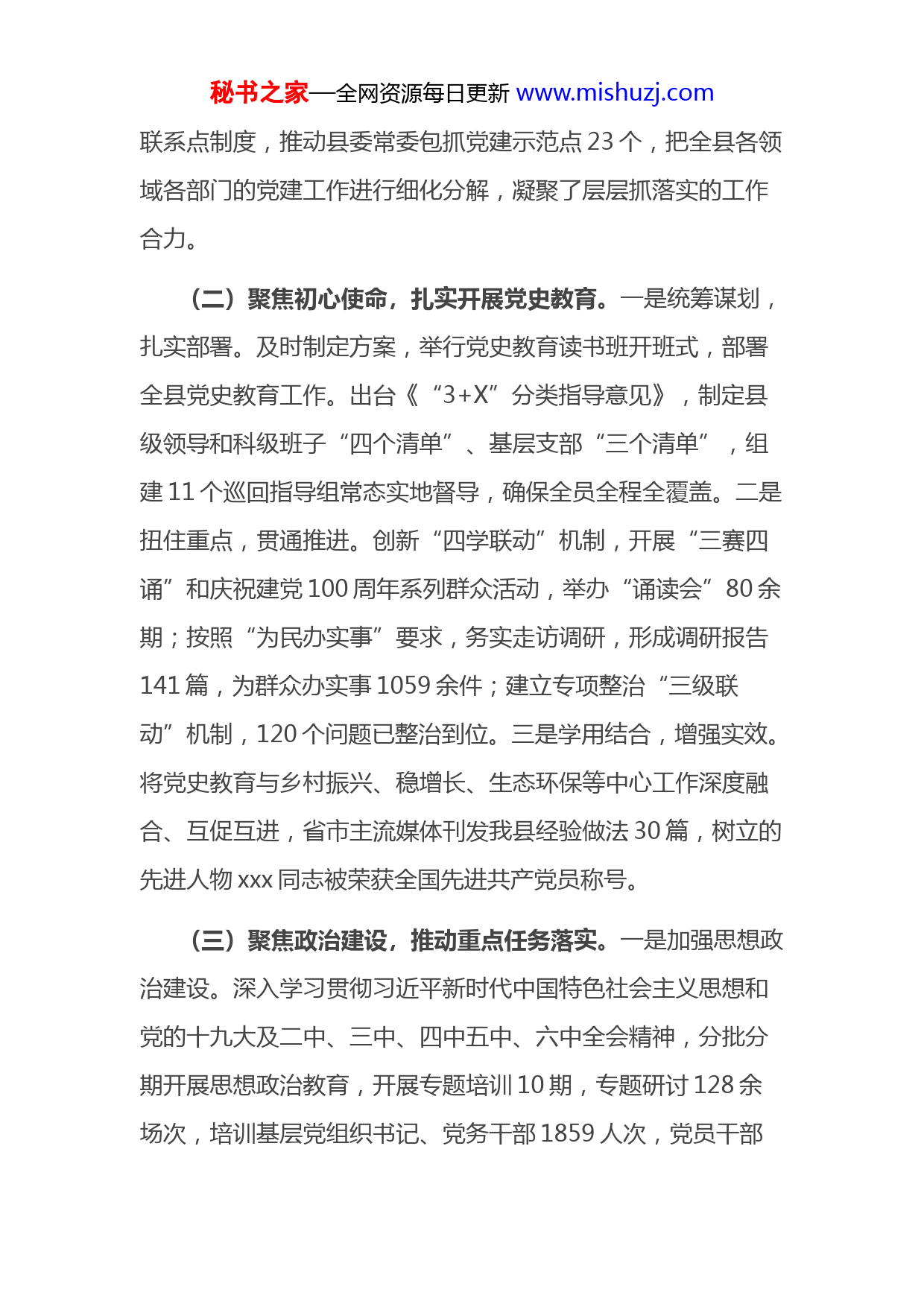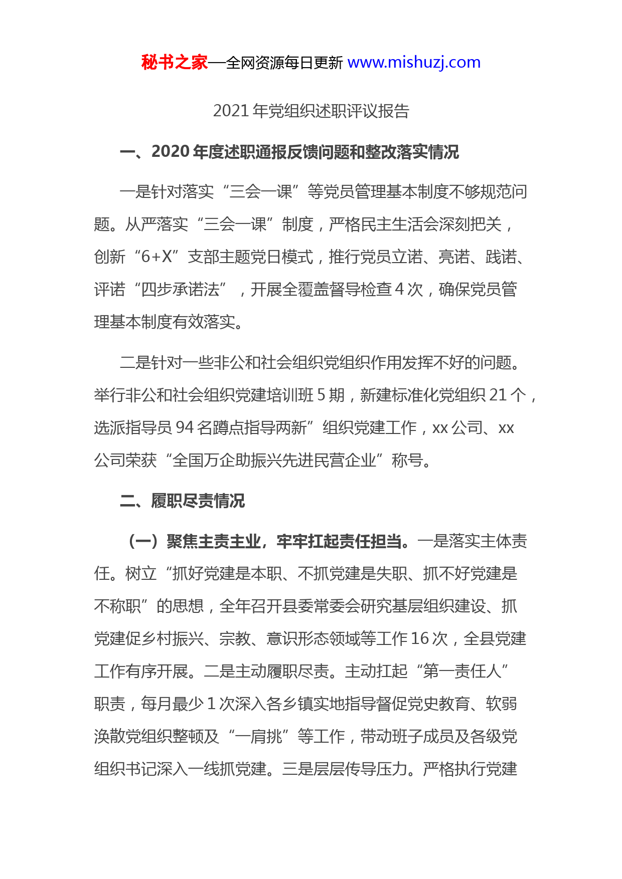 秘书之家—全网资源每日更新www.mishuzj.com2021年党组织述职评议报告一、2020年度述职通报反馈问题和整改落实情况一是针对落实“三会一课”等党员管理基本制度不够规范问题。从严落实“三会一课”制度,严格民主生活会深刻把关,创新“6+X”支部主题党日模式,推行党员立诺、亮诺、践诺、评诺“四步承诺法”,开展全覆盖督导检查4次,确保党员管理基本制度有效落实。二是针对一些非公和社会组织党组织作用发挥不好的问题。举行非公和社会组织党建培训班5期,新建标准化党组织21个,选派指导员94名蹲点指导两新”组织党建工作,xx公司、xx公司荣获“全国万企助振兴先进民营企业”称号。二、履职尽责情况(一)聚焦主责主业,牢牢扛起责任担当。一是落实主体责任。树立“抓好党建是本职、不抓党建是失职、抓不好党建是不称职”的思想,全年召开县委常委会研究基层组织建设、抓党建促乡村振兴、宗教、意识形态领域等工作16次,全县党建工作有序开展。二是主动履职尽责。主动扛起“第一责任人”职责,每月最少1次深入各乡镇实地指导督促党史教育、软弱涣散党组织整顿及“一肩挑”等工作,带动班子成员及各级党组织书记深入一线抓党建。三是层层传导压力。严格执行党建秘书之家—全网资源每日更新www.mishuzj.com联系点制度,推动县委常委包抓党建示范点23个,把全县各领域各部门的党建工作进行细化分解,凝聚了层层抓落实的工作合力。(二)聚焦初心使命,扎实开展党史教育。一是统筹谋划,扎实部署。及时制定方案,举行党史教育读书班开班式,部署全县党史教育工作。出台《“3+X”分类指导意见》,制定县级领导和科级班子“四个清单”、基层支部“三个清单”,组建11个巡回指导组常态实地督导,确保全员全程全覆盖。二是扭住重点,贯通推进。创新“四学联动”机制,开展“三赛四诵”和庆祝建党100周年系列群众活动,举办“诵读会”80余期;按照“为民办实事”要求,务实走访调研,形成调研报告141篇,为群众办实事1059余件;建立专项整治“三级联动”机制,120个问题已整治到位。三是学用结合,增强实效。将党史教育与乡村振兴、稳增长、生态环保等中心工作深度融合、互促互进,省市主流媒体刊发我县经验做法30篇,树立的先进人物xxx同志被荣获全国先进共产党员称号。(三)聚焦政治建设,推动重点任务落实。一是加强思想政治建设。深入学习贯彻习近平新时代中国特色社会主义思想和党的十九大及二中、三中、四中五中、六中全会精神,分批分期开展思想政治教育,开展专题培训10期,专题研讨128余场次,培训基层党组织书记、党务干部1859人次,党员干部秘书之家—全网资源每日更新www.mishuzj.com“四个意识”更加牢固。二是严肃党内政治生活。及时叫停3乡镇和4个部门专题民主生活会,以普通党员身份参加所在支部和包联支部组织生活会4次,督促各级党组织按要求开展“三会一课”,推行“按月缴纳党费、重温入党誓词、学政治理论、微党课思想发动、党员建言献策+自选动作”的开放式支部主题党日,党内政治生活更加规范严肃。三是统筹推进各领域党建。一体推进八大领域党建工作,着力构建“大党建”格局。特别是以创建全省城市党建示范县为契机,制定完善“五联共建”、社区工作者职业体系建设等多项配套制度,创建市级城市党建示范社区2个、新创建五星级非公企业和社会组织党组织7个。四是从严党员发展管理。严格党员发展程序,从农民青年、基层一线、两新组织和退伍军人中新发展党员228名。采取“1234”工作举措(一本台账明“家底”、两本书籍送“食粮”、三个平台畅渠道、四项活动做贡献),流动党员管理更加规范。(四)聚焦强基固本,抓好五件实事硬事。一是扎实开展“党旗引领振兴路”主题实践活动。新建产业党组织22个,新选拔41名优秀党员担任支部书记,5名村干部被录用为公务员,引导带动2432户贫困户年均增收5000元以上,全市“党旗引领振兴路”主题实践活动现场会在我县召开。二是强化支部标准化建设。按照党组织标准化建设要求,深入实施“瘦身下秘书之家—全网资源每日更新www.mishuzj.com墙”行动,新建农村标准化示范点28个,示范带动全县各领域党支部标准化建设达到88%,新创建达标党支部301个。三是大力整顿软弱涣散党组织。结合“扫黑除恶”专项斗争,认真落实软弱涣散党组织整顿“四步走”,排查清理35人,全面整顿软弱涣散党组织15个。四是全面推动村级正职“一肩挑”。以村“两委”换届为契机,采取“八个一”措施,加快推进村党支部书记、主任“一肩挑”工作,全县201个村(社区)“一肩挑”实现全覆盖。五是持续发展壮大集体经济。深化“党支部+‘三变’改革”模式,145名村支书带头领办集体经济组织,新发展合作社xx家,集体经济收入超10万元的村新增xx个,累计达到xx个,空壳村全部清零。(五)聚焦机制保障,激励干部担当作为。一是为基层减负松绑。聚焦精文减会、调查研究、激励问责等9个方面,系统排查具体表现,强化整治举措。今年以县委、政府名义发文同比减少x%,召开会议同期减少x%。二加强教育监督。综合运用监督执纪“四种形态”,约谈提醒党政主要领导x人,科级干部x人,停职处理x人,查处形式主义官僚主义案件x件,党纪政务处分x人。三是强化队伍管理。用足用活“三项