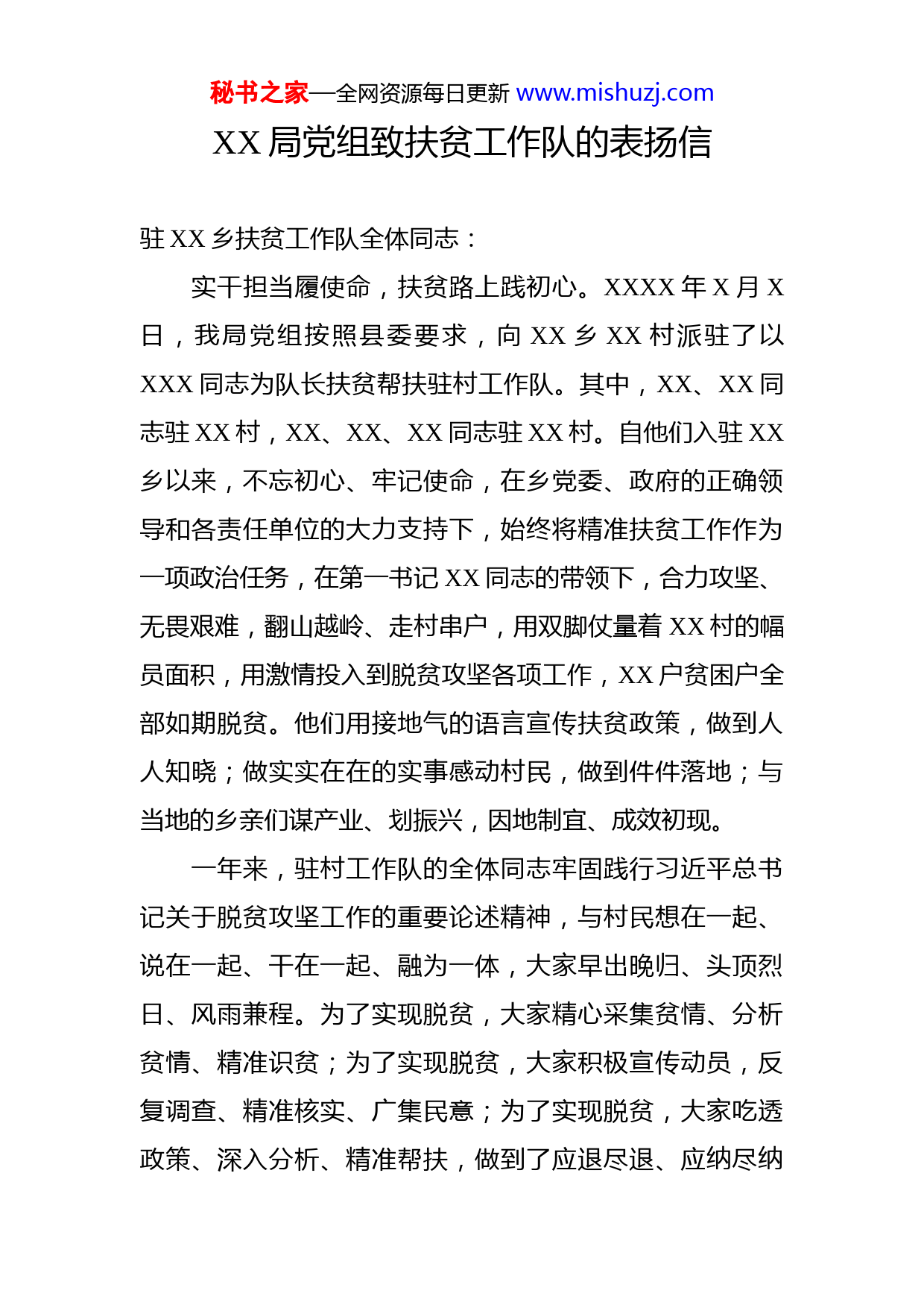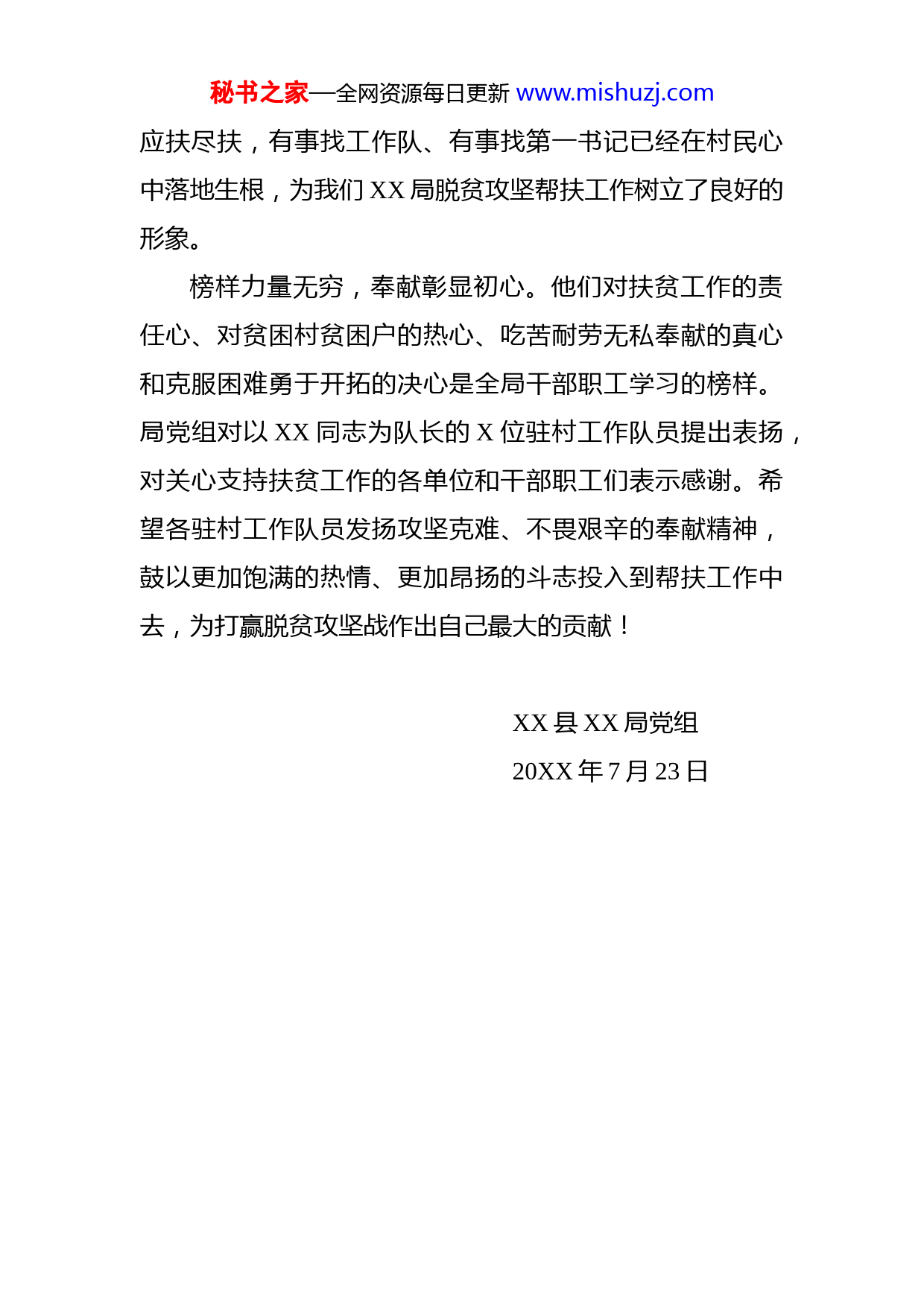 秘书之家—全网资源每日更新www.mishuzj.comXX局党组致扶贫工作队的表扬信驻XX乡扶贫工作队全体同志:实干担当履使命,扶贫路上践初心。XXXX年X月X日,我局党组按照县委要求,向XX乡XX村派驻了以XXX同志为队长扶贫帮扶驻村工作队。其中,XX、XX同志驻XX村,XX、XX、XX同志驻XX村。自他们入驻XX乡以来,不忘初心、牢记使命,在乡党委、政府的正确领导和各责任单位的大力支持下,始终将精准扶贫工作作为一项政治任务,在第一书记XX同志的带领下,合力攻坚、无畏艰难,翻山越岭、走村串户,用双脚仗量着XX村的幅员面积,用激情投入到脱贫攻坚各项工作,XX户贫困户全部如期脱贫。他们用接地气的语言宣传扶贫政策,做到人人知晓;做实实在在的实事感动村民,做到件件落地;与当地的乡亲们谋产业、划振兴,因地制宜、成效初现。一年来,驻村工作队的全体同志牢固践行习近平总书记关于脱贫攻坚工作的重要论述精神,与村民想在一起、说在一起、干在一起、融为一体,大家早出晚归、头顶烈日、风雨兼程。为了实现脱贫,大家精心采集贫情、分析贫情、精准识贫;为了实现脱贫,大家积极宣传动员,反复调查、精准核实、广集民意;为了实现脱贫,大家吃透政策、深入分析、精准帮扶,做到了应退尽退、应纳尽纳秘书之家—全网资源每日更新www.mishuzj.com应扶尽扶,有事找工作队、有事找第一书记已经在村民心中落地生根,为我们XX局脱贫攻坚帮扶工作树立了良好的形象。榜样力量无穷,奉献彰显初心。他们对扶贫工作的责任心、对贫困村贫困户的热心、吃苦耐劳无私奉献的真心和克服困难勇于开拓的决心是全局干部职工学习的榜样。局党组对以XX同志为队长的X位驻村工作队员提出表扬,对关心支持扶贫工作的各单位和干部职工们表示感谢。希望各驻村工作队员发扬攻坚克难、不畏艰辛的奉献精神,鼓以更加饱满的热情、更加昂扬的斗志投入到帮扶工作中去,为打赢脱贫攻坚战作出自己最大的贡献!XX县XX局党组20XX年7月23日