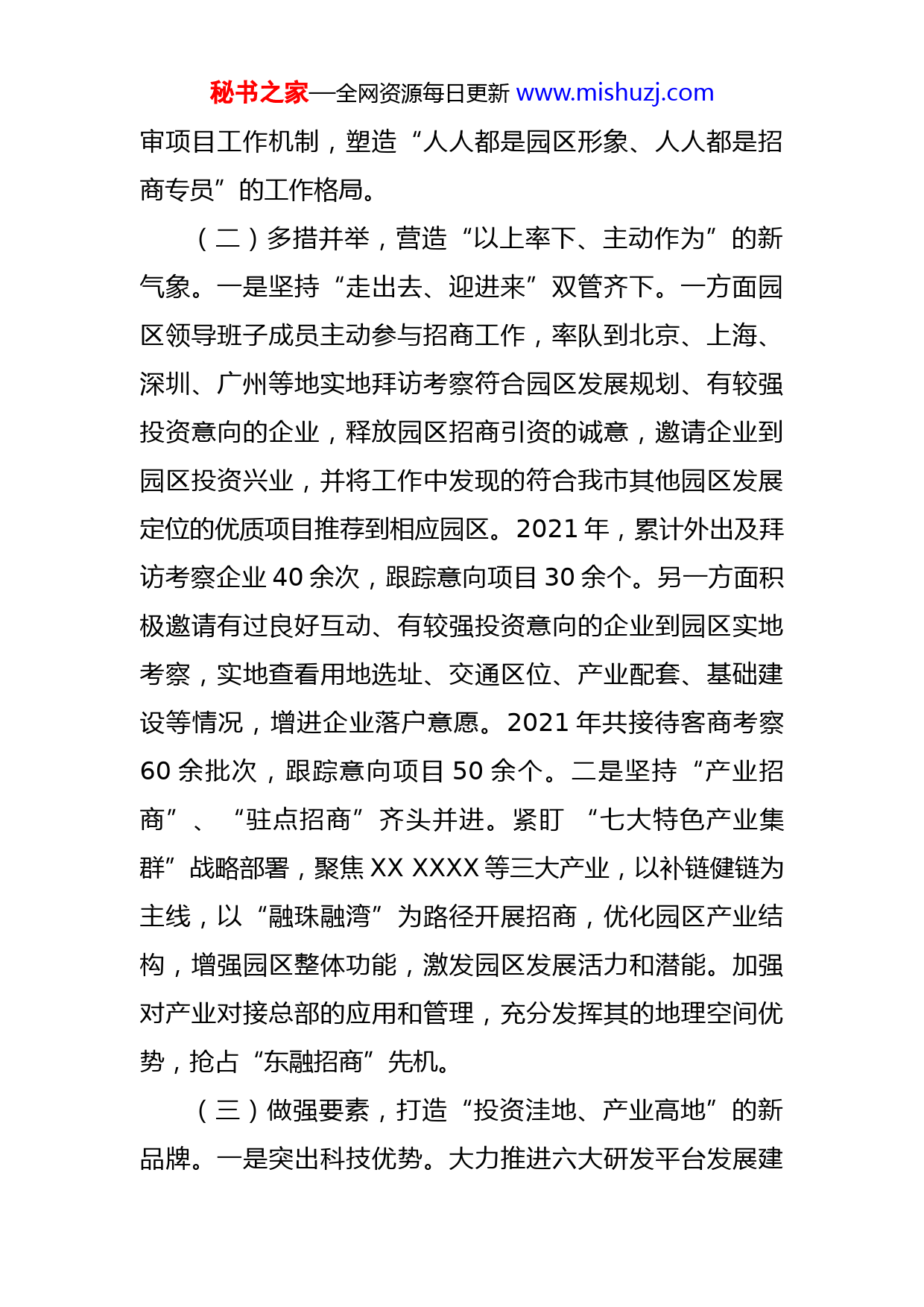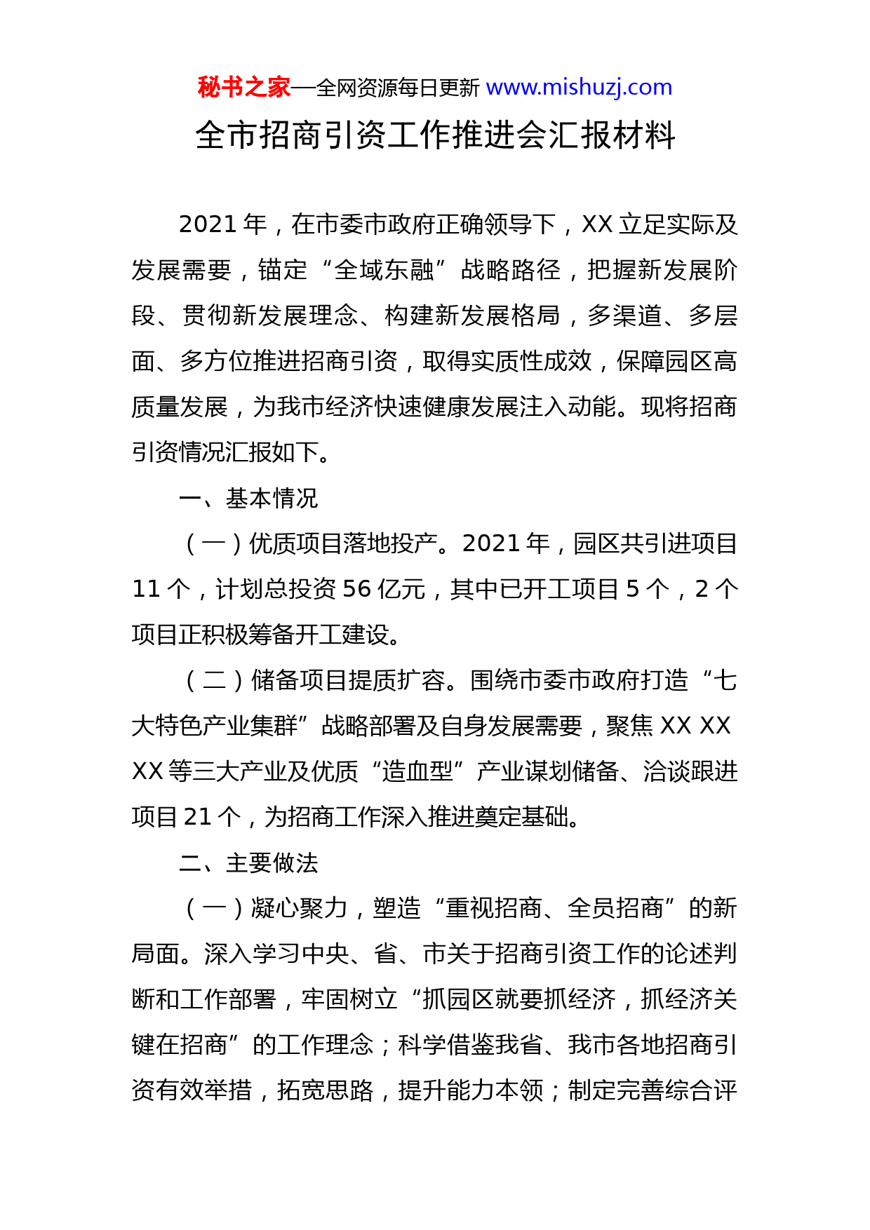秘书之家—全网资源每日更新www.mishuzj.com全市招商引资工作推进会汇报材料2021年,在市委市政府正确领导下,XX立足实际及发展需要,锚定“全域东融”战略路径,把握新发展阶段、贯彻新发展理念、构建新发展格局,多渠道、多层面、多方位推进招商引资,取得实质性成效,保障园区高质量发展,为我市经济快速健康发展注入动能。现将招商引资情况汇报如下。一、基本情况(一)优质项目落地投产。2021年,园区共引进项目11个,计划总投资56亿元,其中已开工项目5个,2个项目正积极筹备开工建设。(二)储备项目提质扩容。围绕市委市政府打造“七大特色产业集群”战略部署及自身发展需要,聚焦XXXXXX等三大产业及优质“造血型”产业谋划储备、洽谈跟进项目21个,为招商工作深入推进奠定基础。二、主要做法(一)凝心聚力,塑造“重视招商、全员招商”的新局面。深入学习中央、省、市关于招商引资工作的论述判断和工作部署,牢固树立“抓园区就要抓经济,抓经济关键在招商”的工作理念;科学借鉴我省、我市各地招商引资有效举措,拓宽思路,提升能力本领;制定完善综合评秘书之家—全网资源每日更新www.mishuzj.com审项目工作机制,塑造“人人都是园区形象、人人都是招商专员”的工作格局。(二)多措并举,营造“以上率下、主动作为”的新气象。一是坚持“走出去、迎进来”双管齐下。一方面园区领导班子成员主动参与招商工作,率队到北京、上海、深圳、广州等地实地拜访考察符合园区发展规划、有较强投资意向的企业,释放园区招商引资的诚意,邀请企业到园区投资兴业,并将工作中发现的符合我市其他园区发展定位的优质项目推荐到相应园区。2021年,累计外出及拜访考察企业40余次,跟踪意向项目30余个。另一方面积极邀请有过良好互动、有较强投资意向的企业到园区实地考察,实地查看用地选址、交通区位、产业配套、基础建设等情况,增进企业落户意愿。2021年共接待客商考察60余批次,跟踪意向项目50余个。二是坚持“产业招商”、“驻点招商”齐头并进。紧盯“七大特色产业集群”战略部署,聚焦XXXXXX等三大产业,以补链健链为主线,以“融珠融湾”为路径开展招商,优化园区产业结构,增强园区整体功能,激发园区发展活力和潜能。加强对产业对接总部的应用和管理,充分发挥其的地理空间优势,抢占“东融招商”先机。(三)做强要素,打造“投资洼地、产业高地”的新品牌。一是突出科技优势。大力推进六大研发平台发展建秘书之家—全网资源每日更新www.mishuzj.com设,扎实开展前瞻性基础研究和原创性技术攻关,擦亮园区“科创”名片,为招商引资提供硬核科技支撑和竞争力。二是拓展载体空间。做好892亩土地平整,推进基础设施建设,盘活园区原有产房,有效拓展园区产业承载空间。三是强化示范带动。推进XX公司上市,支持XX拓展消费市场,打造产业“链主”企业,吸引产业链其他企业集聚园区;加快推进XX等新引进项目企业发展,营造“热火朝天、生机勃勃”发展氛围,吸引更多企业落户园区。四是抓好“安全”“防疫”。始终将“安全生产”、“疫情防控”工作摆在重要位置,防在日常、抓在经常,为招商引资提供安全支撑和吸引力。五是优化营商环境。坚持“企业吹哨、部门报到”服务制度,无事不扰、有事登门,营造良好营商环境。三、存在问题一是要素保障缺乏优势。进入新时代、踏上新征程,全省各地更大力度推动招商引资,园区经济、载体、科研、人才等硬核要素相对薄弱,招商引资缺少比较优势。二是产业配套相对薄弱。除XX产业外,园区重点布局的金属智造、新材料等产业还处于产业链培育起步阶段,上下游项目相对较少,引进相关项目时缺少配套支撑,客观上存在更大难度。三是基础设施比较滞后。园区辖区及周边公寓、商秘书之家—全网资源每日更新www.mishuzj.com贸、文娱等基础配套还不完善,招商引资、招才引智缺少刚性配套支撑。四、下阶段工作计划接下来,园区将在市委市政府坚强领导下,坚持以习近平新时代中国特色社会主义思想为指导,深入学习贯彻习近平总书记系列重要讲话精神,贯彻中央、省委、市委有关会议精神,立足定位、实际及未来规划,锚定“全域东融”战略路径,抢抓时代机遇,紧盯产业链“断点”、“堵点”,全力以赴、尽锐出战推动招商引资工作开新局、出新绩、上台阶,全力打造高质量发展的示范区,为全市高质量发展贡献园区力量、彰显园区担当。(一)全力跟进储备项目。围绕项目储备库,重点跟进XXXXX等有较强投资意愿、已取得一定洽谈成果的项目,促成更多项目落地,保障招商工作取得实质成效。(二)全域东融挺进湾区。立足定位,坚定依靠帮扶,主动加强与XX市招商部门、招商团队的沟通交流,探索优化两市产业转移工作联动制度及财税分配机制,推动XX更多大项目、好项目落户园区,全力打造高端制造业的配套集聚地。(三)全心发展重点产业。紧紧围绕市委市政府打造“七大特色产业集群”战略部署,立足园区实际,聚力布局XXXXXX、及优质“造血型”项目,打造具有核心竞争秘书之家—全网资源每日更新www.mishuzj.com力和较大影响力的产业集群。(四)全线升级要素保障。一是加快载体建设。在新高速出入口连接线工程以东整合近期约8000亩、远期约20000亩开发用地,积极争取用地规模和用地指标。做