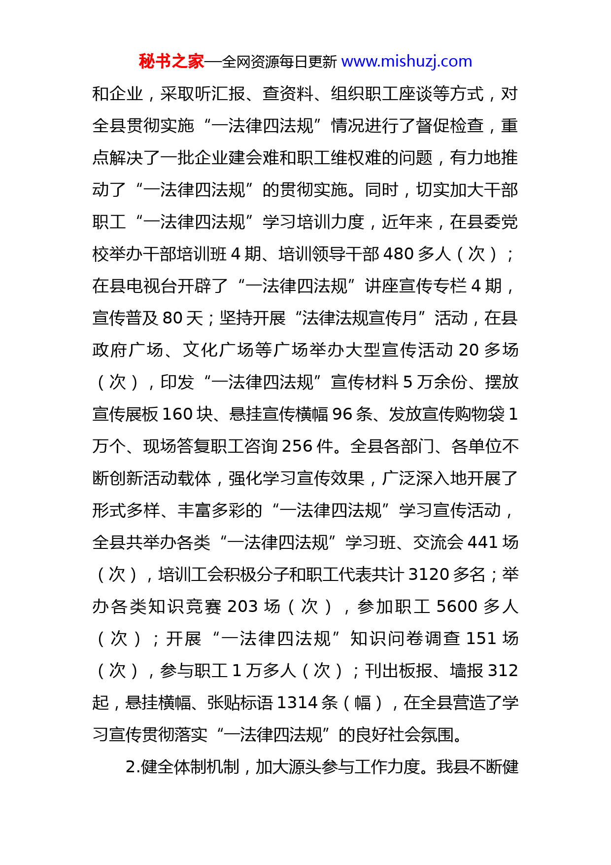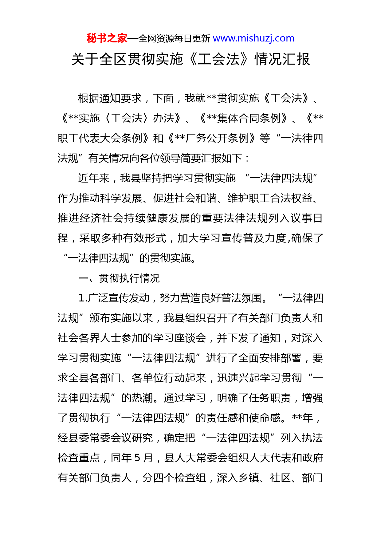 秘书之家—全网资源每日更新www.mishuzj.com关于全区贯彻实施《工会法》情况汇报根据通知要求,下面,我就贯彻实施《工会法》、《实施〈工会法〉办法》、《集体合同条例》、《职工代表大会条例》和《厂务公开条例》等“一法律四法规”有关情况向各位领导简要汇报如下:近年来,我县坚持把学习贯彻实施“一法律四法规”作为推动科学发展、促进社会和谐、维护职工合法权益、推进经济社会持续健康发展的重要法律法规列入议事日程,采取多种有效形式,加大学习宣传普及力度,确保了“一法律四法规”的贯彻实施。一、贯彻执行情况1.广泛宣传发动,努力营造良好普法氛围。“一法律四法规”颁布实施以来,我县组织召开了有关部门负责人和社会各界人士参加的学习座谈会,并下发了通知,对深入学习贯彻实施“一法律四法规”进行了全面安排部署,要求全县各部门、各单位行动起来,迅速兴起学习贯彻“一法律四法规”的热潮。通过学习,明确了任务职责,增强了贯彻执行“一法律四法规”的责任感和使命感。年,经县委常委会议研究,确定把“一法律四法规”列入执法检查重点,同年5月,县人大常委会组织人大代表和政府有关部门负责人,分四个检查组,深入乡镇、社区、部门秘书之家—全网资源每日更新www.mishuzj.com和企业,采取听汇报、查资料、组织职工座谈等方式,对全县贯彻实施“一法律四法规”情况进行了督促检查,重点解决了一批企业建会难和职工维权难的问题,有力地推动了“一法律四法规”的贯彻实施。同时,切实加大干部职工“一法律四法规”学习培训力度,近年来,在县委党校举办干部培训班4期、培训领导干部480多人(次);在县电视台开辟了“一法律四法规”讲座宣传专栏4期,宣传普及80天;坚持开展“法律法规宣传月”活动,在县政府广场、文化广场等广场举办大型宣传活动20多场(次),印发“一法律四法规”宣传材料5万余份、摆放宣传展板160块、悬挂宣传横幅96条、发放宣传购物袋1万个、现场答复职工咨询256件。全县各部门、各单位不断创新活动载体,强化学习宣传效果,广泛深入地开展了形式多样、丰富多彩的“一法律四法规”学习宣传活动,全县共举办各类“一法律四法规”学习班、交流会441场(次),培训工会积极分子和职工代表共计3120多名;举办各类知识竞赛203场(次),参加职工5600多人(次);开展“一法律四法规”知识问卷调查151场(次),参与职工1万多人(次);刊出板报、墙报312起,悬挂横幅、张贴标语1314条(幅),在全县营造了学习宣传贯彻落实“一法律四法规”的良好社会氛围。2.健全体制机制,加大源头参与工作力度。我县不断健秘书之家—全网资源每日更新www.mishuzj.com全完善体制机制,为贯彻实施“一法律四法规”奠定了坚实的基础。县委常委会每年两次听取工会工作汇报,研究解决“一法律四法规”实施过程中的困难和问题。县委将工会工作纳入基层党建目标责任与经济工作同部署、同检查、同考核,督促和推进“一法律四法规”的贯彻实施。县委先后批转下发了《关于进一步加强企业工会工作的意见》、《关于开展创建“五好四有机关工会”和“六有五好企业工会”的意见》、《关于创建“五好”县县工会的实施方案》、《关于创建“工会工作先进县县”的实施方案》等文件,指导各部门、各单位认真贯彻执行“一法律四法规”;县人大坚持每年通过开展视察、执法检查、听取专题汇报和参加工会开展的活动等形式,督促相关部门提高执法工作水平,推动落实“一法律四法规”;县政府健全完善了工会联席会议制度,不断强化各部门、各单位实施“一法律四法规”的工作职责,并坚持每年至少召开一次联席会议,研究解决涉及职工利益及工会工作中存在的困难和问题68件。同时,健全完善劳动关系三方协调机制,年,县政府办批转了《关于建立劳动关系三方协调机制的意见》,调整健全了劳动关系三方协调会议组成人员和劳动人事争议调解仲裁委员会组成人员,并将原来劳动关系三方协调会议“三方、三家”扩大到“三方、四家”(人社部门代表政府,工会组织代表职工,工信部门秘书之家—全网资源每日更新www.mishuzj.com和工商联代表企业)。县劳动关系三方协调会议研究制订了《劳动关系三方协调会议制度》,并先后召开三方协商会议63次,解决重大问题129件,有力地推动了“一法律四法规”的贯彻实施。3.突出工作重点,不断加强基层工会组织建设。我县始终坚持全心全意依靠工人阶级的方针,在加强党建工作的同时,不断加强工会组织建设工作,巩固和扩大党的执政基础。按照“先组建、后规范”的工作方式,突出建会重点、创新建会形式,使工会组建率、职工入会率稳步提高。一是理顺工会组织管理关系。按照管人、管事、管工会的原则,建立健全县总工会—乡镇、社县、系统、工业园县工会—所辖(所属)机关企事业单位工会、行业工会、基层联合工会—工会小组为主线的四级工会组织网络。按照党组织隶属管理关系和属地管理的原则,实现了乡镇、工业园县所属企业工会由乡镇、工业园县工会管理,城县党组织隶属主管局、非公有制企业党工委的企业工会由主管局系统工会和县非公有制企业党工委工会管理,其余城县企业工会由社县工会管理的全覆盖管理体制,形成了一级抓一级,层层抓落实的工作格局。二