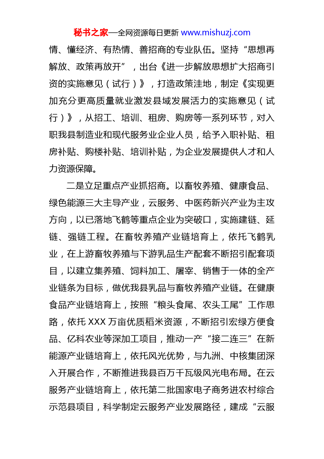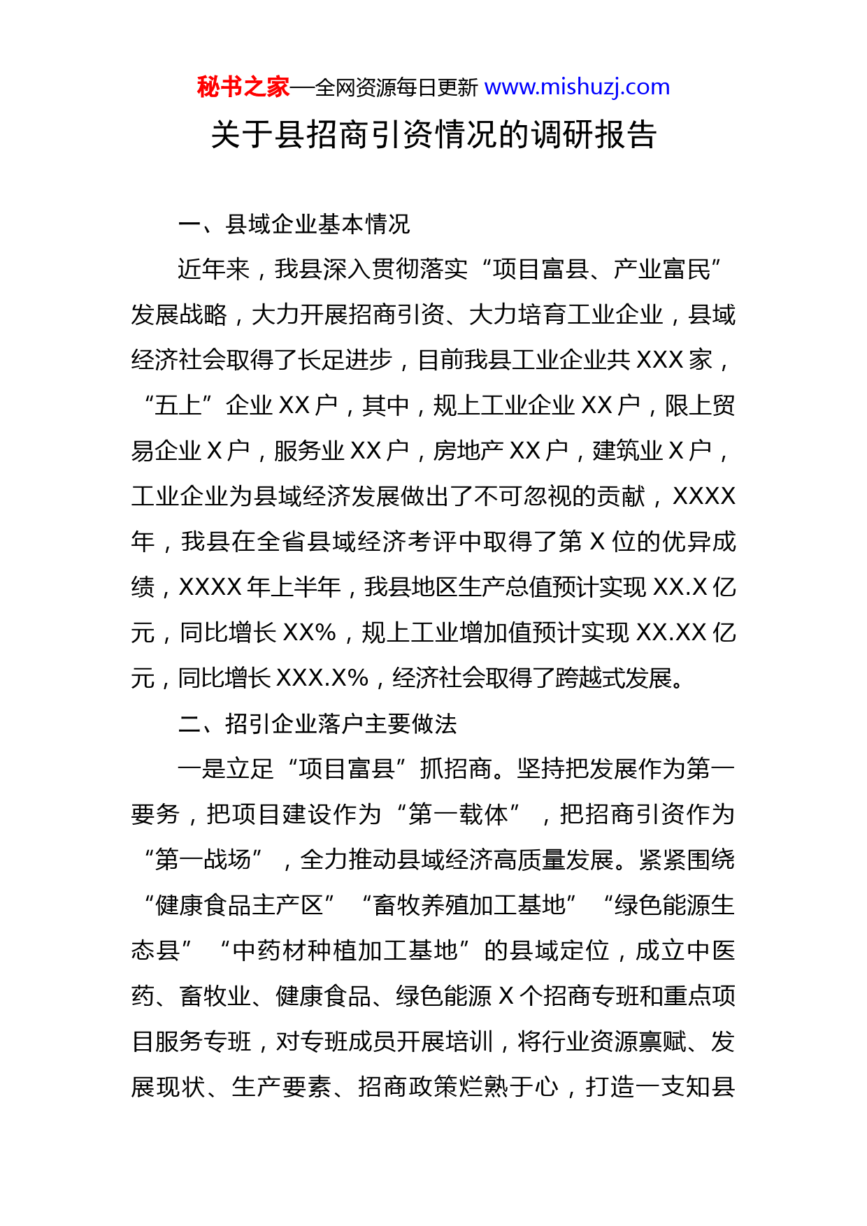 秘书之家—全网资源每日更新www.mishuzj.com关于县招商引资情况的调研报告一、县域企业基本情况近年来,我县深入贯彻落实“项目富县、产业富民”发展战略,大力开展招商引资、大力培育工业企业,县域经济社会取得了长足进步,目前我县工业企业共XXX家,“五上”企业XX户,其中,规上工业企业XX户,限上贸易企业X户,服务业XX户,房地产XX户,建筑业X户,工业企业为县域经济发展做出了不可忽视的贡献,XXXX年,我县在全省县域经济考评中取得了第X位的优异成绩,XXXX年上半年,我县地区生产总值预计实现XX.X亿元,同比增长XX%,规上工业增加值预计实现XX.XX亿元,同比增长XXX.X%,经济社会取得了跨越式发展。二、招引企业落户主要做法一是立足“项目富县”抓招商。坚持把发展作为第一要务,把项目建设作为“第一载体”,把招商引资作为“第一战场”,全力推动县域经济高质量发展。紧紧围绕“健康食品主产区”“畜牧养殖加工基地”“绿色能源生态县”“中药材种植加工基地”的县域定位,成立中医药、畜牧业、健康食品、绿色能源X个招商专班和重点项目服务专班,对专班成员开展培训,将行业资源禀赋、发展现状、生产要素、招商政策烂熟于心,打造一支知县秘书之家—全网资源每日更新www.mishuzj.com情、懂经济、有热情、善招商的专业队伍。坚持“思想再解放、政策再放开”,出台《进一步解放思想扩大招商引资的实施意见(试行)》,打造政策洼地,制定《实现更加充分更高质量就业激发县域发展活力的实施意见(试行)》,从招工、培训、租房、购房等一系列环节,对入职我县制造业和现代服务业企业人员,给予入职补贴、租房补贴、购楼补贴、培训补贴,为企业发展提供人才和人力资源保障。二是立足重点产业抓招商。以畜牧养殖、健康食品、绿色能源三大主导产业,云服务、中医药新兴产业为主攻方向,以已落地飞鹤等重点企业为突破口,实施建链、延链、强链工程。在畜牧养殖产业链培育上,依托飞鹤乳业,在上游畜牧养殖与下游乳品生产配套不断招引配套项目,以建立集养殖、饲料加工、屠宰、销售于一体的全产业链条为目标,做优我县乳品与畜牧养殖产业链。在健康食品产业链培育上,按照“粮头食尾、农头工尾”工作思路,依托XXX万亩优质稻米资源,不断招引宏绿方便食品、亿科农业等深加工项目,推动一产“接二连三”在新能源产业链培育上,依托风光优势,与九洲、中核集团深入开展合作,不断推进我县百万千瓦级风光电布局。在云服务产业链培育上,依托第二批国家电子商务进农村综合示范县项目,科学制定云服务产业发展路径,建成“云服秘书之家—全网资源每日更新www.mishuzj.com务”小镇、“云服务”众创空间、“云服务”孵化基地,抢抓云服务产业梯次转移重新布局的机遇,不断做大做强我县云服务产业园区。在中医药产业链培育上,依托XX.X万亩道地中药材资源,努力寻找第二个“飞鹤”,全力打造中药材立县支柱产业。三是筑牢要素保障抓招商。深入研究资金、土地、能源等生产要素,根据不同业态投资建设和生产运营的成本构成,对重点产业项目,有针对性地提供要素保障。以“政府基础配套、企业建设运营、抱团共同发展”的理念,引入社会资本,发展“工业地产”运营模式,建设了占地XXXX亩、建筑面积X万平方米的荣程工业地产生产加工型项目产业园,结合风、光、生物质等新能源项目,成功争取国家增量配电改革试点,构建电价“洼地”,投资X.X亿元的九洲生物质热电联产项目年内建成,可提供工业蒸汽和清洁热力,为争取药品、食品项目尽快落户,提供了竞争新优势。四是提升营商软实力抓招商。坚持“进了门就是人”的服务理念,把企业投资者当作自家人,为企业和项目提供最贴心的服务、最暖心的环境。重点项目实行一名首席服务员、一个牵头单位、一位项目勤务员、一抓到底的“四个一”包保制度。建立为企服务“VIP”室,推行“承诺即开工”和一站式审批服务体系,各审批和要素保障部秘书之家—全网资源每日更新www.mishuzj.com门成立项目推进服务专班,主动上门、超前安排、无缝对接,让企业面向“一个窗口”,只填“一张表单”,只拿一份“申报材料”,真正做到让企业省时又省事,安心投入生产经营。设立营商环境监督电话、邮箱,畅通举报投诉渠道,打造了优良政务服务环境。三、县域企业运行中存在问题近年来,我县以“健康食品主产区”“畜牧养殖加工基地”“绿色能源生态县”“中医药种植加工基地”与云服务的“X+X”区域定位,大力开展招商引资,但在企业发展中还是存在诸多问题,也制约着县域经济社会发展。一是规上工业企业发展不均衡。截至到今年上半年,我县拥有规上工业企业XX户,其中稻米加工企业就有XX家,增加值率仅为X.XX%,对全县规上工业增加值贡献率还不足X%,而且部分企业内部管理不成体系,尤其在财政方面存在诸多问题,严重影响了企业融资发展,阻碍了企业发展壮大的步伐。二是限上批发、零售企业发展乏力。今年一季度我县限上消费品零售总额增幅全市第一,上半年预计增幅也为全市第一,虽然能够保持较快的增长速率,但是限上企业户数较少,从拉动比例来看,黑龙江致达商贸有限公司成为拉动社会消费品零售主要力量,如企业稍有波动,将会严重影响经济社会发展。秘书之家—全网资源每日更新www