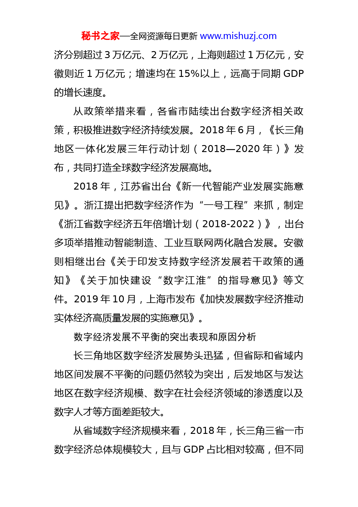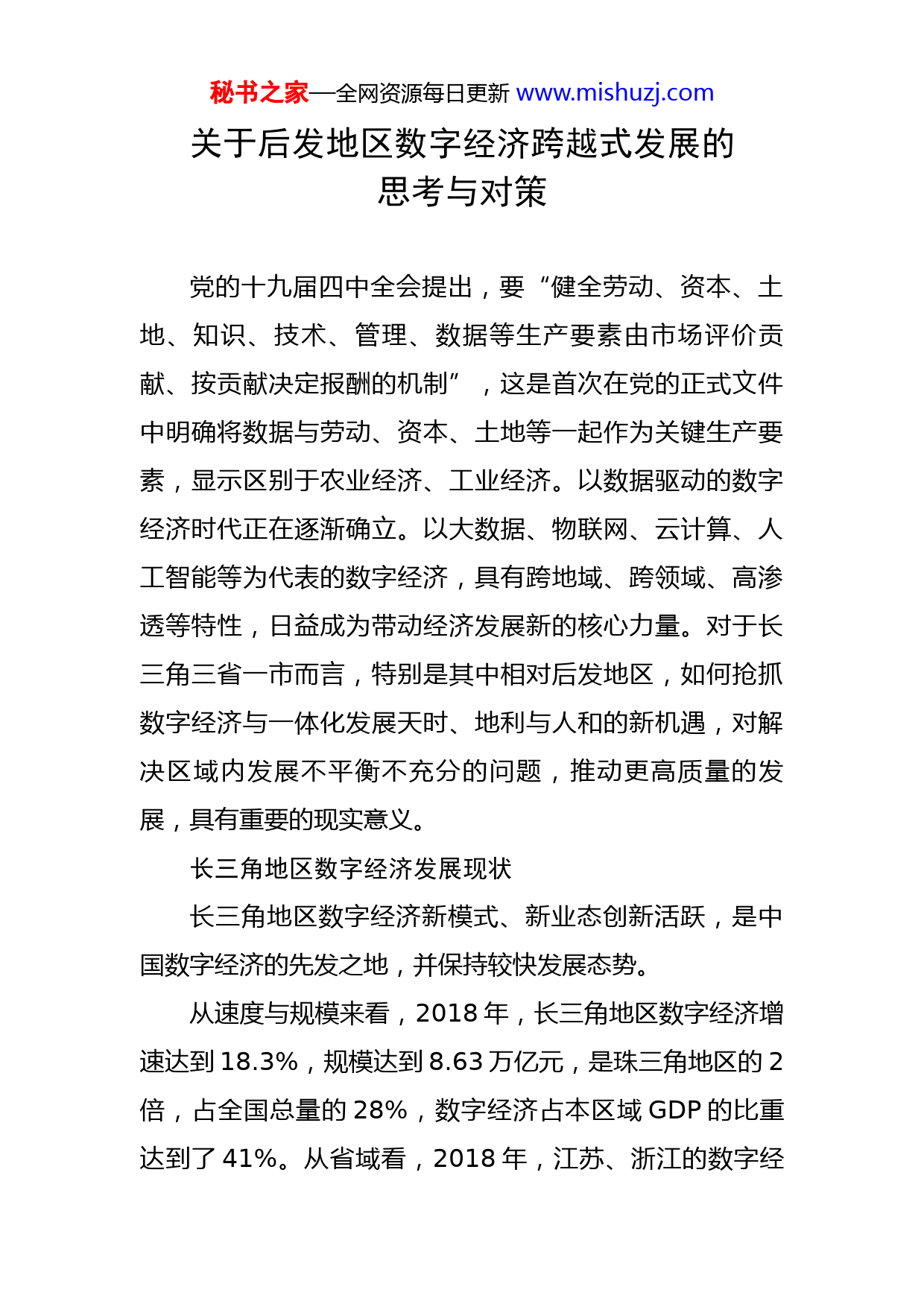 秘书之家—全网资源每日更新www.mishuzj.com关于后发地区数字经济跨越式发展的思考与对策党的十九届四中全会提出,要“健全劳动、资本、土地、知识、技术、管理、数据等生产要素由市场评价贡献、按贡献决定报酬的机制”,这是首次在党的正式文件中明确将数据与劳动、资本、土地等一起作为关键生产要素,显示区别于农业经济、工业经济。以数据驱动的数字经济时代正在逐渐确立。以大数据、物联网、云计算、人工智能等为代表的数字经济,具有跨地域、跨领域、高渗透等特性,日益成为带动经济发展新的核心力量。对于长三角三省一市而言,特别是其中相对后发地区,如何抢抓数字经济与一体化发展天时、地利与人和的新机遇,对解决区域内发展不平衡不充分的问题,推动更高质量的发展,具有重要的现实意义。长三角地区数字经济发展现状长三角地区数字经济新模式、新业态创新活跃,是中国数字经济的先发之地,并保持较快发展态势。从速度与规模来看,2018年,长三角地区数字经济增速达到18.3%,规模达到8.63万亿元,是珠三角地区的2倍,占全国总量的28%,数字经济占本区域GDP的比重达到了41%。从省域看,2018年,江苏、浙江的数字经秘书之家—全网资源每日更新www.mishuzj.com济分别超过3万亿元、2万亿元,上海则超过1万亿元,安徽则近1万亿元;增速均在15%以上,远高于同期GDP的增长速度。从政策举措来看,各省市陆续出台数字经济相关政策,积极推进数字经济持续发展。2018年6月,《长三角地区一体化发展三年行动计划(2018—2020年)》发布,共同打造全球数字经济发展高地。2018年,江苏省出台《新一代智能产业发展实施意见》。浙江提出把数字经济作为“一号工程”来抓,制定《浙江省数字经济五年倍增计划(2018-2022)》,出台多项举措推动智能制造、工业互联网两化融合发展。安徽则相继出台《关于印发支持数字经济发展若干政策的通知》《关于加快建设“数字江淮”的指导意见》等文件。2019年10月,上海市发布《加快发展数字经济推动实体经济高质量发展的实施意见》。数字经济发展不平衡的突出表现和原因分析长三角地区数字经济发展势头迅猛,但省际和省域内地区间发展不平衡的问题仍然较为突出,后发地区与发达地区在数字经济规模、数字在社会经济领域的渗透度以及数字人才等方面差距较大。从省域数字经济规模来看,2018年,长三角三省一市数字经济总体规模较大,且与GDP占比相对较高,但不同秘书之家—全网资源每日更新www.mishuzj.com地区间存在显著差距。上海数字经济已占主导地位,占比超过50%,浙江、江苏已超过40%,安徽数字经济规模相对较小,且占比不到30%。从城市数字经济指数来看,根据21世纪研究院和阿里研究院联合发布的《2019长三角数字经济指数报告》,长三角城市在数字经济不同领域各有所长,但综合发展程度相差较大。在被评估的27个城市中,数字经济指数70分以上有2个城市,第一名是杭州市83分,第二名上海市74分;50分至70分的共6个城市,浙江、江苏、安徽分别有3个、2个、1个;最低分段40分以下的共12个城市,浙江、江苏、安徽分别有1个、4个、7个。从指数分值和城市数量可见,上海、浙江数字经济总体发展水平相对较高,江苏苏北地区、安徽绝大部分地区发展水平相对较低。与浙江相比较,江苏苏中、苏北各市数字经济指数与其经济地位或GDP位序并不完全正相关。从数字人才分布来看,上海优势较为明显,人才综合竞争力强,分布比较均衡,浙江、江苏数字人才主要集中在杭州、宁波、苏州、南京、无锡等主要城市,安徽数字人才数量较少,且主要集中在合肥市。从行业看,长三角地区数字人才在ICT(信息通信技术)行业和制造业占比较高,在零售、娱乐、交通物流、房地产、建筑等行业较低。对于后发地区而言,制约数字经济快速发展的因素主秘书之家—全网资源每日更新www.mishuzj.com要体现在认识不足、数据壁垒、措施不力、人才缺乏等方面:认识存在误区,“小工意识”较为普遍。当前,对数字经济认识不足的现象普遍存在,不少地方对数字经济的认识仍局限于新一代信息技术本身,仅将其作为一种新型应用工具,或仅仅局限于信息技术与工业领域的深度融合。正如农业经济在于将土地和劳动力作为关键生产要素,工业经济在此之外增加了资本这一新的生产要素,以数据为生产要素的数字经济,不仅仅是第四次工业革命,而且可以视为工业经济之后的新经济形态。因此,如果当前仍然局限于“小工意识”,把卖地、招项目作为经济发展的唯一手段,而不考虑数据与经济社会的深度融合,在某种意义上可以说是工业时代“小农意识”的翻版,难以适应数字经济时代的发展。“数据壁垒”难破,数据共享流通不畅。数据的连通和共享是数字经济发展的基本前提,“数据孤岛”“数据壁垒”是实施数字经济最大的障碍。从企业来看,国际知名企业管理智库邓白氏公司于2019年3月对北京、上海、江苏和广东等经济较发达地区的企业进行了调查,显示92%的中国企业内部存在“数据孤岛”,长三角地区企业内部“数据孤岛”现象同样较为普遍。从政府来看,据浙江省大数据发展管理局和江苏省信息中心介绍,当前政府秘书之家—全网资源每日更新www.mishuzj.com部门手里掌握着80%的数据,但很多数据“深藏闺中”,各地各部门数据收集、加工、存储、利