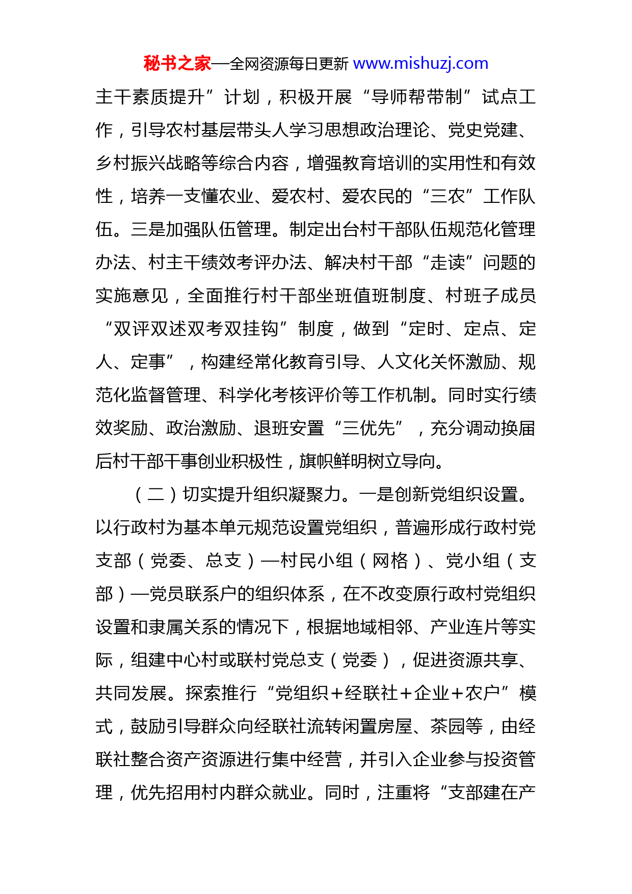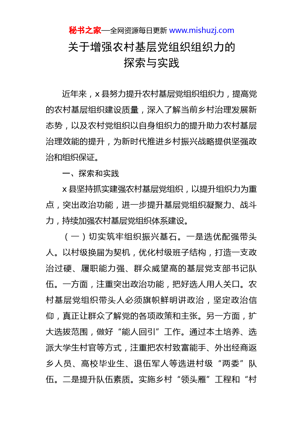 秘书之家—全网资源每日更新www.mishuzj.com关于增强农村基层党组织组织力的探索与实践近年来,x县努力提升农村基层党组织组织力,提高党的农村基层组织建设质量,深入了解当前乡村治理发展新态势,以及农村党组织以自身组织力的提升助力农村基层治理效能的提升,为新时代推进乡村振兴战略提供坚强政治和组织保证。一、探索和实践x县坚持抓实建强农村基层党组织,以提升组织力为重点,突出政治功能,进一步提升基层党组织凝聚力、战斗力,持续加强农村基层党组织体系建设。(一)切实筑牢组织振兴基石。一是选优配强带头人。以村级换届为契机,优化村级班子结构,打造一支政治过硬、履职能力强、群众威望高的基层党支部书记队伍。一方面,注重突出政治功能,把好选人用人关口。农村基层党组织带头人必须旗帜鲜明讲政治,坚定政治信仰,真正让群众了解党的各项政策和主张。另一方面,扩大选拔范围,做好“能人回引”工作。通过本土培养、选派大学生村官等方式,注重把农村致富能手、外出经商返乡人员、高校毕业生、退伍军人等选进村级“两委”队伍。二是提升队伍素质。实施乡村“领头雁”工程和“村秘书之家—全网资源每日更新www.mishuzj.com主干素质提升”计划,积极开展“导师帮带制”试点工作,引导农村基层带头人学习思想政治理论、党史党建、乡村振兴战略等综合内容,增强教育培训的实用性和有效性,培养一支懂农业、爱农村、爱农民的“三农”工作队伍。三是加强队伍管理。制定出台村干部队伍规范化管理办法、村主干绩效考评办法、解决村干部“走读”问题的实施意见,全面推行村干部坐班值班制度、村班子成员“双评双述双考双挂钩”制度,做到“定时、定点、定人、定事”,构建经常化教育引导、人文化关怀激励、规范化监督管理、科学化考核评价等工作机制。同时实行绩效奖励、政治激励、退班安置“三优先”,充分调动换届后村干部干事创业积极性,旗帜鲜明树立导向。(二)切实提升组织凝聚力。一是创新党组织设置。以行政村为基本单元规范设置党组织,普遍形成行政村党支部(党委、总支)—村民小组(网格)、党小组(支部)—党员联系户的组织体系,在不改变原行政村党组织设置和隶属关系的情况下,根据地域相邻、产业连片等实际,组建中心村或联村党总支(党委),促进资源共享、共同发展。探索推行“党组织+经联社+企业+农户”模式,鼓励引导群众向经联社流转闲置房屋、茶园等,由经联社整合资产资源进行集中经营,并引入企业参与投资管理,优先招用村内群众就业。同时,注重将“支部建在产秘书之家—全网资源每日更新www.mishuzj.com业链”上,推动党的组织覆盖向农民专业合作社、产业基地、农业企业等治理空白点延伸,大力推进支部领办合作社。二是整顿党组织常态化。坚持每年排查整顿,对后进村党组织,每年按照不低于x%的比例,倒排确定一批软弱涣散党组织,采取“安排一名区领导干部挂点,选好一名党支部书记,规范一套工作制度,解决一批突出问题,健全一套保障机制”等措施,“一支一策”开展整顿。对去年集中整顿情况开展一次“回头看”,重点看限期整改的问题是否得到解决,对需要持续深入解决问题的要纳入今年整顿范围,滚动整顿、查缺补漏、巩固提高。结合扫黑除恶专项斗争,常态化落实村“两委”成员县级联审机制,及时清理受过刑事处罚、存在“村霸”和涉黑涉恶等问题村干。三是推动党组织建设。围绕基层党组织建设的基本要求,深入开展党组织“达标创星、晋位升级”活动。对全县x个村党组织按先进、一般、后进三个层次进行分类,开展“评星定级”活动,推动农村基层党组织创先争优、晋位升级。开展支部共建、挂钩帮扶联合行动,组织x个机关企事业单位党组织与x个农村党组织开展结对共建。同时,注重严格党的组织生活制度,健全和落实“三会一课”、主题党日、组织生活会、民主评议党员、领导干部讲党课等制度。联村包村的区乡党员领导干部、驻村第一书记加强对组织生活的具体指导。秘书之家—全网资源每日更新www.mishuzj.com(三)切实激活组织组织力。一是加强统筹谋划。实施村集体经济“倍增”工程,像抓精准扶贫一样抓村级集体经济,“一村一策”进行推动;出台领导挂钩、指导服务、激励约束、考核验收等政策,做到目标清晰,责任到人;整合相关涉农项目资金,形成发展村级集体经济合力。将发展壮大村集体经济实行绩效管理,纳入区对乡年度绩效考核、乡对村年终实绩考评内容,对每年度发展村集体经济前三名和后三名的乡镇分别给予相应的绩效单列加分和扣分。二是搭建有效载体。注重激活农村“造血功能”,建立村集体经济发展数据平台,充分运用发展壮大村集体“区乡统筹扶持一批、盘活资源生成一批、创办实体创收一批、乡村旅游发展一批、用海改革带动一批、政策助力创收一批”等措施,开展党支部领办合作社“提质强村”行动,做强特色产业,立足农村特点和资源禀赋,确立优势发展产业和项目,大力推进“一村一品,一乡一业”发展格局。三是注重资源下沉。一方面,推动干部下沉帮扶。今年来已完成x名区派乡村振兴指导员和x名第驻村第一书记选派工作,利用好金融挂职干部,成立x支乡村振兴服务队,进一步充实乡村振兴一线力量。另一方