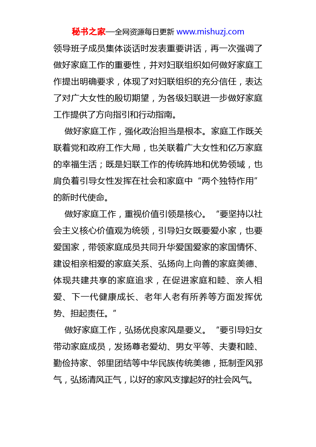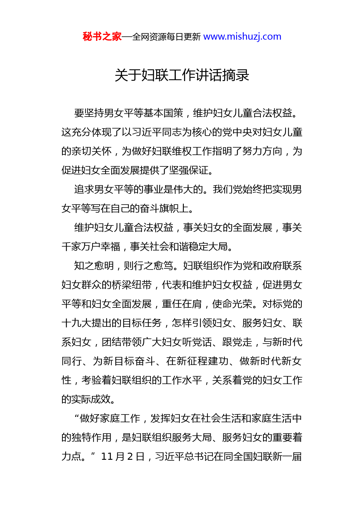 秘书之家—全网资源每日更新www.mishuzj.com关于妇联工作讲话摘录要坚持男女平等基本国策,维护妇女儿童合法权益。这充分体现了以习近平同志为核心的党中央对妇女儿童的亲切关怀,为做好妇联维权工作指明了努力方向,为促进妇女全面发展提供了坚强保证。追求男女平等的事业是伟大的。我们党始终把实现男女平等写在自己的奋斗旗帜上。维护妇女儿童合法权益,事关妇女的全面发展,事关千家万户幸福,事关社会和谐稳定大局。知之愈明,则行之愈笃。妇联组织作为党和政府联系妇女群众的桥梁纽带,代表和维护妇女权益,促进男女平等和妇女全面发展,重任在肩,使命光荣。对标党的十九大提出的目标任务,怎样引领妇女、服务妇女、联系妇女,团结带领广大妇女听党话、跟党走,与新时代同行、为新目标奋斗、在新征程建功、做新时代新女性,考验着妇联组织的工作水平,关系着党的妇女工作的实际成效。“做好家庭工作,发挥妇女在社会生活和家庭生活中的独特作用,是妇联组织服务大局、服务妇女的重要着力点。”11月2日,习近平总书记在同全国妇联新一届秘书之家—全网资源每日更新www.mishuzj.com领导班子成员集体谈话时发表重要讲话,再一次强调了做好家庭工作的重要性,并对妇联组织如何做好家庭工作提出明确要求,体现了对妇联组织的充分信任,表达了对广大女性的殷切期望,为各级妇联进一步做好家庭工作提供了方向指引和行动指南。做好家庭工作,强化政治担当是根本。家庭工作既关联着党和政府工作大局,也关联着广大女性和亿万家庭的幸福生活;既是妇联工作的传统阵地和优势领域,也肩负着引导女性发挥在社会和家庭中“两个独特作用”的新时代使命。做好家庭工作,重视价值引领是核心。“要坚持以社会主义核心价值观为统领,引导妇女既要爱小家,也要爱国家,带领家庭成员共同升华爱国爱家的家国情怀、建设相亲相爱的家庭关系、弘扬向上向善的家庭美德、体现共建共享的家庭追求,在促进家庭和睦、亲人相爱、下一代健康成长、老年人老有所养等方面发挥优势、担起责任。”做好家庭工作,弘扬优良家风是要义。“要引导妇女带动家庭成员,发扬尊老爱幼、男女平等、夫妻和睦、勤俭持家、邻里团结等中华民族传统美德,抵制歪风邪气,弘扬清风正气,以好的家风支撑起好的社会风气。秘书之家—全网资源每日更新www.mishuzj.com“以行动建功新时代,以奋斗创造美好生活”,让我们爱国爱家、相亲相爱、向上向善、共建共享,在实现中华民族伟大复兴中国梦的历史进程中,实现家庭幸福梦和个人发展梦。