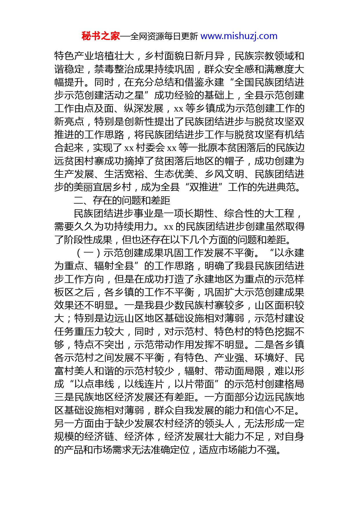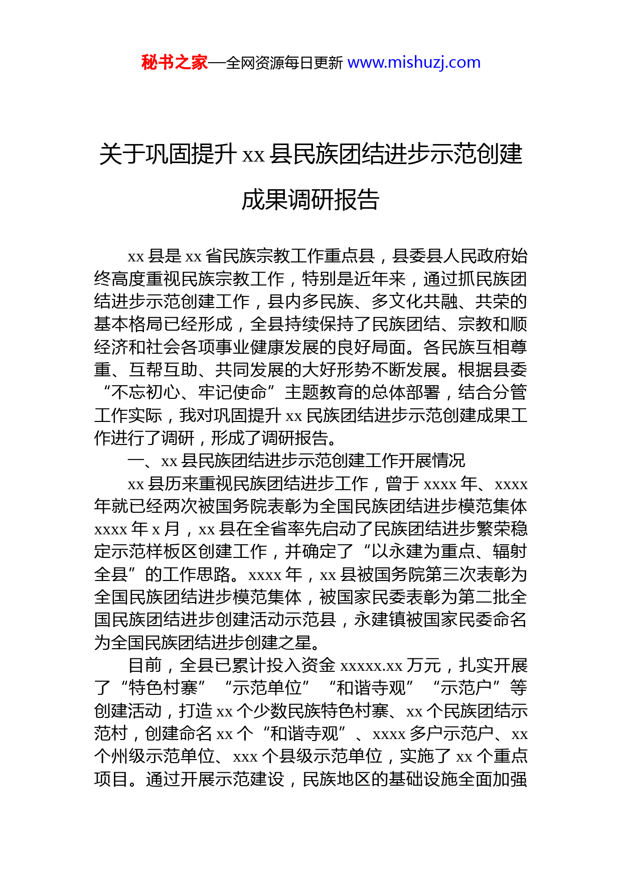 秘书之家—全网资源每日更新www.mishuzj.com关于巩固提升xx县民族团结进步示范创建成果调研报告xx县是xx省民族宗教工作重点县,县委县人民政府始终高度重视民族宗教工作,特别是近年来,通过抓民族团结进步示范创建工作,县内多民族、多文化共融、共荣的基本格局已经形成,全县持续保持了民族团结、宗教和顺经济和社会各项事业健康发展的良好局面。各民族互相尊重、互帮互助、共同发展的大好形势不断发展。根据县委“不忘初心、牢记使命”主题教育的总体部署,结合分管工作实际,我对巩固提升xx民族团结进步示范创建成果工作进行了调研,形成了调研报告。一、xx县民族团结进步示范创建工作开展情况xx县历来重视民族团结进步工作,曾于xxxx年、xxxx年就已经两次被国务院表彰为全国民族团结进步模范集体xxxx年x月,xx县在全省率先启动了民族团结进步繁荣稳定示范样板区创建工作,并确定了“以永建为重点、辐射全县”的工作思路。xxxx年,xx县被国务院第三次表彰为全国民族团结进步模范集体,被国家民委表彰为第二批全国民族团结进步创建活动示范县,永建镇被国家民委命名为全国民族团结进步创建之星。目前,全县已累计投入资金xxxxx.xx万元,扎实开展了“特色村寨”“示范单位”“和谐寺观”“示范户”等创建活动,打造xx个少数民族特色村寨、xx个民族团结示范村,创建命名xx个“和谐寺观”、xxxx多户示范户、xx个州级示范单位、xxx个县级示范单位,实施了xx个重点项目。通过开展示范建设,民族地区的基础设施全面加强秘书之家—全网资源每日更新www.mishuzj.com特色产业培植壮大,乡村面貌日新月异,民族宗教领域和谐稳定,禁毒整治成果持续巩固,群众安全感和满意度大幅提升。同时,在充分总结和借鉴永建“全国民族团结进步示范创建活动之星”成功经验的基础上,全县示范创建工作由点及面、纵深发展,xx等乡镇成为示范创建工作的新亮点,特别是创新性提出了民族团结进步与脱贫攻坚双推进的工作思路,将民族团结进步工作与脱贫攻坚有机结合起来,实现了xx村委会xx等一批原本贫困落后的民族边远贫困村寨成功摘掉了贫困落后地区的帽子,成功创建为生产发展、生活宽裕、生态优美、乡风文明、民族团结进步的美丽宜居乡村,成为全县“双推进”工作的先进典范。二、存在的问题和差距民族团结进步事业是一项长期性、综合性的大工程,需要久久为功持续用力。xx的民族团结进步创建虽然取得了阶段性成果,但也还存在以下几个方面的问题和差距。(一)示范创建成果巩固工作发展不平衡。“以永建为重点、辐射全县”的工作思路,明确了我县民族团结进步工作方向,但是在成功打造了永建地区为重点的示范样板区之后,各乡镇的工作不平衡,巩固扩大示范创建成果效果还不明显。一是我县少数民族村寨较多,山区面积较大;特别是边远山区地区基础设施相对薄弱,示范村建设任务重压力较大,同时,对示范村、特色村的特色挖掘不够,特点不突出,示范带动作用发挥不明显。二是各乡镇各示范村之间发展不平衡,有特色、产业强、环境好、民富村美人和谐的示范村较少,辐射、带动面局限,难以形成“以点串线,以线连片,以片带面”的示范村创建格局三是民族地区经济发展还有差距。一方面部分边远民族地区基础设施相对薄弱,群众自我发展的能力和信心不足。另一方面由于缺少发展农村经济的领头人,无法形成一定规模的经济链、经济体,经济发展壮大能力不足,对自身的产品和市场需求无法准确定位,适应市场能力不强。秘书之家—全网资源每日更新www.mishuzj.com(二)维护宗教领域和谐稳定任务艰巨。民族问题和宗教问题交织的实际决定了谈民族团结就必谈宗教和谐,只有宗教和谐才能不断促进民族团结。目前,面对复杂的国际环境,宗教领域维护和谐稳定的任务依然艰巨。一是抵御外部渗透压力大。二是宗教事务规范管理任务重。三是宗教队伍建设还有差距。我县宗教界管理人才缺乏,特别是佛道教新老队伍脱节,对后续人才培养存在差距。(三)宣传教育工作还不到位。宣传教育工作是做好民族团结进步工作的首要任务,是增强民族地区群众中华民族共同体意识的重要措施,在新时期,我县在民族团结进步工作中宣传教育工作还有一些差距。一是部分民族地区群众发展内生动力不足。部分边远民族地区信息相对闭塞,群众素质相对较低,对党的民族政策理解不到位,习惯了等靠要,不愿自我发展。脱贫攻坚工作中通过帮扶绝大部分群众能够感恩党的政策,能够通过扶持不断自我发展,但还是有少部分群众没有认识到脱贫致富主要的责任还是自己,总想伸手向党和政府、向社会无偿讨要,总想不劳而获。二是中华民族共同体意识树得还不够牢。对社会主义核心价值观的宣传还不到位,对广大群众爱国主义教育还有差距,部分群众还存在地方民族主义,不能正确看待各民族都是一家人,各民族都是中华民族的一份子,中华民族共同体意识树得还不够牢。三是优秀文化的挖掘传承工作还有差距。对各民族、各地区的优秀文化是中华民族优秀文化的重要组成部分的认识不到位。xx民族民间优秀文化的保护传承阵地建设和机构建设还有待进一步加强。对优秀文化传承人的培养力度不够,特别受外来文化的影响,年轻人对本土优秀文化了解少,不愿传承