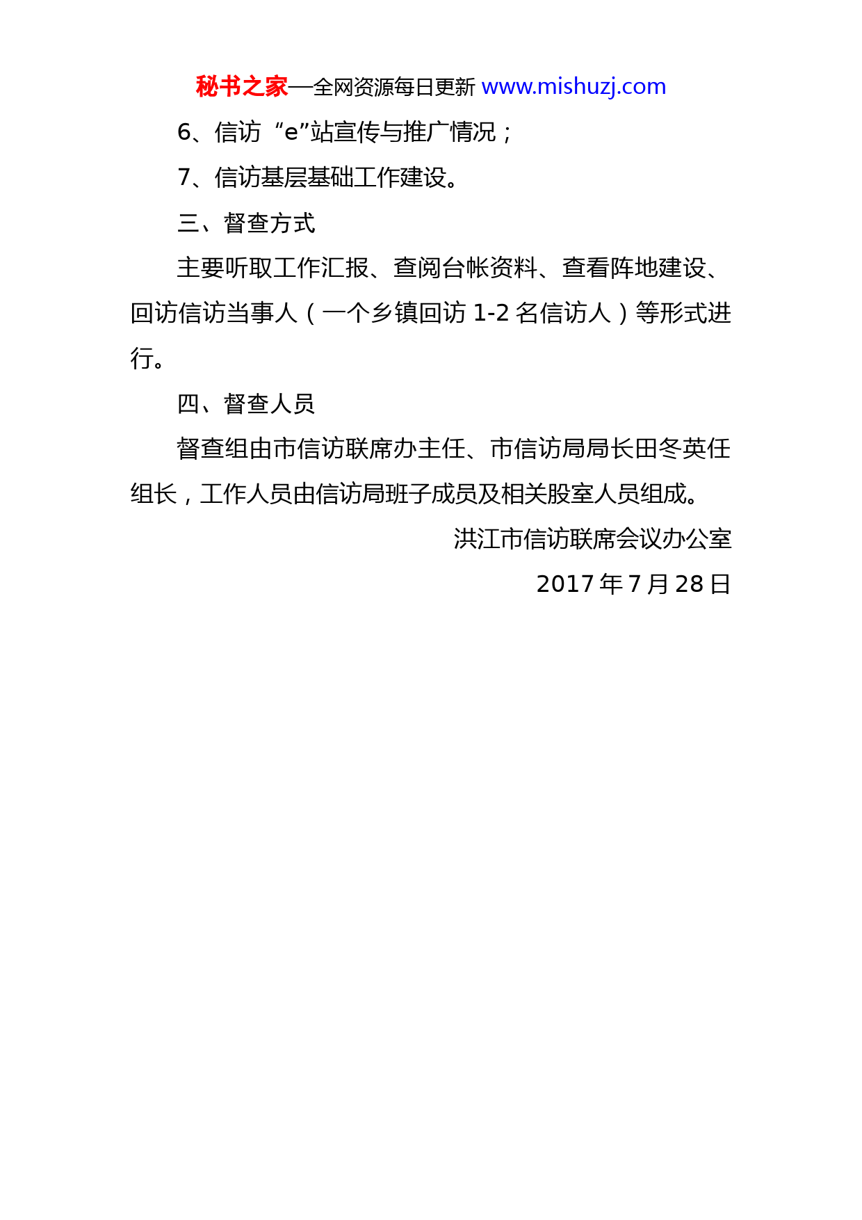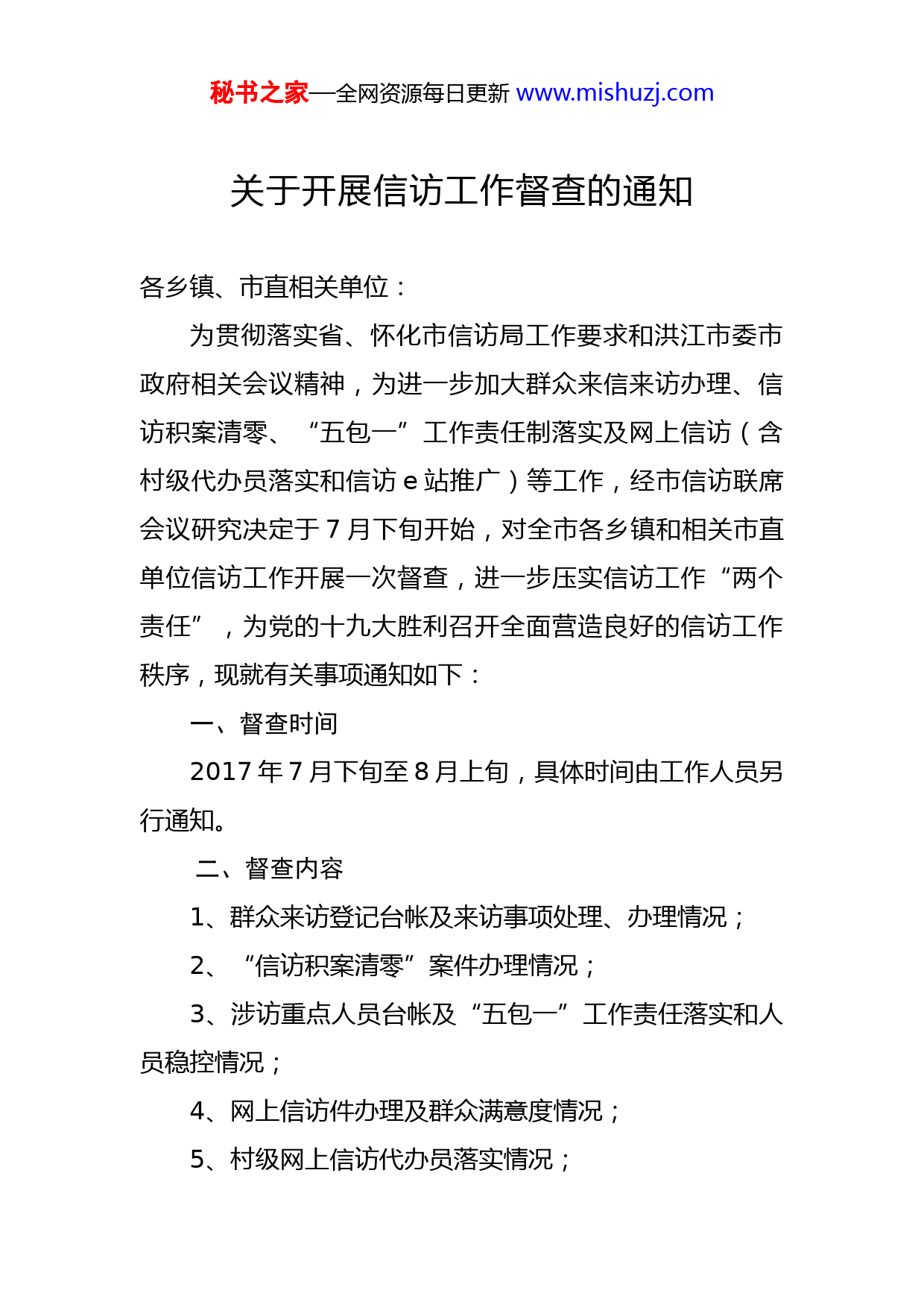 秘书之家—全网资源每日更新www.mishuzj.com关于开展信访工作督查的通知各乡镇、市直相关单位:为贯彻落实省、怀化市信访局工作要求和洪江市委市政府相关会议精神,为进一步加大群众来信来访办理、信访积案清零、“五包一”工作责任制落实及网上信访(含村级代办员落实和信访e站推广)等工作,经市信访联席会议研究决定于7月下旬开始,对全市各乡镇和相关市直单位信访工作开展一次督查,进一步压实信访工作“两个责任”,为党的十九大胜利召开全面营造良好的信访工作秩序,现就有关事项通知如下:一、督查时间2017年7月下旬至8月上旬,具体时间由工作人员另行通知。二、督查内容1、群众来访登记台帐及来访事项处理、办理情况;2、“信访积案清零”案件办理情况;3、涉访重点人员台帐及“五包一”工作责任落实和人员稳控情况;4、网上信访件办理及群众满意度情况;5、村级网上信访代办员落实情况;秘书之家—全网资源每日更新www.mishuzj.com6、信访“e”站宣传与推广情况;7、信访基层基础工作建设。三、督查方式主要听取工作汇报、查阅台帐资料、查看阵地建设、回访信访当事人(一个乡镇回访1-2名信访人)等形式进行。四、督查人员督查组由市信访联席办主任、市信访局局长田冬英任组长,工作人员由信访局班子成员及相关股室人员组成。洪江市信访联席会议办公室2017年7月28日
