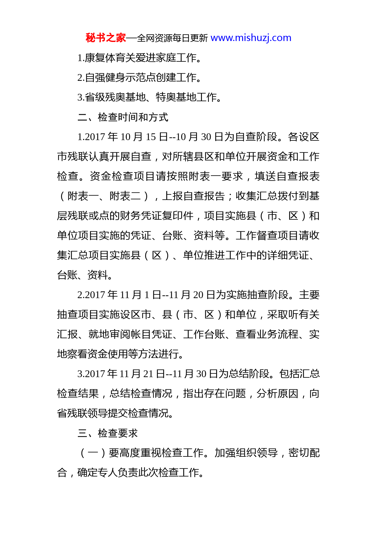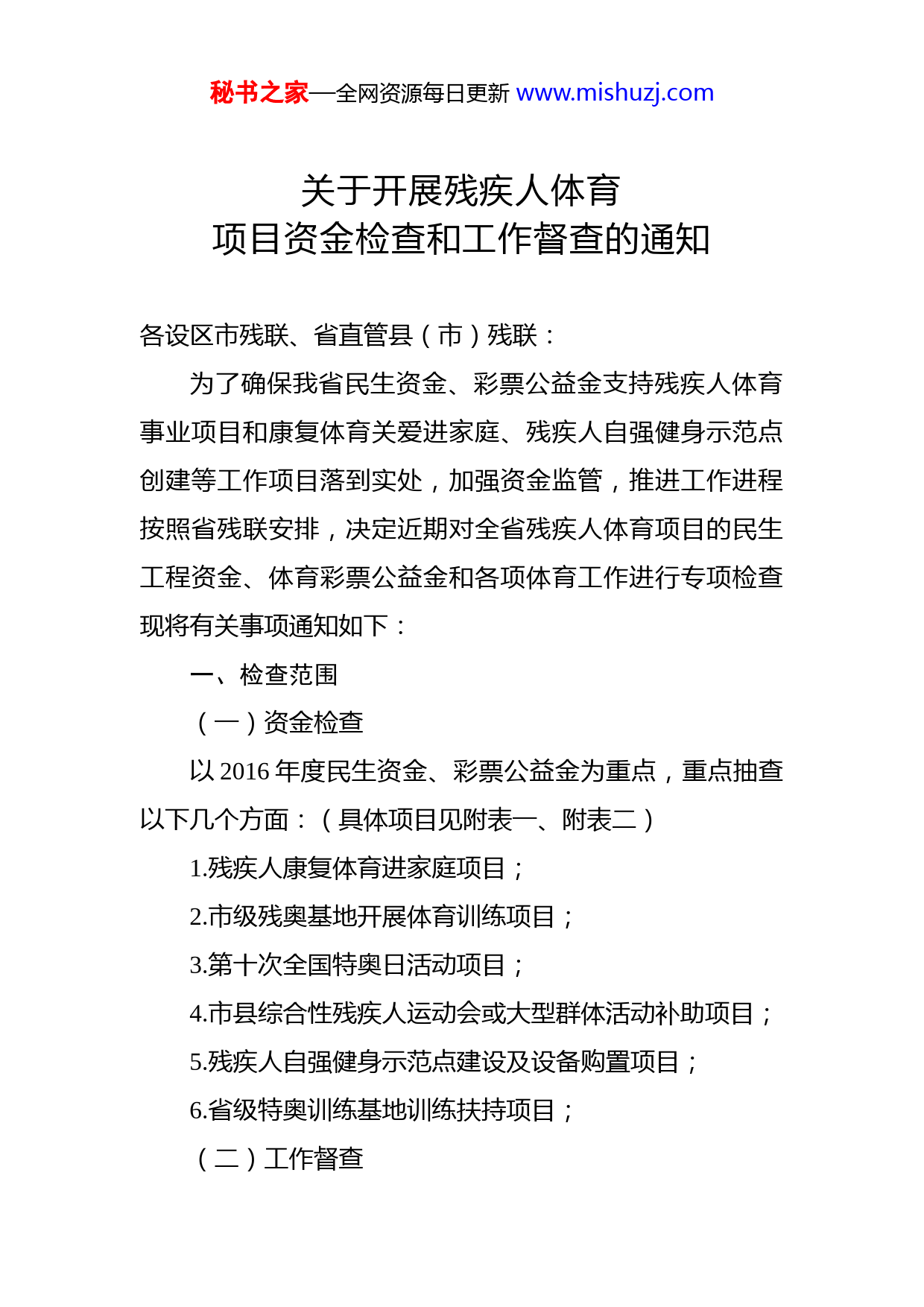 秘书之家—全网资源每日更新www.mishuzj.com关于开展残疾人体育项目资金检查和工作督查的通知各设区市残联、省直管县(市)残联:为了确保我省民生资金、彩票公益金支持残疾人体育事业项目和康复体育关爱进家庭、残疾人自强健身示范点创建等工作项目落到实处,加强资金监管,推进工作进程按照省残联安排,决定近期对全省残疾人体育项目的民生工程资金、体育彩票公益金和各项体育工作进行专项检查现将有关事项通知如下:一、检查范围(一)资金检查以2016年度民生资金、彩票公益金为重点,重点抽查以下几个方面:(具体项目见附表一、附表二)1.残疾人康复体育进家庭项目;2.市级残奥基地开展体育训练项目;3.第十次全国特奥日活动项目;4.市县综合性残疾人运动会或大型群体活动补助项目;5.残疾人自强健身示范点建设及设备购置项目;6.省级特奥训练基地训练扶持项目;(二)工作督查秘书之家—全网资源每日更新www.mishuzj.com1.康复体育关爱进家庭工作。2.自强健身示范点创建工作。3.省级残奥基地、特奥基地工作。二、检查时间和方式1.2017年10月15日--10月30日为自查阶段。各设区市残联认真开展自查,对所辖县区和单位开展资金和工作检查。资金检查项目请按照附表一要求,填送自查报表(附表一、附表二),上报自查报告;收集汇总拨付到基层残联或点的财务凭证复印件,项目实施县(市、区)和单位项目实施的凭证、台账、资料等。工作督查项目请收集汇总项目实施县(区)、单位推进工作中的详细凭证、台账、资料。2.2017年11月1日--11月20日为实施抽查阶段。主要抽查项目实施设区市、县(市、区)和单位,采取听有关汇报、就地审阅帐目凭证、工作台账、查看业务流程、实地察看资金使用等方法进行。3.2017年11月21日--11月30日为总结阶段。包括汇总检查结果,总结检查情况,指出存在问题,分析原因,向省残联领导提交检查情况。三、检查要求(一)要高度重视检查工作。加强组织领导,密切配合,确定专人负责此次检查工作。秘书之家—全网资源每日更新www.mishuzj.com(二)要认真开展自查总结。各单位针对照检查内容全面开展自查总结,梳理整理政策文件、表册、资金账簿凭证、项目建设等相关资料,并向省残联文体中心提交自查材料。(三)要严格执行检查纪律。检查期间,检查组成员要严格按照“八项规定”和《廉政准则》有关规定开展工作,加强廉洁自律,不得有违反廉政纪律的行为发生。联系人:袁玉萍联系电话:0791-8383842818170011130电子邮箱:540575149@qq.com附件1:2016年省级专项民生资金、彩票公益金支持残疾人体育项目资金使用情况自查表附件2:2016年省级专项民生资金、彩票公益金支持残疾人体育项目资金下拔自查明细表