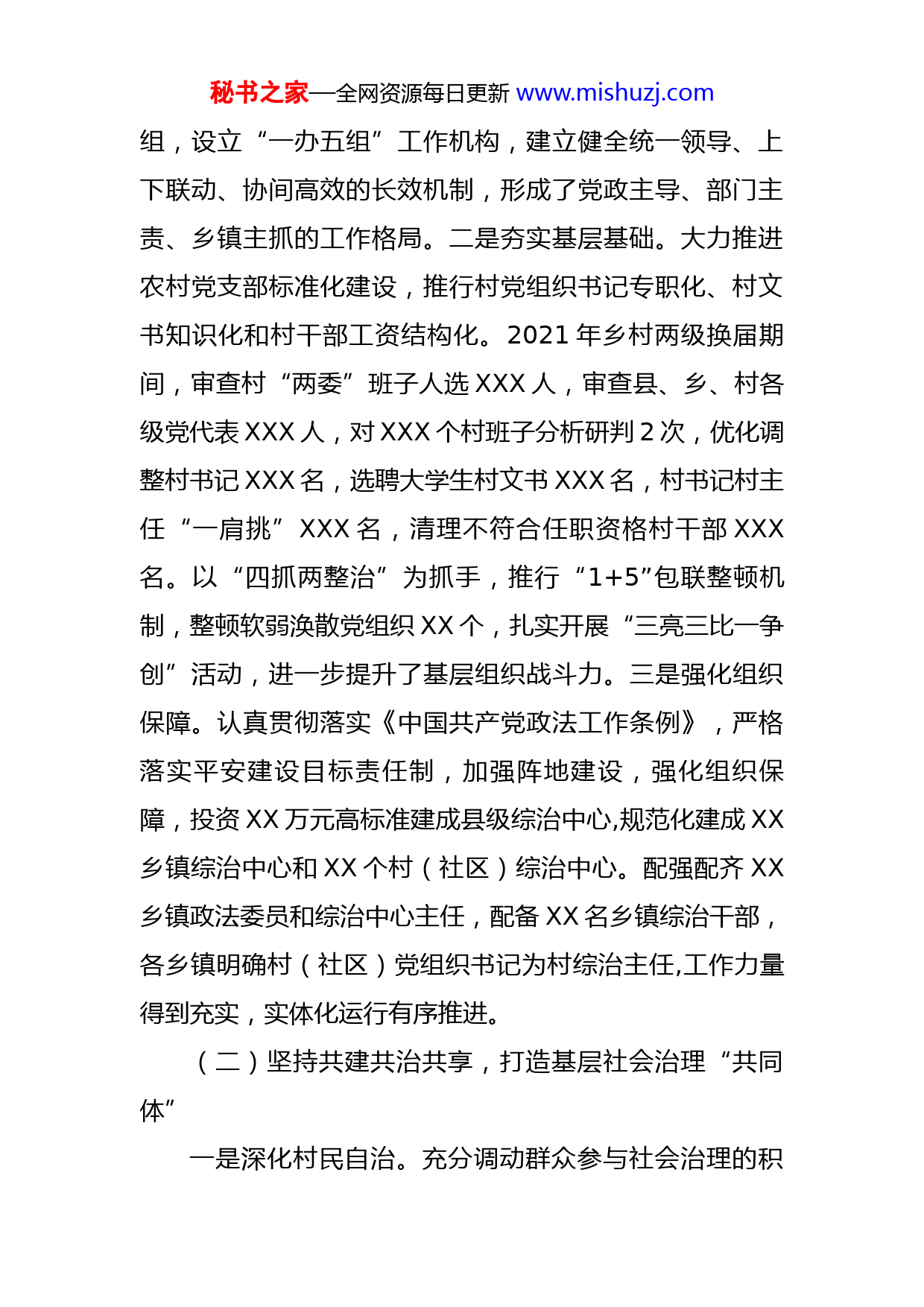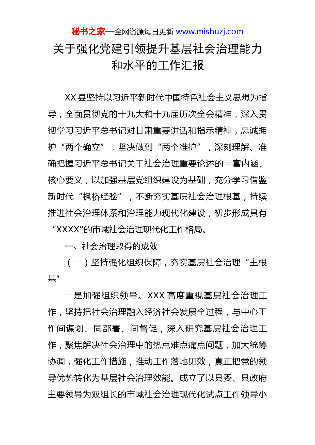 秘书之家—全网资源每日更新www.mishuzj.com关于强化党建引领提升基层社会治理能力和水平的工作汇报XX县坚持以习近平新时代中国特色社会主义思想为指导,全面贯彻党的十九大和十九届历次全会精神,深入贯彻学习习近平总书记对甘肃重要讲话和指示精神,忠诚拥护“两个确立”,坚决做到“两个维护”,深刻理解、准确把握习近平总书记关于社会治理重要论述的丰富内涵、核心要义,以加强基层党组织建设为基础,充分学习借鉴新时代“枫桥经验”,不断夯实基层社会治理根基,持续推进社会治理体系和治理能力现代化建设,初步形成具有“XXXX”的市域社会治理现代化工作格局。一、社会治理取得的成效(一)坚持强化组织保障,夯实基层社会治理“主根基”一是加强组织领导。XXX高度重视基层社会治理工作,坚持把社会治理融入经济社会发展全过程,与中心工作间谋划、同部署、间督促,深入研究基层社会治理工作,聚焦解决社会治理中的热点难点痛点问题,加大统筹协调,强化工作措施,推动工作落地见效,真正把党的领导优势转化为基层社会治理效能。成立了以县委、县政府主要领导为双组长的市域社会治理现代化试点工作领导小秘书之家—全网资源每日更新www.mishuzj.com组,设立“一办五组”工作机构,建立健全统一领导、上下联动、协间高效的长效机制,形成了党政主导、部门主责、乡镇主抓的工作格局。二是夯实基层基础。大力推进农村党支部标准化建设,推行村党组织书记专职化、村文书知识化和村干部工资结构化。2021年乡村两级换届期间,审查村“两委”班子人选XXX人,审查县、乡、村各级党代表XXX人,对XXX个村班子分析研判2次,优化调整村书记XXX名,选聘大学生村文书XXX名,村书记村主任“一肩挑”XXX名,清理不符合任职资格村干部XXX名。以“四抓两整治”为抓手,推行“1+5”包联整顿机制,整顿软弱涣散党组织XX个,扎实开展“三亮三比一争创”活动,进一步提升了基层组织战斗力。三是强化组织保障。认真贯彻落实《中国共产党政法工作条例》,严格落实平安建设目标责任制,加强阵地建设,强化组织保障,投资XX万元高标准建成县级综治中心,规范化建成XX乡镇综治中心和XX个村(社区)综治中心。配强配齐XX乡镇政法委员和综治中心主任,配备XX名乡镇综治干部,各乡镇明确村(社区)党组织书记为村综治主任,工作力量得到充实,实体化运行有序推进。(二)坚持共建共治共享,打造基层社会治理“共同体”一是深化村民自治。充分调动群众参与社会治理的积秘书之家—全网资源每日更新www.mishuzj.com极性,探索全民齐参与、愿参与、能参与、真参与、常参与的治理模式,形成共治共建共享的治理格局。修订完善《市民公约》《乡规民约》《村规民约》和行业规范,大力推行“四化三治十二条”农村治理模式。依托村民(代表)会议、村民议事会、村民理事会、村民监事会等,广泛开展村民说事、民情恳谈等基层民主协商活动,按照“群众提事项、两委列议题、定期召集议、议定分类办、办后大家评”的方式步骤,就涉及公共及群众利益的大小事项进行协商议定、督促办理,实现村事民管、村事民议、村事民办。二是强化德治教化。全面加强社会公德、职业道德、家庭美德、个人品德建设,建立县乡村三级好人榜,连续举办七届“十佳先进集体暨道德模范”评选表彰活动,选树各类典型XXX名,评选“XX好人”XXX人,评选文明家庭XX个、五星级文明户XX户。依法处理和打击侵犯老年人合法权益违法行为,开展“忤逆不孝”不良社会风气专项整治行动,切实遏制农村不良风气和陈规陋习。三是量化志愿服务。结合创建全国文明城市和农村人居环境整治,深入推进新时代文明实践中心建设。建成新时代文明实践中心(所、站)XX个,组建各类新时代文明实践志愿服务队XX支XXX万人,大力推行志愿者服务“四单”志愿服务机制,开展各类文明实践志愿服务活动XX多场(次),引导群众树立邻里互助、孝老爱亲、勤劳秘书之家—全网资源每日更新www.mishuzj.com致富、崇尚新风的生活理念,推动移风易俗,倡导文明新风。四是细化矛盾调处。健全党组织领导下的矛盾调解组织建设,建成乡镇调委会XX个、村调委会XX个、居民社区调委会X个、X个行业性专业性调解组织,配备调解员XX名,完善三调联动体系,积极引入第三方调解组织调解重大、疑难矛盾纠纷,大力推广“1+N”调解模式,灵活采用现场调解、庭式调解、巡回调解、上门调解、预约调解等方式,三年来,共排查矛盾纠纷XX件,成功化解XX件,调处成功率达到99%,努力实现“小事不出村、大事不出镇、要事不出县、矛盾不上交、服务不缺位”。五是硬化法治保障。依托法律“八进”、“八五普法”等活动,坚持推动法治宣传,定期组织政法干警开展以案释法、以案说法、以案普法,不断增强群众法治观念,促进全民学法、用法、知法、懂法、守法。全面落实乡村法治建设“五个一”工程,强化公共法律服务供给,建成国家级、省级、市级民主法治示范村XXX个,村级法治广场XX个。加强执法司法规范化建设,加大司法救助力度,有效破解执行难题,三年来共依法执行案件XXX件,执行到位金额XX万元,累计发放司法救助资金XX万元,救助案件XX件XX人。六是优化科技支撑。建成贯通县、乡、村三级的平安XX信息化支撑管理平台、命案预警预测预防平台