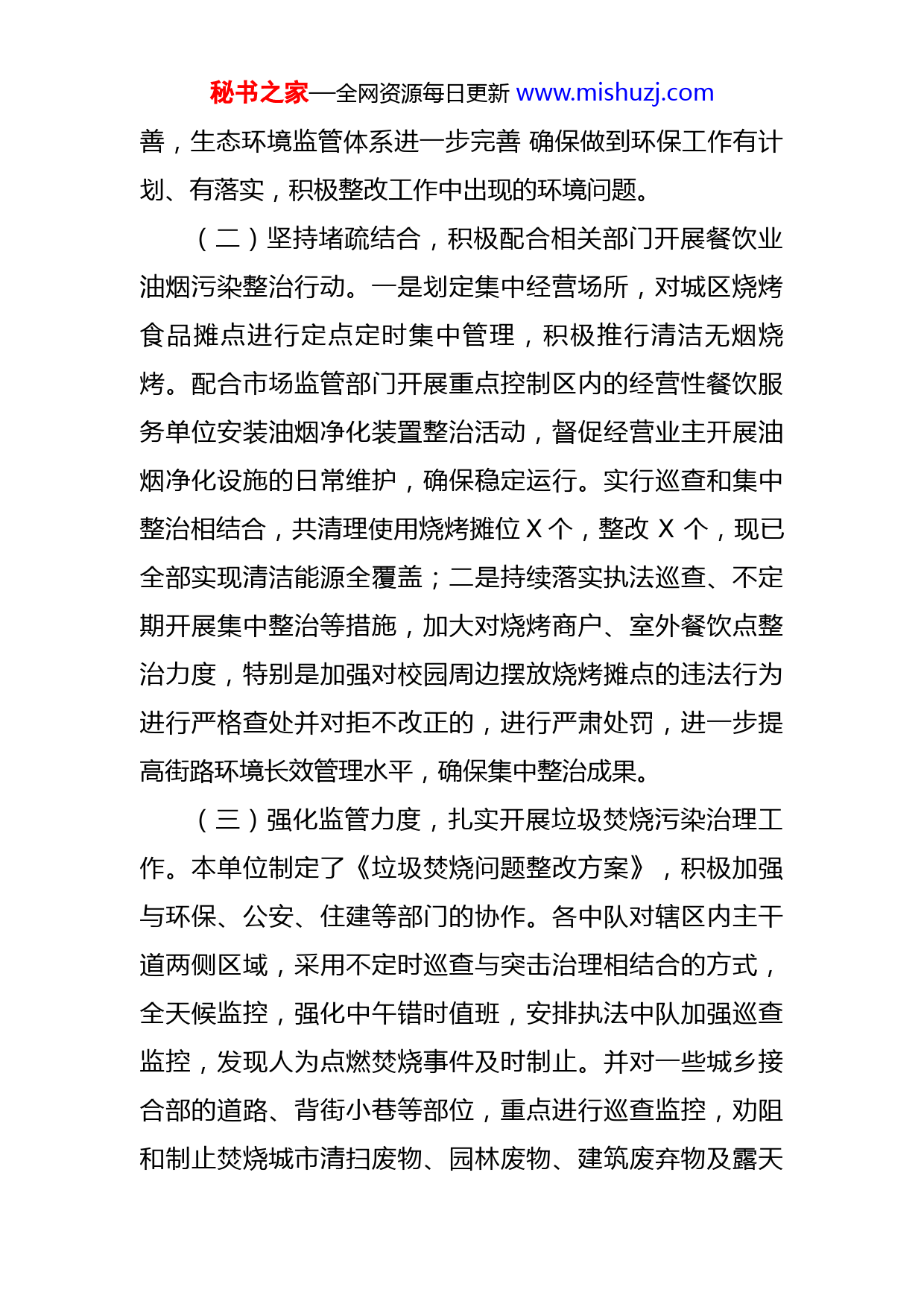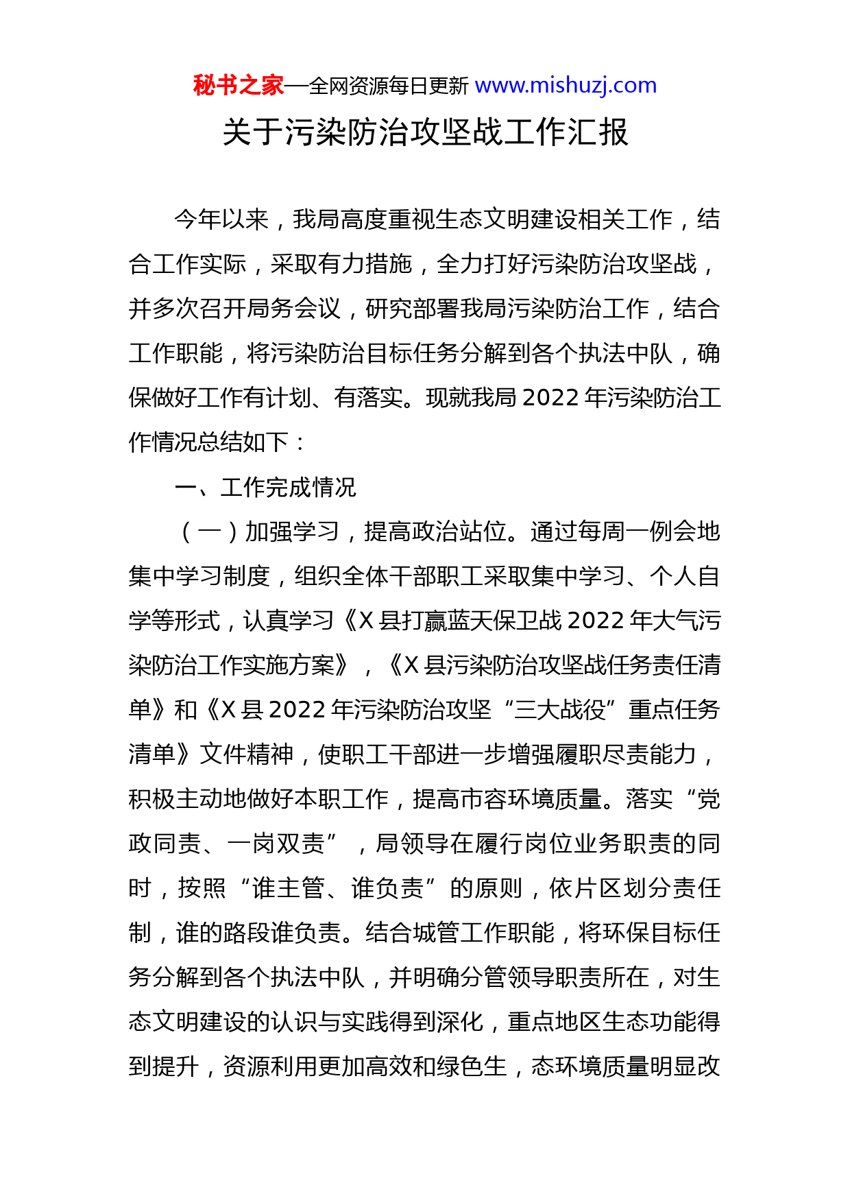 秘书之家—全网资源每日更新www.mishuzj.com关于污染防治攻坚战工作汇报今年以来,我局高度重视生态文明建设相关工作,结合工作实际,采取有力措施,全力打好污染防治攻坚战,并多次召开局务会议,研究部署我局污染防治工作,结合工作职能,将污染防治目标任务分解到各个执法中队,确保做好工作有计划、有落实。现就我局2022年污染防治工作情况总结如下:一、工作完成情况(一)加强学习,提高政治站位。通过每周一例会地集中学习制度,组织全体干部职工采取集中学习、个人自学等形式,认真学习《X县打赢蓝天保卫战2022年大气污染防治工作实施方案》,《X县污染防治攻坚战任务责任清单》和《X县2022年污染防治攻坚“三大战役”重点任务清单》文件精神,使职工干部进一步增强履职尽责能力,积极主动地做好本职工作,提高市容环境质量。落实“党政同责、一岗双责”,局领导在履行岗位业务职责的同时,按照“谁主管、谁负责”的原则,依片区划分责任制,谁的路段谁负责。结合城管工作职能,将环保目标任务分解到各个执法中队,并明确分管领导职责所在,对生态文明建设的认识与实践得到深化,重点地区生态功能得到提升,资源利用更加高效和绿色生,态环境质量明显改秘书之家—全网资源每日更新www.mishuzj.com善,生态环境监管体系进一步完善确保做到环保工作有计划、有落实,积极整改工作中出现的环境问题。(二)坚持堵疏结合,积极配合相关部门开展餐饮业油烟污染整治行动。一是划定集中经营场所,对城区烧烤食品摊点进行定点定时集中管理,积极推行清洁无烟烧烤。配合市场监管部门开展重点控制区内的经营性餐饮服务单位安装油烟净化装置整治活动,督促经营业主开展油烟净化设施的日常维护,确保稳定运行。实行巡查和集中整治相结合,共清理使用烧烤摊位X个,整改X个,现已全部实现清洁能源全覆盖;二是持续落实执法巡查、不定期开展集中整治等措施,加大对烧烤商户、室外餐饮点整治力度,特别是加强对校园周边摆放烧烤摊点的违法行为进行严格查处并对拒不改正的,进行严肃处罚,进一步提高街路环境长效管理水平,确保集中整治成果。(三)强化监管力度,扎实开展垃圾焚烧污染治理工作。本单位制定了《垃圾焚烧问题整改方案》,积极加强与环保、公安、住建等部门的协作。各中队对辖区内主干道两侧区域,采用不定时巡查与突击治理相结合的方式,全天候监控,强化中午错时值班,安排执法中队加强巡查监控,发现人为点燃焚烧事件及时制止。并对一些城乡接合部的道路、背街小巷等部位,重点进行巡查监控,劝阻和制止焚烧城市清扫废物、园林废物、建筑废弃物及露天秘书之家—全网资源每日更新www.mishuzj.com烧火取暖等人为点燃违法行为X起,今年以来暂无对随意焚烧垃圾秸秆的行为进行处罚。二、存在的问题今年我局污染防治工作加强组织领导,不断加大督查力度,较好地完成了各项任务,但是,在肯定成绩的同时,也存在一些不足和问题,主要表现在:一是在执法过程中对环境保护的宣传力度不够。二是城区烧烤摊点多,无经营场所,现有摊点占道经营易影响交通。三是个别区域监管次数少,弹性较大。三、下一步工作打算(一)健全机制,持续开展。针对工作中存在的问题和薄弱环节,采取切实可行有效的措施,采取多种形式加大宣传力度,建立长效管理机制,细化措施,狠抓落实;加强与生态环境、住建、市场监管等管理部门的协作,形成整治工作合力,确保圆满完成生态环境整治任务。(二)强化交流,及时反馈。在执法过程中,片区执法中队要加强内部交流,及时总结有效经验做法,及时推广,确保生态环境工作有序推进。做好录像、录音、拍照、资料收集工作,及时上报。(三)广泛宣传发动,树立环保意识。执法过程中,以宣传为先导,提高广大市民的法律意识和公德意识。向城区经营户宣传保护环境的必要性和了解生态环境保护工秘书之家—全网资源每日更新www.mishuzj.com作的必要性,以及开展对X世界环境日、X全国土地日等特殊日子学习教育的开展,带动群众树立环保意识。(四)进一步加大执法和处罚力度,加强对辖区内的巡查,对发现的违法行为及时查处、及时制止,为市民营造一个干净整洁、优美舒适地生活和居住环境。