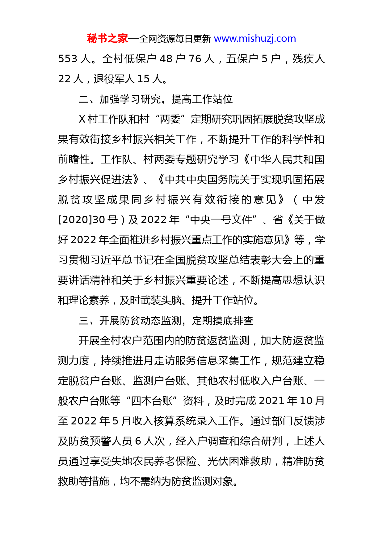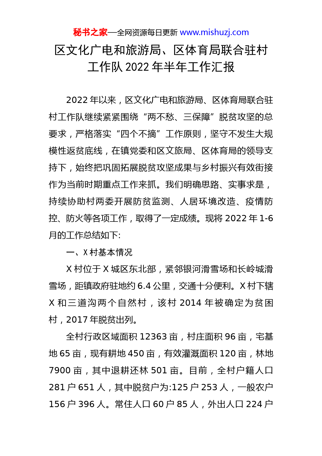 秘书之家—全网资源每日更新www.mishuzj.com区文化广电和旅游局、区体育局联合驻村工作队2022年半年工作汇报2022年以来,区文化广电和旅游局、区体育局联合驻村工作队继续紧紧围绕“两不愁、三保障”脱贫攻坚的总要求,严格落实“四个不摘”工作原则,坚守不发生大规模性返贫底线,在镇党委和区文旅局、区体育局的领导支持下,始终把巩固拓展脱贫攻坚成果与乡村振兴有效街接作为当前时期重点工作来抓。我们明确思路、实事求是,持续协助村两委开展防贫监测、人居环境改造、疫情防控、防火等各项工作,取得了一定成绩。现将2022年1-6月的工作总结如下:一、X村基本情况X村位于X城区东北部,紧邻银河滑雪场和长岭城滑雪场,距镇政府驻地约6.4公里,交通十分便利。X村下辖X和三道沟两个自然村,该村2014年被确定为贫困村,2017年脱贫出列。全村行政区域面积12363亩,村庄面积96亩,宅基地65亩,现有耕地450亩,有效灌溉面积120亩,林地7900亩,其中退耕还林501亩。目前,全村户籍人口281户651人,其中脱贫户为:125户253人,一般农户156户396人。常住人口60户85人,外出人口224户秘书之家—全网资源每日更新www.mishuzj.com553人。全村低保户48户76人,五保户5户,残疾人22人,退役军人15人。二、加强学习研究,提高工作站位X村工作队和村“两委”定期研究巩固拓展脱贫攻坚成果有效街接乡村振兴相关工作,不断提升工作的科学性和前瞻性。工作队、村两委专题研究学习《中华人民共和国乡村振兴促进法》、《中共中央国务院关于实现巩固拓展脱贫攻坚成果同乡村振兴有效衔接的意见》(中发[2020]30号)及2022年“中央一号文件”、省《关于做好2022年全面推进乡村振兴重点工作的实施意见》等,学习贯彻习近平总书记在全国脱贫攻坚总结表彰大会上的重要讲话精神和关于乡村振兴重要论述,不断提高思想认识和理论素养,及时武装头脑、提升工作站位。三、开展防贫动态监测,定期摸底排查开展全村农户范围内的防贫返贫监测,加大防返贫监测力度,持续推进月走访服务信息采集工作,规范建立稳定脱贫户台账、监测户台账、其他农村低收入户台账、一般农户台账等“四本台账”资料,及时完成2021年10月至2022年5月收入核算系统录入工作。通过部门反馈涉及防贫预警人员6人次,经入户调查和综合研判,上述人员通过享受失地农民养老保险、光伏困难救助,精准防贫救助等措施,均不需纳为防贫监测对象。秘书之家—全网资源每日更新www.mishuzj.com今年工作以来,我们及时为1人争取了低保,为1人办理残疾证,为18人申请了光伏困难救助资金,为1人申请了红十字会救助,为1人咨询养殖执照办理业务,为2人办理了慢性病证,为2人申请了光伏公益岗,将1户列入了防贫监测对象,力争最大限度缓解困难群体的生活困境,增强他们的生活信心,共享乡村振兴的美好未来。四、紧盯政策落实,确保政策的稳定持续及时自查全村教育、医疗、住房、饮水、社会保障等“两不愁三保障”主要帮扶政策稳定落实情况,杜绝出现“空白”和“断档”现象。详细了解贫困家庭在校学生“两免一补”“三免一助”政策资金发放情况,及时更新各类台账;配合村两委完成村贫困人口基本医疗保险政府代缴业务,全面持续保障村民的生命健康,有效防止“因病”致贫现象的出现;对农村危房进行常态化排查,确保群众住房安全;按照区委政府、镇党委要求,充分用好31名公益岗人员,持续做好城乡文明、人居环境改造和美化工程,为建设幸福新X贡献X村力量。五、严格工作秩序和流程,扎实推进各项业务进一步做好做实全村基础工作,夯实工作推进,扎实开展各项任务。一是规范公益岗选聘管理,严格人员考勤,实行网格化管理,工资发放实现绩效化、差异化,杜绝出现长期外出务工人员担任公益岗、不符合年龄人员的秘书之家—全网资源每日更新www.mishuzj.com情况等,今年新增公益岗2人。二是严格按程序办理申请医疗费用报销、低保办理、小额贷款等事项,建立和归档全村参保情况,低保台账、小额信贷等台账。三是驻村工作队按要求驻村,全面地学习了解过渡期政策和工作任务,重点有序的开展相关工作。四是积极配合派出单位定期组织帮扶责任人按要求到包联贫困户家中走访,了解并帮助解决实际问题。主动联系区文旅局为村里演出精彩文化节目、区体育局为村里更新配备体育健身设施、区残联为村里部分残疾人员聘请第三方定期进行卫生环境清理等。五是积极配合村两委做好每周二村民的全员核酸秩序维持,做好人居环境改造、冬季防火、汛期防汛等工作。六、下一步工作安排今年是乡村振兴工作推进的关键性一年。我们将紧密立足X村实际,持续发力、接续奋斗,加强政策研究,注重科学发展,科学谋划好各项长远措施。一是实施好本村公益林项目和光伏产业项目。近年来村集体收入主要依靠公益林补偿和光伏产业收入为主,为此,我们积极维护好本村公益林,加大公益林植造面积。加强对公益林的管护,确保公益林面积不减少,公益林补偿不降低,村集体经济收入稳定增长。维护好光伏产业,做好光伏产业相关工作。二是争取区重点扶持项目建设。按照“一村一策”的秘书之家—全网资源每日更新www.mishuzj.com目标要求,为村民种植蔬菜等提供便利条件,争取集中建设蔬菜大棚,提升蔬菜品质,培养致富带头人,发展惠农合