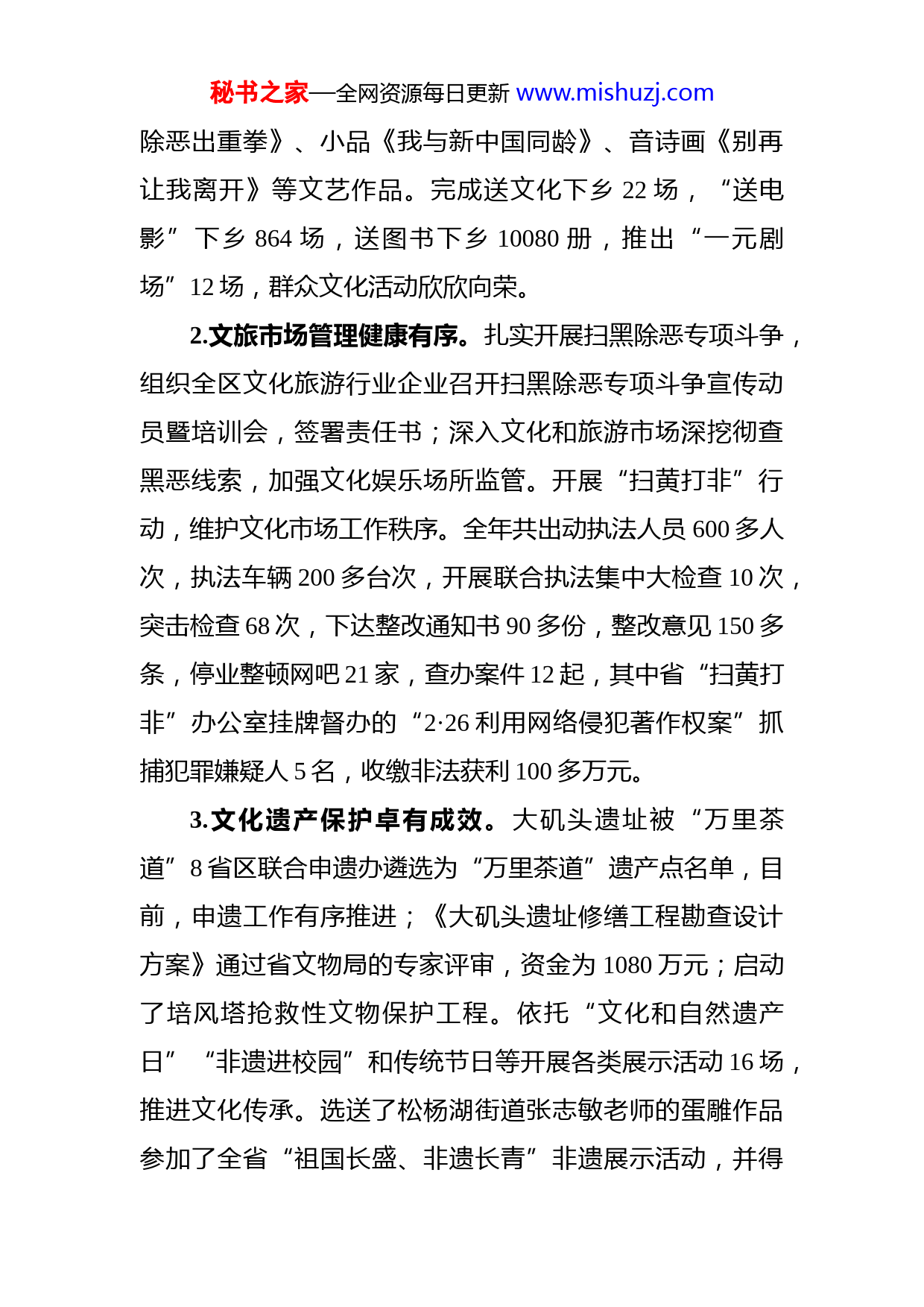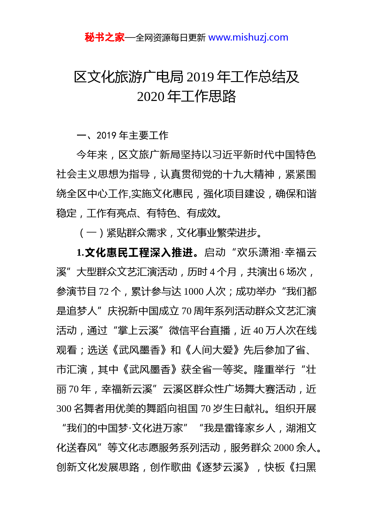 秘书之家—全网资源每日更新www.mishuzj.com区文化旅游广电局2019年工作总结及2020年工作思路一、2019年主要工作今年来,区文旅广新局坚持以习近平新时代中国特色社会主义思想为指导,认真贯彻党的十九大精神,紧紧围绕全区中心工作,实施文化惠民,强化项目建设,确保和谐稳定,工作有亮点、有特色、有成效。(一)紧贴群众需求,文化事业繁荣进步。1.文化惠民工程深入推进。启动“欢乐潇湘·幸福云溪”大型群众文艺汇演活动,历时4个月,共演出6场次,参演节目72个,累计参与达1000人次;成功举办“我们都是追梦人”庆祝新中国成立70周年系列活动群众文艺汇演活动,通过“掌上云溪”微信平台直播,近40万人次在线观看;选送《武风墨香》和《人间大爱》先后参加了省、市汇演,其中《武风墨香》获全省一等奖。隆重举行“壮丽70年,幸福新云溪”云溪区群众性广场舞大赛活动,近300名舞者用优美的舞蹈向祖国70岁生日献礼。组织开展“我们的中国梦·文化进万家”“我是雷锋家乡人,湖湘文化送春风”等文化志愿服务系列活动,服务群众2000余人。创新文化发展思路,创作歌曲《逐梦云溪》,快板《扫黑秘书之家—全网资源每日更新www.mishuzj.com除恶出重拳》、小品《我与新中国同龄》、音诗画《别再让我离开》等文艺作品。完成送文化下乡22场,“送电影”下乡864场,送图书下乡10080册,推出“一元剧场”12场,群众文化活动欣欣向荣。2.文旅市场管理健康有序。扎实开展扫黑除恶专项斗争,组织全区文化旅游行业企业召开扫黑除恶专项斗争宣传动员暨培训会,签署责任书;深入文化和旅游市场深挖彻查黑恶线索,加强文化娱乐场所监管。开展“扫黄打非”行动,维护文化市场工作秩序。全年共出动执法人员600多人次,执法车辆200多台次,开展联合执法集中大检查10次,突击检查68次,下达整改通知书90多份,整改意见150多条,停业整顿网吧21家,查办案件12起,其中省“扫黄打非”办公室挂牌督办的“2·26利用网络侵犯著作权案”抓捕犯罪嫌疑人5名,收缴非法获利100多万元。3.文化遗产保护卓有成效。大矶头遗址被“万里茶道”8省区联合申遗办遴选为“万里茶道”遗产点名单,目前,申遗工作有序推进;《大矶头遗址修缮工程勘查设计方案》通过省文物局的专家评审,资金为1080万元;启动了培风塔抢救性文物保护工程。依托“文化和自然遗产日”“非遗进校园”和传统节日等开展各类展示活动16场,推进文化传承。选送了松杨湖街道张志敏老师的蛋雕作品参加了全省“祖国长盛、非遗长青”非遗展示活动,并得秘书之家—全网资源每日更新www.mishuzj.com到高度评价。(二)依托重点项目,旅游产业有序推进。1.陆城历史文化街区保护修缮项目。启动了4栋古建工程修复和2栋古建新建工程,目前修缮的4栋历史建筑主体工程已完工,正在修复内部设施。另外黄淑烈士故居和20#历史建筑已动工修缮,修缮恢复工程顺利进行。认真做好《岳阳历史文化名城保护条例》宣传工作,多次迎接市区人大常委会的执法检查。2.双花田园综合体项目。今年4月,成立湖南岳阳双花旅游开发有限公司,专事双花村田园综合体综合开发。5月8日与街道办事处签订正式投资协议,7月5日完成土地流转协议签约。目前,完成了近400亩土地的翻耕工作和基本水系建设,完成了双清公路硬化和游步道建设工作,启动了樱花树及其它品种苗木移植栽种和相关生产用房、道路水利升级绿化亮化美化等建设。3.枧冲村3A景区创建工作。结合人居环境整治工作,完成枧冲村3A景区旅游标牌标识建设、墙体立面改造、道路美化绿化等工作。4.清溪·养生谷项目。项目投入3000多万元,编制了总体规划、修建性详细规划等,完成了清溪木岭、象形两组44户房屋收购工作,启动了一期工程调规工作,种植了120亩黄茶。由于受土地调规的影响,项目建设进展缓慢。秘书之家—全网资源每日更新www.mishuzj.com(三)坚持安全稳定,广电事业稳步发展。1.争取政策支持。提请区委、区政府下发了《关于提高市区广播电视节目覆盖率加快推进广播电视村村通向户户通升级的通知》(岳云办发〔2019〕2号),切实巩固和拓展了广播电视宣传阵地,充分发挥了广播电视网络宣传主渠道作用。争取区委、区政府领导重视有线电视相关工作刘正仁区长亲自主持召开专题会议,研究解决了一系列问题。特别是分流了12个三类人员到镇(街道),为有线电视发展轻装上阵提供了有力保障。2.强化安全播出。落实安全播出责任制,多次组织相关责任单位召开专题会议,对全网安全播出传输设施进行故障排查,严格机房安全值班与网络巡查守护,确保了建国70周年活动期间安全播出。3.提质扩面增效。2019年1月,村村响广播正式开通,进一步传播党和政府声音,在发挥应急救灾功能、拓展宣传渠道和途径具有重要的现实意义。为适应有线网络转型升级的新形式,积极争取了人民医院与区妇幼保健院的数据专网、有线电视、固定电话业务,区妇幼保健院内部软件管理系统业务和村村响与区水利预警平台升级改造项目。(四)坚持政治统领,服务保障持续提升1.坚持党的领导。把加强党的建设摆在更加突出位置,认真学习习近平新时代中国特色社会主义思想和党的十九秘书之家—全网资源每日更新www.mishuzj.com大、十九届四中全会精神,坚决落实“两个维护”,强化“四个意识”,坚定“四