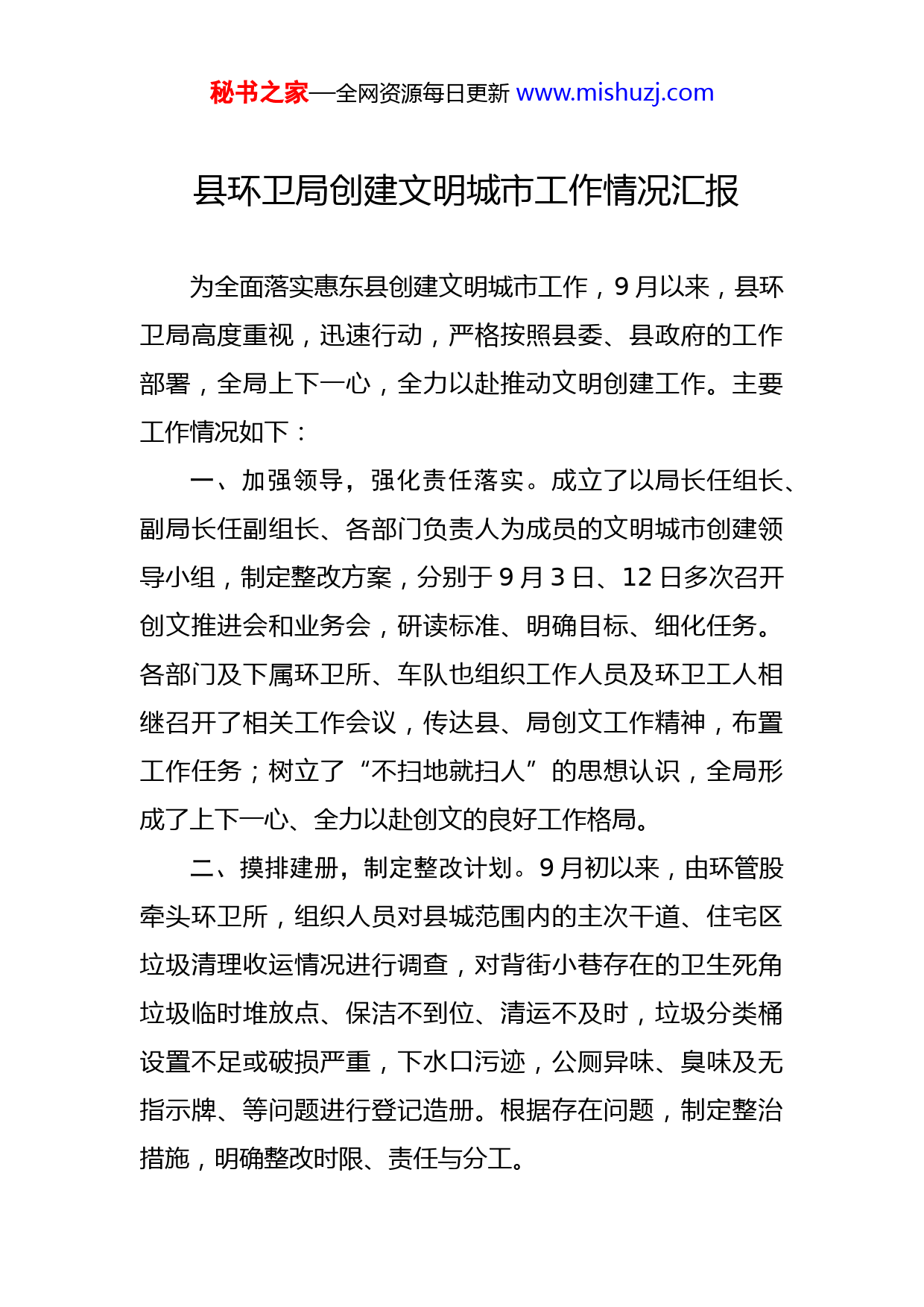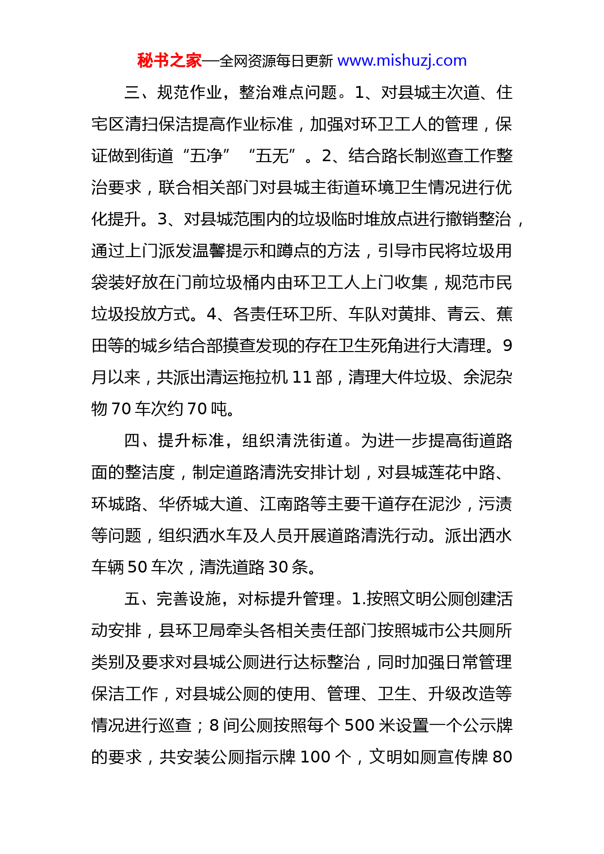 秘书之家—全网资源每日更新www.mishuzj.com县环卫局创建文明城市工作情况汇报为全面落实惠东县创建文明城市工作,9月以来,县环卫局高度重视,迅速行动,严格按照县委、县政府的工作部署,全局上下一心,全力以赴推动文明创建工作。主要工作情况如下:一、加强领导,强化责任落实。成立了以局长任组长、副局长任副组长、各部门负责人为成员的文明城市创建领导小组,制定整改方案,分别于9月3日、12日多次召开创文推进会和业务会,研读标准、明确目标、细化任务。各部门及下属环卫所、车队也组织工作人员及环卫工人相继召开了相关工作会议,传达县、局创文工作精神,布置工作任务;树立了“不扫地就扫人”的思想认识,全局形成了上下一心、全力以赴创文的良好工作格局。二、摸排建册,制定整改计划。9月初以来,由环管股牵头环卫所,组织人员对县城范围内的主次干道、住宅区垃圾清理收运情况进行调查,对背街小巷存在的卫生死角垃圾临时堆放点、保洁不到位、清运不及时,垃圾分类桶设置不足或破损严重,下水口污迹,公厕异味、臭味及无指示牌、等问题进行登记造册。根据存在问题,制定整治措施,明确整改时限、责任与分工。秘书之家—全网资源每日更新www.mishuzj.com三、规范作业,整治难点问题。1、对县城主次道、住宅区清扫保洁提高作业标准,加强对环卫工人的管理,保证做到街道“五净”“五无”。2、结合路长制巡查工作整治要求,联合相关部门对县城主街道环境卫生情况进行优化提升。3、对县城范围内的垃圾临时堆放点进行撤销整治,通过上门派发温馨提示和蹲点的方法,引导市民将垃圾用袋装好放在门前垃圾桶内由环卫工人上门收集,规范市民垃圾投放方式。4、各责任环卫所、车队对黄排、青云、蕉田等的城乡结合部摸查发现的存在卫生死角进行大清理。9月以来,共派出清运拖拉机11部,清理大件垃圾、余泥杂物70车次约70吨。四、提升标准,组织清洗街道。为进一步提高街道路面的整洁度,制定道路清洗安排计划,对县城莲花中路、环城路、华侨城大道、江南路等主要干道存在泥沙,污渍等问题,组织洒水车及人员开展道路清洗行动。派出洒水车辆50车次,清洗道路30条。五、完善设施,对标提升管理。1.按照文明公厕创建活动安排,县环卫局牵头各相关责任部门按照城市公共厕所类别及要求对县城公厕进行达标整治,同时加强日常管理保洁工作,对县城公厕的使用、管理、卫生、升级改造等情况进行巡查;8间公厕按照每个500米设置一个公示牌的要求,共安装公厕指示牌100个,文明如厕宣传牌80秘书之家—全网资源每日更新www.mishuzj.com个。2.加强分类垃圾桶的更新设置工作,300多组四分类垃圾桶布置到各主次干道及试点小区。3.采购4部电动三轮高压清洗车,用于清理道路下水口、果皮箱的污迹,高效推动果皮箱及下水口污迹清理工作。六、加强督查,提高整改时效。由法规股执法队员成立巡查小组,对主街道落实门前三包责任制,随处堆放建筑垃圾进行巡查,发现问题立即上门要求限时整治。局分管领导挂片包干、机关人员下沉到各环卫所加强路面一线巡查管理工作,对巡查发现情况即时发到业务工作微信群限时整改,将整改情况及时反馈,提高整改时效,有力推动路面作业整改工作落实。