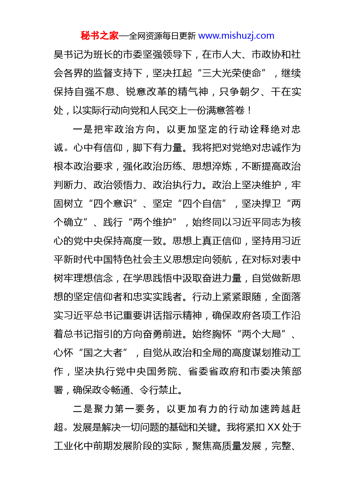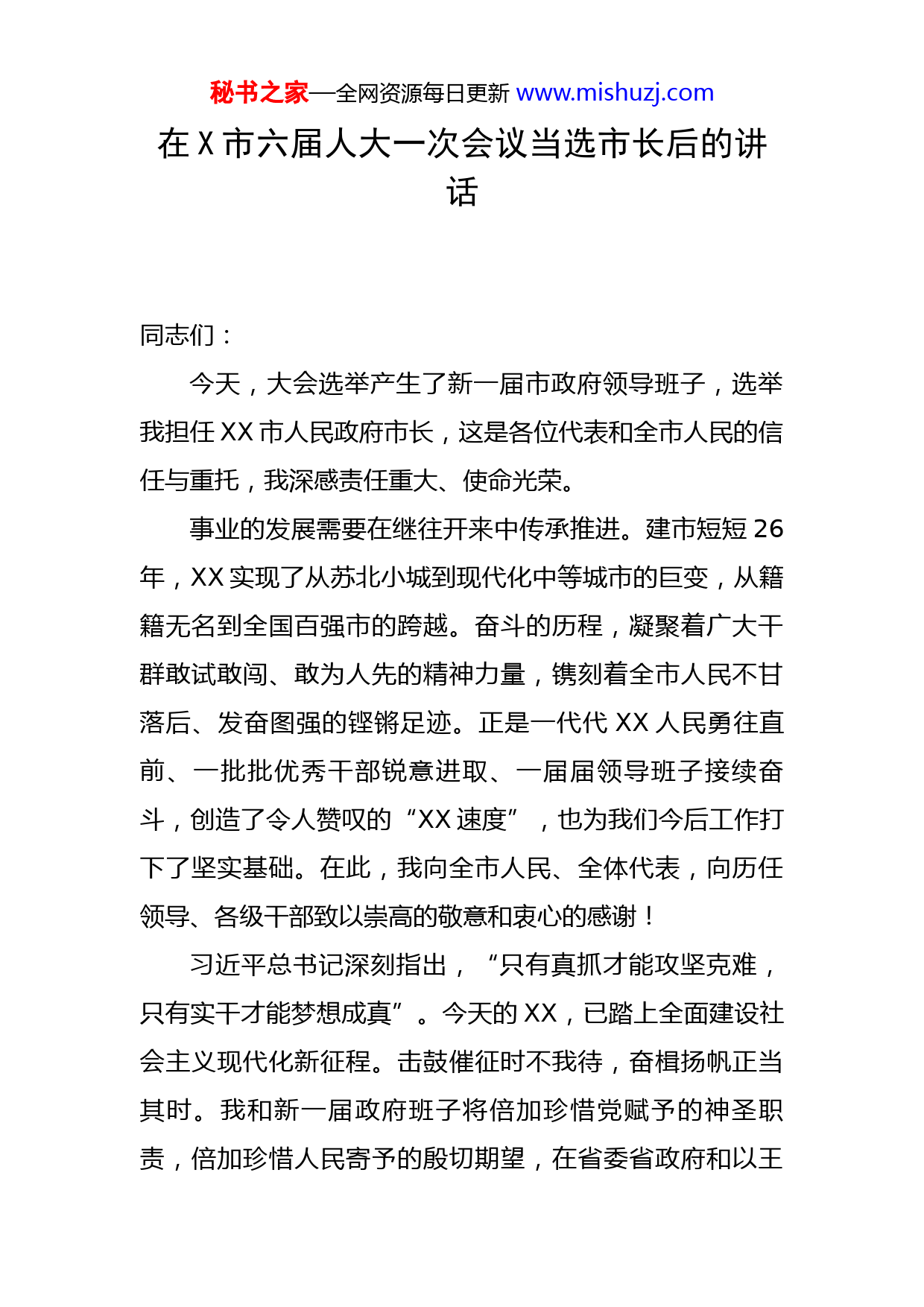 秘书之家—全网资源每日更新www.mishuzj.com在X市六届人大一次会议当选市长后的讲话同志们:今天,大会选举产生了新一届市政府领导班子,选举我担任XX市人民政府市长,这是各位代表和全市人民的信任与重托,我深感责任重大、使命光荣。事业的发展需要在继往开来中传承推进。建市短短26年,XX实现了从苏北小城到现代化中等城市的巨变,从籍籍无名到全国百强市的跨越。奋斗的历程,凝聚着广大干群敢试敢闯、敢为人先的精神力量,镌刻着全市人民不甘落后、发奋图强的铿锵足迹。正是一代代XX人民勇往直前、一批批优秀干部锐意进取、一届届领导班子接续奋斗,创造了令人赞叹的“XX速度”,也为我们今后工作打下了坚实基础。在此,我向全市人民、全体代表,向历任领导、各级干部致以崇高的敬意和衷心的感谢!习近平总书记深刻指出,“只有真抓才能攻坚克难,只有实干才能梦想成真”。今天的XX,已踏上全面建设社会主义现代化新征程。击鼓催征时不我待,奋楫扬帆正当其时。我和新一届政府班子将倍加珍惜党赋予的神圣职责,倍加珍惜人民寄予的殷切期望,在省委省政府和以王秘书之家—全网资源每日更新www.mishuzj.com昊书记为班长的市委坚强领导下,在市人大、市政协和社会各界的监督支持下,坚决扛起“三大光荣使命”,继续保持自强不息、锐意改革的精气神,只争朝夕、干在实处,以实际行动向党和人民交上一份满意答卷!一是把牢政治方向,以更加坚定的行动诠释绝对忠诚。心中有信仰,脚下有力量。我将把对党绝对忠诚作为根本政治要求,强化政治历练、思想淬炼,不断提高政治判断力、政治领悟力、政治执行力。政治上坚决维护,牢固树立“四个意识”、坚定“四个自信”,坚决捍卫“两个确立”、践行“两个维护”,始终同以习近平同志为核心的党中央保持高度一致。思想上真正信仰,坚持用习近平新时代中国特色社会主义思想定向领航,在对标对表中树牢理想信念,在学思践悟中汲取奋进力量,自觉做新思想的坚定信仰者和忠实实践者。行动上紧紧跟随,全面落实习近平总书记重要讲话指示精神,确保政府各项工作沿着总书记指引的方向奋勇前进。始终胸怀“两个大局”、心怀“国之大者”,自觉从政治和全局的高度谋划推动工作,坚决执行党中央国务院、省委省政府和市委决策部署,确保政令畅通、令行禁止。二是聚力第一要务,以更加有力的行动加速跨越赶超。发展是解决一切问题的基础和关键。我将紧扣XX处于工业化中前期发展阶段的实际,聚焦高质量发展,完整、秘书之家—全网资源每日更新www.mishuzj.com准确、全面贯彻新发展理念,聚精会神抓建设,全力以赴促发展,毫不松懈防风险,奋力在“强富美高”新XX建设中闯出新路子、干出新业绩、跑出“加速度”。做大做强跨越赶超实力。始终坚持工业强市、产业兴市不动摇,一着不让抓项目、强产业,坚定不移扩总量、提增量,着力推动产业数字化、智能化、绿色化发展,不断催生发展活力、增强发展能级。全面提升跨越赶超质量。坚持“四化”同步发展,全力推进改革创新,更加坚定地转方式、调结构、促转型,推动高质量发展行稳致远。始终保持跨越赶超速度。坚持高点定位,持续掀起比学赶超热潮,巩固争先进位态势,蓄积后发快进势能,推动经济发展迈出更大步伐。厚植跨越赶超生态底色。深入贯彻“两山”理念,坚持生态优先、绿色发展,让XX天更蓝、水更清、地更绿、空气更清新。三是坚持人民至上,以更加务实的行动践行初心使命。心有人民“政”不偏。我将牢记人民政府为人民,始终以百姓心为心,自觉做到民有所呼我必应之、民有所需我必为之、民有所难我必解之。永葆“为人民服务”的赤子诚心,坚持把“始于群众需求,终于群众满意”作为政府工作导向,自觉从群众立场想问题、作决策、办事情,让民生工作更有泥土的厚度和心灵的温度。满怀“同坐一条板凳”的真情真心,走好新时代党的群众路线,充分相秘书之家—全网资源每日更新www.mishuzj.com信群众、紧紧依靠群众,用心倾听群众呼声,切身感受群众冷暖,自觉同人民想在一起、干在一起。坚守“让老百姓过上好日子”的矢志恒心,积极顺应人民群众对美好生活的向往,聚焦“急难愁盼”问题,接续实施民生实事项目,全力做好“一收一保”群众最关注的事,用力办好“一医一教”群众最期盼的事,倾力抓好“一老一小”群众最牵挂的事,一年接着一年干、一件接着一件办,努力创造更高品质的幸福生活。四是勇于拼搏进取,以更加果敢的行动扛起责任担当。没有等出来的辉煌,只有干出来的精彩。跨越赶超,犹如逆水行舟、滚石上山,没有捷径可抄、没有坦途可走,唯有脚踏实地、负重前行。我将始终保持奋斗姿态,知责于心、担责于身、履责于行。敢于斗争、勇于担当。时刻保持迎难而上、一往无前的昂扬斗志,不惧激流险滩、不畏风吹浪打,越是艰险越向前,以勤政指数换取XX的发展指数、人民的幸福指数。不图虚名、不务虚功。大力弘扬求真务实作风,以功成不必在我、建功必定有我的胸襟,埋头苦干、真抓实干,一步一个脚印走好新的赶考之路。久久为功、善作善成。以咬定青山不放松的执着,始终保持战略定力,锲而不舍抓落实,一张蓝图绘到底,朝着既定目标坚定不移向前进。五是永葆清廉本色,以更加自觉的行动维