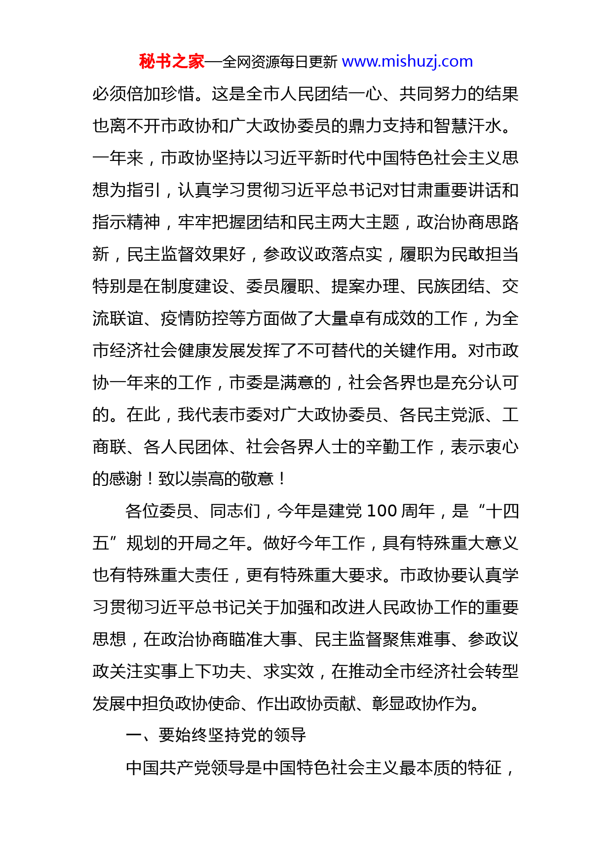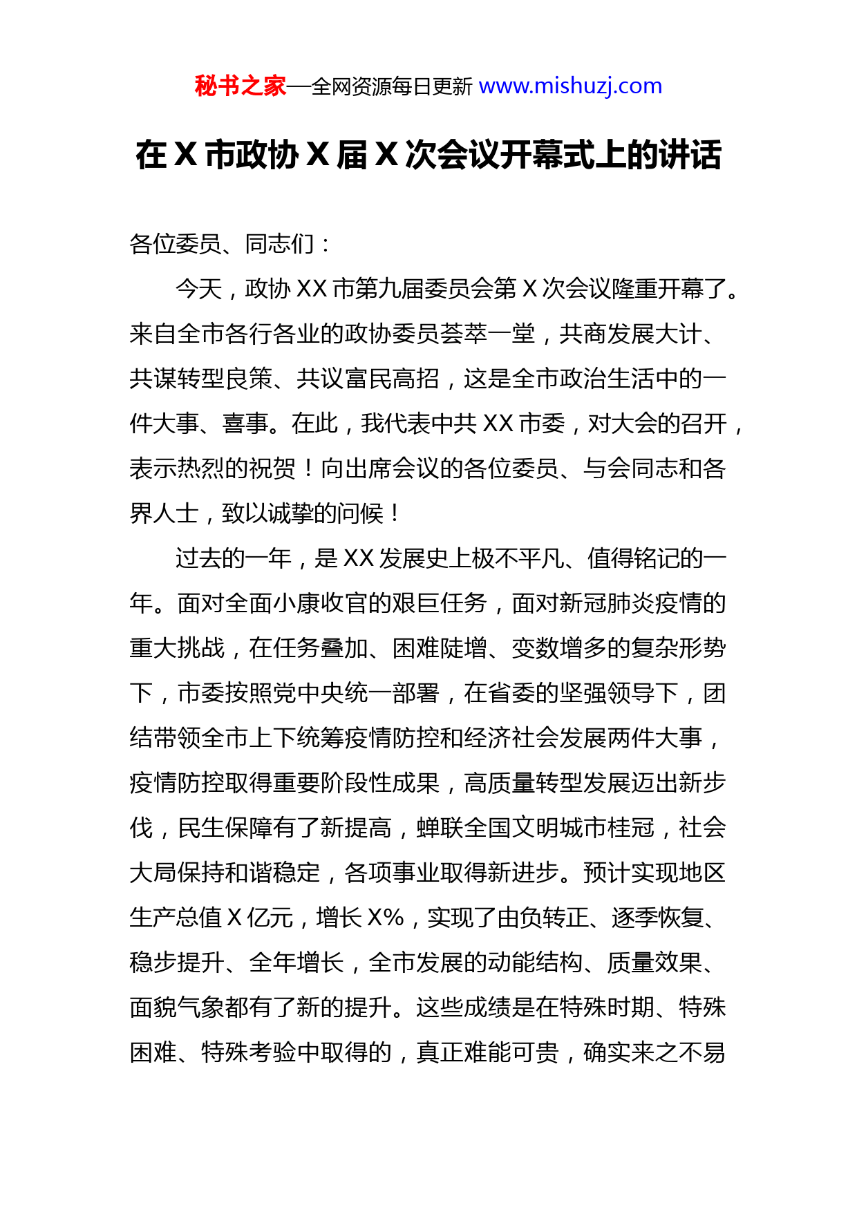 秘书之家—全网资源每日更新www.mishuzj.com在X市政协X届X次会议开幕式上的讲话各位委员、同志们:今天,政协XX市第九届委员会第X次会议隆重开幕了。来自全市各行各业的政协委员荟萃一堂,共商发展大计、共谋转型良策、共议富民高招,这是全市政治生活中的一件大事、喜事。在此,我代表中共XX市委,对大会的召开,表示热烈的祝贺!向出席会议的各位委员、与会同志和各界人士,致以诚挚的问候!过去的一年,是XX发展史上极不平凡、值得铭记的一年。面对全面小康收官的艰巨任务,面对新冠肺炎疫情的重大挑战,在任务叠加、困难陡增、变数增多的复杂形势下,市委按照党中央统一部署,在省委的坚强领导下,团结带领全市上下统筹疫情防控和经济社会发展两件大事,疫情防控取得重要阶段性成果,高质量转型发展迈出新步伐,民生保障有了新提高,蝉联全国文明城市桂冠,社会大局保持和谐稳定,各项事业取得新进步。预计实现地区生产总值X亿元,增长X%,实现了由负转正、逐季恢复、稳步提升、全年增长,全市发展的动能结构、质量效果、面貌气象都有了新的提升。这些成绩是在特殊时期、特殊困难、特殊考验中取得的,真正难能可贵,确实来之不易秘书之家—全网资源每日更新www.mishuzj.com必须倍加珍惜。这是全市人民团结一心、共同努力的结果也离不开市政协和广大政协委员的鼎力支持和智慧汗水。一年来,市政协坚持以习近平新时代中国特色社会主义思想为指引,认真学习贯彻习近平总书记对甘肃重要讲话和指示精神,牢牢把握团结和民主两大主题,政治协商思路新,民主监督效果好,参政议政落点实,履职为民敢担当特别是在制度建设、委员履职、提案办理、民族团结、交流联谊、疫情防控等方面做了大量卓有成效的工作,为全市经济社会健康发展发挥了不可替代的关键作用。对市政协一年来的工作,市委是满意的,社会各界也是充分认可的。在此,我代表市委对广大政协委员、各民主党派、工商联、各人民团体、社会各界人士的辛勤工作,表示衷心的感谢!致以崇高的敬意!各位委员、同志们,今年是建党100周年,是“十四五”规划的开局之年。做好今年工作,具有特殊重大意义也有特殊重大责任,更有特殊重大要求。市政协要认真学习贯彻习近平总书记关于加强和改进人民政协工作的重要思想,在政治协商瞄准大事、民主监督聚焦难事、参政议政关注实事上下功夫、求实效,在推动全市经济社会转型发展中担负政协使命、作出政协贡献、彰显政协作为。一、要始终坚持党的领导中国共产党领导是中国特色社会主义最本质的特征,秘书之家—全网资源每日更新www.mishuzj.com是我们的最大优势、根本依靠和自信所在。去年新冠肺炎疫情发生后,以习近平同志为核心的党中央全面加强对疫情防控的集中统一领导,“中国之治”和“西方之乱”形成了鲜明对比,中国经济率先实现正增长和世界经济低迷徘徊形成了鲜明对比,中国全国一心、快速行动和西方多国民意分歧、举棋不定形成了鲜明对比,充分彰显了中国特色社会主义的制度优势、战略优势、发展优势。市政协和广大政协委员要毫不动摇坚持党的全面领导,坚决在思想上政治上行动上同以习近平同志为核心的党中央保持高度一致,不断增强对中国特色社会主义的政治认同、思想认同和情感认同,筑牢共同思想政治基础。要切实增强“四个意识”、坚定“四个自信”、做到“两个维护”,通过政协制度的有效运转和民主程序,把党的主张转化为社会各界的共识,确保党委的工作部署到哪里、政协的力量就汇聚到哪里,党委的任务推进到哪里、政协的作用就发挥到哪里。二、要全力服务发展大局“十四五”时期,是XX的多元机遇期、动能释放期、发展黄金期,更是XX的接续奋斗期、再次创业期、攻坚克难期。市政协是全市重要的政治力量、发展力量、工作力量,要善于在大局下思考、在全局下行动、在变局中谋划在新局中作为,真正做到协之有力、商之有效、研之有道秘书之家—全网资源每日更新www.mishuzj.com参之有物。当前,尤其要围绕推动高质量发展、融入新发展格局,抢抓“一带一路”机遇、加快区域协同发展、推进“关城、钢城、核城”一体建设、生态产业培育、加大招商引资和项目建设力度等重点工作,深入开展调查研究和专项视察,努力形成一批有份量、高质量、有见地、可落实的调研报告,为市委、市政府科学决策提供参考。要主动适应政协工作的新规律、新趋势、新特点,善于运用互联网、大数据、云计算等现代履职手段,增强资政建言的前瞻性、精准性,提升凝聚共识的针对性、有效性。要把握建言议政的“时度效”,既要敢言、又要能言、还要会言、也要准言,真正做到建言资政有用、凝聚共识有效。对XX发展而言,市政协有政治责任、有法律地位、有工作手段,要依法监督、民主监督、坦诚监督、高效监督,拓展监督平台,创新监督模式,紧紧围绕市委、市政府重大工作安排、重大项目推进、重点工作落地,紧紧围绕协调联络、问题解决、工作开展,加强协商成果的跟踪督办,坚决防止和克服形式主义、官僚主义,以监督倒逼落实、保障落实、检验落实、推动落实。三、要高效增进民生福祉人民政协是党和政府联系群众、团结各界的重要桥梁纽带,最了解群众的所思所想、所忧所盼、所急