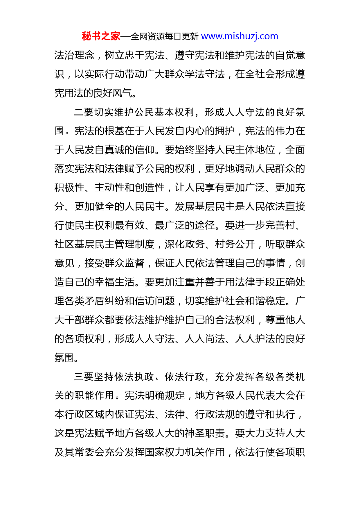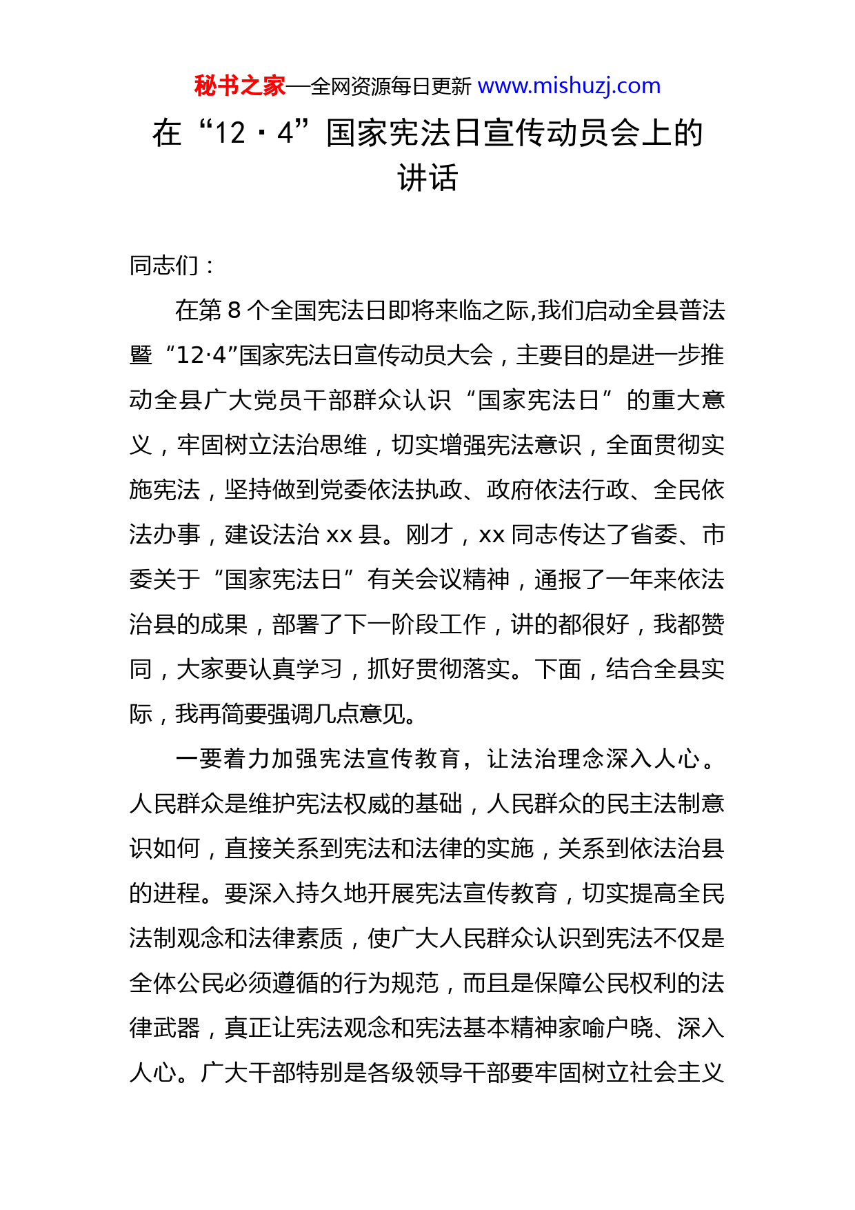 秘书之家—全网资源每日更新www.mishuzj.com在“12·4”国家宪法日宣传动员会上的讲话同志们:在第8个全国宪法日即将来临之际,我们启动全县普法暨“12·4”国家宪法日宣传动员大会,主要目的是进一步推动全县广大党员干部群众认识“国家宪法日”的重大意义,牢固树立法治思维,切实增强宪法意识,全面贯彻实施宪法,坚持做到党委依法执政、政府依法行政、全民依法办事,建设法治xx县。刚才,xx同志传达了省委、市委关于“国家宪法日”有关会议精神,通报了一年来依法治县的成果,部署了下一阶段工作,讲的都很好,我都赞同,大家要认真学习,抓好贯彻落实。下面,结合全县实际,我再简要强调几点意见。一要着力加强宪法宣传教育,让法治理念深入人心。人民群众是维护宪法权威的基础,人民群众的民主法制意识如何,直接关系到宪法和法律的实施,关系到依法治县的进程。要深入持久地开展宪法宣传教育,切实提高全民法制观念和法律素质,使广大人民群众认识到宪法不仅是全体公民必须遵循的行为规范,而且是保障公民权利的法律武器,真正让宪法观念和宪法基本精神家喻户晓、深入人心。广大干部特别是各级领导干部要牢固树立社会主义秘书之家—全网资源每日更新www.mishuzj.com法治理念,树立忠于宪法、遵守宪法和维护宪法的自觉意识,以实际行动带动广大群众学法守法,在全社会形成遵宪用法的良好风气。二要切实维护公民基本权利,形成人人守法的良好氛围。宪法的根基在于人民发自内心的拥护,宪法的伟力在于人民发自真诚的信仰。要始终坚持人民主体地位,全面落实宪法和法律赋予公民的权利,更好地调动人民群众的积极性、主动性和创造性,让人民享有更加广泛、更加充分、更加健全的人民民主。发展基层民主是人民依法直接行使民主权利最有效、最广泛的途径。要进一步完善村、社区基层民主管理制度,深化政务、村务公开,听取群众意见,接受群众监督,保证人民依法管理自己的事情,创造自己的幸福生活。要更加注重并善于用法律手段正确处理各类矛盾纠纷和信访问题,切实维护社会和谐稳定。广大干部群众都要依法维护维护自己的合法权利,尊重他人的各项权利,形成人人守法、人人尚法、人人护法的良好氛围。三要坚持依法执政、依法行政,充分发挥各级各类机关的职能作用。宪法明确规定,地方各级人民代表大会在本行政区域内保证宪法、法律、行政法规的遵守和执行,这是宪法赋予地方各级人大的神圣职责。要大力支持人大及其常委会充分发挥国家权力机关作用,依法行使各项职秘书之家—全网资源每日更新www.mishuzj.com权,确保宪法的规定得到更好地落实。要强化法律法规执行情况的监督检查,创新监督方式,提升监督实效,真正做到有法必依、执法必严、违法必究。各级行政机关在贯彻实施宪法中具有十分重要的地位,要全面推进依法行政,深化行政体制改革,加快转变政府职能,努力打造法治型、服务型政府。要积极推进司法体制改革,优化职权配置,规范司法行为,确保人民法院和人民检察院依法独立公正行使审判权、检察权,切实维护社会公平正义。四要加强党的领导,着力提升依法执政能力。要把坚持党的领导、人民当家作主和依法执政有机统一起来,切实提升依宪执政、依法执政的能力和水平,真正做到党领导立法、保证执法、带头守法。要积极发展党内民主,坚持民主集中制,健全党内民主制度体系,以党内民主带动社会民主。广大党员尤其是党员领导干部要自觉做遵守宪法的模范,恪守宪法原则,履行宪法使命,按照宪法办事,带动全社会严格贯彻实施宪法。任何组织或者个人都不得有超越宪法和法律的特权,绝不允许以言代法、以权压法、徇私枉法。一切违反宪法和法律的行为,都必须予以追究。总之,树立宪法意识,维护宪法权威,责任重大,意义深远。我们一定深入学习贯彻习近平新时代中国特色社会主义思想,深入学习贯彻党的十九届六中全会精神,切秘书之家—全网资源每日更新www.mishuzj.com实抓好宪法实施工作,不断推进依法治县进程,为推动全县各项事业不断买上新台阶、全方位推动高质量发展超越提供坚强法制保障。