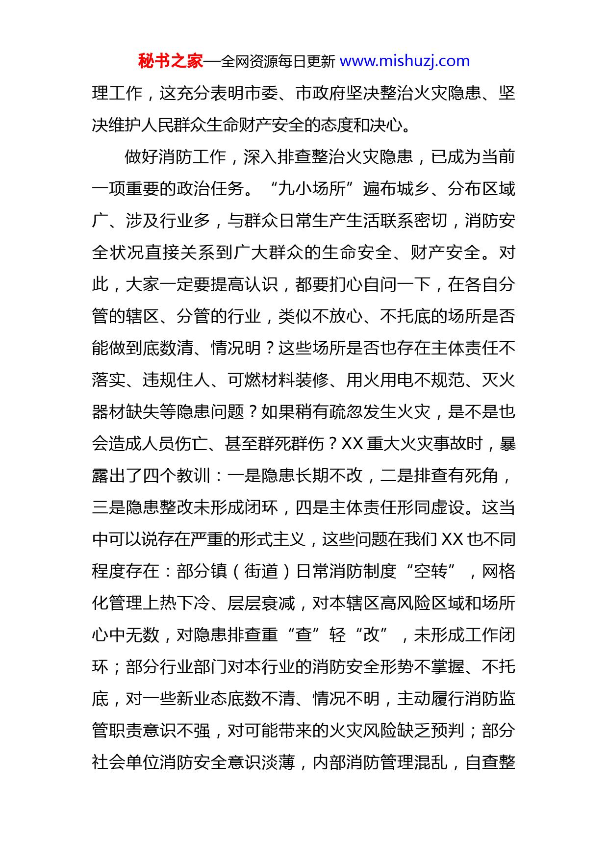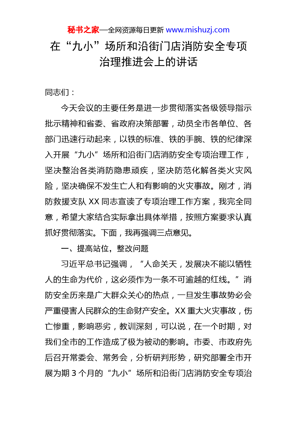 秘书之家—全网资源每日更新www.mishuzj.com在“九小”场所和沿街门店消防安全专项治理推进会上的讲话同志们:今天会议的主要任务是进一步贯彻落实各级领导指示批示精神和省委、省政府决策部署,动员全市各单位、各部门迅速行动起来,以铁的标准、铁的手腕、铁的纪律深入开展“九小”场所和沿街门店消防安全专项治理工作,坚决整治各类消防隐患顽疾,坚决防范化解各类火灾风险,坚决确保不发生亡人和有影响的火灾事故。刚才,消防救援支队XX同志宣读了专项治理工作方案,我完全同意,希望大家结合实际拿出具体举措,按照方案要求认真抓好贯彻落实。下面,我再强调三点意见。一、提高站位,整改问题习近平总书记强调,“人命关天,发展决不能以牺牲人的生命为代价,这必须作为一条不可逾越的红线。”消防安全历来是广大群众关心的热点,一旦发生事故势必会严重侵害人民群众的生命财产安全。XX重大火灾事故,伤亡惨重,影响恶劣,教训深刻,可以说,在一个时期,对我们全市的工作造成了极为被动的影响。市委、市政府先后召开常委会、常务会,分析研判形势,研究部署全市开展为期3个月的“九小”场所和沿街门店消防安全专项治秘书之家—全网资源每日更新www.mishuzj.com理工作,这充分表明市委、市政府坚决整治火灾隐患、坚决维护人民群众生命财产安全的态度和决心。做好消防工作,深入排查整治火灾隐患,已成为当前一项重要的政治任务。“九小场所”遍布城乡、分布区域广、涉及行业多,与群众日常生产生活联系密切,消防安全状况直接关系到广大群众的生命安全、财产安全。对此,大家一定要提高认识,都要扪心自问一下,在各自分管的辖区、分管的行业,类似不放心、不托底的场所是否能做到底数清、情况明?这些场所是否也存在主体责任不落实、违规住人、可燃材料装修、用火用电不规范、灭火器材缺失等隐患问题?如果稍有疏忽发生火灾,是不是也会造成人员伤亡、甚至群死群伤?XX重大火灾事故时,暴露出了四个教训:一是隐患长期不改,二是排查有死角,三是隐患整改未形成闭环,四是主体责任形同虚设。这当中可以说存在严重的形式主义,这些问题在我们XX也不同程度存在:部分镇(街道)日常消防制度“空转”,网格化管理上热下冷、层层衰减,对本辖区高风险区域和场所心中无数,对隐患排查重“查”轻“改”,未形成工作闭环;部分行业部门对本行业的消防安全形势不掌握、不托底,对一些新业态底数不清、情况不明,主动履行消防监管职责意识不强,对可能带来的火灾风险缺乏预判;部分社会单位消防安全意识淡薄,内部消防管理混乱,自查整秘书之家—全网资源每日更新www.mishuzj.com改流于形式,员工缺乏消防教育培训,这些问题应该引起我们的忧虑。针对以上属地管理不到位、行业监管不履职、主体责任不落实的问题和短板,各单位、各部门务必要高度重视、认真对待,深刻查找在思想认识、工作作风、担当作为等方面存在的不足,切实增强忧患意识,坚持底线思维,进一步提升政治站位,落实工作责任,健全工作机制,以强烈的责任感、紧迫感扎实开展全覆盖、无盲区、地毯式的排查治理,坚决整治“九小”场所隐患顽疾,切实改善基层消防安全基础。消防工作是脏活、累活、苦活,大家做了很多工作,市委、市政府也非常理解、体谅、支持,安全工作容不得稍有松懈,松懈就会出问题,大家要切实提高认识、提高站位,一如既往担起这份责任,为经济社会发展和人民群众生命财产安全提供良好的消防安全环境。二、突出重点,细化措施习近平总书记强调,“安全生产,要坚持防患于未然。要继续开展安全生产大检查,做到‘全覆盖、零容忍、严执法、重实效’。”此次专项治理,要按照“从根本上消除事故隐患”的总要求,进一步明确整治范围、突出工作重点,坚持“十个一律”整治措施,坚决抓好贯彻落实。秘书之家—全网资源每日更新www.mishuzj.com一要突出拉网排查。排查整治要不留死角、不留盲区、不留漏洞。各片区、镇(街道)主要负责同志要亲自带队、班子成员要划片包干,要抽调机关干部混合编组,全面组织发动派出所、社区、村(居)委会等基层网格化管理力量,逐条街道、逐个场所开展排查,逐一登记造册,严格按照时间节点要求,扎实开展隐患排查治理和消防宣传教育。二要突出重点场所。各行业主管部门要落实“三管三必须”要求,自觉认领任务,加强对派出机构和镇(街道)对口业务部门的工作指导,深入开展行业领域小单位、小场所的排查整治。同时要持续紧盯养老福利机构、学校、幼儿园、校外培训机构、高层建筑、卫生医疗机构、商业综合体、旅游景区(点)、文博单位、公共娱乐、物流仓储、危化品等火灾防控重点区域和场所,开展全方位、全覆盖的整治活动,分行业、分领域完善基础信息台账,全力防范化解各类消防风险隐患。三要突出铁腕治患。从火灾案例的教训来看,违规留宿住人、防火分隔不到位、违规用火用电、堵塞占用安全出口和疏散通道、消防设施器材损坏停用、初起火灾处置不当等问题,是造成损失扩大甚至发生亡人火灾的主要致灾因素。因此,治理过程中要将主要精力放在督促整改此类隐患上,要严格落实“十个一律”整治措施,凡检查发秘书之家—全网资源每日更新www.mishuzj.com现仍存在重大火灾隐