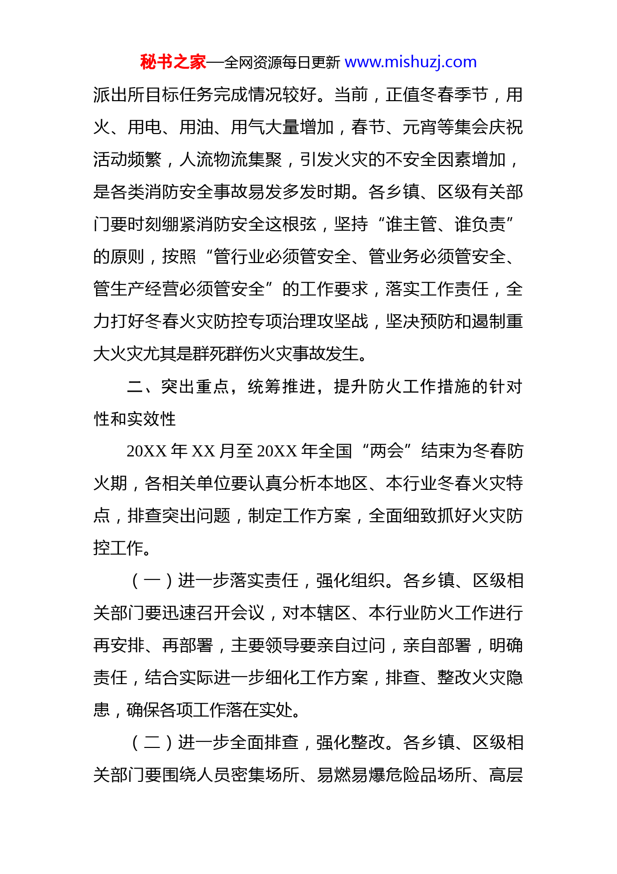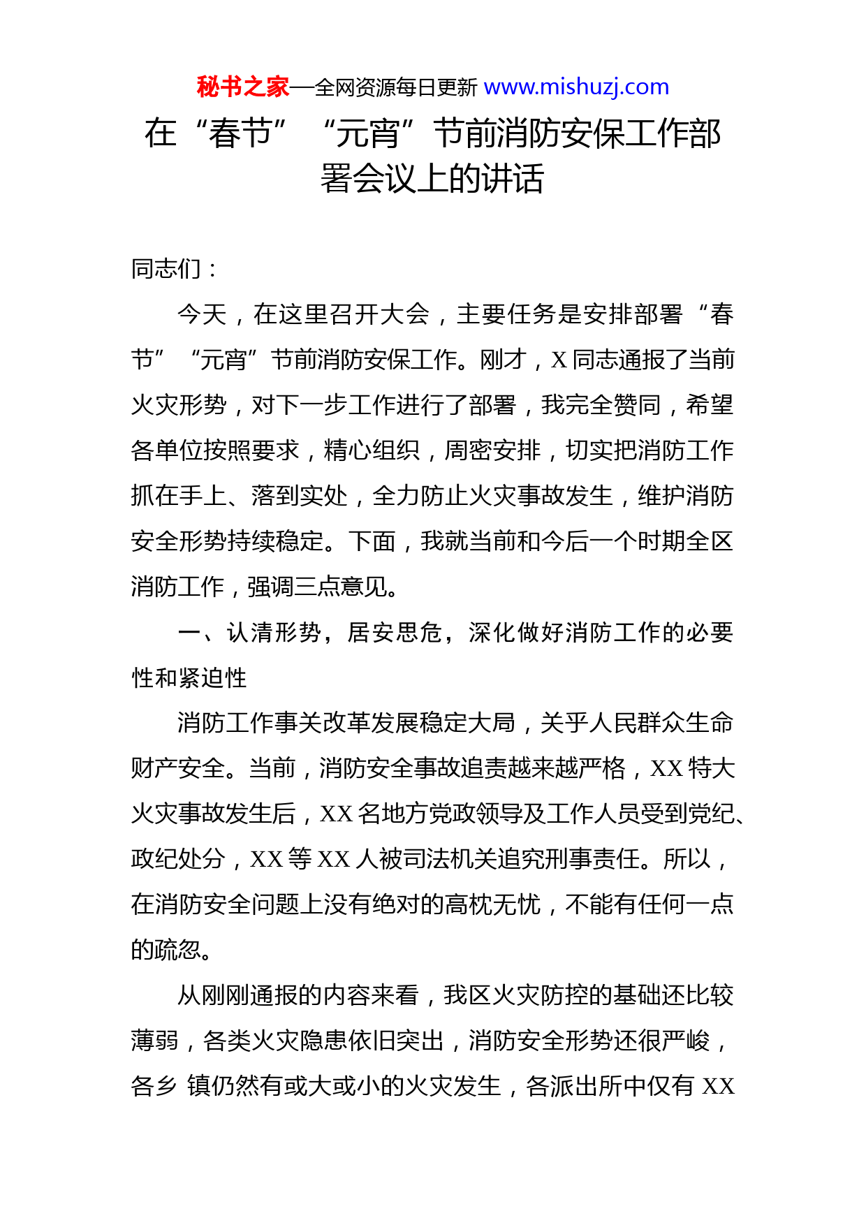 秘书之家—全网资源每日更新www.mishuzj.com在“春节”“元宵”节前消防安保工作部署会议上的讲话同志们:今天,在这里召开大会,主要任务是安排部署“春节”“元宵”节前消防安保工作。刚才,X同志通报了当前火灾形势,对下一步工作进行了部署,我完全赞同,希望各单位按照要求,精心组织,周密安排,切实把消防工作抓在手上、落到实处,全力防止火灾事故发生,维护消防安全形势持续稳定。下面,我就当前和今后一个时期全区消防工作,强调三点意见。一、认清形势,居安思危,深化做好消防工作的必要性和紧迫性消防工作事关改革发展稳定大局,关乎人民群众生命财产安全。当前,消防安全事故追责越来越严格,XX特大火灾事故发生后,XX名地方党政领导及工作人员受到党纪、政纪处分,XX等XX人被司法机关追究刑事责任。所以,在消防安全问题上没有绝对的高枕无忧,不能有任何一点的疏忽。从刚刚通报的内容来看,我区火灾防控的基础还比较薄弱,各类火灾隐患依旧突出,消防安全形势还很严峻,各乡镇仍然有或大或小的火灾发生,各派出所中仅有XX秘书之家—全网资源每日更新www.mishuzj.com派出所目标任务完成情况较好。当前,正值冬春季节,用火、用电、用油、用气大量增加,春节、元宵等集会庆祝活动频繁,人流物流集聚,引发火灾的不安全因素增加,是各类消防安全事故易发多发时期。各乡镇、区级有关部门要时刻绷紧消防安全这根弦,坚持“谁主管、谁负责”的原则,按照“管行业必须管安全、管业务必须管安全、管生产经营必须管安全”的工作要求,落实工作责任,全力打好冬春火灾防控专项治理攻坚战,坚决预防和遏制重大火灾尤其是群死群伤火灾事故发生。二、突出重点,统筹推进,提升防火工作措施的针对性和实效性20XX年XX月至20XX年全国“两会”结束为冬春防火期,各相关单位要认真分析本地区、本行业冬春火灾特点,排查突出问题,制定工作方案,全面细致抓好火灾防控工作。(一)进一步落实责任,强化组织。各乡镇、区级相关部门要迅速召开会议,对本辖区、本行业防火工作进行再安排、再部署,主要领导要亲自过问,亲自部署,明确责任,结合实际进一步细化工作方案,排查、整改火灾隐患,确保各项工作落在实处。(二)进一步全面排查,强化整改。各乡镇、区级相关部门要围绕人员密集场所、易燃易爆危险品场所、高层秘书之家—全网资源每日更新www.mishuzj.com建筑、独居老人住所等场所和城中村、棚户区等重点区域以及春节、元宵节和“两会”等重点时段,全面开展消防安全专项整治行动。各乡镇要以农村、社区为重点,着力解决农村地区违规用火、用电和秸秆、柴草随意堆放等问题,家火山火一起防,加强对火灾事故的第一时间处置。各行业主管部门要综合分析研判本行业内的消防安全形势找准弱点和难点,开展行业专项治理,着力解决本行业内较为突出的火灾隐患和问题。区消防部门要以重点单位和重点监管单位为排查重点,确保重点单位不发生火灾,不出现问题,同时要大力排查和整改区域性消防安全隐患,深入督导整改重大火灾隐患,并积极解决社会关注,群众反映强烈的隐患。各公安派出所要认真开展独居老人住所的排查整治工作,每月上报排查情况,严防火灾事故的发生。(三)进一步凝聚共识,强化宣传。各乡镇、区级相关部门要大力开展以冬季防火安全为主题的消防宣传工作结合消防宣传“七进”活动,充分利用传统媒体和新兴媒介,采用大众化、信息化的消防宣传教育方式,使消防知识深入社区、学校、企业、农村、家庭等社会各个层面,提升广大群众的消防安全意识,形成全民关注、参与、支持消防工作的良好局面。(四)进一步夯实基础,强化保障。各乡镇要落实社秘书之家—全网资源每日更新www.mishuzj.com会应急救援联动机制,发动社会力量配合参与灭火救援。区消防部门要结合实际深入开展冬季练兵活动,组织官兵深入辖区重点单位和火灾易发多发区域进行熟悉和演练。各行业主管部门要对内部消防设施定期进行全面检测,确保管理规范、设施完好。区水务部门要对现有消防水源情况进行排查登记,对市政消防水源全面维修、保养,确保完好可用。各乡镇、区消安委各成员单位要积极开展火灾应急疏散演练,切实提升灾害事故和突发事件的应对能力。三、科学研判,合理规划,确保消防事业发展的前瞻性和全局性(一)认真谋划2020年消防工作。各乡镇、区级相关部门要主动谋划、积极作为,对本辖区、本行业消防安全形势进行全面分析评估,摸清存在的突出问题和薄弱环节掌握公共消防安全情况,提出有针对性的对策意见,不断强化消防安全管理,着力夯实消防安全基础,强力整治火灾隐患,加大宣传教育培训力度,不断提升公共消防安全水平,确保2020年全区消防安全工作再上新台阶。(二)科学编制“十四五”消防规划。“十四五”时期,是X实现跨越发展、决胜脱贫奔康的关键期,消防工作的重要性将更加凸显。我区消防基础设施欠账较多,各单位要积极做好“十四五”消防事业规划编制工作,根据区域面积、常住人口和灭火救援任务量等实际需要,依照有关秘书之家—全网资源每日更新www.mishuzj.com标准加强消防站、消防供水、市政消火栓等公共消防设施建设,充实消防装备、消防力量,尽快补齐短板、还上欠账,确保“十四五”期间“