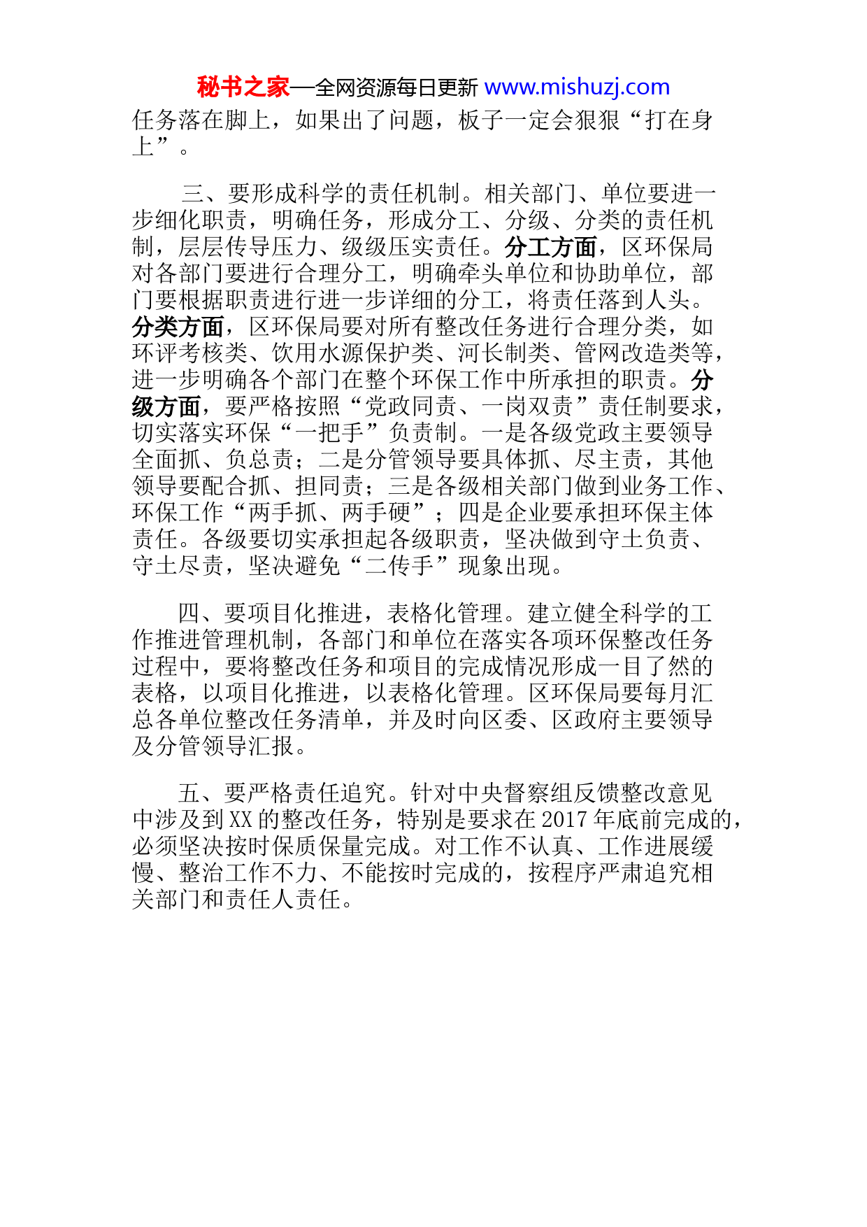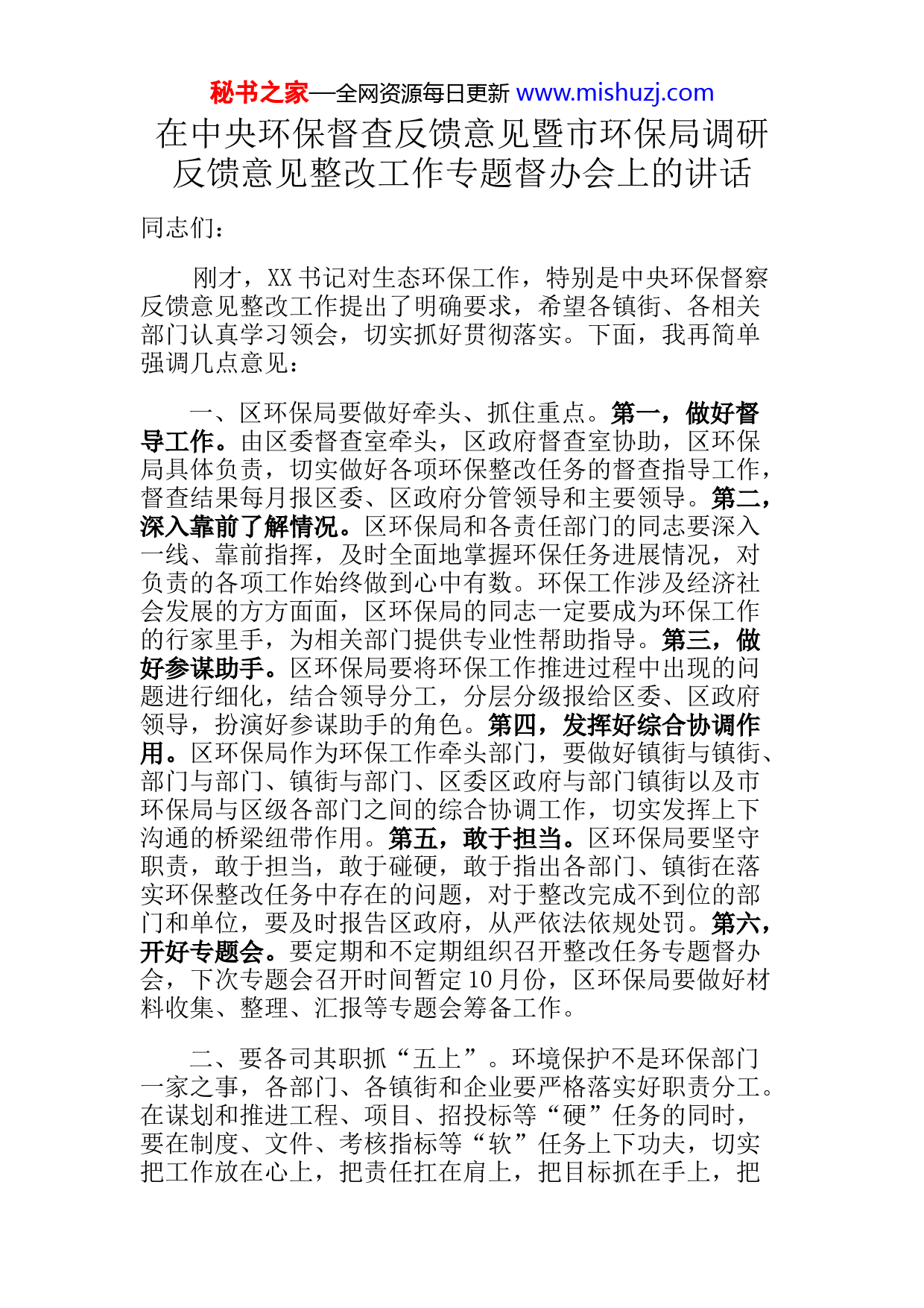 秘书之家—全网资源每日更新www.mishuzj.com在中央环保督查反馈意见暨市环保局调研反馈意见整改工作专题督办会上的讲话同志们:刚才,XX书记对生态环保工作,特别是中央环保督察反馈意见整改工作提出了明确要求,希望各镇街、各相关部门认真学习领会,切实抓好贯彻落实。下面,我再简单强调几点意见:一、区环保局要做好牵头、抓住重点。第一,做好督导工作。由区委督查室牵头,区政府督查室协助,区环保局具体负责,切实做好各项环保整改任务的督查指导工作,督查结果每月报区委、区政府分管领导和主要领导。第二,深入靠前了解情况。区环保局和各责任部门的同志要深入一线、靠前指挥,及时全面地掌握环保任务进展情况,对负责的各项工作始终做到心中有数。环保工作涉及经济社会发展的方方面面,区环保局的同志一定要成为环保工作的行家里手,为相关部门提供专业性帮助指导。第三,做好参谋助手。区环保局要将环保工作推进过程中出现的问题进行细化,结合领导分工,分层分级报给区委、区政府领导,扮演好参谋助手的角色。第四,发挥好综合协调作用。区环保局作为环保工作牵头部门,要做好镇街与镇街、部门与部门、镇街与部门、区委区政府与部门镇街以及市环保局与区级各部门之间的综合协调工作,切实发挥上下沟通的桥梁纽带作用。第五,敢于担当。区环保局要坚守职责,敢于担当,敢于碰硬,敢于指出各部门、镇街在落实环保整改任务中存在的问题,对于整改完成不到位的部门和单位,要及时报告区政府,从严依法依规处罚。第六,开好专题会。要定期和不定期组织召开整改任务专题督办会,下次专题会召开时间暂定10月份,区环保局要做好材料收集、整理、汇报等专题会筹备工作。二、要各司其职抓“五上”。环境保护不是环保部门一家之事,各部门、各镇街和企业要严格落实好职责分工。在谋划和推进工程、项目、招投标等“硬”任务的同时,要在制度、文件、考核指标等“软”任务上下功夫,切实把工作放在心上,把责任扛在肩上,把目标抓在手上,把秘书之家—全网资源每日更新www.mishuzj.com任务落在脚上,如果出了问题,板子一定会狠狠“打在身上”。三、要形成科学的责任机制。相关部门、单位要进一步细化职责,明确任务,形成分工、分级、分类的责任机制,层层传导压力、级级压实责任。分工方面,区环保局对各部门要进行合理分工,明确牵头单位和协助单位,部门要根据职责进行进一步详细的分工,将责任落到人头。分类方面,区环保局要对所有整改任务进行合理分类,如环评考核类、饮用水源保护类、河长制类、管网改造类等,进一步明确各个部门在整个环保工作中所承担的职责。分级方面,要严格按照“党政同责、一岗双责”责任制要求,切实落实环保“一把手”负责制。一是各级党政主要领导全面抓、负总责;二是分管领导要具体抓、尽主责,其他领导要配合抓、担同责;三是各级相关部门做到业务工作、环保工作“两手抓、两手硬”;四是企业要承担环保主体责任。各级要切实承担起各级职责,坚决做到守土负责、守土尽责,坚决避免“二传手”现象出现。四、要项目化推进,表格化管理。建立健全科学的工作推进管理机制,各部门和单位在落实各项环保整改任务过程中,要将整改任务和项目的完成情况形成一目了然的表格,以项目化推进,以表格化管理。区环保局要每月汇总各单位整改任务清单,并及时向区委、区政府主要领导及分管领导汇报。五、要严格责任追究。针对中央督察组反馈整改意见中涉及到XX的整改任务,特别是要求在2017年底前完成的,必须坚决按时保质保量完成。对工作不认真、工作进展缓慢、整治工作不力、不能按时完成的,按程序严肃追究相关部门和责任人责任。