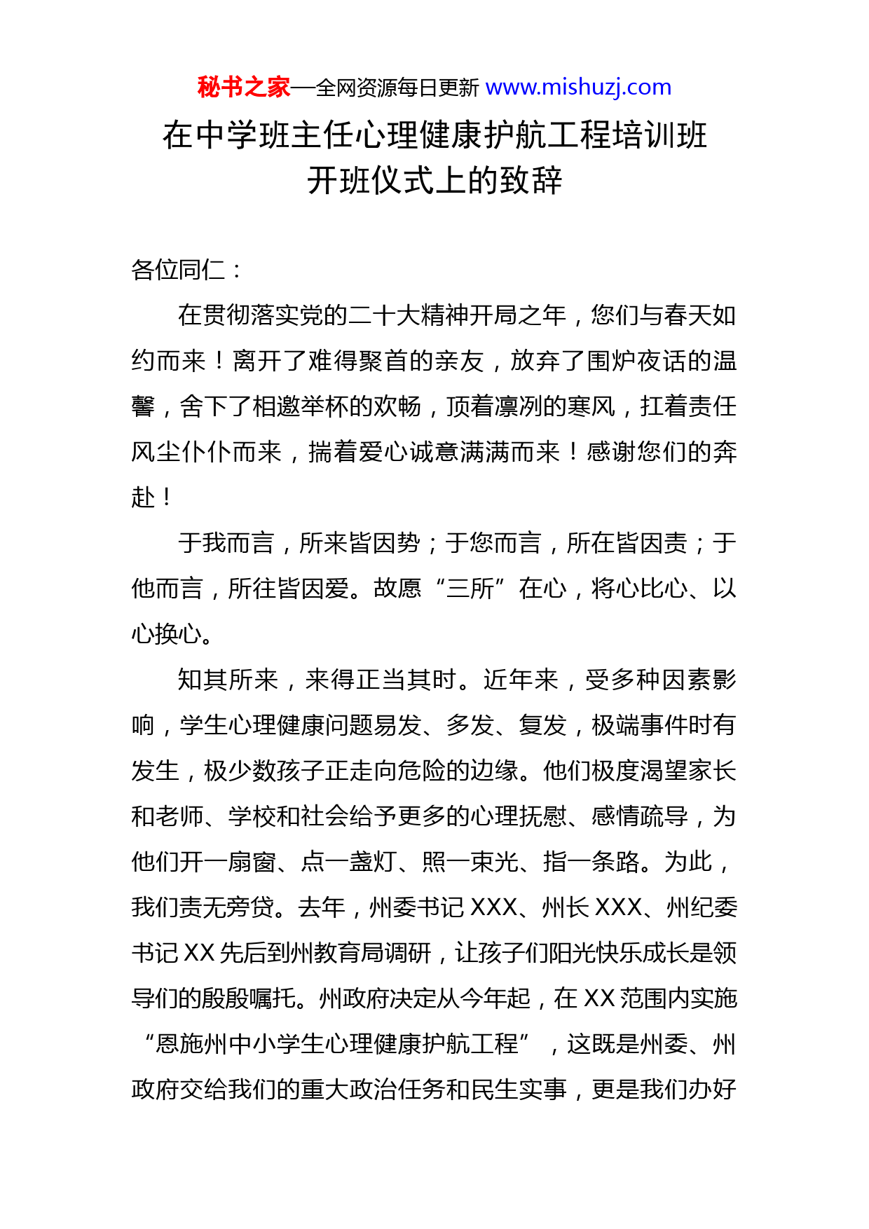 秘书之家—全网资源每日更新www.mishuzj.com在中学班主任心理健康护航工程培训班开班仪式上的致辞各位同仁:在贯彻落实党的二十大精神开局之年,您们与春天如约而来!离开了难得聚首的亲友,放弃了围炉夜话的温馨,舍下了相邀举杯的欢畅,顶着凛冽的寒风,扛着责任风尘仆仆而来,揣着爱心诚意满满而来!感谢您们的奔赴!于我而言,所来皆因势;于您而言,所在皆因责;于他而言,所往皆因爱。故愿“三所”在心,将心比心、以心换心。知其所来,来得正当其时。近年来,受多种因素影响,学生心理健康问题易发、多发、复发,极端事件时有发生,极少数孩子正走向危险的边缘。他们极度渴望家长和老师、学校和社会给予更多的心理抚慰、感情疏导,为他们开一扇窗、点一盏灯、照一束光、指一条路。为此,我们责无旁贷。去年,州委书记XXX、州长XXX、州纪委书记XX先后到州教育局调研,让孩子们阳光快乐成长是领导们的殷殷嘱托。州政府决定从今年起,在XX范围内实施“恩施州中小学生心理健康护航工程”,这既是州委、州政府交给我们的重大政治任务和民生实事,更是我们办好秘书之家—全网资源每日更新www.mishuzj.com人民满意教育的必答题。本次培训,标志着心理健康护航工程正式起航!大家来得必要、来得及时、来得荣光!晓其所在,方能不负初心。教育事业是天底下最光辉的事业,我们既要教书,更要育人。实施心理健康护航工程,目的在于培养积极乐观、向上向善的人。在座各位有学问、有情怀、有格局、有境界、有担当,都是从事护航工程的得力干将,来了就是先遣队、来了就是尖刀班、来了就是排头兵!某些家长对孩子“缺位”,我们就要“补位”;某些社会影响对孩子而言是“负能量”,我们就要传递“正能量”;我们既要当发现问题隐患的“吹哨人”,又要做镇守最后一道防线的“守门员”,知重负重,负重前行。我们坚信,在2023和那些终将到来的岁月,大家一定能把XX学生当作自己的亲人来对待,因为大家有“幼吾幼以及人之幼”的博爱;大家一定能把心理健康护航工程实施当作每个人的应尽之职来看待,因为大家有“润物细无声”的品格;大家一定能把促进青少年健康成长当作崇高事业来善待,因为大家有“为谁辛苦为谁甜”的情怀。明其所往,定能破冰领航。在座的各位都是各地各校择优选派的政治素质高、业务能力强、善作善战的班主任,您们神采盎然、精神饱满,眼里有光、心中有爱,我们信心十足。这次培训,时间虽短但内容丰富、课程虽紧秘书之家—全网资源每日更新www.mishuzj.com但氛围轻松、条件虽苦但服务热情,期望大家勤于学习、善于思考,期盼大家更新理念、提升能力,期许大家学以致用、知行合一,回到各地各校甩开膀子干起来、心无旁骛抓起来、立竿见影做起来。我们深知,尽管您们已经满负荷甚至超负荷工作,但仍恳请您们当好首训示范者,且通过您们“关键少数”带动“全体多数”。惟愿您们,今天聚是一团火,明天散是满天星,是温暖孩子心灵最亮的星。各位同仁,莫道去年隆冬寒,今年春色倍还人;莫疑春归无觅处,静待花开会有时。我们坚信,有州委、州政府正确领导,有XX上下勠力同心,有在座各位和XX教育工作者矢志不渝,护航之旅一定会海阔天空、直济沧海!拜托啦!