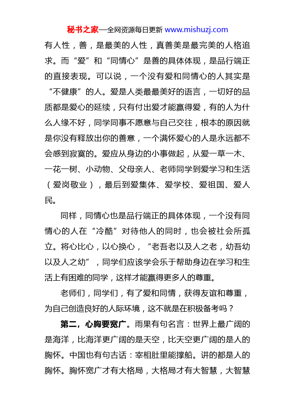 秘书之家—全网资源每日更新www.mishuzj.com在中考备考动员会议上的讲话初三的老师和同学们,大家好!X校长和X校长让我参加今天的会议,我很高兴,能陪大家度过这难忘的备考时光,我也很荣幸!我问X校长想让我讲什么?他说“随便讲”。那我就随便讲讲吧。今天是中考动员会,在距离中考不到80天的时候举行这样的活动,营造一下氛围,酝酿一下情绪,提振一下信心,很有必要,也很有意义,但我今天不想谈中考,因为平时老师们已经谈的很多了,也比我说得好,刚才X校长和X主任的讲话也讲得很好,我今天想谈谈比中考更重要的事情,就跟同学们谈谈怎么做人的话题,题目就是《完善自我,成就未来》。有同学会说,别跟我来这套,这么大了我还不知道怎么做人?你可别说,有的同学你还真不知道,因为我这里说的可能不是你认为的那个“人”,我说的是心地善良、习惯良好、心理健康、知荣知耻、志向远大、能够不断自我完善的人,一个在未来对家庭、对国家、对社会有用的人!这样的人,还怕什么中考高考?这都不在话下!那么,怎样才能成为这样的人?至少要做大以下七点。第一,心地要善良。人之初,性本善。兽有兽性,人秘书之家—全网资源每日更新www.mishuzj.com有人性,善,是最美的人性,真善美是最完美的人格追求。而“爱”和“同情心”是善的具体体现,是品行端正的直接表现。可以说,一个没有爱和同情心的人其实是“不健康”的人。爱是人类最最美好的语言,一切好的品质都是爱心的延续,只有付出爱才能赢得爱,有的人为什么人缘不好,同学同事不愿意与自己交往,根本的原因就是你没有释放出你的善意,一个满怀爱心的人是永远都不会感到寂寞的。爱应从身边的小事做起,从爱一草一木、一花一树、小动物、父母亲人、老师同学到爱学习和生活(爱岗敬业),最后到爱集体、爱学校、爱祖国、爱人民。同样,同情心也是品行端正的具体体现,一个没有同情心的人在“冷酷”对待他人的同时,也会被社会所孤立。将心比心,以心换心,“老吾老以及人之老,幼吾幼以及人之幼”,同学们应该学会乐于帮助身边在学习和生活上有困难的同学,这样才能赢得更多人的尊重。老师们,同学们,有了爱和同情,获得友谊和尊重,为自己创造良好的人际环境,这不就是在积极备考吗?第二,心胸要宽广。雨果有句名言:世界上最广阔的是海洋,比海洋更广阔的是天空,比天空更广阔的是人的胸怀。中国也有句古话:宰相肚里能撑船。讲的都是人的胸怀。胸怀宽广才有大格局,大格局才有大智慧,大智慧秘书之家—全网资源每日更新www.mishuzj.com才有大视野,获得大发展!心胸宽广,一是不计较个人得失,不为小事斤斤计较,如果整天揪住小事不放,甚至得理不让人,睚眦必报,这样天长日久,谁能容你?二是要严以律己、宽以待人;三是要学会放大别人优点,包容别人的过失。倘如此,你就是有大格局、大智慧的、大视野的人,会赢得老师的喜爱、同学的帮助。从而使自己心情舒畅,信心倍增。有了这样的良好心态,不也是在积极备考吗?老师们也一样,我们初三是一个团队,中考成绩需要我们团队的力量,如果有个别人心胸狭窄,为鸡毛蒜皮的小事互相抱怨,甚至互相设防,怎能形成合力?所以说师生都有阳光的心态、宽广的胸怀,勠力同心,这就是最好的备考!第三,交友要谨慎。人是群居动物,都害怕孤独,渴望友谊,但真正的友谊是能引领人向真向善向美,向更好处发展。如果择友不善,可能会让你走向堕落,甚至是犯罪,这样的例子不胜枚举。有句话说,你是谁不要紧,关键是你跟谁在一起!你交的朋友就暴露了你的人品、你的为人和你的价值观!有些同学的交友观是有问题的,喜欢结交那些违反纪律不爱学习不务正业的人,随波逐流一起抽烟、打架甚至干违法犯罪的事情;更有的同学喜欢结交社会上的不良青少年,呼哥唤姐,认贼为友,甚至指使这些人欺负自己的同学!你想怎么样?你想成为什么样的秘书之家—全网资源每日更新www.mishuzj.com人?你想走哪条路?这些同学真该好好想一想这些问题!成才很重要,但成人更重要!还有不到80天的时间就要离开学校了,希望有这些想法和行为的同学悬崖勒马,不要在错误的道路上越滑越深,决不能再在学校招惹事端!可以说,你们在备考的同时也是在接受人性的考试。第四,做事要认真。1957年毛泽东主席访问前苏联,在莫斯科大学面对数千名中国留苏学生和实习生,提出了“世界上怕就怕‘认真’二字,共产党就最讲‘认真’”的至理名言,他是从无数革命事业的成功经验得出来的结论,什么事就怕认真,什么事就怕较真,认真做事,就没有解决不了的问题。学习也一样,你有足够的认真,与学习较真,才没有克服不了的困难,你才会有足够的好的成绩。希望同学们都养成做事认真、遇事敢于较真的精神,这也是备考中很可贵的品质!第五,性格要坚韧。有个名字叫“打不死的小强”,同学们知道是谁吗?这个“小强”是香港人对蟑螂的称呼,源自周星驰主演的电影《唐伯虎点秋香》。蟑螂的特性就是生命力特别顽强,因为这种动物的出现比恐龙还要早,至今仍然生活在我们身边,常常比喻那些有顽强的生命力和坚忍不拔毅力的人。而这一点,恰恰是我们有的同学缺少的,动不动就不想活了,为了一点小事就轻生,看似不怕死,实际上是懦夫的表现;生活和学习上遇到一点秘书之家—全网资源每日更新www.mishuzj.com