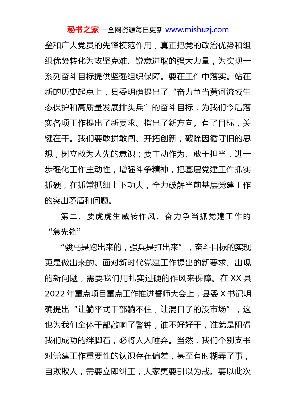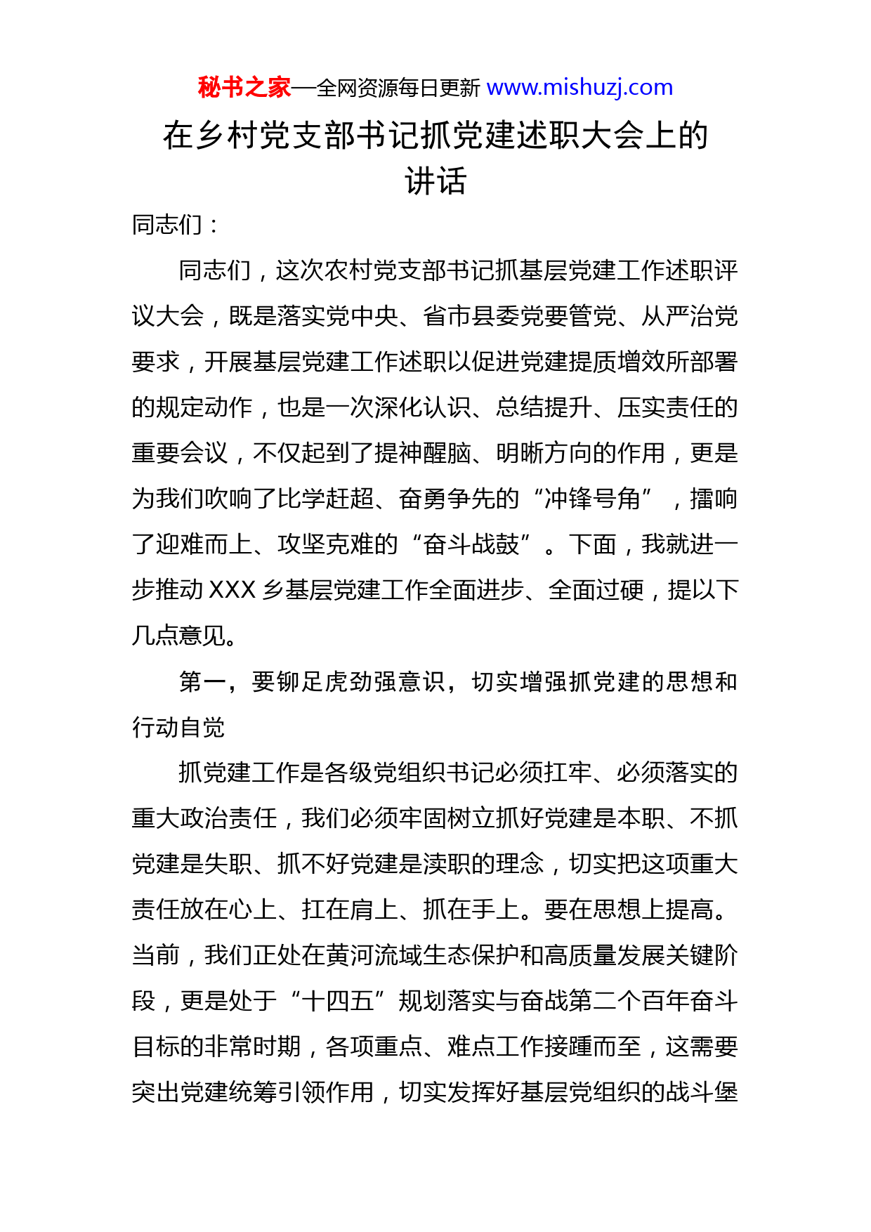 秘书之家—全网资源每日更新www.mishuzj.com在乡村党支部书记抓党建述职大会上的讲话同志们:同志们,这次农村党支部书记抓基层党建工作述职评议大会,既是落实党中央、省市县委党要管党、从严治党要求,开展基层党建工作述职以促进党建提质增效所部署的规定动作,也是一次深化认识、总结提升、压实责任的重要会议,不仅起到了提神醒脑、明晰方向的作用,更是为我们吹响了比学赶超、奋勇争先的“冲锋号角”,擂响了迎难而上、攻坚克难的“奋斗战鼓”。下面,我就进一步推动XXX乡基层党建工作全面进步、全面过硬,提以下几点意见。第一,要铆足虎劲强意识,切实增强抓党建的思想和行动自觉抓党建工作是各级党组织书记必须扛牢、必须落实的重大政治责任,我们必须牢固树立抓好党建是本职、不抓党建是失职、抓不好党建是渎职的理念,切实把这项重大责任放在心上、扛在肩上、抓在手上。要在思想上提高。当前,我们正处在黄河流域生态保护和高质量发展关键阶段,更是处于“十四五”规划落实与奋战第二个百年奋斗目标的非常时期,各项重点、难点工作接踵而至,这需要突出党建统筹引领作用,切实发挥好基层党组织的战斗堡秘书之家—全网资源每日更新www.mishuzj.com垒和广大党员的先锋模范作用,真正把党的政治优势和组织优势转化为攻坚克难、锐意进取的强大力量,为实现一系列奋斗目标提供坚强组织保障。要在工作中落实。站在新的历史起点上,县委明确提出了“奋力争当黄河流域生态保护和高质量发展排头兵”的奋斗目标,为我们今后落实各项工作提出了新要求、指出了新方向。有了目标,关键在干。我们要敢拼敢闯、开拓创新,破除因循守旧的思想,树立敢为人先的意识;要主动作为、敢于担当,进一步强化工作主动性,增强斗争精神,把基层党建工作抓实抓硬,在抓常抓细上下功夫,全力破解当前基层党建工作的突出矛盾和问题。第二,要虎虎生威转作风,奋力争当抓党建工作的“急先锋”“骏马是跑出来的,强兵是打出来”,奋斗目标的实现更是做出来的。面对新时代党建工作提出的新要求、出现的新问题,需要我们用扎实过硬的作风来保障。在XX县2022年重点项目重点工作推进誓师大会上,县委X书记明确提出“让躺平式干部躺不住,让混日子的没市场”,这也为我们全体干部敲响了警钟,谁不好好干,谁就是阻碍我们成功的绊脚石,必将人人唾弃。当然,我们个别支书对党建工作重要性的认识存在偏差,甚至有时糊弄了事,自欺欺人,需要立即纠正,大家更要引以为戒。要以此次秘书之家—全网资源每日更新www.mishuzj.com会议为契机,时刻践行“严真学细实快”工作作风,大兴“严”字之风,坚持高标准高质量原则,严肃正确对待党建工作;大兴“真”字之风,真刀真枪破解党建难题,禁止弄虚作假;大兴“学”字之风,始终坚持学习贯彻习近平新时代中国特色社会主义思想,用于武装头脑、指导实践;大兴“细”字之风,把任何小事都要做精做细做出彩;大兴“实”字之风,多用切实管用的举措,多办对症下药的实事;大兴“快”字之风,对于各项部署要求,要立说立行、雷厉风行,营造比学赶超、大干快干的氛围。第三,要虎力全开抓落实,推动基层党建工作全面进步、全面过硬省市县委工作会议上,强调最多的就是要脚踏实地、狠抓落实,抓基层党建工作同样必须在推动落实上下真功夫。要层层加压抓落实。坚持“书记抓,抓书记”,落实党委主体责任,细化“一岗双责”强化班子成员责任,立下党建“军令状”明确支部书记责任,把任务压紧压实,把责任落实落牢,形成一级抓一级、层层抓落实的格局。要凝心聚力抓落实。村党组织书记作为抓党建工作“第一责任人”,要切实履行职责,带好班子、抓好队伍,坚持重点工作亲自部署、重大问题亲自过问、重点环节亲自把握、重要任务亲自督办,谋求其他班子成员一同扛牢政治责任。要统筹推进抓落实。对照全乡重点工作,突出党建秘书之家—全网资源每日更新www.mishuzj.com在乡村振兴中的引领作用,结合农村基层党组织工作队力促组织振兴,为村台社区治理保驾护航,为乡村振兴提供坚强保障;积极探索集体经济发展新模式,提高支部领办合作社覆盖面,结合本乡土地资源优势,加大土地流转力度,扩大特色产业发展规模,力促集体经济收入稳步提升;深入推进滩区安居富民工程,依托我乡资源禀赋和产业优势,紧密结合XX县“北工南农”战略部署,打造衔接乡村振兴集中推进区;坚持绿色、生态、可持续发展道路,做大做强富硒农作物种植、中药材种植、绿色农产品精加工和交易、农游一体休闲观光、传统村落旅游五大产业,持续增强滩区经济发展后劲。同志们,做好新形势下的基层党建工作,责任重大,任务艰巨,让我们更加紧密的团结在以习近平同志为核心的党中央周围,以更加饱满的热情、更加昂扬的斗志、更加务实的作风,进一步解放思想、实事求是,开拓创新、真抓实干,为加快建设生态富裕美丽幸福新XX提供坚强的组织保证,以优异成绩迎接党的二十大胜利召开!