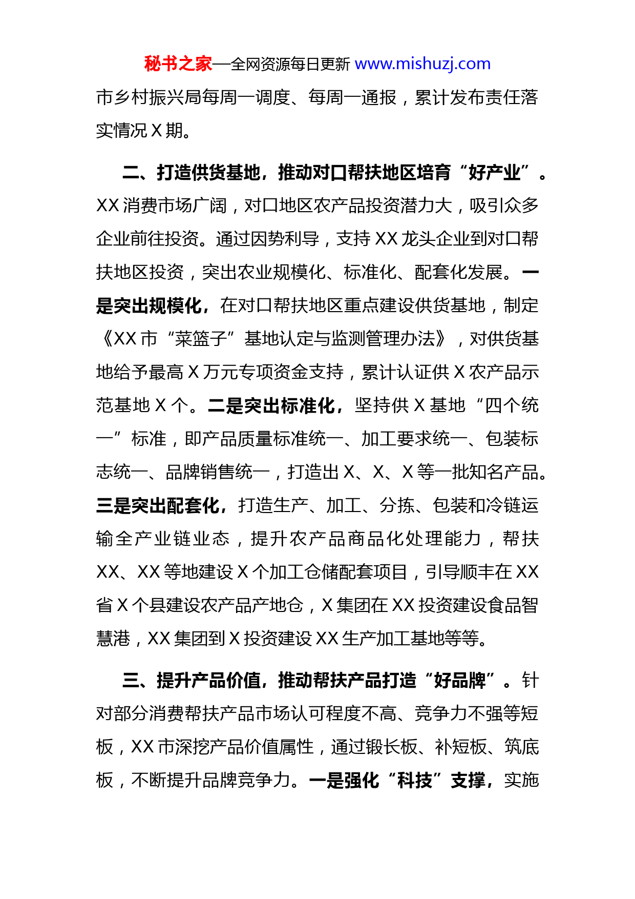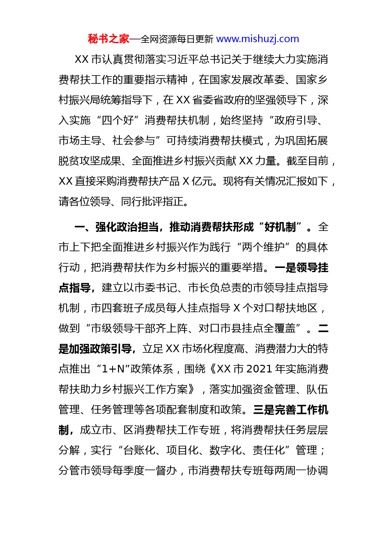 秘书之家—全网资源每日更新www.mishuzj.comXX市认真贯彻落实习近平总书记关于继续大力实施消费帮扶工作的重要指示精神,在国家发展改革委、国家乡村振兴局统筹指导下,在XX省委省政府的坚强领导下,深入实施“四个好”消费帮扶机制,始终坚持“政府引导、市场主导、社会参与”可持续消费帮扶模式,为巩固拓展脱贫攻坚成果、全面推进乡村振兴贡献XX力量。截至目前,XX直接采购消费帮扶产品X亿元。现将有关情况汇报如下,请各位领导、同行批评指正。一、强化政治担当,推动消费帮扶形成“好机制”。全市上下把全面推进乡村振兴作为践行“两个维护”的具体行动,把消费帮扶作为乡村振兴的重要举措。一是领导挂点指导,建立以市委书记、市长负总责的市领导挂点指导机制,市四套班子成员每人挂点指导X个对口帮扶地区,做到“市级领导干部齐上阵、对口市县挂点全覆盖”。二是加强政策引导,立足XX市场化程度高、消费潜力大的特点推出“1+N”政策体系,围绕《XX市2021年实施消费帮扶助力乡村振兴工作方案》,落实加强资金管理、队伍管理、任务管理等各项配套制度和政策。三是完善工作机制,成立市、区消费帮扶工作专班,将消费帮扶任务层层分解,实行“台账化、项目化、数字化、责任化”管理;分管市领导每季度一督办,市消费帮扶专班每两周一协调秘书之家—全网资源每日更新www.mishuzj.com市乡村振兴局每周一调度、每周一通报,累计发布责任落实情况X期。二、打造供货基地,推动对口帮扶地区培育“好产业”。XX消费市场广阔,对口地区农产品投资潜力大,吸引众多企业前往投资。通过因势利导,支持XX龙头企业到对口帮扶地区投资,突出农业规模化、标准化、配套化发展。一是突出规模化,在对口帮扶地区重点建设供货基地,制定《XX市“菜篮子”基地认定与监测管理办法》,对供货基地给予最高X万元专项资金支持,累计认证供X农产品示范基地X个。二是突出标准化,坚持供X基地“四个统一”标准,即产品质量标准统一、加工要求统一、包装标志统一、品牌销售统一,打造出X、X、X等一批知名产品。三是突出配套化,打造生产、加工、分拣、包装和冷链运输全产业链业态,提升农产品商品化处理能力,帮扶XX、XX等地建设X个加工仓储配套项目,引导顺丰在XX省X个县建设农产品产地仓,X集团在XX投资建设食品智慧港,XX集团到X投资建设XX生产加工基地等等。三、提升产品价值,推动帮扶产品打造“好品牌”。针对部分消费帮扶产品市场认可程度不高、竞争力不强等短板,XX市深挖产品价值属性,通过锻长板、补短板、筑底板,不断提升品牌竞争力。一是强化“科技”支撑,实施秘书之家—全网资源每日更新www.mishuzj.com科技支农、科技特派员行动,支持XX农业基因组研究所等机构、企业,打造一批如XX、XX等科技品牌项目。二是推进产品认证,对标国际先进打造高质量城市食用农产品品牌,构建产品认证标准,累计推动X个消费帮扶产品纳入“XX品”体系,“XX品”在深销量较以往平均提高X%。三是走出“差异化”路子,落实“一县一品”特色品牌计划,打造出XX、XX等一批县域品牌,举办好产品评选活动,综合评选出XX、XX等“百强好产品”,消费帮扶品牌效应深入人心。四、畅通销售网络,推动产销对接找到“好渠道”。XX市坚持“线下+线上”“政府+企业”“党员+群众”三结合,构建立体式全方位销售供应网络。一是“线下+线上”相结合,线下打造“X+X”市、区消费帮扶中心,开设专馆、专区、专柜X个,XXX消费帮扶中心获评首批“全国消费扶贫示范单位”;线上推动开设网店X余家,打造“XX帮扶APP”线上商城、“XX帮扶集市”“XX帮扶数据平台”集群,在全国消费帮扶平台中优先使用数字货币,并推出拼团、直播、线上开店、大客户采购等功能,累计注册用户近X万,销售订单超X万。二是“政府+企业”相结合,发动全市X余家预算单位以不低于各单位年度农副产品采购总额的X积极采购消费帮扶产品,今年全市各级预算单秘书之家—全网资源每日更新www.mishuzj.com位完成“X平台”扶贫产品采购额X亿元,通过以买代捐活动采购X亿元。三是“党员+群众”相结合,在全市X个社区党群服务中心展销消费帮扶产品,推出“线下超市展厅+线上数据平台+党群共建共享”消费模式,累计发放帮扶消费券X万元;举办XX美食节,吸引百万余名市民打卡消费,签约采购额X万元;开展好产品进饭堂推介行动,首批X家食堂、餐饮企业和协会签约采购X万元。接下来,我市将在省委省政府的坚强领导下,牢记党的初心使命、知责履责尽责、忠诚干净担当,进一步构建长效机制,为助力乡村振兴贡献XX城市的力量。