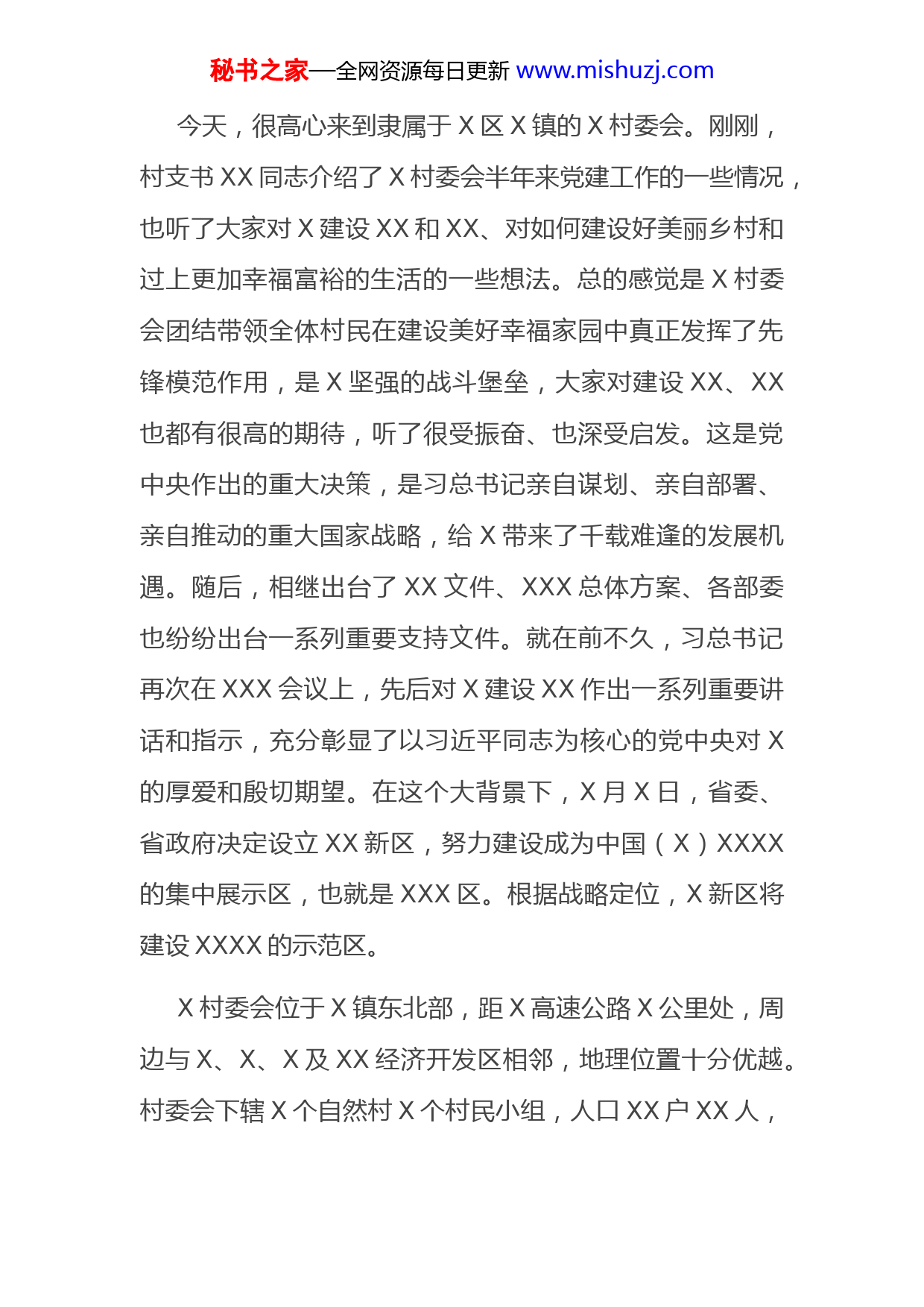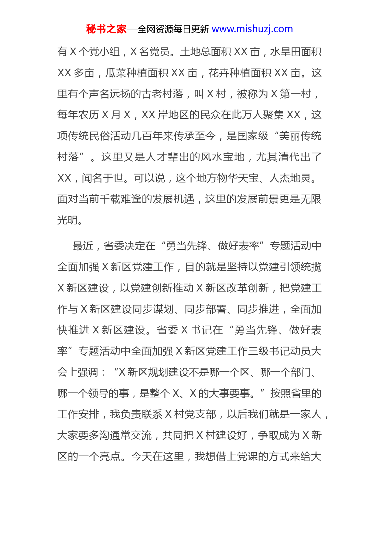 秘书之家—全网资源每日更新www.mishuzj.com今天,很高心来到隶属于X区X镇的X村委会。刚刚,村支书XX同志介绍了X村委会半年来党建工作的一些情况,也听了大家对X建设XX和XX、对如何建设好美丽乡村和过上更加幸福富裕的生活的一些想法。总的感觉是X村委会团结带领全体村民在建设美好幸福家园中真正发挥了先锋模范作用,是X坚强的战斗堡垒,大家对建设XX、XX也都有很高的期待,听了很受振奋、也深受启发。这是党中央作出的重大决策,是习总书记亲自谋划、亲自部署、亲自推动的重大国家战略,给X带来了千载难逢的发展机遇。随后,相继出台了XX文件、XXX总体方案、各部委也纷纷出台一系列重要支持文件。就在前不久,习总书记再次在XXX会议上,先后对X建设XX作出一系列重要讲话和指示,充分彰显了以习近平同志为核心的党中央对X的厚爱和殷切期望。在这个大背景下,X月X日,省委、省政府决定设立XX新区,努力建设成为中国(X)XXXX的集中展示区,也就是XXX区。根据战略定位,X新区将建设XXXX的示范区。X村委会位于X镇东北部,距X高速公路X公里处,周边与X、X、X及XX经济开发区相邻,地理位置十分优越。村委会下辖X个自然村X个村民小组,人口XX户XX人,秘书之家—全网资源每日更新www.mishuzj.com有X个党小组,X名党员。土地总面积XX亩,水旱田面积XX多亩,瓜菜种植面积XX亩,花卉种植面积XX亩。这里有个声名远扬的古老村落,叫X村,被称为X第一村,每年农历X月X,XX岸地区的民众在此万人聚集XX,这项传统民俗活动几百年来传承至今,是国家级“美丽传统村落”。这里又是人才辈出的风水宝地,尤其清代出了XX,闻名于世。可以说,这个地方物华天宝、人杰地灵。面对当前千载难逢的发展机遇,这里的发展前景更是无限光明。最近,省委决定在“勇当先锋、做好表率”专题活动中全面加强X新区党建工作,目的就是坚持以党建引领统揽X新区建设,以党建创新推动X新区改革创新,把党建工作与X新区建设同步谋划、同步部署、同步推进,全面加快推进X新区建设。省委X书记在“勇当先锋、做好表率”专题活动中全面加强X新区党建工作三级书记动员大会上强调:“X新区规划建设不是哪一个区、哪一个部门、哪一个领导的事,是整个X、X的大事要事。”按照省里的工作安排,我负责联系X村党支部,以后我们就是一家人,大家要多沟通常交流,共同把X村建设好,争取成为X新区的一个亮点。今天在这里,我想借上党课的方式来给大秘书之家—全网资源每日更新www.mishuzj.com家鼓鼓劲、加加压,为加快X新区的建设踏踏实实地做点力所能及的事。下面,我讲4个方面的问题。一、踏实干事首先需要有“想为”的高境界。习总书记强调,“良好的精神状态,是做好一切工作的重要前提。”X新区要发展,要打造全国一流的零碳新城、彰显中国文化X特色的靓丽名片、城乡一体和谐共生的中国示范和全球领先的生态CBD,不可能敲锣打鼓、轻轻松松就能实现的,需要有一大批想事干事成事而又不出事的党员干部,同时也需要我们当地村民与党和政府一条心,齐心协力、埋头苦干、一起奋斗才能够实现。实践表明,任何伟大事业的成功,任何伟大梦想的实现,都源于一个“干”字。作为X村的党员干部,组织和人民赋予了我们岗位、权力,归根到底是用来干事创业的。有句话叫做“在其位当谋其政,谋其政必尽其责”,我们是在其地就要谋其路。我们为什么要申请入党?党员就是要走在前,干在前,凡事比别人多做一些、做得更好一些。刚刚过来的时候,我四周看了一下,我能够感受到我们在座的各位绝大多数都是有激情、有干劲的,“一天当三天用”、“不惜脱几层皮”是你们想干事的真实写照。但实事求是地讲,也有少数党员干部在岗找不到感觉、干事提秘书之家—全网资源每日更新www.mishuzj.com不起精神,不想作为、不在状态。我们现在有这么好的机遇,可以说是千载难逢,不狠下心来努力一把,真的说不过去,将来也没办法向子孙后代交代。这方面,我们村两委班子做得不错。村委会辖区内的道郡村是国家级“美丽传统村落”,这两年村两委班子积极奔走,先后投入XX多万元,完成村庄初期的规划和环村巷道及观光栏、乡村道路水泥硬化X公里、扩建X公里的瑶山线路等基础性工作,还完成了X村、X村及X墟等3个供水水塔及深水井的建造,解决了周边XX多人的饮水难问题。XX省、X村、X村等这些有着一定历史的古老村庄,也在政府的扶持下进行了文明生态村的改造。下一步,大家还是要在美丽乡村建设和历史古迹保护等方面多思考、主动作为,找准符合自己实际的发展路径,走人无我有、人有我优的致富道路这些都有许多大事、难事、实事等着我们去干,都需要我们的党员干部进一步强化责任感、进取心和精气神,必须要有想干事的主观愿望。二、踏实干事就必须要有“敢为”的强担当。我们有着“敢闯敢试、敢为人先、埋头苦干”的大特区精神。现在号称世界“小商品之都”的浙江义乌,就是靠“闯”出来的。当地群众早年顶着“投机倒把”的帽子沿街叫卖,经秘书之家—全网资源每日更新www.mishuzj.com常被政府人员抓现行,没收货物,时任义乌县委书记谢高华在全县的机关干部大会上宣布,“要引导农民进城经商不是违法的商品不能没收,政府要支持老百姓致富,谁再为难他们就处理谁。”顶住压力开放了义乌小商品省场。36