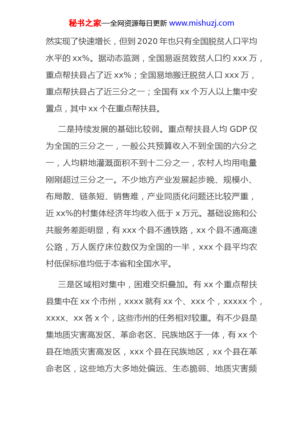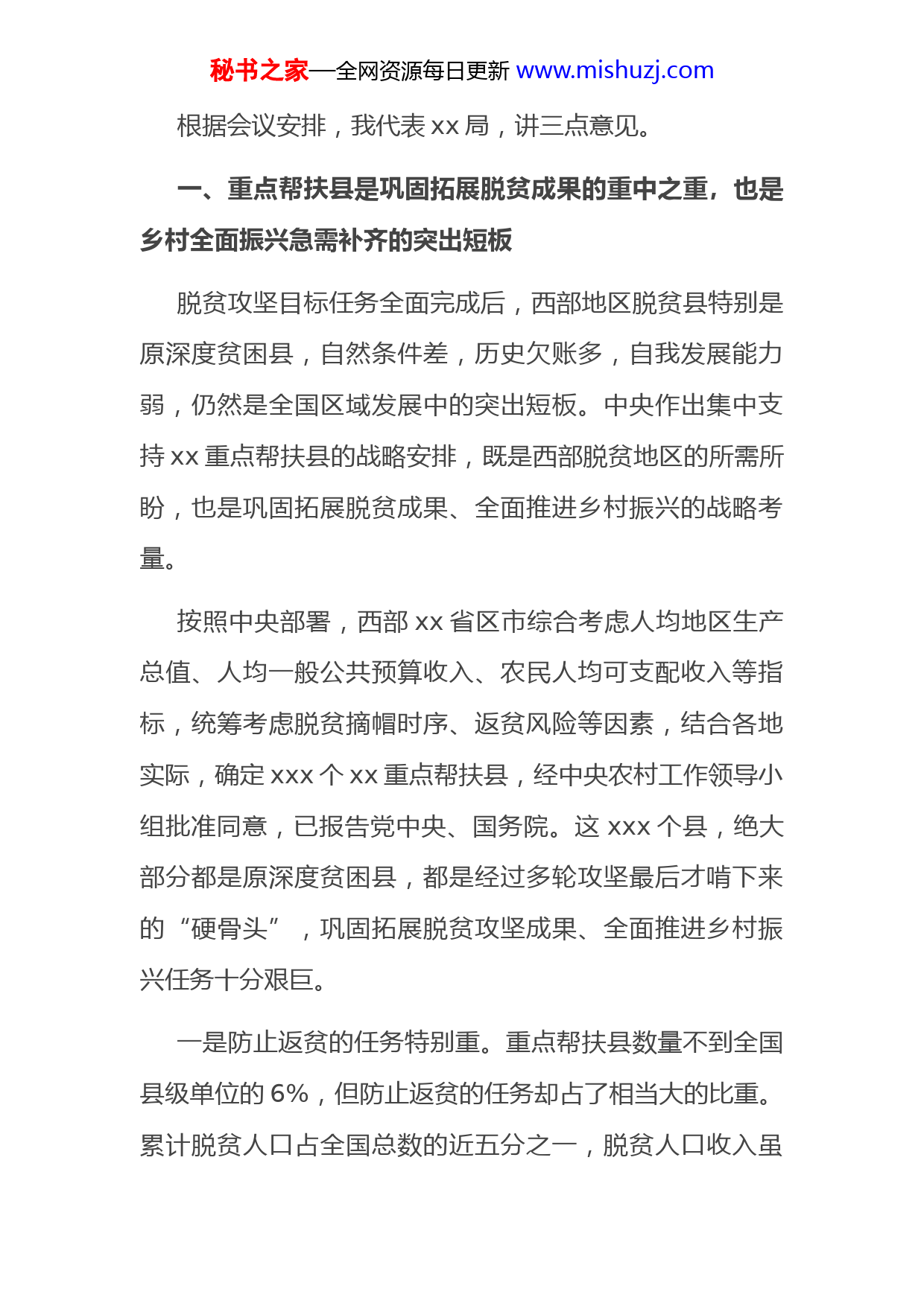 秘书之家—全网资源每日更新www.mishuzj.com根据会议安排,我代表xx局,讲三点意见。一、重点帮扶县是巩固拓展脱贫成果的重中之重,也是乡村全面振兴急需补齐的突出短板脱贫攻坚目标任务全面完成后,西部地区脱贫县特别是原深度贫困县,自然条件差,历史欠账多,自我发展能力弱,仍然是全国区域发展中的突出短板。中央作出集中支持xx重点帮扶县的战略安排,既是西部脱贫地区的所需所盼,也是巩固拓展脱贫成果、全面推进乡村振兴的战略考量。按照中央部署,西部xx省区市综合考虑人均地区生产总值、人均一般公共预算收入、农民人均可支配收入等指标,统筹考虑脱贫摘帽时序、返贫风险等因素,结合各地实际,确定xxx个xx重点帮扶县,经中央农村工作领导小组批准同意,已报告党中央、国务院。这xxx个县,绝大部分都是原深度贫困县,都是经过多轮攻坚最后才啃下来的“硬骨头”,巩固拓展脱贫攻坚成果、全面推进乡村振兴任务十分艰巨。一是防止返贫的任务特别重。重点帮扶县数量不到全国县级单位的6%,但防止返贫的任务却占了相当大的比重。累计脱贫人口占全国总数的近五分之一,脱贫人口收入虽秘书之家—全网资源每日更新www.mishuzj.com然实现了快速增长,但到2020年也只有全国脱贫人口平均水平的xx%。据动态监测,全国易返贫致贫人口约xxx万,重点帮扶县占了近xx%;全国易地搬迁脱贫人口xxx万,重点帮扶县占了近三分之一;全国有xx个万人以上集中安置点,其中xx个在重点帮扶县。二是持续发展的基础比较弱。重点帮扶县人均GDP仅为全国的三分之一,一般公共预算收入不到全国的六分之一,人均耕地灌溉面积不到十二分之一,农村人均用电量刚刚超过三分之一。不少地方产业发展起步晚、规模小、布局散、链条短、销售难,产业同质化问题还比较严重,近xx%的村集体经济年均收入低于x万元。基础设施和公共服务差距明显,有xxx个县不通铁路,xx个县不通高速公路,万人医疗床位数仅为全国的一半,xxx个县平均农村低保标准均低于本省和全国水平。三是区域相对集中,困难交织叠加。有xx个重点帮扶县集中在xx个市州,xxxx就有xx个、xxx个,xxxxx个,xxxx、xx各x个,这些市州的任务相对较重。有不少县是集地质灾害高发区、革命老区、民族地区于一体,有xx个县在地质灾害高发区,xxx个县在民族地区,xx个县在革命老区,这些地方大多地处偏远、生态脆弱、地质灾害频秘书之家—全网资源每日更新www.mishuzj.com发。还有一些地方由于历史原因,社会文明程度较低,社会发育仍然滞后,不少群众沿袭陈规陋习,自我发展动力和能力仍然不足。这些都给巩固拓展脱贫成果带来风险隐患,影响制约了乡村全面振兴。二、支持重点帮扶县,需要强化政策倾斜、聚焦持续发展集中支持重点帮扶县,不仅要补短板,更要帮发展。“十四五”期间,针对重点帮扶县发展基础薄弱的现实问题,给予全方位的政策支持至关重要。为确保拿出有含金量的政策,胡春华副总理亲自研究部署,中央29个相关单位和部门,反复研究,想方设法,提出了一系列倾斜支持政策。经报请国务院同意,近日将印发实施。归纳起来,这些政策主要有三大类。一是强化投入保障。资金投入方面,中央财政加大倾斜支持力度,在衔接推进乡村振兴补助资金、农村危房改造补助资金、农业生产发展资金、卫生健康和医疗救助投入等多个方面予以倾斜,允许统筹整合使用财政涉农资金政策延续到2025年,比其他脱贫县增加了两年。金融帮扶方面,努力实现银行保险机构全覆盖,支持异地设立证券基金经营分支机构。督促将新增可贷资金主要用于当地,提秘书之家—全网资源每日更新www.mishuzj.com高信贷资金适配性。继续实施小额信贷,确保应贷尽贷。对企业申请首发上市、新三板挂牌、发行公司债券和资产支持证券融资的,即报即审、审过即发,免征新三板企业挂牌初费。优先支持开展优势特色农产品保险、“保险+期货”等项目。土地政策方面,过渡期内为重点帮扶县每年每县安排建设用地计划指标xxx亩,专项用于巩固拓展脱贫攻坚成果和乡村振兴。明确建设用地增减挂钩调剂使用规划审批、土地利用、耕地保护等政策延续实施并予以倾斜。人才支持方面,适当放宽人员招录条件,在待遇职称“三支一扶”计划等方面予以倾斜支持。围绕乡村特色产业,按照“一县一业”模式,选派科技特派团。二是突出产业就业。产业帮扶方面,倾斜支持建设优势特色产业集群、农业产业园、认定龙头企业,优先支持品牌培育、冷链设施,对认证绿色食品、有机农产品实行费用减免。试行农技推广人员“县管乡用、下沉到村”新机制,推动完善产业技术顾问制度,倾斜支持实施高素质农民培育计划。支持打造优质乡村旅游品牌,支持乡村旅游重点村镇名录建设。就业帮扶方面,对打造区域性劳务品牌予以倾斜支持。统筹用好公益岗位,按规定促进符合条件的弱劳力、半劳力等家庭就近就地解决就业。在开展职秘书之家—全网资源每日更新www.mishuzj.com业技能帮扶中予以倾斜支持。逐步调整优化生态护林员政策,稳定生态护林员队伍。社会帮扶方面,结合东西部协作、中央单位定点帮扶政策调整优化,在帮扶资源安排上予以倾斜,开展“万企兴万村”行动,加大产业、劳务协作力度。三是加强基础设施建设和公共服务保障。基础设施建设方面,对符合条件的