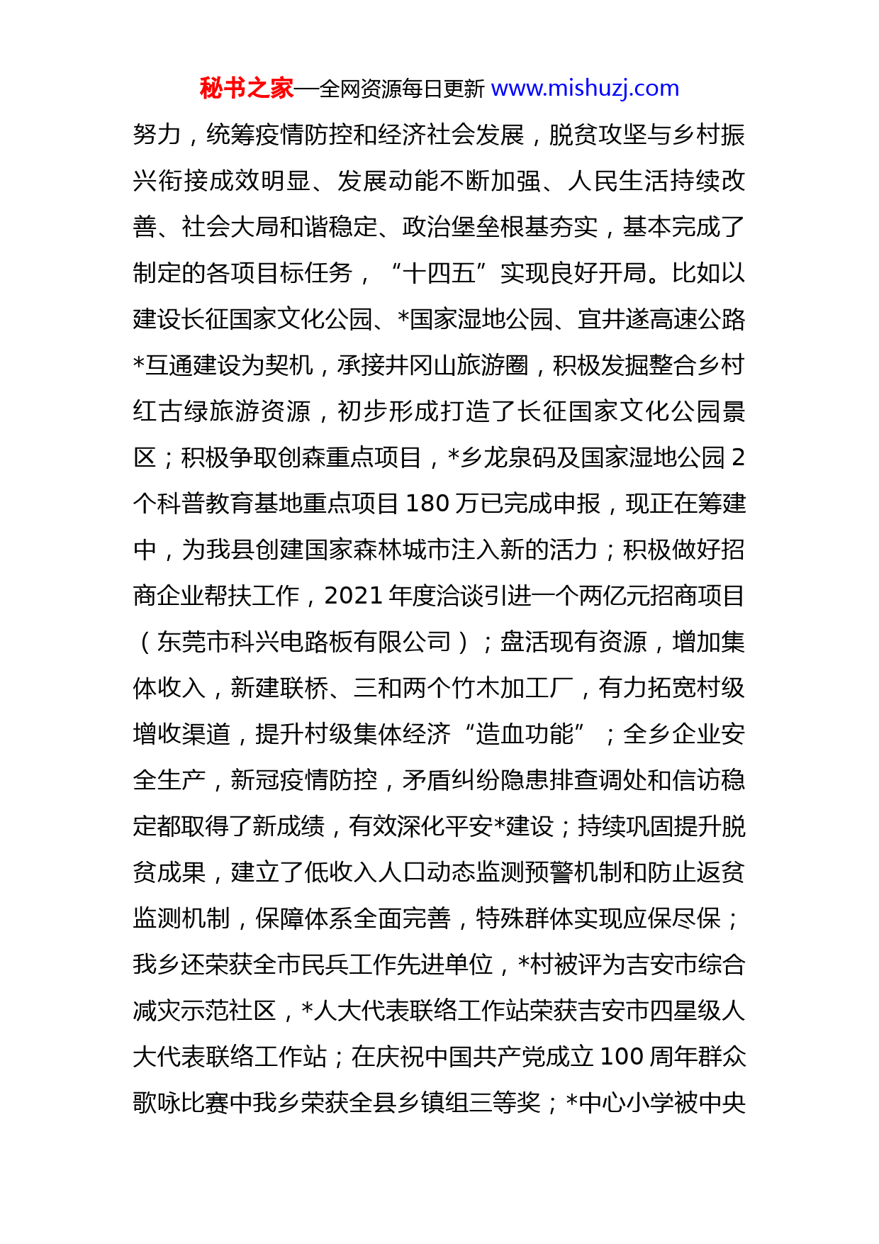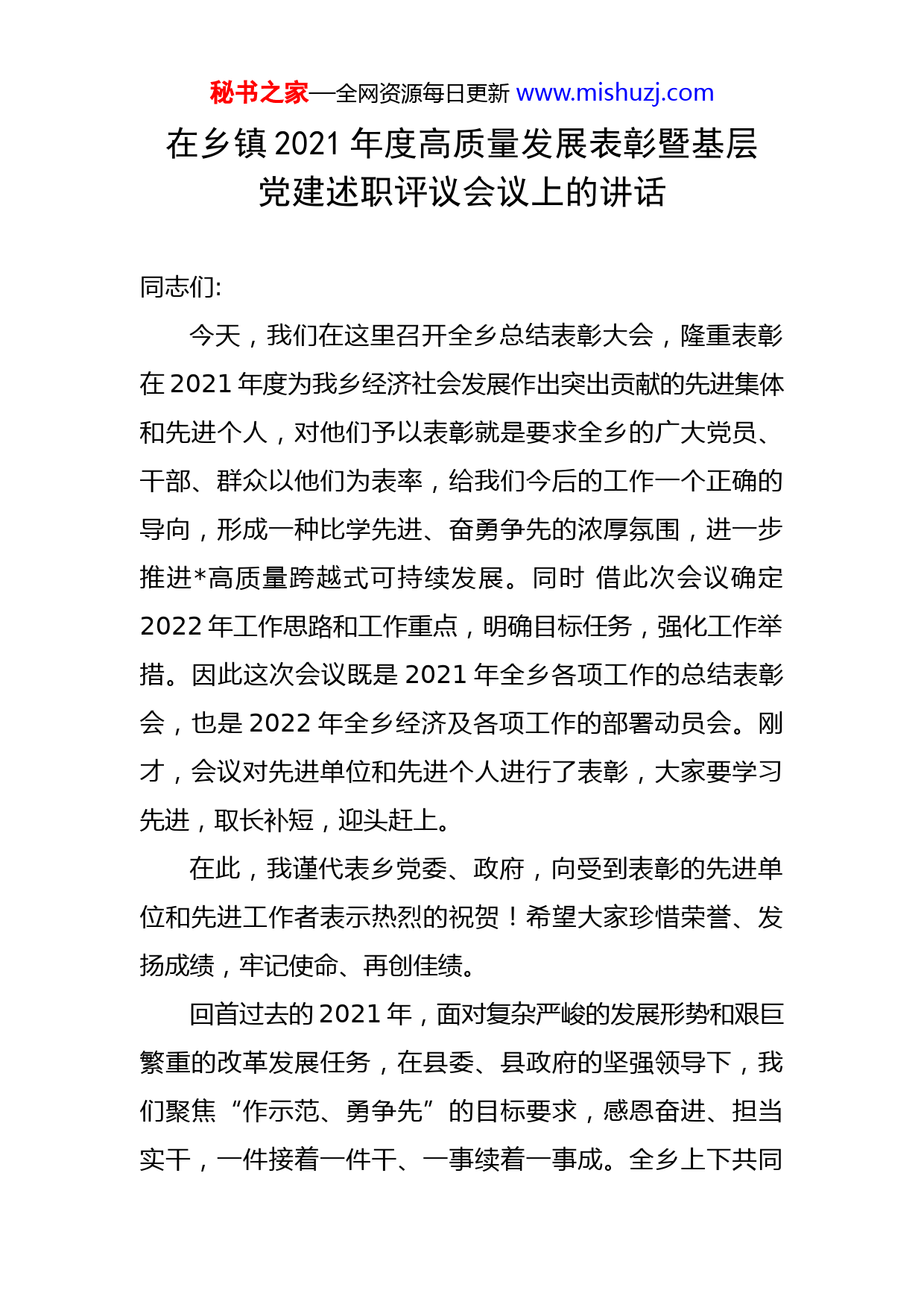 秘书之家—全网资源每日更新www.mishuzj.com在乡镇2021年度高质量发展表彰暨基层党建述职评议会议上的讲话同志们:今天,我们在这里召开全乡总结表彰大会,隆重表彰在2021年度为我乡经济社会发展作出突出贡献的先进集体和先进个人,对他们予以表彰就是要求全乡的广大党员、干部、群众以他们为表率,给我们今后的工作一个正确的导向,形成一种比学先进、奋勇争先的浓厚氛围,进一步推进高质量跨越式可持续发展。同时借此次会议确定2022年工作思路和工作重点,明确目标任务,强化工作举措。因此这次会议既是2021年全乡各项工作的总结表彰会,也是2022年全乡经济及各项工作的部署动员会。刚才,会议对先进单位和先进个人进行了表彰,大家要学习先进,取长补短,迎头赶上。在此,我谨代表乡党委、政府,向受到表彰的先进单位和先进工作者表示热烈的祝贺!希望大家珍惜荣誉、发扬成绩,牢记使命、再创佳绩。回首过去的2021年,面对复杂严峻的发展形势和艰巨繁重的改革发展任务,在县委、县政府的坚强领导下,我们聚焦“作示范、勇争先”的目标要求,感恩奋进、担当实干,一件接着一件干、一事续着一事成。全乡上下共同秘书之家—全网资源每日更新www.mishuzj.com努力,统筹疫情防控和经济社会发展,脱贫攻坚与乡村振兴衔接成效明显、发展动能不断加强、人民生活持续改善、社会大局和谐稳定、政治堡垒根基夯实,基本完成了制定的各项目标任务,“十四五”实现良好开局。比如以建设长征国家文化公园、国家湿地公园、宜井遂高速公路互通建设为契机,承接井冈山旅游圈,积极发掘整合乡村红古绿旅游资源,初步形成打造了长征国家文化公园景区;积极争取创森重点项目,乡龙泉码及国家湿地公园2个科普教育基地重点项目180万已完成申报,现正在筹建中,为我县创建国家森林城市注入新的活力;积极做好招商企业帮扶工作,2021年度洽谈引进一个两亿元招商项目(东莞市科兴电路板有限公司);盘活现有资源,增加集体收入,新建联桥、三和两个竹木加工厂,有力拓宽村级增收渠道,提升村级集体经济“造血功能”;全乡企业安全生产,新冠疫情防控,矛盾纠纷隐患排查调处和信访稳定都取得了新成绩,有效深化平安建设;持续巩固提升脱贫成果,建立了低收入人口动态监测预警机制和防止返贫监测机制,保障体系全面完善,特殊群体实现应保尽保;我乡还荣获全市民兵工作先进单位,村被评为吉安市综合减灾示范社区,人大代表联络工作站荣获吉安市四星级人大代表联络工作站;在庆祝中国共产党成立100周年群众歌咏比赛中我乡荣获全县乡镇组三等奖;中心小学被中央秘书之家—全网资源每日更新www.mishuzj.com红办正式命名为“中国工农红军长征英烈红军小学”,并荣获江西省优秀少先队集体;蓝先华同志被中央宣传部、国家林业和草原局、财政部、国家乡村振兴局授予“最美生态护林员”荣誉称号。这些成绩的取得,更加坚定了我们干事创业的信心和决心。成绩不说跑不了,问题不说不得了。在看到我们2021年取得成绩的同时,我们也要清醒认识到,我乡在经济社会发展中还存在不少困难和问题,主要是:综合经济实力还不强,工农业规模不大、层次不高,基础设施建设水平还不够完善,乡村两级财政底子较为薄弱,少数干部精神状态有所下滑,作风建设仍需进一步加强。但我们有根有魂有脉、有山有水有韵,生态优势尤为突出,绿色发展势不可挡,文化底蕴更具魅力。可以说,红色就是我们的底色、绿色就是我们的底气、山水就是我们的底牌,我们要坚定信心、下定决心,以先进为榜样,以成绩和荣誉为动力,撸起袖子加油干,发扬孺子牛、拓荒牛、老黄牛精神,全力以赴做好2022年的各项工作,促进全乡经济社会高质量跨越式发展。下面,我就做好今年各项工作讲几点意见:要全面完成今年的各项工作任务,关键在于狠抓落实。各村各单位要按照这次会议部署,结合自身实际,理清思路,切实抓早、抓细、抓实、抓出成效。秘书之家—全网资源每日更新www.mishuzj.com一是要制度化开展党建工作。严格规范支部组织生活,持续深入推进党史学习教育,认真落实“三会一课”、民主生活会、组织生活会等制度;创新基层党建工作,不局限于会议传达、文件学习的形式,灵活运用“互联网+党建”思维,充分利用好微信、微博等新兴媒体;标准化加强支部建设,严把党员发展关,做好党员的教育、管理和服务工作;大力扶持发展村级集体经济和党员创业致富,不断提升全乡基层党建工作质量和水平。二是要优化营商环境助发展。要充分认识到招商引资不仅是加快高质量发展的主要抓手,也是巩固脱贫攻坚成果的重要手段,今年我乡创新招商机制,进一步整合资源,成立经济发展组,定期到外地考察洽谈,吃透招商政策、放宽招商视野、丰富招商办法、创新招商方式,多渠道、多方式让的名气“走出去”,把资源“引进来”。三是守住底线全面发展。底线工作是发展的基石,要树牢底线思维。一是守住“两违”控制底线。对于违法占用基本农田、违法建设问题,我们要明确的责任分工,哪一个环节出现问题我们就严格倒查哪个环节责任。二是守住安全生产底线。要时刻绷紧安全这根弦,坚决将安全隐患消灭在萌芽状态。三是守住生态环保底线。最大的优势是生态,最大的价值是生态,最大的潜力是生态,所以