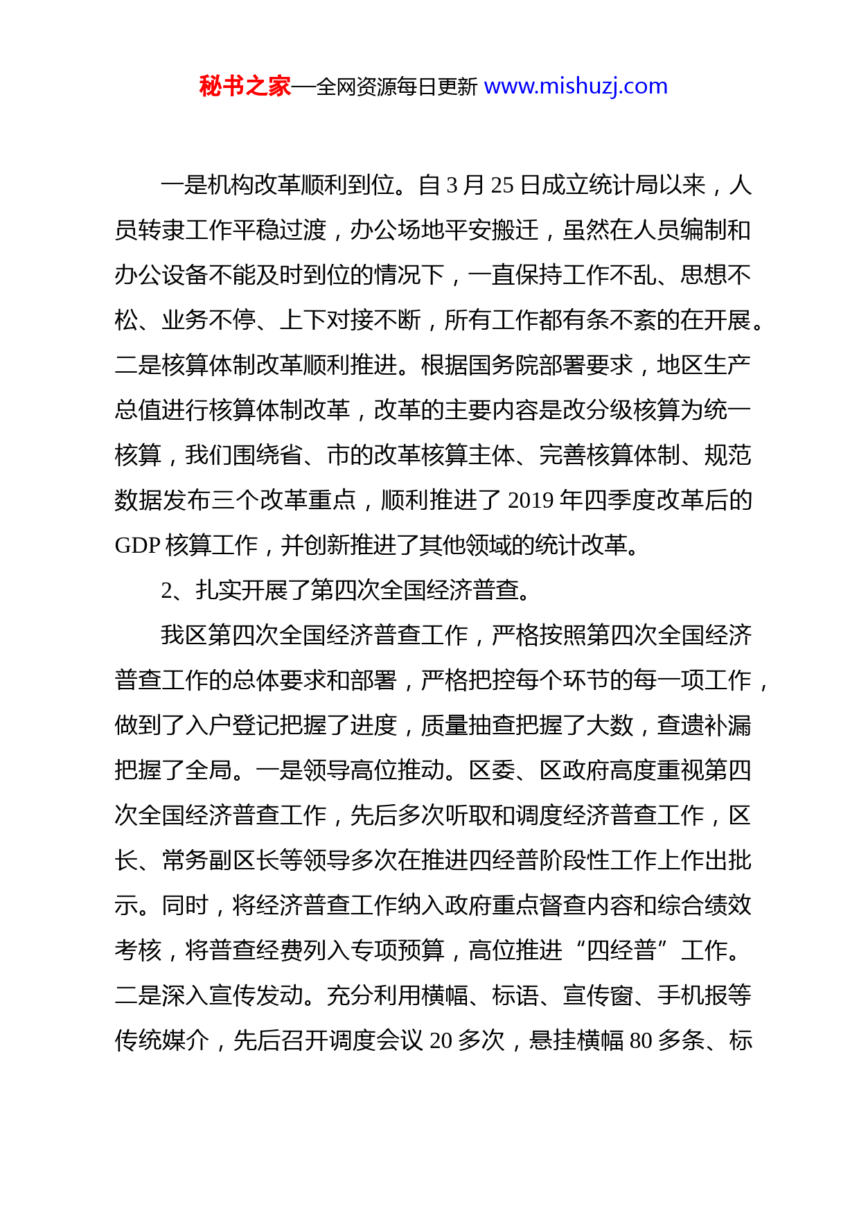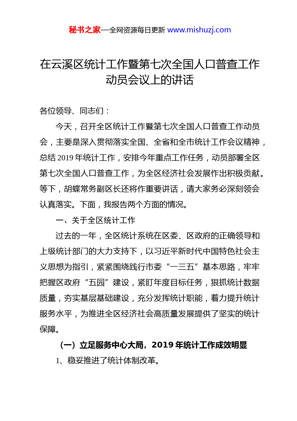 秘书之家—全网资源每日更新www.mishuzj.com在云溪区统计工作暨第七次全国人口普查工作动员会议上的讲话各位领导、同志们:今天,召开全区统计工作暨第七次全国人口普查工作动员会,主要是深入贯彻落实全国、全省和全市统计工作会议精神,总结2019年统计工作,安排今年重点工作任务,动员部署全区第七次全国人口普查工作,为全区经济社会发展作出积极贡献。等下,胡蝶常务副区长还将作重要讲话,请大家务必深刻领会认真落实。下面,我报告两个方面的情况。一、关于全区统计工作过去的一年,全区统计系统在区委、区政府的正确领导和上级统计部门的大力支持下,以习近平新时代中国特色社会主义思想为指引,紧紧围绕践行市委“一三五”基本思路,牢牢把握区政府“五园”建设,紧盯年度目标任务,狠抓统计数据质量,夯实基层基础建设,充分发挥统计职能,着力提升统计服务水平,为推进全区经济社会高质量发展提供了坚实的统计保障。(一)立足服务中心大局,2019年统计工作成效明显1、稳妥推进了统计体制改革。秘书之家—全网资源每日更新www.mishuzj.com一是机构改革顺利到位。自3月25日成立统计局以来,人员转隶工作平稳过渡,办公场地平安搬迁,虽然在人员编制和办公设备不能及时到位的情况下,一直保持工作不乱、思想不松、业务不停、上下对接不断,所有工作都有条不紊的在开展。二是核算体制改革顺利推进。根据国务院部署要求,地区生产总值进行核算体制改革,改革的主要内容是改分级核算为统一核算,我们围绕省、市的改革核算主体、完善核算体制、规范数据发布三个改革重点,顺利推进了2019年四季度改革后的GDP核算工作,并创新推进了其他领域的统计改革。2、扎实开展了第四次全国经济普查。我区第四次全国经济普查工作,严格按照第四次全国经济普查工作的总体要求和部署,严格把控每个环节的每一项工作,做到了入户登记把握了进度,质量抽查把握了大数,查遗补漏把握了全局。一是领导高位推动。区委、区政府高度重视第四次全国经济普查工作,先后多次听取和调度经济普查工作,区长、常务副区长等领导多次在推进四经普阶段性工作上作出批示。同时,将经济普查工作纳入政府重点督查内容和综合绩效考核,将普查经费列入专项预算,高位推进“四经普”工作。二是深入宣传发动。充分利用横幅、标语、宣传窗、手机报等传统媒介,先后召开调度会议20多次,悬挂横幅80多条、标秘书之家—全网资源每日更新www.mishuzj.com语200多条、发放普查宣传资料10000多份,推送手机短信2000余条,向上报送信息20多篇,形成了领导重视、群众参与、社会关心的良好氛围。三是狠抓数据质量。将清查数据与第三次全国经济普查数据、常规统计调查数据、基本单位名录库数据等进行比对分析,查找差异原因,并对专业人员进行了大数据把控培训。同时,以分片包干、联点进企为基础,以村(社区)网格管理机制为抓手,加强现场督导力度,及时帮助和解决基层普查人员在普查登记过程中遇到的各类问题,保证了我区经济普查数据质量。3、有序把控了经济运行质量。我们在做好联网直报的同时,主要从三个方面重点把控了经济运行质量。一是建立了经济运行联席会议制度。建立并健全了以区长为组长、各经济责任单位为成员的全区经济运行联席会议领导小组。联席会议主要组织工业园、发改、科工、商粮、财政、住建、交通、统计等部门参加,有时还邀请税务、市场监管、文广部门列席,至少每季听取各部门、各行业经济运行情况汇报,认真总结行业经济运行情况,查找存在的问题和不足,对下阶段经济形势进行预测分析研究,提出下阶段经济工作应对措施,为区委、区政府决策提供参考依据。二是加强了统计业务指导和工作对接。主要强化了统计基层基础工作,秘书之家—全网资源每日更新www.mishuzj.com加强与“四上”企业和主要经济责任部门的工作对接和业务指导,有效把控了源头数据。2019年全区实现地区生产总值、规模工业增加值、固定资产投资和社会消费品零售总额分别增长6.3%、6.2%、11.5%、10.3%。三是注重了“四上”单位的入规入库工作。对全区的所有法人单位进行了全面摸底排查,对那些达标达产的单位全力做工作,纳入统计联网直报,做到应统尽统,不断提高统计数据质量,增强经济发展后劲。2019年我区共申报“四上”入库单位27家。4、全力提升了统计服务能力。统计服务是统计工作的核心。我们进一步增强了统计服务意识,提高统计服务水平。一是加强了监测预警。我们围绕全区经济社会发展目标,充分发挥监测预警职能。一方面,不断完善指标数据汇总分析制度,确保各项主要经济指标数据及时上报,并对月度经济运行情况进行全面分析,重点聚焦了工业、商贸、投资、服务业等领域的预警分析,为区委、区政府决策提供了详实的统计资料和动态的统计数据。一方面,及时向工业园、发改、财政、科工、商粮、住建、交通等GDP支撑指标责任部门单位提供经济指标运行趋势情况,指导相关部门科学调度,精准统计。二是提供了优质服务。我们围绕区委、区政府的工作重点,及时对重大工业项目、收支消费状况、高新技秘书之家—全网资源每日更新www.mishuzj.com术项目和区重大投资项目进度进行跟踪监测。同时为社会各阶层提供了可靠的统