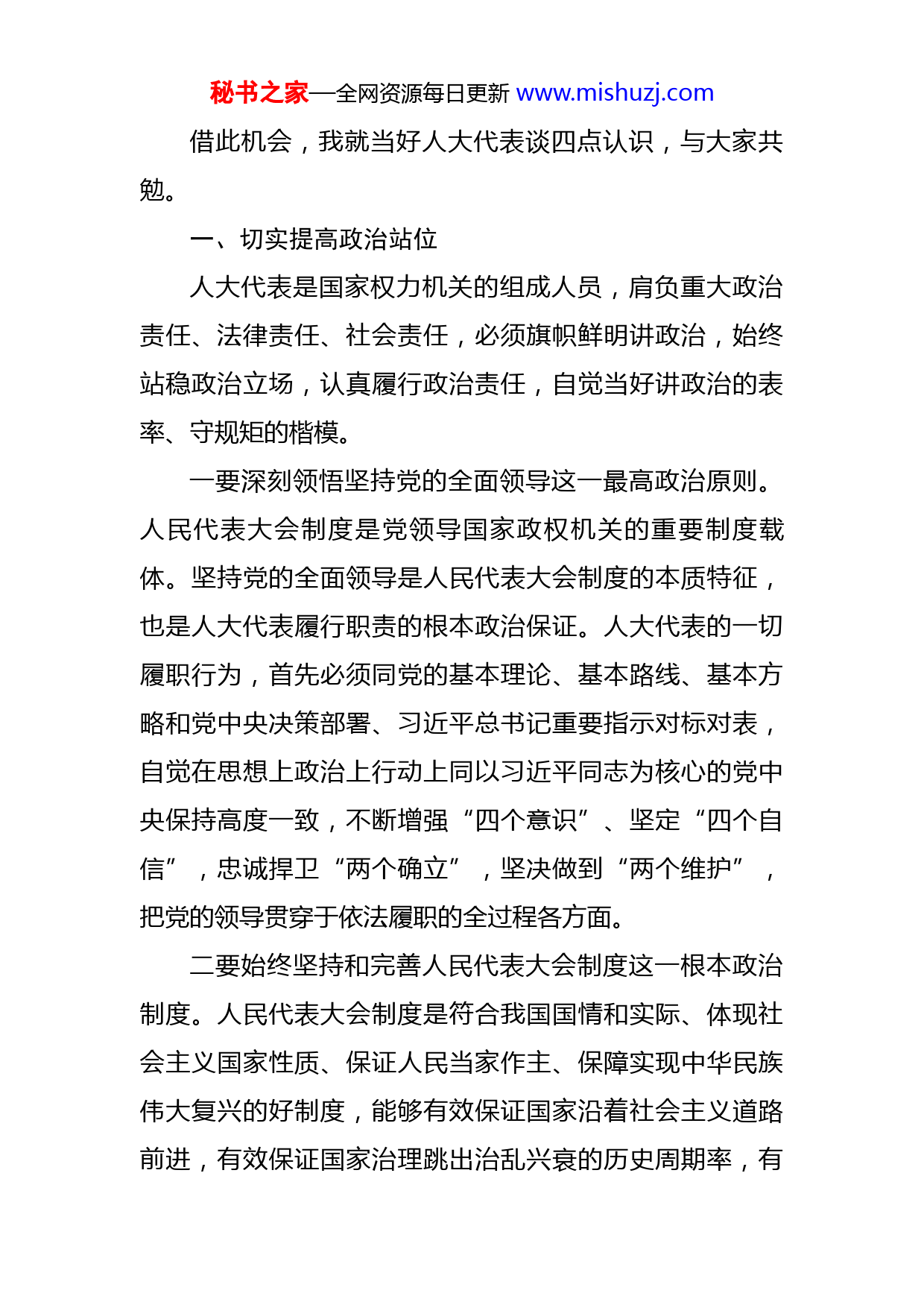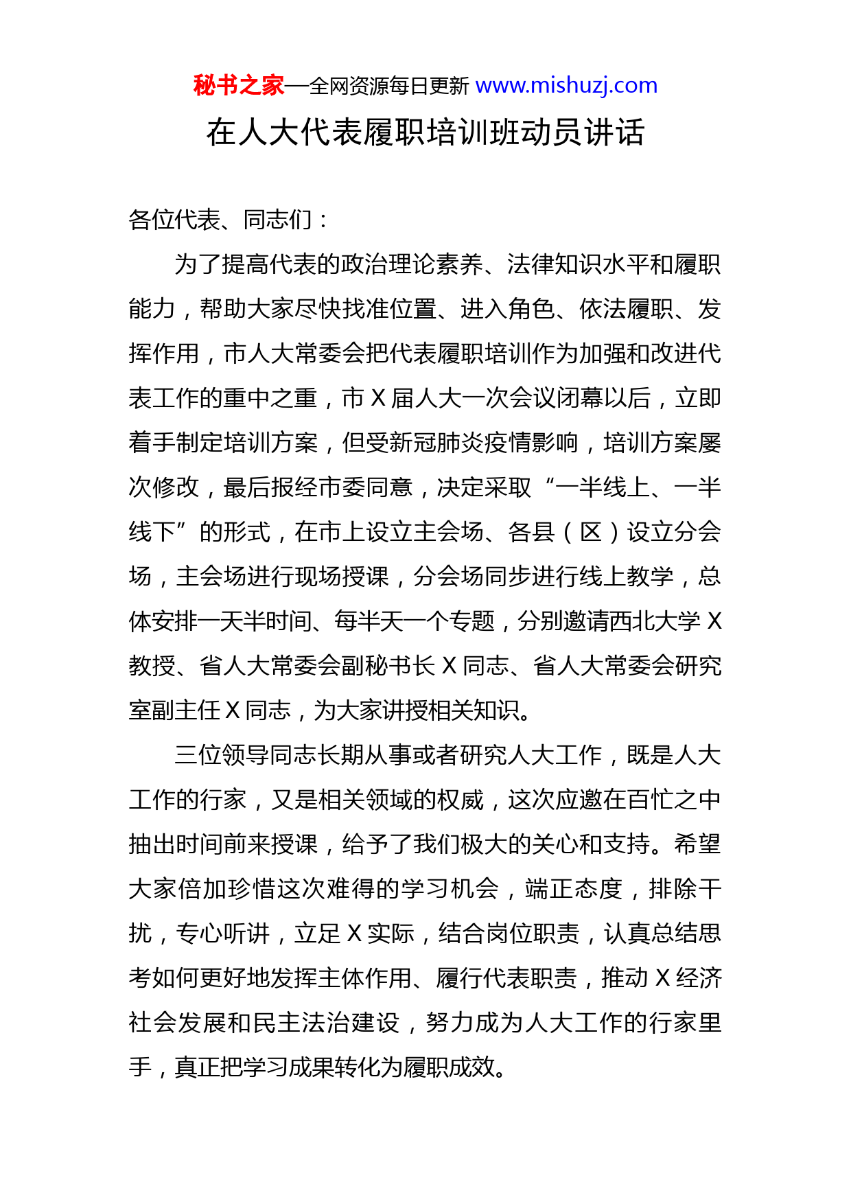 秘书之家—全网资源每日更新www.mishuzj.com在人大代表履职培训班动员讲话各位代表、同志们:为了提高代表的政治理论素养、法律知识水平和履职能力,帮助大家尽快找准位置、进入角色、依法履职、发挥作用,市人大常委会把代表履职培训作为加强和改进代表工作的重中之重,市X届人大一次会议闭幕以后,立即着手制定培训方案,但受新冠肺炎疫情影响,培训方案屡次修改,最后报经市委同意,决定采取“一半线上、一半线下”的形式,在市上设立主会场、各县(区)设立分会场,主会场进行现场授课,分会场同步进行线上教学,总体安排一天半时间、每半天一个专题,分别邀请西北大学X教授、省人大常委会副秘书长X同志、省人大常委会研究室副主任X同志,为大家讲授相关知识。三位领导同志长期从事或者研究人大工作,既是人大工作的行家,又是相关领域的权威,这次应邀在百忙之中抽出时间前来授课,给予了我们极大的关心和支持。希望大家倍加珍惜这次难得的学习机会,端正态度,排除干扰,专心听讲,立足X实际,结合岗位职责,认真总结思考如何更好地发挥主体作用、履行代表职责,推动X经济社会发展和民主法治建设,努力成为人大工作的行家里手,真正把学习成果转化为履职成效。秘书之家—全网资源每日更新www.mishuzj.com借此机会,我就当好人大代表谈四点认识,与大家共勉。一、切实提高政治站位人大代表是国家权力机关的组成人员,肩负重大政治责任、法律责任、社会责任,必须旗帜鲜明讲政治,始终站稳政治立场,认真履行政治责任,自觉当好讲政治的表率、守规矩的楷模。一要深刻领悟坚持党的全面领导这一最高政治原则。人民代表大会制度是党领导国家政权机关的重要制度载体。坚持党的全面领导是人民代表大会制度的本质特征,也是人大代表履行职责的根本政治保证。人大代表的一切履职行为,首先必须同党的基本理论、基本路线、基本方略和党中央决策部署、习近平总书记重要指示对标对表,自觉在思想上政治上行动上同以习近平同志为核心的党中央保持高度一致,不断增强“四个意识”、坚定“四个自信”,忠诚捍卫“两个确立”,坚决做到“两个维护”,把党的领导贯穿于依法履职的全过程各方面。二要始终坚持和完善人民代表大会制度这一根本政治制度。人民代表大会制度是符合我国国情和实际、体现社会主义国家性质、保证人民当家作主、保障实现中华民族伟大复兴的好制度,能够有效保证国家沿着社会主义道路前进,有效保证国家治理跳出治乱兴衰的历史周期率,有秘书之家—全网资源每日更新www.mishuzj.com效保证国家政治生活既充满活力又安定有序。我们必须深刻理解人民代表大会制度的显著优越性和独特优势,进一步增强制度自信,当好人民代表大会制度的忠实维护者、实践者和推动者,不断丰富人民代表大会制度在X的实践特色、时代特色。三要牢牢把握发展全过程人民民主这一本质要求。习近平总书记指出,我们走的是一条中国特色社会主义政治发展道路,人民民主是一种全过程的民主,是全链条、全方位、全覆盖的民主,是保障人民当家作主的最广泛、最真实、最管用的社会主义民主。人民代表大会制度是实现我国全过程人民民主的重要制度载体,践行全过程人民民主是人大工作、人大代表履职的重要时代课题。要深刻把握习近平总书记关于发展全过程人民民主的重要要求,深入践行全过程人民民主重要理念,忠实代表人民利益和意志,依法行使国家权力,切实为人民用权、为人民履职、为人民服务。二、准确把握职责定位人大代表是国家权力机关的组成人员,是人民行使国家权力的代表。每位人大代表在享有人民和法律赋予的荣誉和权利的时候,应当时时处处以人民的利益和意志为准则,鼓舞和带领广大群众完成历史赋予我们的光荣使命。希望大家进一步加深对代表性质、地位、权利、义务的认秘书之家—全网资源每日更新www.mishuzj.com识和理解,处理好以下几组关系,行使好宪法和法律赋予的各项职权。一要处理好行使权利与履行义务的关系。人大代表享有一定的权利,同时承担一定的义务,权利与义务不能割裂。法律赋予代表比一般公民更大的权利,也必然要承担更多的义务。代表应当主动参加闭会期间活动;代表执行代表职务的活动,不得接受企事业组织、社会团体、个人出资赞助;不得干涉司法案件的审理和执行;代表视察不直接处理问题,这些都体现了权利和义务的一致,希望大家认真贯彻落实。二要处理好集体行使职权与个人发挥作用的关系。代表集体参与对国家权力的行使,个人无权单独行使国家权力。每位代表都要摆正自己的位置,掌握人大工作的方式方法,贯彻好民主集中制原则。当然,代表集体行使职权是建立在每位代表正确履职、充分发挥作用的基础上的。只有每位代表都能密切联系群众,了解社情民意,反映群众的意见和要求,认真负责地行使好职权,人大作出的决议和决定才能符合最广大人民的根本利益,人民当家作主才能真正得以实现。三要处理好局部利益与整体利益的关系。人大代表由选民或选举单位选出,应当反映他们的意见和要求。同时,人大代表又要有全局观念、整体意识、长远眼光。当秘书之家—全网资源每日更新www.mishuzj.com眼前与长远,局部与整体的利益发生冲突的时候,应当首先
