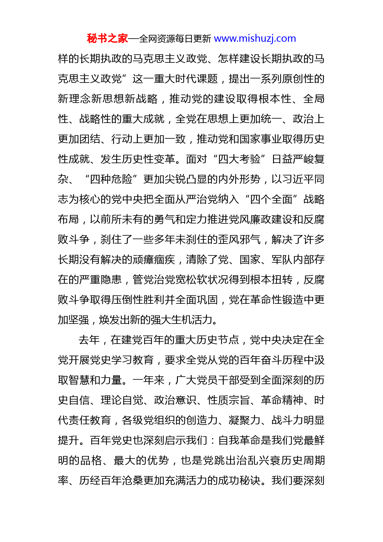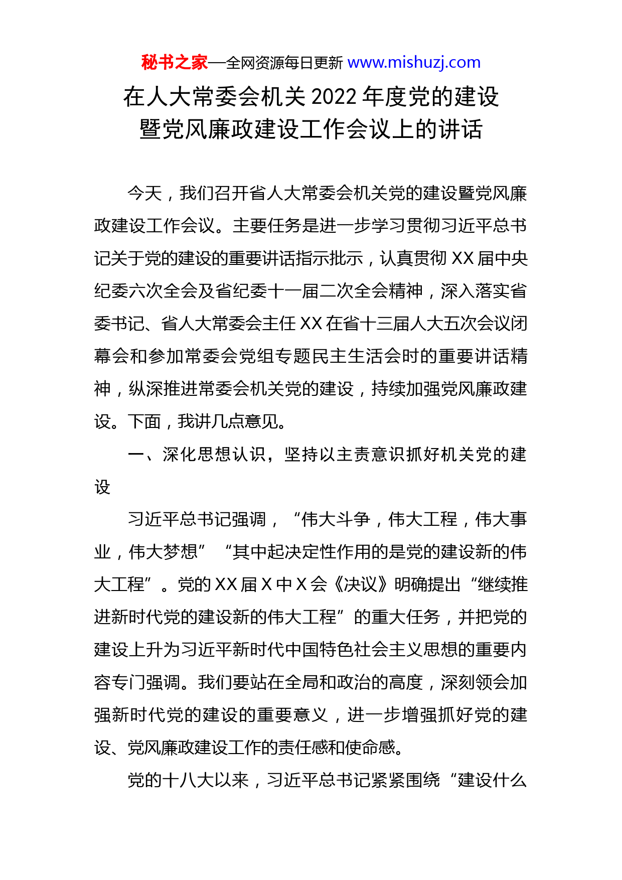 秘书之家—全网资源每日更新www.mishuzj.com在人大常委会机关2022年度党的建设暨党风廉政建设工作会议上的讲话今天,我们召开省人大常委会机关党的建设暨党风廉政建设工作会议。主要任务是进一步学习贯彻习近平总书记关于党的建设的重要讲话指示批示,认真贯彻XX届中央纪委六次全会及省纪委十一届二次全会精神,深入落实省委书记、省人大常委会主任XX在省十三届人大五次会议闭幕会和参加常委会党组专题民主生活会时的重要讲话精神,纵深推进常委会机关党的建设,持续加强党风廉政建设。下面,我讲几点意见。一、深化思想认识,坚持以主责意识抓好机关党的建设习近平总书记强调,“伟大斗争,伟大工程,伟大事业,伟大梦想”“其中起决定性作用的是党的建设新的伟大工程”。党的XX届X中X会《决议》明确提出“继续推进新时代党的建设新的伟大工程”的重大任务,并把党的建设上升为习近平新时代中国特色社会主义思想的重要内容专门强调。我们要站在全局和政治的高度,深刻领会加强新时代党的建设的重要意义,进一步增强抓好党的建设、党风廉政建设工作的责任感和使命感。党的十八大以来,习近平总书记紧紧围绕“建设什么秘书之家—全网资源每日更新www.mishuzj.com样的长期执政的马克思主义政党、怎样建设长期执政的马克思主义政党”这一重大时代课题,提出一系列原创性的新理念新思想新战略,推动党的建设取得根本性、全局性、战略性的重大成就,全党在思想上更加统一、政治上更加团结、行动上更加一致,推动党和国家事业取得历史性成就、发生历史性变革。面对“四大考验”日益严峻复杂、“四种危险”更加尖锐凸显的内外形势,以习近平同志为核心的党中央把全面从严治党纳入“四个全面”战略布局,以前所未有的勇气和定力推进党风廉政建设和反腐败斗争,刹住了一些多年未刹住的歪风邪气,解决了许多长期没有解决的顽瘴痼疾,清除了党、国家、军队内部存在的严重隐患,管党治党宽松软状况得到根本扭转,反腐败斗争取得压倒性胜利并全面巩固,党在革命性锻造中更加坚强,焕发出新的强大生机活力。去年,在建党百年的重大历史节点,党中央决定在全党开展党史学习教育,要求全党从党的百年奋斗历程中汲取智慧和力量。一年来,广大党员干部受到全面深刻的历史自信、理论自觉、政治意识、性质宗旨、革命精神、时代责任教育,各级党组织的创造力、凝聚力、战斗力明显提升。百年党史也深刻启示我们:自我革命是我们党最鲜明的品格、最大的优势,也是党跳出治乱兴衰历史周期率、历经百年沧桑更加充满活力的成功秘诀。我们要深刻秘书之家—全网资源每日更新www.mishuzj.com认识全面从严治党是新时代党的自我革命的伟大实践,准确把握党推进自我革命“六个必须”的宝贵历史经验,深刻领会执政党建设“九个坚持”的规律性认识,切实把思想和行动统一到党中央关于继续推进新时代党的建设新的伟大工程的战略部署上来,在新的起点上坚定不移继续推进党的自我革命,以伟大自我革命引领伟大社会革命,推动新时代人大事业行稳致远、开创新局。二、把握形势任务,坚持以严实标准推进机关党的建设过去一年,省人大常委会机关各级党组织坚持以习近平新时代中国特色社会主义思想为指导,在省委坚强领导下,坚持把抓好党建作为最大政绩,自觉扛责在肩、落责于行,推动常委会机关党的建设提质提效、全面从严管党治党有力有为。一是政治建设得到新加强。把落细落实习近平总书记重要讲话指示批示精神作为履职首责,通过制定项目化的实施方案、作出一体化的多项决定、组织体系化的座谈交流等,推动党中央决策部署落地见效,特别是意识形态阵地建管卓有成效。二是理论武装实现新提升。把学习贯彻习近平法治思想、习近平总书记关于坚持和完善人民代表大会制度的重要思想作为必修课和基本功,深入学习贯彻中央人大工作会议精神,党史学习教育开展得有特色有成效,增强了践行初心使命的政治自觉。三是基秘书之家—全网资源每日更新www.mishuzj.com层基础得到新巩固。完善专委会分党组工作规则,深入开展“双优”党支部创建,基层党组织政治功能和组织力进一步提升,战斗堡垒作用进一步显现。四是队伍建设展现新活力。健全干部素质培养、知事识人、选拔任用、从严管理、正向激励机制,扎实开展干部专题教育培训,选派年轻干部到乡村帮扶、去企业基层磨砺。注重在急难险重任务一线考察识别任用干部,干部干事创业、担当作为的积极性、主动性进一步增强。五是机关作风呈现新气象。大力弘扬“三严三实”优良作风,力戒形式主义、官僚主义,开展“履职尽责办实事”活动,帮助基层和群众解决急难愁盼问题。严格落实主体责任和“一岗双责”,统筹推进中央及省委巡视反馈问题整改,党风廉政建设纵深推进。根据派驻纪检监察组问卷调查,人大机关政治生态满意度97%。在总结成绩的同时,我们也要清醒认识到机关党建工作中存在的短板弱项,XX书记在省纪委十一届二次全会上指出的“六个方面”的问题表现,以及在全省改进工作作风为民办实事为企优环境大会上指出的“六个不”的突出问题,在常委会机关都有不同形式、不同程度的存在。比如:在把理论学习成果转化为服务保障高质量发