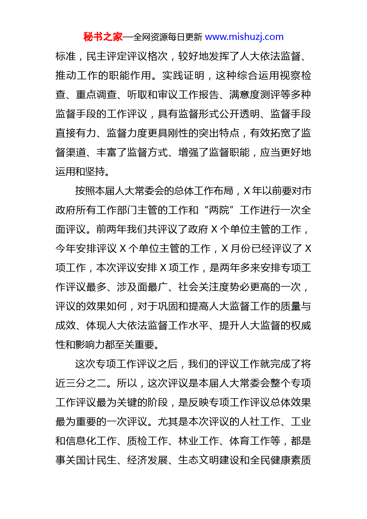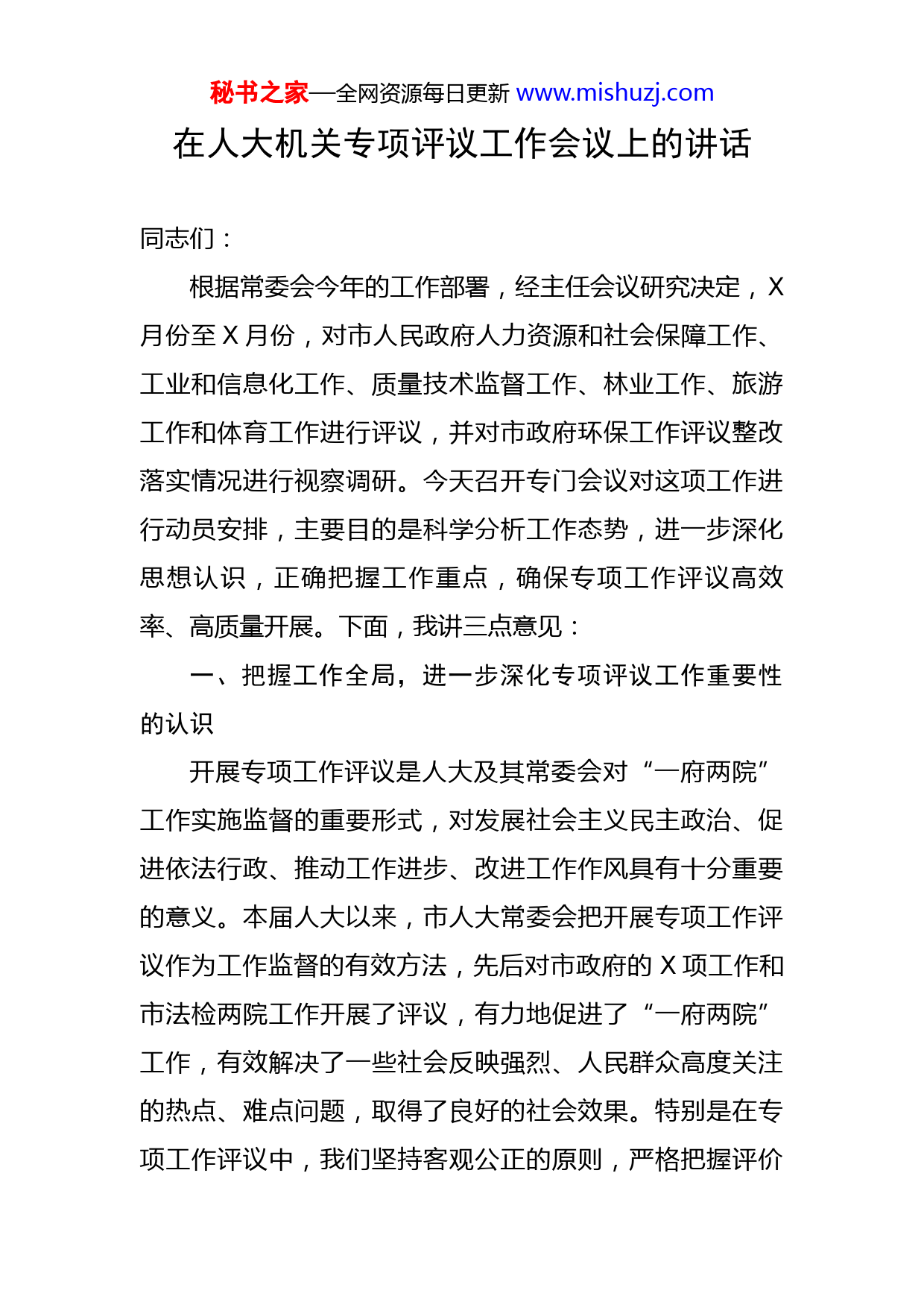 秘书之家—全网资源每日更新www.mishuzj.com在人大机关专项评议工作会议上的讲话同志们:根据常委会今年的工作部署,经主任会议研究决定,X月份至X月份,对市人民政府人力资源和社会保障工作、工业和信息化工作、质量技术监督工作、林业工作、旅游工作和体育工作进行评议,并对市政府环保工作评议整改落实情况进行视察调研。今天召开专门会议对这项工作进行动员安排,主要目的是科学分析工作态势,进一步深化思想认识,正确把握工作重点,确保专项工作评议高效率、高质量开展。下面,我讲三点意见:一、把握工作全局,进一步深化专项评议工作重要性的认识开展专项工作评议是人大及其常委会对“一府两院”工作实施监督的重要形式,对发展社会主义民主政治、促进依法行政、推动工作进步、改进工作作风具有十分重要的意义。本届人大以来,市人大常委会把开展专项工作评议作为工作监督的有效方法,先后对市政府的X项工作和市法检两院工作开展了评议,有力地促进了“一府两院”工作,有效解决了一些社会反映强烈、人民群众高度关注的热点、难点问题,取得了良好的社会效果。特别是在专项工作评议中,我们坚持客观公正的原则,严格把握评价秘书之家—全网资源每日更新www.mishuzj.com标准,民主评定评议格次,较好地发挥了人大依法监督、推动工作的职能作用。实践证明,这种综合运用视察检查、重点调查、听取和审议工作报告、满意度测评等多种监督手段的工作评议,具有监督形式公开透明、监督手段直接有力、监督力度更具刚性的突出特点,有效拓宽了监督渠道、丰富了监督方式、增强了监督职能,应当更好地运用和坚持。按照本届人大常委会的总体工作布局,X年以前要对市政府所有工作部门主管的工作和“两院”工作进行一次全面评议。前两年我们共评议了政府X个单位主管的工作,今年安排评议X个单位主管的工作,X月份已经评议了X项工作,本次评议安排X项工作,是两年多来安排专项工作评议最多、涉及面最广、社会关注度势必更高的一次,评议的效果如何,对于巩固和提高人大监督工作的质量与成效、体现人大依法监督工作水平、提升人大监督的权威性和影响力都至关重要。这次专项工作评议之后,我们的评议工作就完成了将近三分之二。所以,这次评议是本届人大常委会整个专项工作评议最为关键的阶段,是反映专项工作评议总体效果最为重要的一次评议。尤其是本次评议的人社工作、工业和信息化工作、质检工作、林业工作、体育工作等,都是事关国计民生、经济发展、生态文明建设和全民健康素质秘书之家—全网资源每日更新www.mishuzj.com的重要工作,社会关注度很高,公众对人大监督的期望也很大。如果这次评议把握不准、评议格次评定不够严谨,不能体现出工作差别,就会影响人大工作的严肃性,淡化人大专项工作评议的监督性,削弱人大监督的权威性。对此,参与评议调查和视察调研的所有同志务必要有一个清醒的认识,一定要从人大常委会工作的总体规划部署和推动人大工作创新发展、不断增强监督实效的高度来认识、来把握这次工作评议,充分认识这次专项工作评议的特殊性和搞好评议调查、调研的极端重要性,思想上要高度重视,工作上要严谨细致,确保高质量、高水平地搞好评议工作。二、发扬务实作风,扎实认真做好评议调查调研工作实事求是、客观公正是树立人大监督工作权威的根本。专项工作评议是人大监督工作做有效、最全面的、最具针对性的监督方式,评议要真正评出优劣、评出实效,基础工作尤为重要,因此,必须坚持求真务实、勇于监督的作风,扎扎实实做好评议调查和调研工作。各评议调查组一定要按照专项工作评议暂行办法和实施意见,加强领导,精心策划,讲求方法,注重实效,深入实际,把评议调查工作做实做细,把工作情况摸清吃透,把工作的真实情况反映出来,用实际行动展现党的作风建设实践活动在人大监督工作中的成果。秘书之家—全网资源每日更新www.mishuzj.com一要突出评议调查调研的严肃性。开展评议调查调研是进行专项工作评议的首要环节,是基础性、关键性的工作。评议调查的目的在于全面客观地反映各项工作的实际情况,肯定成绩,指出问题,提出建议,作出评价,为人大常委会进行集中评议、进而评定评议格次提供基础性的意见和建议。因而,评议调查调研极其重要,调查调研的意见具有很强的导向性,直接影响评议结果和评议效果。所以,各评议调查组一定要正确理解常委会的工作要求,准确把握评议调查工作的尺度。特别是常委会各分管领导和各相关工作委员会的负责同志,要以高度负责的精神,切实履行好领导责任,发挥好统筹协调的作用,按照评议工作的总体部署和要求,实事求是地对各项工作情况作一个客观的估价,按照体现工作实绩差别的原则,把握好本次评议的格次定位,合理评定评议调查分数,为常委会集中评议奠定一个良好的基础。二要突出评议调查调研的真实性。各调研组要深入实际了解情况,要注重调查调研的形式,听取县区和部门的专项工作汇报时,县区分管领导和部门负责人必须参加会议,并且可以就有关问题进行询问,进一步了解情况。调查点的选择要有代表性,确保全面了解存在问题,弄清真实情况,力求掌握比较充分、更为直接的第一手资料,坚决杜绝凭