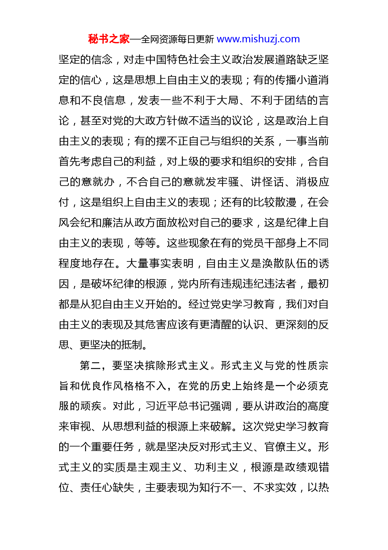 秘书之家—全网资源每日更新www.mishuzj.com在人大机关开年作风建设会上的总结讲话关于作风建设问题,我再强调讲一讲。通过开展党史学习教育,人大机关作风有了改进,对取得的成效要给予充分肯定,但也不能估计得过高。经过党史学习教育,我们对机关作风建设存在的一些不足和问题,要以更高的标准来审视,以更大的决心来纠正,这也是巩固拓展党史学习教育成果的内在要求。结合人大机关的实际情况,我着重讲三点。第一,要坚决反对自由主义。自由主义对党的集体、党的事业是一种腐蚀剂。早在1937年,毛泽东同志在《反对自由主义》一文中,就分析了自由主义存在的种种表现及其危害,指出“自由主义的来源,在于小资产阶级的自私自利性,以个人利益放在第一位,革命利益放在第二位,因此产生思想上、政治上、组织上的自由主义”。80多年过去了,世情、国情、党情发生了很大变化,但是党内反对自由主义的任务依然很重。习近平总书记在多次讲话中对党内存在的形形色色的自由主义现象进行了深刻剖析,向全党发出了谆谆告诫。对一个部门、一个单位来讲,多数情况下,自由主义不是有没有的问题,而是多与少、轻与重的问题,人大机关也不例外。有的同志精神比较空虚,对马克思主义缺乏坚定的信仰,对共产主义缺乏秘书之家—全网资源每日更新www.mishuzj.com坚定的信念,对走中国特色社会主义政治发展道路缺乏坚定的信心,这是思想上自由主义的表现;有的传播小道消息和不良信息,发表一些不利于大局、不利于团结的言论,甚至对党的大政方针做不适当的议论,这是政治上自由主义的表现;有的摆不正自己与组织的关系,一事当前首先考虑自己的利益,对上级的要求和组织的安排,合自己的意就办,不合自己的意就发牢骚、讲怪话、消极应付,这是组织上自由主义的表现;还有的比较散漫,在会风会纪和廉洁从政方面放松对自己的要求,这是纪律上自由主义的表现,等等。这些现象在有的党员干部身上不同程度地存在。大量事实表明,自由主义是涣散队伍的诱因,是破坏纪律的根源,党内所有违规违纪违法者,最初都是从犯自由主义开始的。经过党史学习教育,我们对自由主义的表现及其危害应该有更清醒的认识、更深刻的反思、更坚决的抵制。第二,要坚决摈除形式主义。形式主义与党的性质宗旨和优良作风格格不入,在党的历史上始终是一个必须克服的顽疾。对此,习近平总书记强调,要从讲政治的高度来审视、从思想利益的根源上来破解。这次党史学习教育的一个重要任务,就是坚决反对形式主义、官僚主义。形式主义的实质是主观主义、功利主义,根源是政绩观错位、责任心缺失,主要表现为知行不一、不求实效,以热秘书之家—全网资源每日更新www.mishuzj.com热闹闹的形式代替扎扎实实的落实。在现实生活中,形式主义与官僚主义往往相伴而生、如影随形,出现形式主义,往往就会出现脱离群众、做表面文章,从而滋生官僚主义;出现官僚主义,往往就会出现照搬照套、敷衍了事,从而滋生形式主义。经过党史学习教育,在反对形式主义、官僚主义方面,从常委会党组到机关都取得了积极成效,但对照总书记提出的坚决摈除形式主义的要求还有不小差距,需要付出不懈的努力。有的同志理论学习不深不透,理解认识比较肤浅,自以为学了就是懂了,讲了就是做了;有的工作满足于一般化、得过且过,把做过了当成做好了,把交差了当成完成了,做过了可能做好了,也可能没有做好,关键看怎么做,交差了可能是完成了,也可能是一个半成品、次品,关键看有什么要求,如果没有标准、没有要求,就很难有长进,就很难保证工作质量;有的到基层走马观花,看安排场景多,与基层一线干部群众交流少,“蜻蜓点水”式调研多,“解剖麻雀”式调研少;还有的习惯于以会议贯彻会议、以文件落实文件,没有把精力放在创造性开展工作上,没有把功夫下在抓落实求实效上,等等。纠正形式主义问题,不是哪一个部门、哪一个单位、哪一个人的事情,每一个部门、每个单位都责无旁贷,每一名党员、每一名领导干部都责无旁贷。要坚持刀刃向内,从自身查起、从自身改起,最大限度挤压秘书之家—全网资源每日更新www.mishuzj.com形式主义的生存空间。第三,坚决克服好人主义。我们党历来提倡团结,也历来反对庸俗的好人主义,一直倡导通过积极健康的思想斗争等方式实现团结的目的。毋庸讳言,好人主义因为其特有的伪善性,有时确实有一定的市场,在“你好我好大家好”中,滋生的是利己主义、投机主义,损害的是党性原则、纪律规矩。如果对工作不上心、做事不认真、任务完成不好的行为表现,总是睁一只眼闭一只眼,该指出的不指出,该督促的不督促,这个部门单位的工作怎么可能搞好?如果对不遵守纪律、不按规矩办事、言行举止与机关干部不相称的人和事,总是睁一只眼闭一只眼,该批评的不批评,该纠正的不纠正,这个部门单位的风气怎么可能搞好?如果对错误的、有害的东西不但不去抵制,反而去迎合、附和,或者搞差别对待,与自己关系比较好的就一味护着罩着,那么,作为一名党员,能是合格的吗?作为一名领导干部,能是称职的吗?毛泽东同志早就告诫我们,主张无原则和平,结果是腐朽庸俗的作风发生。习近平总书记深刻指出,“对共产党人来说,‘好好先生’并不是真正的好人”。奉行好