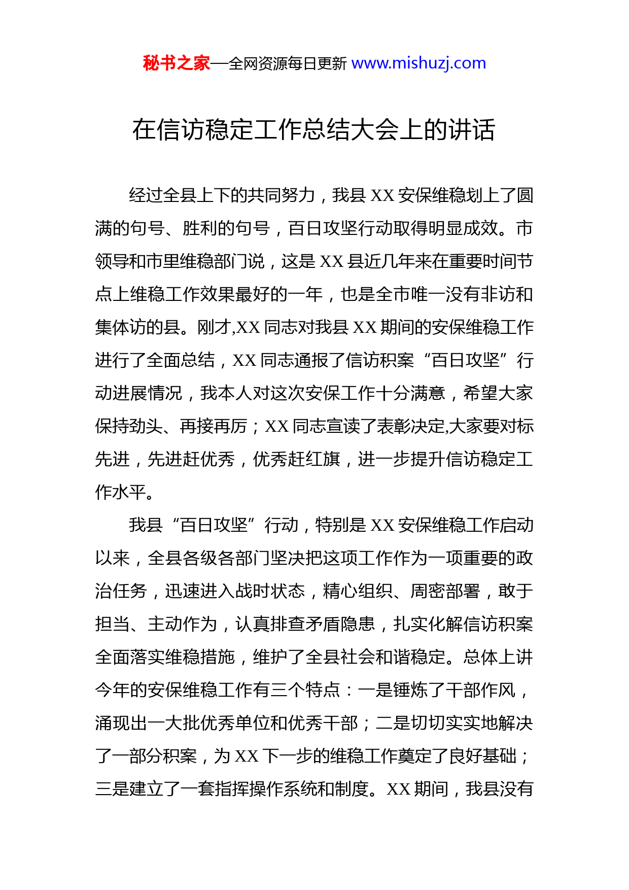 秘书之家—全网资源每日更新www.mishuzj.com在信访稳定工作总结大会上的讲话经过全县上下的共同努力,我县XX安保维稳划上了圆满的句号、胜利的句号,百日攻坚行动取得明显成效。市领导和市里维稳部门说,这是XX县近几年来在重要时间节点上维稳工作效果最好的一年,也是全市唯一没有非访和集体访的县。刚才,XX同志对我县XX期间的安保维稳工作进行了全面总结,XX同志通报了信访积案“百日攻坚”行动进展情况,我本人对这次安保工作十分满意,希望大家保持劲头、再接再厉;XX同志宣读了表彰决定,大家要对标先进,先进赶优秀,优秀赶红旗,进一步提升信访稳定工作水平。我县“百日攻坚”行动,特别是XX安保维稳工作启动以来,全县各级各部门坚决把这项工作作为一项重要的政治任务,迅速进入战时状态,精心组织、周密部署,敢于担当、主动作为,认真排查矛盾隐患,扎实化解信访积案全面落实维稳措施,维护了全县社会和谐稳定。总体上讲今年的安保维稳工作有三个特点:一是锤炼了干部作风,涌现出一大批优秀单位和优秀干部;二是切切实实地解决了一部分积案,为XX下一步的维稳工作奠定了良好基础;三是建立了一套指挥操作系统和制度。XX期间,我县没有秘书之家—全网资源每日更新www.mishuzj.com发生一起进京非访和集体访,得到了市委、市政府和市信访部门的肯定。这次信访维稳攻坚战能够取得圆满胜利,充分证明了我们的干部队伍是讲政治、顾大局的,是能打硬仗、善打硬仗的,是能经得住考验、扛得住压力的。在此,我代表县四套班子,向日夜奋战在信访维稳一线的所有同志们,表示诚挚的慰问和衷心的感谢!成绩值得肯定,问题依然存在。我们必须保持清醒,全国“两会”安保成绩是暂时的,是通过特殊手段、超常措施取得的,全县信访形势依然不容乐观,一些矛盾隐患潜在风险还有很多,维稳责任意识还需进一步强化,这些都需要引起我们的高度警惕。一是在落实维稳责任上,存在上热下冷、上紧下松的现象,压力向基层传导不够,特别是村一级,思想不重视,稳控措施不到位。比如XX,本来是可控的,就是因为包案人员思想放松、工作懈怠,没有把人看紧盯死,导致出现问题。大家一定要举一反三、汲取教训;二是部分县直部门责任意识淡薄,对系统内的隐患,排查不够全面细致,稳控措施不够坚决果断;三是政法部门在依法打击上,推诿扯皮、不敢担当、不敢出手没有硬起手腕、攥紧拳头、形成合力;四是信访部门底数不清、情况不明,不能给领导决策提供很好的依据,发现问题隐瞒不报,不敢得罪人,没有完全尽职尽责。总体上讲,县比乡重视,乡比县直部门重视,最不重视的是村一秘书之家—全网资源每日更新www.mishuzj.com级。对此,各乡镇对村支部书记和村主任工资必须建立考核办法,不能干与不干一个样。今年是新中国成立70周年,大事多、要事多,XX等重大重要会议也将在今年相继召开。可以说,信访维稳的压力比以往任何时候都要大。因此,做好今年的信访稳定工作是头等大事,各级干部不能有一丝一毫的松懈,必须时刻绷紧稳定这根弦,做到思想不松、标准不降、力度不减。下面,就进一步做好今年的信访稳定工作,我强调四点意见:第一,变被动为主动,不断加大隐患排查力度。隐患排查是做好信访稳定工作的前提和基础。但是目前,有的部门对这项工作认识不到位,排查不积极、不主动,往往临阵磨枪、急时抱佛脚,以至于底数不清、情况不明,给工作带来了被动。俗话说:“台上一分钟,台下十年功”信访工作更是如此,只有把功夫下在平时,把辖区内、部门内的隐患摸清摸透,在重要关口才不会措手不及。排查信访隐患,要突出“细、勤、调”三个字。“细”,就是紧紧围绕当前社会矛盾的新情况、新特点,深入到每一个领域、每一个行业、每一个群体,认真细致地开展矛盾纠纷排查,做到横向到边、纵向到底,不漏一人一事,真正把问题弄清楚,把情况搞明白,把影响和谐稳定的因素找出来,筑牢信访工作的第一道防线。能解决的解决,不能秘书之家—全网资源每日更新www.mishuzj.com解决的,要稳控到位。合理的要依规解决、正确解决,部分合理的,或者不具备解决条件的,要制定方案、解释明白,及时给予答复。“勤”,就是要加大隐患排查频次。信访隐患是动态的,不是静态的,这个月没问题,不一定下个月没问题,一时排查不到,就有可能酿成大矛盾。这就要求各级干部腿脚要勤,多跑基层、多问情况,随时排查、随时发现。“调”,就是加大调处力度,对发现的隐患,要逐一进行梳理归类,逐一进行分析研判,搞清问题症结,及时进行调解,随时做好应对准备。稳控是暂时措施,解决问题才是根本办法,息诉罢访才是最终目的。第二,变攻坚为常态,不断加大积案化解力度。信访问题推不掉、捂不住、躲不了。做好信访稳定工作,关键是要化解矛盾、解决问题,这既是我们工作的出发点,也是落脚点。前段时间,我们通过开展信访积案百日攻坚行动,一批久拖不决的信访问题得到有效化解。下一步,我们不仅要巩固、扩大攻坚战果,更要形成常态化的化解积案机制,不断遏制信访增量、消除信访存量。在积案化解过程中,要切实做到“三讲”,就是讲担当、讲责任、讲策略。讲担当,就是要敢于负责、敢于啃硬骨头、敢于承担最难办的问题。有很多信访积案,都是干部不敢负责、不敢担当,