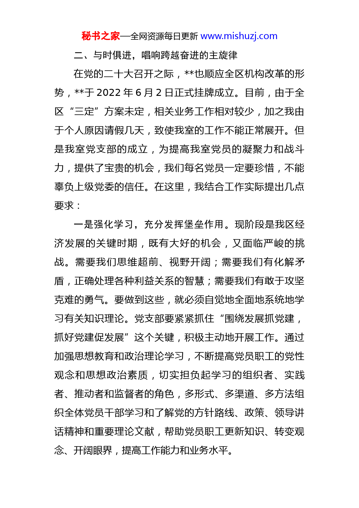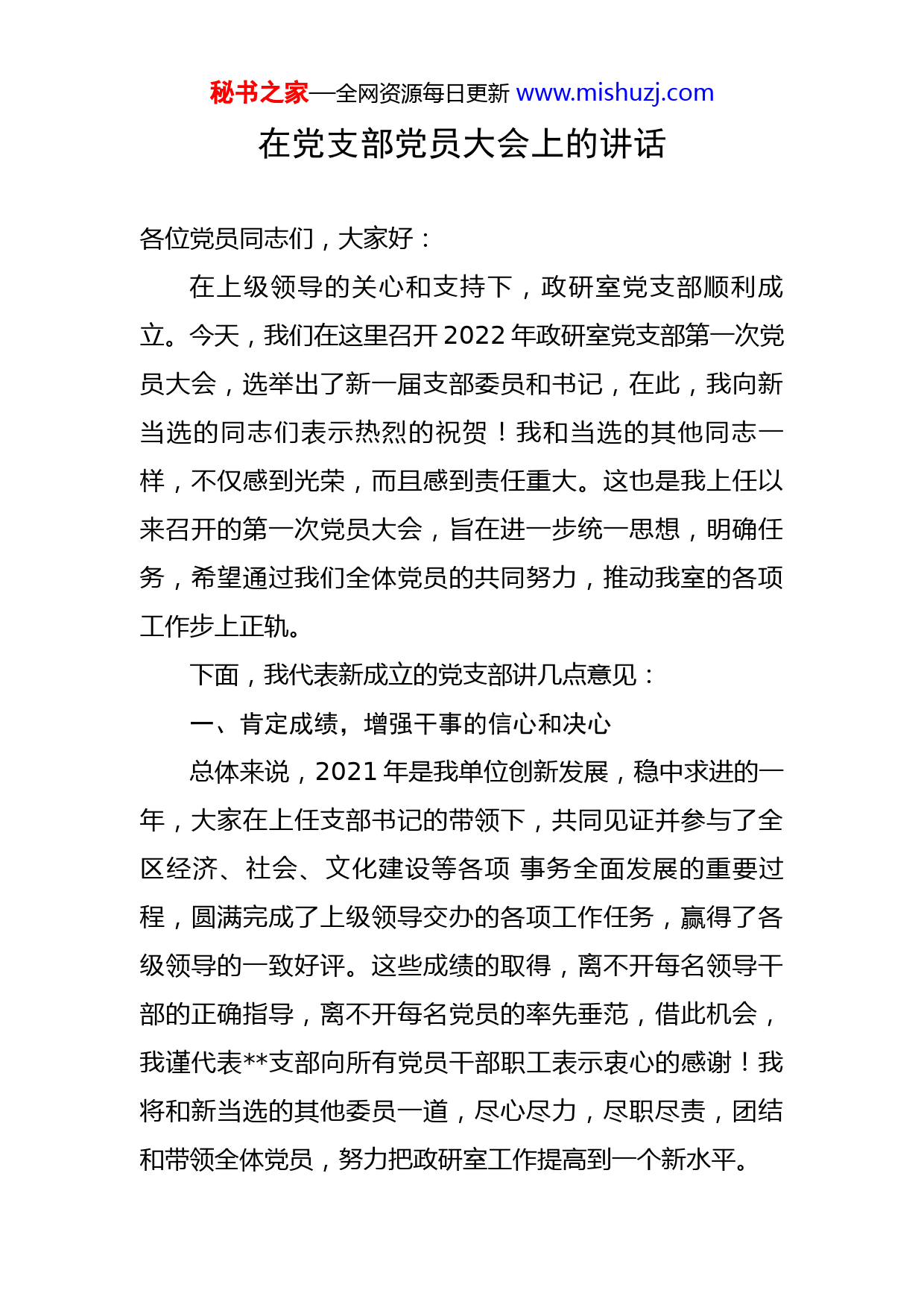 秘书之家—全网资源每日更新www.mishuzj.com在党支部党员大会上的讲话各位党员同志们,大家好:在上级领导的关心和支持下,政研室党支部顺利成立。今天,我们在这里召开2022年政研室党支部第一次党员大会,选举出了新一届支部委员和书记,在此,我向新当选的同志们表示热烈的祝贺!我和当选的其他同志一样,不仅感到光荣,而且感到责任重大。这也是我上任以来召开的第一次党员大会,旨在进一步统一思想,明确任务,希望通过我们全体党员的共同努力,推动我室的各项工作步上正轨。下面,我代表新成立的党支部讲几点意见:一、肯定成绩,增强干事的信心和决心总体来说,2021年是我单位创新发展,稳中求进的一年,大家在上任支部书记的带领下,共同见证并参与了全区经济、社会、文化建设等各项事务全面发展的重要过程,圆满完成了上级领导交办的各项工作任务,赢得了各级领导的一致好评。这些成绩的取得,离不开每名领导干部的正确指导,离不开每名党员的率先垂范,借此机会,我谨代表支部向所有党员干部职工表示衷心的感谢!我将和新当选的其他委员一道,尽心尽力,尽职尽责,团结和带领全体党员,努力把政研室工作提高到一个新水平。秘书之家—全网资源每日更新www.mishuzj.com二、与时俱进,唱响跨越奋进的主旋律在党的二十大召开之际,也顺应全区机构改革的形势,于2022年6月2日正式挂牌成立。目前,由于全区“三定”方案未定,相关业务工作相对较少,加之我由于个人原因请假几天,致使我室的工作不能正常展开。但是我室党支部的成立,为提高我室党员的凝聚力和战斗力,提供了宝贵的机会,我们每名党员一定要珍惜,不能辜负上级党委的信任。在这里,我结合工作实际提出几点要求:一是强化学习,充分发挥堡垒作用。现阶段是我区经济发展的关键时期,既有大好的机会,又面临严峻的挑战。需要我们思维超前、视野开阔;需要我们有化解矛盾,正确处理各种利益关系的智慧;需要我们有敢于攻坚克难的勇气。要做到这些,就必须自觉地全面地系统地学习有关知识理论。党支部要紧紧抓住“围绕发展抓党建,抓好党建促发展”这个关键,积极主动地开展工作。通过加强思想教育和政治理论学习,不断提高党员职工的党性观念和思想政治素质,切实担负起学习的组织者、实践者、推动者和监督者的角色,多形式、多渠道、多方法组织全体党员干部学习和了解党的方针路线、政策、领导讲话精神和重要理论文献,帮助党员职工更新知识、转变观念、开阔眼界,提高工作能力和业务水平。秘书之家—全网资源每日更新www.mishuzj.com二是提高认识,切实提升服务水平。政策研究室,顾名思义,就是搞好政策研究,发挥以文辅政作用,为区委决策当参谋、出主意。这是政研室的主要职责和核心任务,也是我们存在的价值所在。这就要求我们既要用政治、全局、战略的眼光观察认识问题,又要善于换位思考,经常站在领导的角度分析研究问题,做到参之有道、谋之有策。要增强服务的主动性、预见性和前瞻性,加强对全区改革发展重大思路和重大举措的研究,加强对全区重点工作和重要部署的谋划,努力使政研室成为区委的“参谋部”和“智囊团”。三是创新思路,统筹解决关键问题。今年是全区机构改革的开局之年,各方面的任务艰巨而繁重。对于政研室而言,今年也是特殊的一年,按上级要求,改革办设在政研室,一方面充分体现了中央和省市区委对政研系统的高度重视、高度信任。另一方面,政研室面临的压力肯定会越来越大,工作量可能会比往年多出几倍,这对政研干部的能力素质,特别是全局意识、研究能力、协调水平、工作作风等提出了新的更高要求。现在的关键问题是,面对今后改革办和政研室的双重繁重任务,我们如何站在全局和战略的高度,把改革研究得更深一些,对策提得更到位一些;如何处理服务深化改革和日常政研工作的关系,提高整体决策服务水平。我认为,服务改革首先要有改革意秘书之家—全网资源每日更新www.mishuzj.com识、担当精神。要拿出十二分的热情,创新思路、主动作为,努力把双重任务落实好、完成好,不辜负党委的信任和重托。一句老话,有作为才有地位。只要我们的工作做好了,作用发挥好了,政研室的地位、政研干部队伍的形象就会自然提高,每个人的进步也就会孕育其中。四是求真务实,加强机关作风建设。作风建设是历来每个单位关注的焦点,什么样的机关作风,就会带出什么样的职工队伍。我们要坚持高标准、严要求,以奋勇当先的气魄对待每一项工作,坚决摒弃懒散行为,不让领导安排的工作在自己手中延误,不让政研室的形象因自己受到损害。要强化责任意识,牢固树立“责任重于泰山”、“细节决定成败”的观念,真正做到尽心、尽力、尽责。同志们,从今天开始,我室各项工作将翻开新的一页,让我们紧密团结在以习近平同志为核心的党中央周围,扎实工作,与时俱进,开拓进取,为开创政研室工作新局面而努力奋斗!谢谢大家!