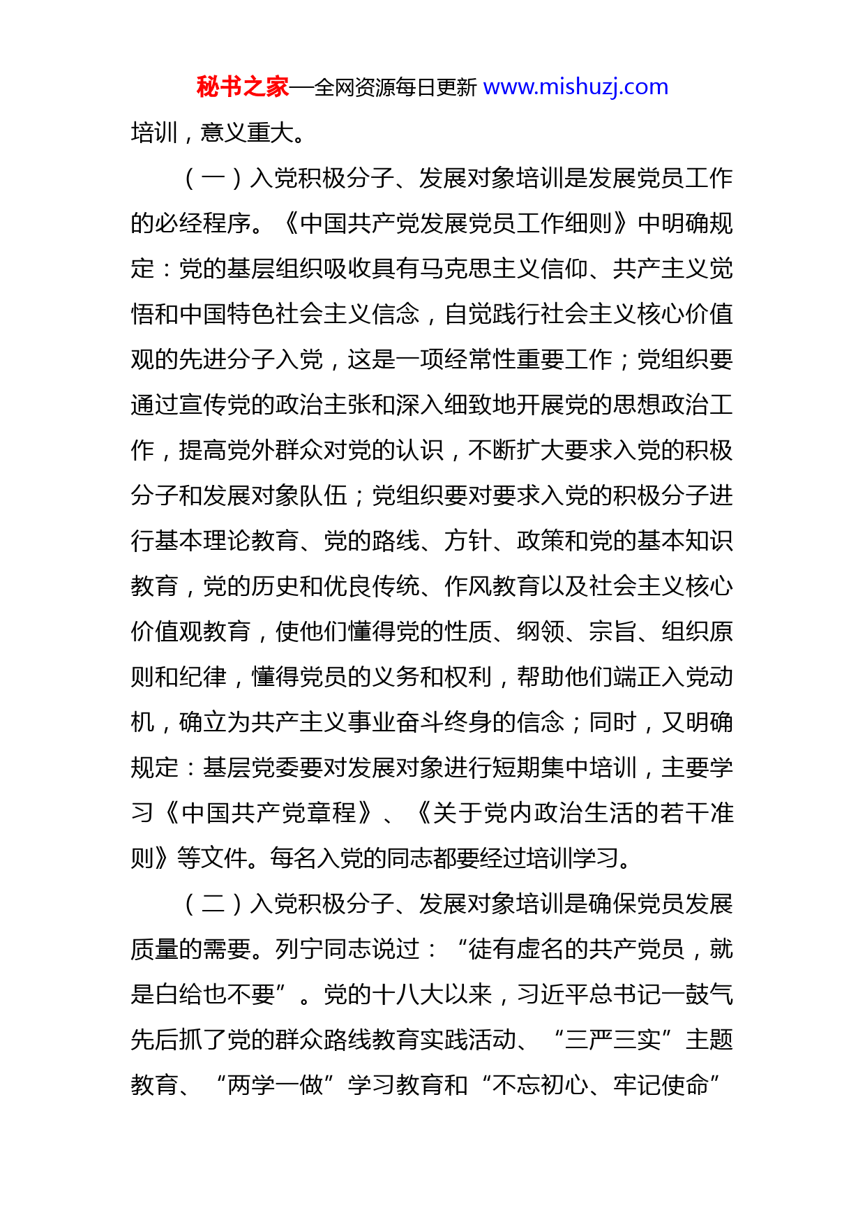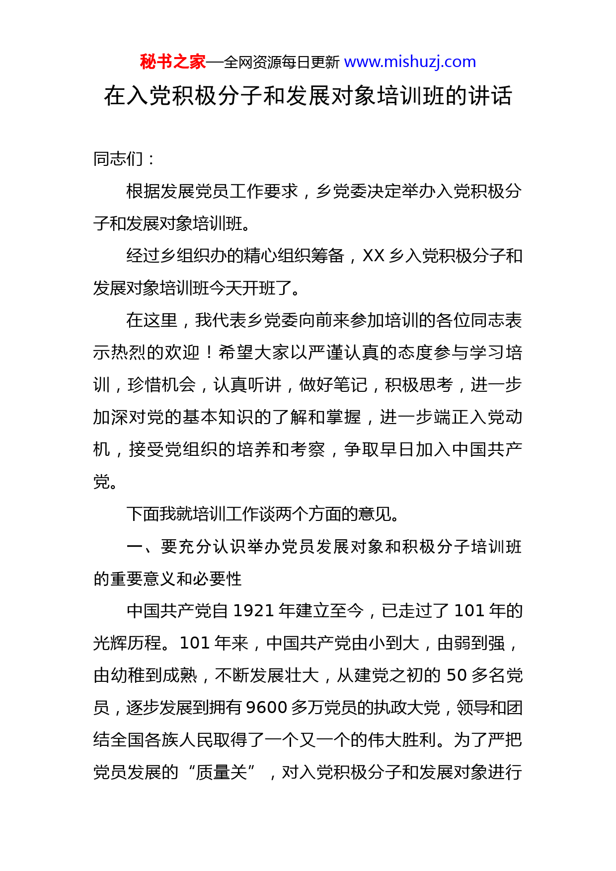 秘书之家—全网资源每日更新www.mishuzj.com在入党积极分子和发展对象培训班的讲话同志们:根据发展党员工作要求,乡党委决定举办入党积极分子和发展对象培训班。经过乡组织办的精心组织筹备,XX乡入党积极分子和发展对象培训班今天开班了。在这里,我代表乡党委向前来参加培训的各位同志表示热烈的欢迎!希望大家以严谨认真的态度参与学习培训,珍惜机会,认真听讲,做好笔记,积极思考,进一步加深对党的基本知识的了解和掌握,进一步端正入党动机,接受党组织的培养和考察,争取早日加入中国共产党。下面我就培训工作谈两个方面的意见。一、要充分认识举办党员发展对象和积极分子培训班的重要意义和必要性中国共产党自1921年建立至今,已走过了101年的光辉历程。101年来,中国共产党由小到大,由弱到强,由幼稚到成熟,不断发展壮大,从建党之初的50多名党员,逐步发展到拥有9600多万党员的执政大党,领导和团结全国各族人民取得了一个又一个的伟大胜利。为了严把党员发展的“质量关”,对入党积极分子和发展对象进行秘书之家—全网资源每日更新www.mishuzj.com培训,意义重大。(一)入党积极分子、发展对象培训是发展党员工作的必经程序。《中国共产党发展党员工作细则》中明确规定:党的基层组织吸收具有马克思主义信仰、共产主义觉悟和中国特色社会主义信念,自觉践行社会主义核心价值观的先进分子入党,这是一项经常性重要工作;党组织要通过宣传党的政治主张和深入细致地开展党的思想政治工作,提高党外群众对党的认识,不断扩大要求入党的积极分子和发展对象队伍;党组织要对要求入党的积极分子进行基本理论教育、党的路线、方针、政策和党的基本知识教育,党的历史和优良传统、作风教育以及社会主义核心价值观教育,使他们懂得党的性质、纲领、宗旨、组织原则和纪律,懂得党员的义务和权利,帮助他们端正入党动机,确立为共产主义事业奋斗终身的信念;同时,又明确规定:基层党委要对发展对象进行短期集中培训,主要学习《中国共产党章程》、《关于党内政治生活的若干准则》等文件。每名入党的同志都要经过培训学习。(二)入党积极分子、发展对象培训是确保党员发展质量的需要。列宁同志说过:“徒有虚名的共产党员,就是白给也不要”。党的十八大以来,习近平总书记一鼓气先后抓了党的群众路线教育实践活动、“三严三实”主题教育、“两学一做”学习教育和“不忘初心、牢记使命”秘书之家—全网资源每日更新www.mishuzj.com主题教育和今年的党史学习教育,共五个专题党内学习教育。开展这些学习教育,有一个重要原因就是我们党内有些党员,距离合格党员还有差距。通过学习教育,照镜子、正衣冠、洗洗澡、治治病,形成严实作风,践行初心使命,做合格党员,始终沿着习近平新时代中国特色社会主义思想指引航向,发扬斗争精神,担当奋斗,以不负韶华、只争朝夕、撸起袖子加油干的新作为,向着中国梦的美好未来奔跑冲刺。十九大指出,中国特色社会主义已经进入了新时代。新时代下,实现决胜全面建成小康社会的目标任务,关键就在坚持加强和改善党的领导,这就要求我们在新的历史时期,进一步加强党员队伍建设,加强对入党积极分子的发展对象的教育培养。党在新时期发展党员工作的方针是:“控制总量、优化结构、提高质量、发挥作用。”要实现这一方针,就必须加强入党积极分子和发展对象队伍建设,及时对入党积极分子和发展对象进行培训、教育,使他们未进党的门,先做党的人。以往的经验证明,通过培训可以使入党积极分子和发展对象深刻理解党的基本知识,提高对党的认识,明确党员应具备的条件,树立正确的人生观和价值观,初步确立为共产主义事业奋斗的信念,这种行之有效地教育方法,已成为发展党员工作的必经步骤。(三)入党积极分子、发展对象培训是提高能力素质秘书之家—全网资源每日更新www.mishuzj.com的需要。今年,XX市委组织部下达乡党委20名发展党员指导计划。从此次参加培训名单看,你们绝大多数都是各单位的先进工作者、业务骨干和致富能人,你们的入党动机如何、能力素质高低,都影响着乡党委、政府决策部署在单位的贯彻落实,也影响着单位党组织的长足发展。目前,大家在政治理论水平、政治坚定性和敏锐性等方面,还有待提高;在抢抓机遇求发展、改革创新促发展、攻坚克难高质量发展的意识和能力上还有待加强;在担当作为、狠抓落实,斗争奋斗、干事创业,遇水搭桥、逢山开路的能力上也有待于增强。通过培训,就是要帮助大家进一步坚定理想信念、强化党性修养、提高能力素质、振奋精神,积极投入到全乡经济社会高质量发展大潮上来,为建设和谐美丽新塔畈作出新的更大贡献。二、提几点要求和希望(一)要坚定理想信念,做到从思想上入党。一要有鲜明的无产阶级立场,坚定的共产主义信念,远大的共产主义理想。入党积极分子、发展对象既然目标已经确定,那就要朝着这个方向去努力,要站在无产阶级革命的立场上去看待问题和处理问题,要树立崇高的革命理想,自觉抵制一切非无产阶级思想的侵扰。二要有全心全意为人民服务的献身精神,为了人民的利益甘愿牺牲个人的一切。在争取入党过程中,必须有明确的目的,即入党不是为了秘书之家—全网资源每日更新www