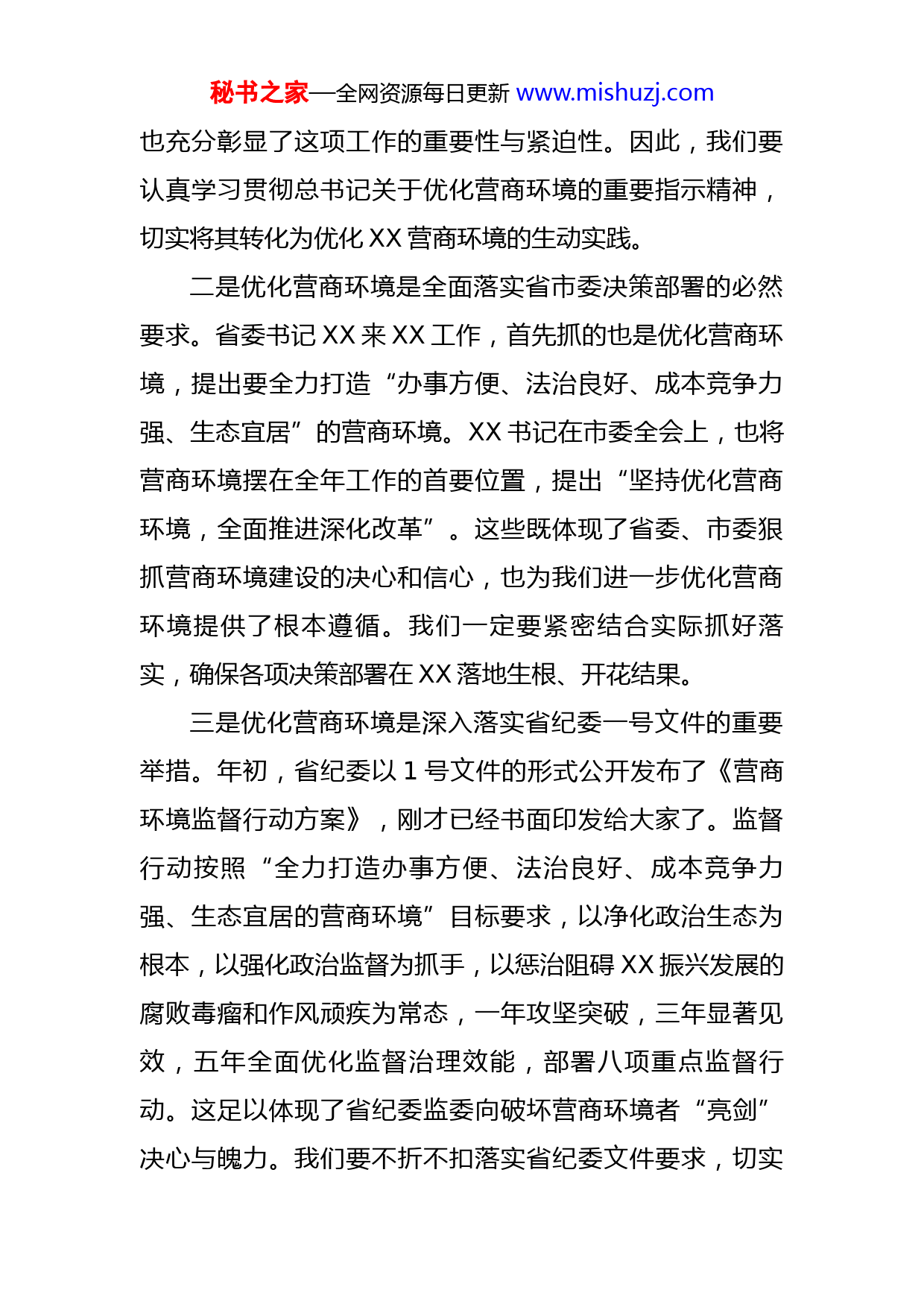 秘书之家—全网资源每日更新www.mishuzj.com在全区2022年营商环境建设暨重点项目启动动员大会上的讲话同志们:春节假期刚刚结束,市里召开营商环境建设暨重点项目启动动员大会后的第一时间,我们召开全区营商环境建设暨重点项目启动动员大会,目的就是要深入贯彻落实省、市会议精神,特别是全市营商环境建设暨重点项目启动动员大会精神,进一步统一思想,全力抓好全年营商环境建设等重点工作,全面完成省市下达的各项任务与指标。一、坚持把优化营商环境作为“一号工程”,厚植XX高质量发展的竞争优势第一,深刻认识抓好“一号工程”的重要意义一是优化营商环境是深入学习贯彻习近平总书记重要指示精神的政治担当。党的十八大以来,习近平总书记高度重视优化营商环境,作出一系列重要讲话和指示要求,深刻阐明了关于营商环境建设的一系列重大问题。特别是在XX考察时和在深入推进XX振兴座谈会上,提出了“六项重点工作”,第一项就是“以优化营商环境为基础,全面深化改革”。这充分体现了总书记对这项工作的重视与关心,充分说明了这项工作在振兴发展中的地位与作用,秘书之家—全网资源每日更新www.mishuzj.com也充分彰显了这项工作的重要性与紧迫性。因此,我们要认真学习贯彻总书记关于优化营商环境的重要指示精神,切实将其转化为优化XX营商环境的生动实践。二是优化营商环境是全面落实省市委决策部署的必然要求。省委书记XX来XX工作,首先抓的也是优化营商环境,提出要全力打造“办事方便、法治良好、成本竞争力强、生态宜居”的营商环境。XX书记在市委全会上,也将营商环境摆在全年工作的首要位置,提出“坚持优化营商环境,全面推进深化改革”。这些既体现了省委、市委狠抓营商环境建设的决心和信心,也为我们进一步优化营商环境提供了根本遵循。我们一定要紧密结合实际抓好落实,确保各项决策部署在XX落地生根、开花结果。三是优化营商环境是深入落实省纪委一号文件的重要举措。年初,省纪委以1号文件的形式公开发布了《营商环境监督行动方案》,刚才已经书面印发给大家了。监督行动按照“全力打造办事方便、法治良好、成本竞争力强、生态宜居的营商环境”目标要求,以净化政治生态为根本,以强化政治监督为抓手,以惩治阻碍XX振兴发展的腐败毒瘤和作风顽疾为常态,一年攻坚突破,三年显著见效,五年全面优化监督治理效能,部署八项重点监督行动。这足以体现了省纪委监委向破坏营商环境者“亮剑”决心与魄力。我们要不折不扣落实省纪委文件要求,切实秘书之家—全网资源每日更新www.mishuzj.com在思想上真重视、意识上真触动、行动上真落实,以人民群众和广大企业意见为导向,开展整改优化相关工作,实实在在解决人民群众和企业的堵点、痛点、难点问题。四是优化营商环境是做好营商专项巡察后半篇文章的具体行动。去年3月,市委第二巡察组对我区开展营商环境专项巡察工作,反馈X个方面XX个问题,我区后期细化为XX个问题。1月26日,市委巡察办针对我区营商环境建设整改不到位的问题,对我区进行约谈。这反应出我区在营商环境专项巡察整改工作中,还存在着思想认识不深刻、整改措施不实、工作作风不扎实等问题。我们要认真汲取教训,深刻检视反思,切实将巡视整改作为最大政治任务,牢固树立“整改不力是失职,不抓整改是渎职”的观念,全力做好巡视整改“后半篇文章”,确保整改工作落实落细落地。五是优化营商环境是实现XX高质量发展的根本保障。一个地方打造营商环境,最终目的是要聚企业聚人心。营商环境好,现有企业才能留得住、发展得好,外来企业才会想进来创业兴业,各个方面的积极性和创造性才能充分涌流。XX没有天赋异禀的资源,没有一枝独秀的产业,在高质量发展的新征程上,我们没有与其他地区竞争的明显优势。我们只有牢固树立“好的营商环境就是生产力、竞争力”的理念,强化“谁破坏营商环境,谁影响振兴发秘书之家—全网资源每日更新www.mishuzj.com展,谁就是与人民作对”的思想意识,打造具有明显比较优势的营商环境,才能吸引来更多的人才和企业,才能使XX在更大范围参与竞争、赢得竞争,才能实现高质量发展的目标。第二,深刻认识抓好“一号工程”的具体内容虽然我区营商环境正在不断改善和优化,但与其他先进地区相比,与改革目标任务相比,还有很大差距。在思想认识上,部分部门对营商环境重视程度还不够,对营商环境只是口头重视,没有将优化营商环境作为重大问题进行系统谋划研究,推进工作中缺乏斗争精神。在体制机制上,部分部门落实营商环境工作中分工不明、责任不清,没有形成合力。在作风建设上,部分干部还缺乏法治意识,不善于用法治思维、法治方法谋划和开展工作。因此,各部门、各单位必须从全局发展的高度出发,坚持目标导向,突出问题导向,强化结果导向,全面对标先进地区,学习先进经验,找差距、补短板、强弱项,全面推动营商环境建设实现更大提升。一要在行政服务效能上实现再提升。办事方便是衡量营商环境最直观标准,要持续深化“放管服”改革,承接落实好省、市政府下放的行政职权,做好事中、事后监管,确保行政职权接得住,接得好。要持续推进依申请政务服务事项集中办理,实现政务服务更快更优。要对标营秘书之家