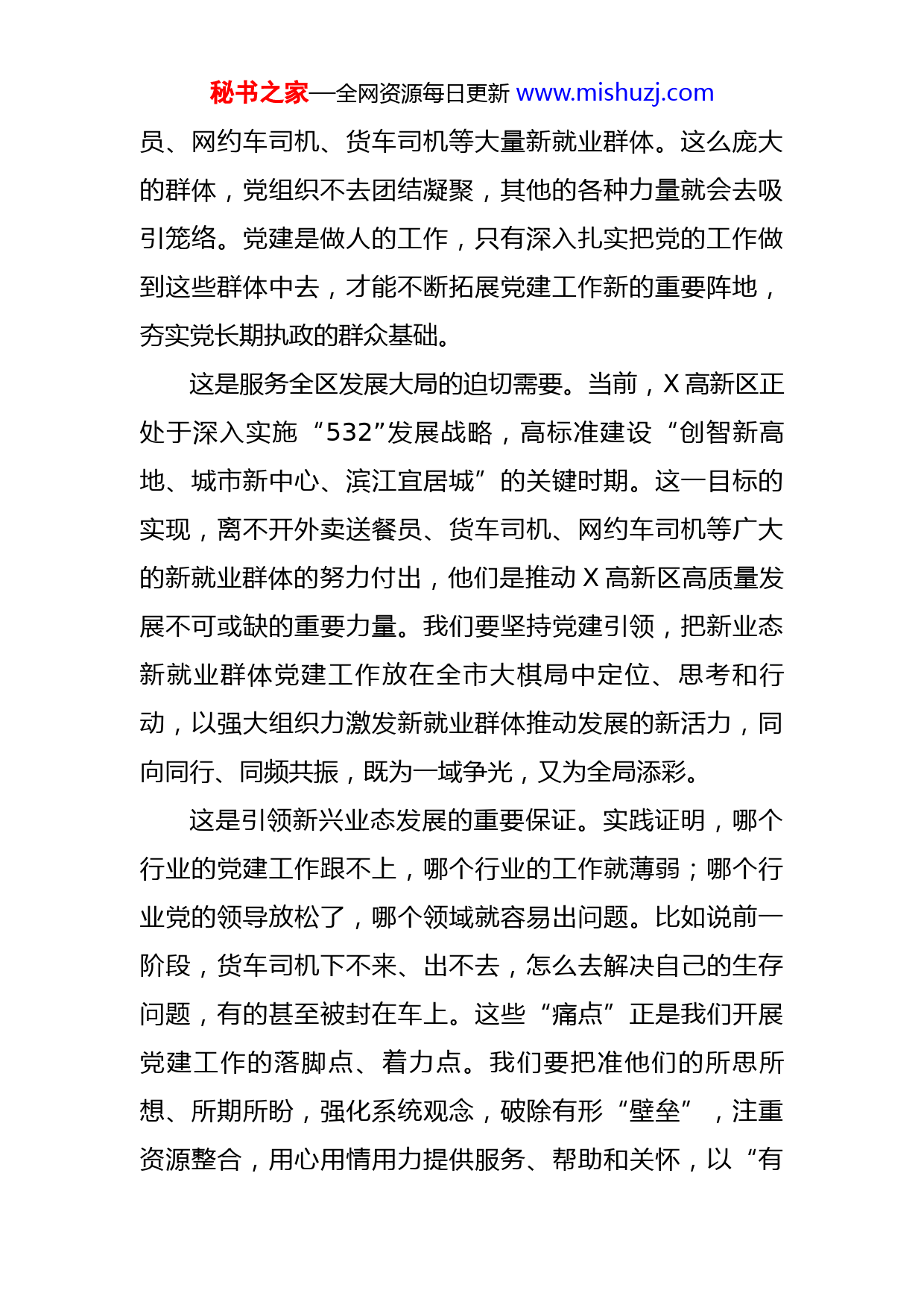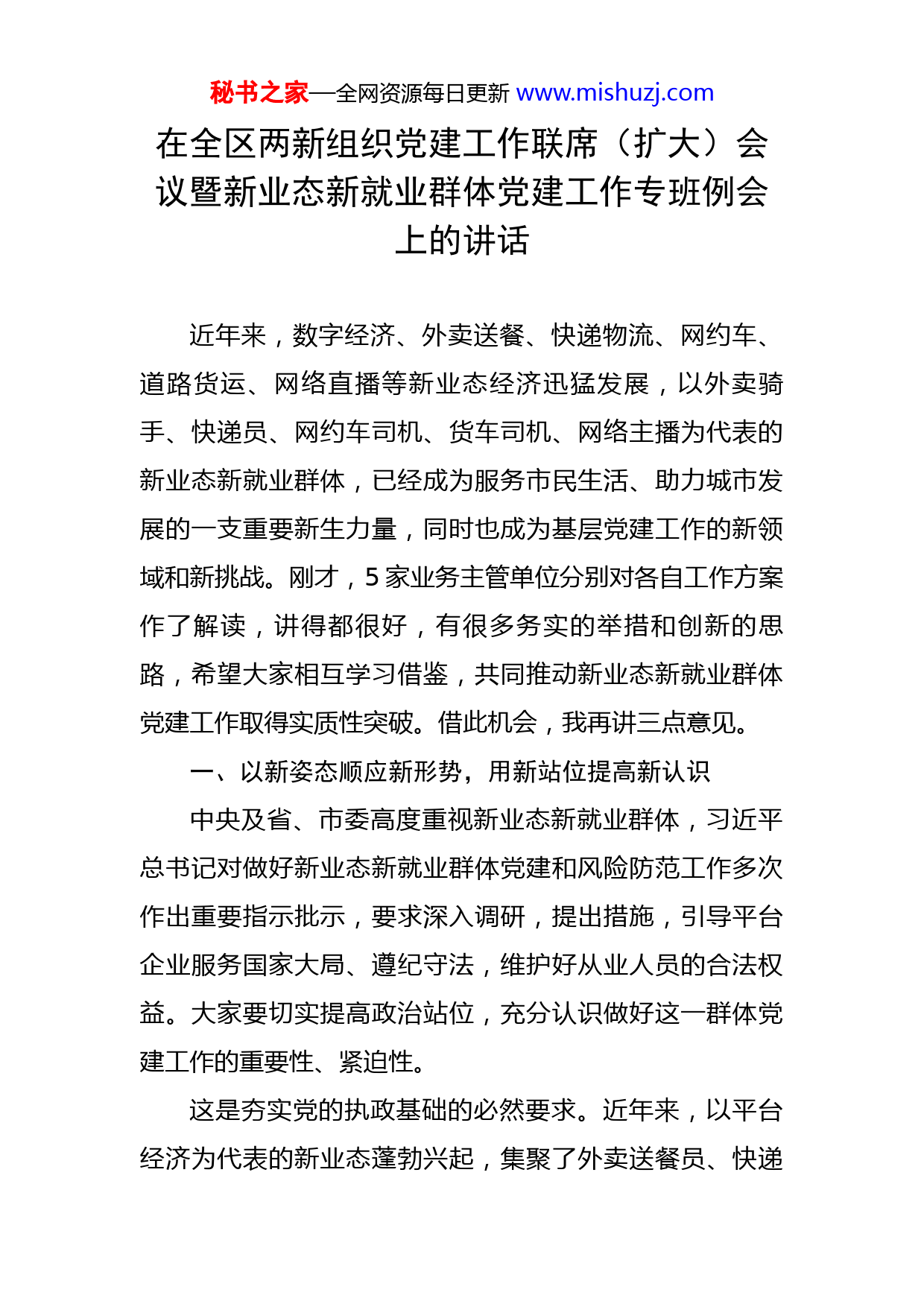 秘书之家—全网资源每日更新www.mishuzj.com在全区两新组织党建工作联席(扩大)会议暨新业态新就业群体党建工作专班例会上的讲话近年来,数字经济、外卖送餐、快递物流、网约车、道路货运、网络直播等新业态经济迅猛发展,以外卖骑手、快递员、网约车司机、货车司机、网络主播为代表的新业态新就业群体,已经成为服务市民生活、助力城市发展的一支重要新生力量,同时也成为基层党建工作的新领域和新挑战。刚才,5家业务主管单位分别对各自工作方案作了解读,讲得都很好,有很多务实的举措和创新的思路,希望大家相互学习借鉴,共同推动新业态新就业群体党建工作取得实质性突破。借此机会,我再讲三点意见。一、以新姿态顺应新形势,用新站位提高新认识中央及省、市委高度重视新业态新就业群体,习近平总书记对做好新业态新就业群体党建和风险防范工作多次作出重要指示批示,要求深入调研,提出措施,引导平台企业服务国家大局、遵纪守法,维护好从业人员的合法权益。大家要切实提高政治站位,充分认识做好这一群体党建工作的重要性、紧迫性。这是夯实党的执政基础的必然要求。近年来,以平台经济为代表的新业态蓬勃兴起,集聚了外卖送餐员、快递秘书之家—全网资源每日更新www.mishuzj.com员、网约车司机、货车司机等大量新就业群体。这么庞大的群体,党组织不去团结凝聚,其他的各种力量就会去吸引笼络。党建是做人的工作,只有深入扎实把党的工作做到这些群体中去,才能不断拓展党建工作新的重要阵地,夯实党长期执政的群众基础。这是服务全区发展大局的迫切需要。当前,X高新区正处于深入实施“532”发展战略,高标准建设“创智新高地、城市新中心、滨江宜居城”的关键时期。这一目标的实现,离不开外卖送餐员、货车司机、网约车司机等广大的新就业群体的努力付出,他们是推动X高新区高质量发展不可或缺的重要力量。我们要坚持党建引领,把新业态新就业群体党建工作放在全市大棋局中定位、思考和行动,以强大组织力激发新就业群体推动发展的新活力,同向同行、同频共振,既为一域争光,又为全局添彩。这是引领新兴业态发展的重要保证。实践证明,哪个行业的党建工作跟不上,哪个行业的工作就薄弱;哪个行业党的领导放松了,哪个领域就容易出问题。比如说前一阶段,货车司机下不来、出不去,怎么去解决自己的生存问题,有的甚至被封在车上。这些“痛点”正是我们开展党建工作的落脚点、着力点。我们要把准他们的所思所想、所期所盼,强化系统观念,破除有形“壁垒”,注重资源整合,用心用情用力提供服务、帮助和关怀,以“有秘书之家—全网资源每日更新www.mishuzj.com温度”的党建切切实实提升新就业群体的幸福感、获得感。二、以新思路寻找新路径,用新举措实现新覆盖新业态新就业群体党建工作,既是关乎新就业群体切身利益的战略命题,也是关乎党和人民事业接续发展的永恒课题,必须实打实、硬碰硬,来不得半点“虚功”。一是组织堡垒要“坚实”。成立新兴领域行业党组织已作为专项指标纳入今年度的党建考核。刚才,对全区五大行业党委进行了授牌,标志着六大新业态新就业群体行业党组织实现区级层面全覆盖,这是良好的开端。在此基础上,各行业主管部门要主动向上对接,全面摸清新就业群体党的基层组织建设情况,积极探索在规模较大企业或新就业群体集中的园区建立实体型党组织;众多较为分散的企业通过成立功能型党组织推进组织覆盖;没有党员的企业通过选派党建指导员,成立工会、妇联、团委等途径为党组织成立积极创造条件。二是工作力量要“厚实”。推进新业态新就业群体党务工作者“四级五专”专业化体系建设。选优配强党组织书记,综合运用公开选聘工作人员、上级党组织选派党建指导员和党员助企联络员等方式,实现“重点企业专人指导、初创企业有人联系、难点区域包干负责”。分层分类抓好新就业群体党务工作者培训,重点抓好党的二十大精秘书之家—全网资源每日更新www.mishuzj.com神学习贯彻,区级层面办好示范班,镇(街道)、行业主管部门开展全面培训。三是阵地建设要“务实”。去年,我们与市市场监管局在汉江路国际街区联合打造全市首家外卖送餐行业党委三井服务中心,取得了较好的示范效应。今年,我区将在中通X分公司、江南环球港商圈,相继建成全市快递行业和全市网络主播党群服务中心,这是非常好的契机。各行业主管部门也要会同各板块通过新建或整合现有资源的方式,推动全年20-30家“龙城红色驿站”、80-90家“龙城红色服务吧”建设目标任务的完成。同时,要优化提升服务功能,围绕实际需要,列出服务清单,提供学习、休息、饮水、充电、热饭等基础和应急服务。这里强调一下,推进“龙城红色驿站”建设,不求高大上,关键是实用,要整合现有资源,亮出服务项目,为新就业群体从业人员提供实实在在的服务项目。四是作用发挥要“扎实”。紧盯新就业群体的内在需求和实际困难,建立诉求收集办理机制,回应各类诉求,及时纾难解困,让新就业群体切实感受到党组织的温暖。针对新就业群体人员分布范围广、接触群众多、工作流动性强的特点,探索新就业群体参与社会治理、服务群众的有效途径。开展“支部亮旗帜、党员亮身份、车辆亮标