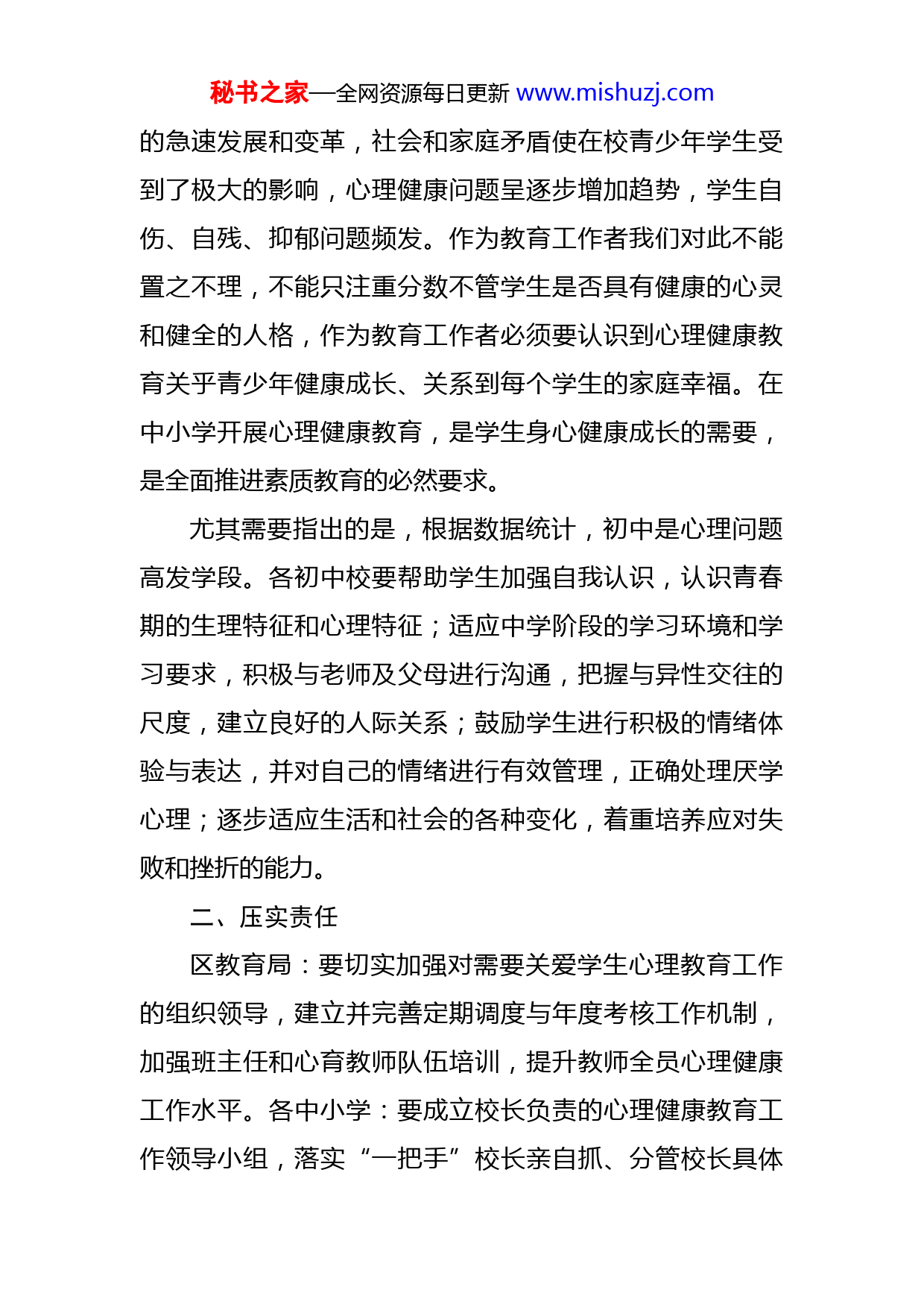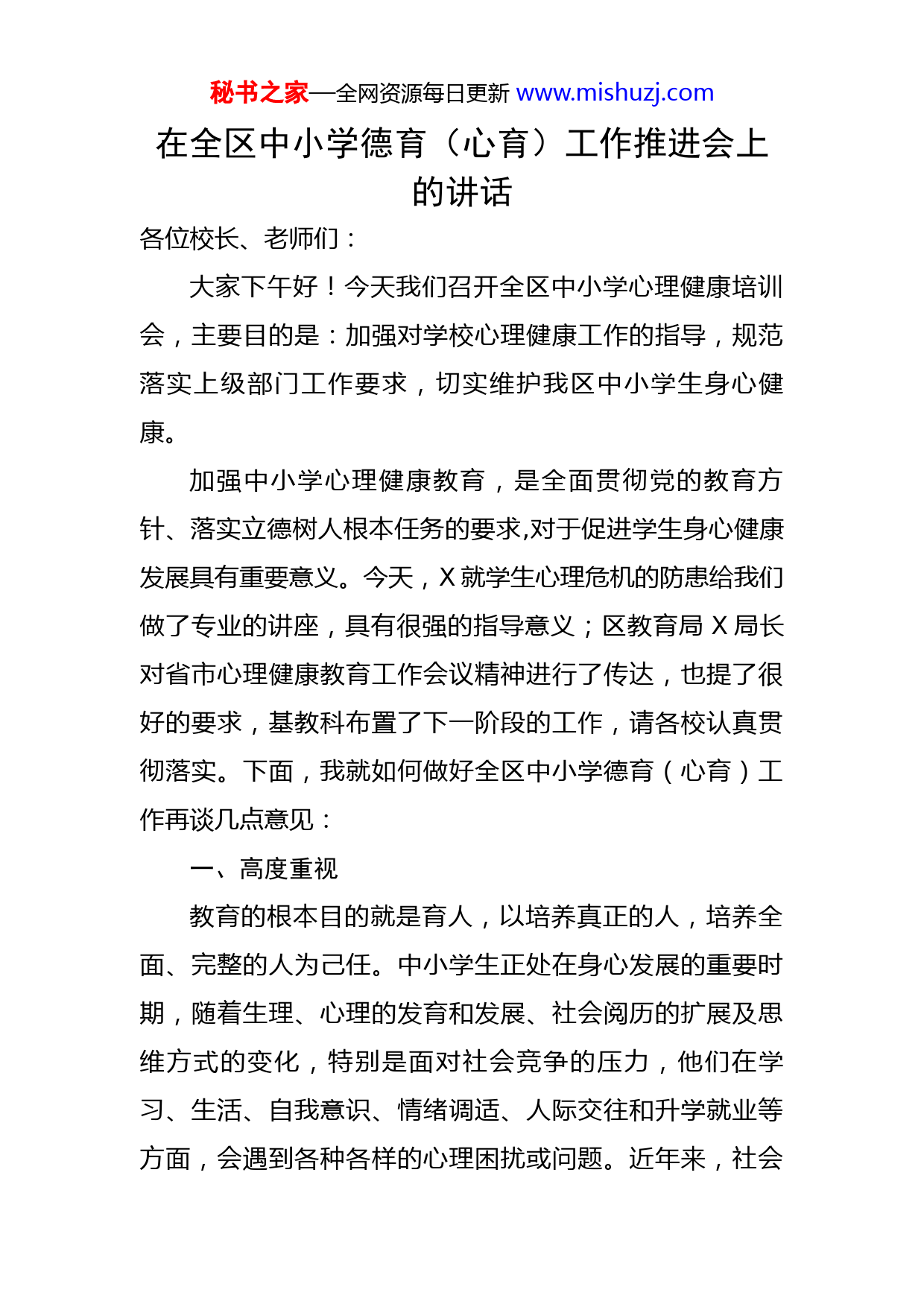 秘书之家—全网资源每日更新www.mishuzj.com在全区中小学德育(心育)工作推进会上的讲话各位校长、老师们:大家下午好!今天我们召开全区中小学心理健康培训会,主要目的是:加强对学校心理健康工作的指导,规范落实上级部门工作要求,切实维护我区中小学生身心健康。加强中小学心理健康教育,是全面贯彻党的教育方针、落实立德树人根本任务的要求,对于促进学生身心健康发展具有重要意义。今天,X就学生心理危机的防患给我们做了专业的讲座,具有很强的指导意义;区教育局X局长对省市心理健康教育工作会议精神进行了传达,也提了很好的要求,基教科布置了下一阶段的工作,请各校认真贯彻落实。下面,我就如何做好全区中小学德育(心育)工作再谈几点意见:一、高度重视教育的根本目的就是育人,以培养真正的人,培养全面、完整的人为己任。中小学生正处在身心发展的重要时期,随着生理、心理的发育和发展、社会阅历的扩展及思维方式的变化,特别是面对社会竞争的压力,他们在学习、生活、自我意识、情绪调适、人际交往和升学就业等方面,会遇到各种各样的心理困扰或问题。近年来,社会秘书之家—全网资源每日更新www.mishuzj.com的急速发展和变革,社会和家庭矛盾使在校青少年学生受到了极大的影响,心理健康问题呈逐步增加趋势,学生自伤、自残、抑郁问题频发。作为教育工作者我们对此不能置之不理,不能只注重分数不管学生是否具有健康的心灵和健全的人格,作为教育工作者必须要认识到心理健康教育关乎青少年健康成长、关系到每个学生的家庭幸福。在中小学开展心理健康教育,是学生身心健康成长的需要,是全面推进素质教育的必然要求。尤其需要指出的是,根据数据统计,初中是心理问题高发学段。各初中校要帮助学生加强自我认识,认识青春期的生理特征和心理特征;适应中学阶段的学习环境和学习要求,积极与老师及父母进行沟通,把握与异性交往的尺度,建立良好的人际关系;鼓励学生进行积极的情绪体验与表达,并对自己的情绪进行有效管理,正确处理厌学心理;逐步适应生活和社会的各种变化,着重培养应对失败和挫折的能力。二、压实责任区教育局:要切实加强对需要关爱学生心理教育工作的组织领导,建立并完善定期调度与年度考核工作机制,加强班主任和心育教师队伍培训,提升教师全员心理健康工作水平。各中小学:要成立校长负责的心理健康教育工作领导小组,落实“一把手”校长亲自抓、分管校长具体秘书之家—全网资源每日更新www.mishuzj.com抓、各层级狠抓落实的工作机制,一把手校长要亲自掌握特殊学生名单和关心关爱情况。学校要将心理健康教育作为落实立德树人的重点任务,纳入学校重要议事日程,严格按照两周一节的要求,认真落实心理健康教育课程,用好省编教材,做好校本化实施,建立学生心理健康档案,科学做好心理筛查工作,不漏一个学生。同时,要做好对特殊家庭学生的协同关爱,工作开展要有计划、有队伍、有制度、有活动记录,确保事有人干、责有人负、效有人问。三、遵循规律开展中小学心理健康教育,要以学生发展为根本,遵循学生身心发展规律。一是坚持科学性与实效性相结合。要根据学生身心发展的规律和特点及心理健康教育的规律,科学开展心理健康教育,注重心理健康教育的实践性与实效性,切实提高学生心理素质和心理健康水平。二是坚持发展、预防和危机干预相结合。要立足教育和发展,培养学生积极心理品质,挖掘他们的心理潜能,注重预防和解决发展过程中的心理行为问题,在应急和突发事件中及时进行危机干预。三是坚持面向全体学生和关注个别差异相结合。全体教师都要树立心理健康教育意识,尊重学生,平等对待学生,注重教育方式方法,关注个别差异,根据不同学生的特点和需要开展心理健康教育和辅导。三秘书之家—全网资源每日更新www.mishuzj.com是坚持教师的主导性与学生的主体性相结合。要在教师的教育指导下,充分发挥和调动学生的主体性,引导学生积极主动关注自身心理健康,培养学生自主自助维护自身心理健康的意识和能力。学校应将心理健康教育始终贯穿于教育教学全过程。全体教师都应自觉地在各学科教学中遵循心理健康教育的规律,将适合学生特点的心理健康教育内容有机渗透到日常教育教学活动中。要注重发挥教师人格魅力和为人师表的作用,建立起民主、平等、相互尊重的师生关系。要将心理健康教育与班主任工作、班团队活动、校园文体活动、社会实践活动等有机结合,充分利用网络等现代信息技术手段,多种途径开展心理健康教育。四、形成合力一是密切联系家长共同实施心理健康教育。要帮助家长树立正确的教育观念,了解和掌握孩子成长的特点、规律以及心理健康教育的方法,加强亲子沟通,注重自身良好心理素质的养成,以积极健康和谐的家庭环境影响孩子。同时,学校要为家长提供促进孩子发展的指导意见,协助他们共同解决孩子在发展过程中的心理行为问题。二是充分利用校外教育资源开展心理健康教育。要加强与基层群众性自治组织、企事业单位、社会团体、公共文化机构、街道社区以及青少年校外活动场所等的联系和秘书之家—全网资源每日更新www.mishuzj.com合作,组织开展各种有益于中小学生身心健康的文体娱乐活动和