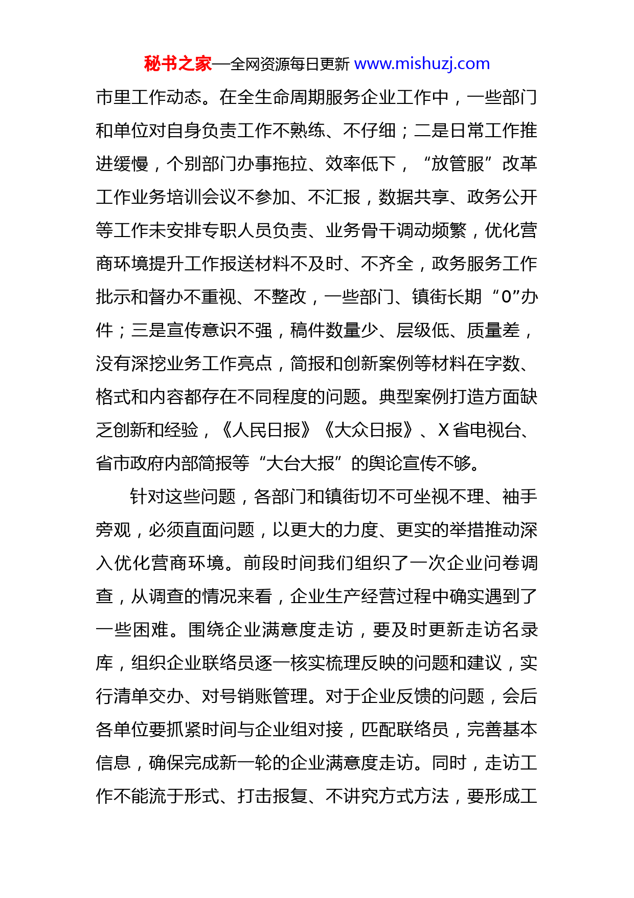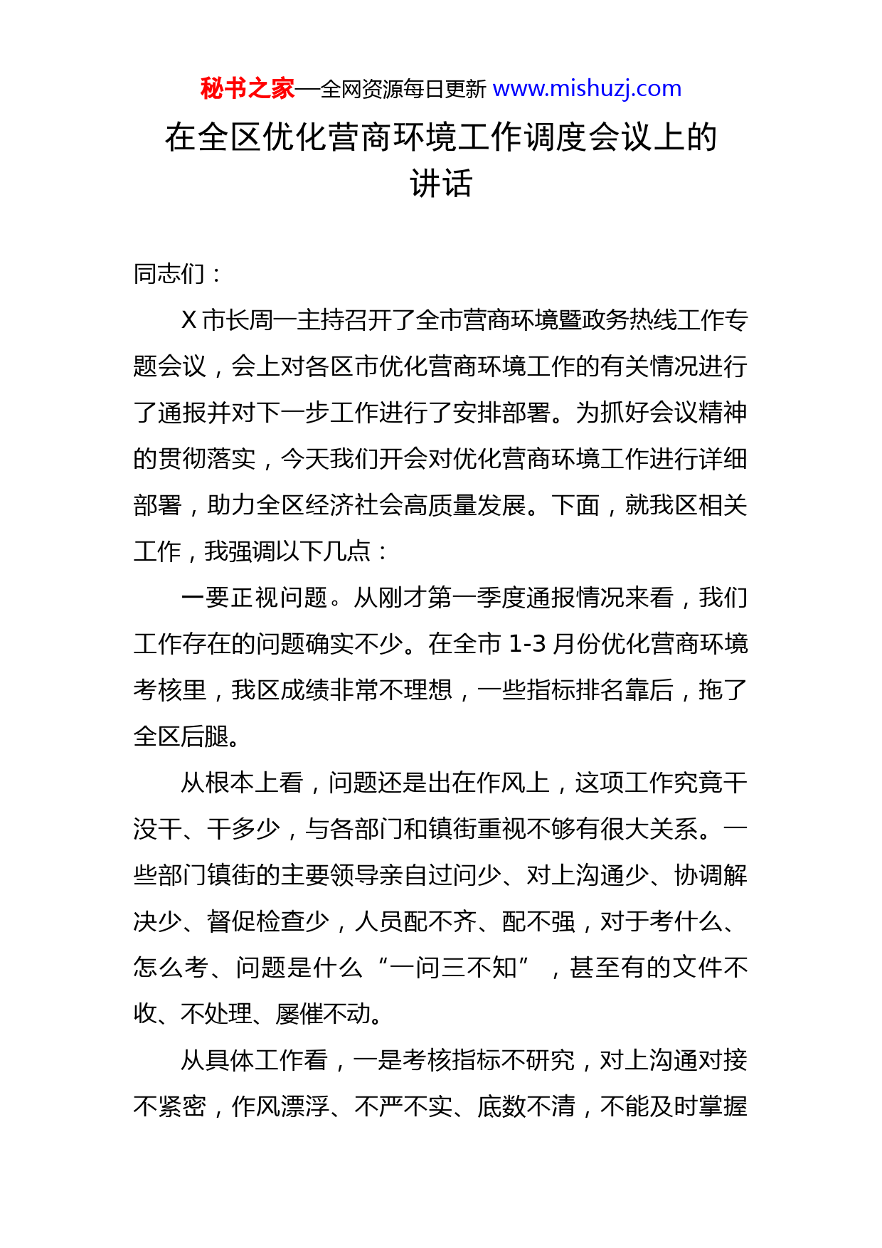秘书之家—全网资源每日更新www.mishuzj.com在全区优化营商环境工作调度会议上的讲话同志们:X市长周一主持召开了全市营商环境暨政务热线工作专题会议,会上对各区市优化营商环境工作的有关情况进行了通报并对下一步工作进行了安排部署。为抓好会议精神的贯彻落实,今天我们开会对优化营商环境工作进行详细部署,助力全区经济社会高质量发展。下面,就我区相关工作,我强调以下几点:一要正视问题。从刚才第一季度通报情况来看,我们工作存在的问题确实不少。在全市1-3月份优化营商环境考核里,我区成绩非常不理想,一些指标排名靠后,拖了全区后腿。从根本上看,问题还是出在作风上,这项工作究竟干没干、干多少,与各部门和镇街重视不够有很大关系。一些部门镇街的主要领导亲自过问少、对上沟通少、协调解决少、督促检查少,人员配不齐、配不强,对于考什么、怎么考、问题是什么“一问三不知”,甚至有的文件不收、不处理、屡催不动。从具体工作看,一是考核指标不研究,对上沟通对接不紧密,作风漂浮、不严不实、底数不清,不能及时掌握秘书之家—全网资源每日更新www.mishuzj.com市里工作动态。在全生命周期服务企业工作中,一些部门和单位对自身负责工作不熟练、不仔细;二是日常工作推进缓慢,个别部门办事拖拉、效率低下,“放管服”改革工作业务培训会议不参加、不汇报,数据共享、政务公开等工作未安排专职人员负责、业务骨干调动频繁,优化营商环境提升工作报送材料不及时、不齐全,政务服务工作批示和督办不重视、不整改,一些部门、镇街长期“0”办件;三是宣传意识不强,稿件数量少、层级低、质量差,没有深挖业务工作亮点,简报和创新案例等材料在字数、格式和内容都存在不同程度的问题。典型案例打造方面缺乏创新和经验,《人民日报》《大众日报》、X省电视台、省市政府内部简报等“大台大报”的舆论宣传不够。针对这些问题,各部门和镇街切不可坐视不理、袖手旁观,必须直面问题,以更大的力度、更实的举措推动深入优化营商环境。前段时间我们组织了一次企业问卷调查,从调查的情况来看,企业生产经营过程中确实遇到了一些困难。围绕企业满意度走访,要及时更新走访名录库,组织企业联络员逐一核实梳理反映的问题和建议,实行清单交办、对号销账管理。对于企业反馈的问题,会后各单位要抓紧时间与企业组对接,匹配联络员,完善基本信息,确保完成新一轮的企业满意度走访。同时,走访工作不能流于形式、打击报复、不讲究方式方法,要形成工秘书之家—全网资源每日更新www.mishuzj.com作闭环,安排有责任心、有担当的工作人员担任企业联络员,做到“带着问题去,带回问题来、带着满意走”,充分获得企业的理解和支持,提升企业满意度,保证走访覆盖率和满意率达到100%。围绕12345“政企通”企业服务专线反映问题,12345政务热线运行中心要牵头做好工单解决工作,及时交办疑难问题工单,各镇街和部门要安排专人负责,落脚于问题解决,杜绝推诿扯皮、超期回复。围绕全生命周期服务企业,行政审批局要第一时间录入推送给各牵头服务部门,必须做到24小时内联系企业、平台填报及时准确规范,12345政务热线运行中心一定要做好问题解答和全程跟踪工作,及时发现部门平台填报问题。围绕数据赋能,大数据服务中心要组织好各部门将相关数据及时汇总上传至平台,保证上传数据总量及调用量;行政审批局要对标全市政务服务事项网办率,着力提升我区网办率和办件量。围绕宣传工作,今年市里把国家、省级信息简报刊发情况作为单独指标分别列入各区市每月营商环境调度统计和年度营商环境考核中,要求在上、下半年各至少刊发1篇国家级或省级信息简报。各单位一定要高度重视,全面挖掘、总结、提炼经验做法和亮点工作,制定宣传计划,强化组织协调,深入一线、点面结合,把刊发数量增上去,质量提起来,创新案例活起来。秘书之家—全网资源每日更新www.mishuzj.com二要严抓落实。针对今年的考核任务,今天下发的《X市X区优化营商环境工作实施方案》,逐一明确了十个大指标的责任部门职责和工作要求,已经发给了各有关部门征求意见。没有采纳意见的部门也不能停滞工作,要按照区政府工作安排先干再说,做到“宁可向前一步形成交叉,不可退后一步形成空白”。三要创新思路。4月9日,市里印发了《全国首批营商环境创新试点城市思路措施摘编》,内容涉及6个城市、11项重点任务,市委、区委主要领导都作出了重要批示。前期,市里组织各县市区提报“互联网+监管”工作亮点,我们X提报的亮点没有一个被市里采纳。结合后期市里下发的清单,“海洋智慧监管平台”“智慧税务”“环保智慧监管”等事项我们区绝大部分都有条件能够开展,甚至有些工作已经开展了但因为没有及时总结,导致我们能拿到手的分数没有拿到。今天在这里做个强调,所有指标牵头部门和单位要对措施摘编进行认领揭榜,对照周一市里通报对标北京、上海的差距和不足,结合我区实际打造本领域营商环境创新试点,这个月要制定务实高效、职责清晰、节点明确的工作措施,职能办要针对揭榜认领事项做好定期调度,确保各项任务落地生效。四要压实责任。对于今天被点到的部门,主要领导必须要亲自调度、立即整改,按照“保五争三奔第