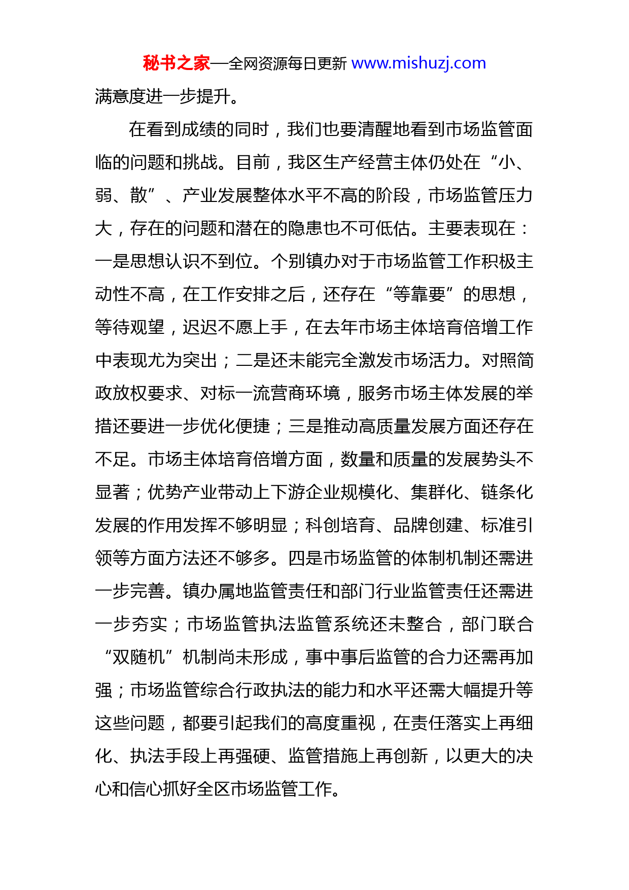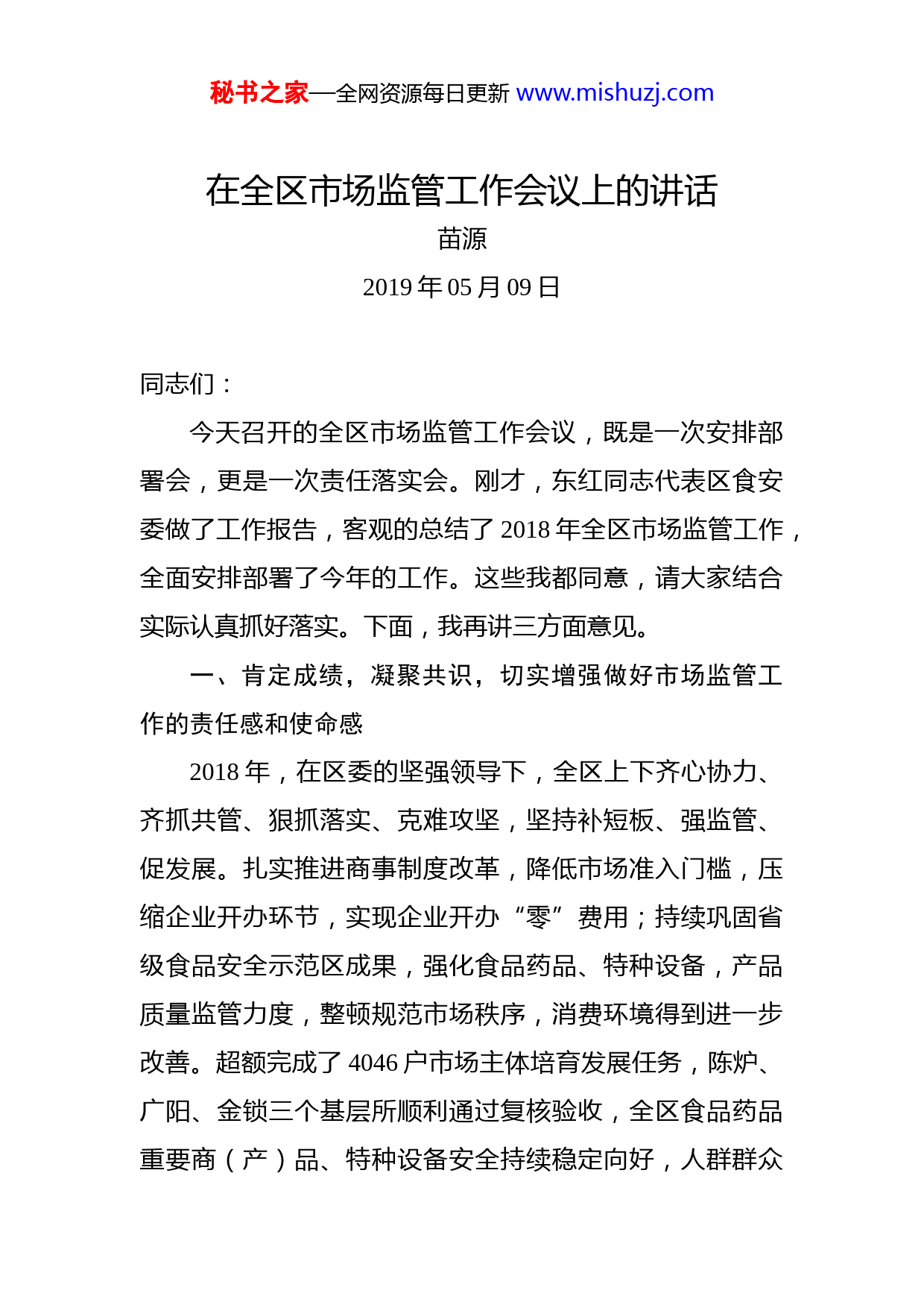 秘书之家—全网资源每日更新www.mishuzj.com在全区市场监管工作会议上的讲话苗源2019年05月09日同志们:今天召开的全区市场监管工作会议,既是一次安排部署会,更是一次责任落实会。刚才,东红同志代表区食安委做了工作报告,客观的总结了2018年全区市场监管工作,全面安排部署了今年的工作。这些我都同意,请大家结合实际认真抓好落实。下面,我再讲三方面意见。一、肯定成绩,凝聚共识,切实增强做好市场监管工作的责任感和使命感2018年,在区委的坚强领导下,全区上下齐心协力、齐抓共管、狠抓落实、克难攻坚,坚持补短板、强监管、促发展。扎实推进商事制度改革,降低市场准入门槛,压缩企业开办环节,实现企业开办“零”费用;持续巩固省级食品安全示范区成果,强化食品药品、特种设备,产品质量监管力度,整顿规范市场秩序,消费环境得到进一步改善。超额完成了4046户市场主体培育发展任务,陈炉、广阳、金锁三个基层所顺利通过复核验收,全区食品药品重要商(产)品、特种设备安全持续稳定向好,人群群众秘书之家—全网资源每日更新www.mishuzj.com满意度进一步提升。在看到成绩的同时,我们也要清醒地看到市场监管面临的问题和挑战。目前,我区生产经营主体仍处在“小、弱、散”、产业发展整体水平不高的阶段,市场监管压力大,存在的问题和潜在的隐患也不可低估。主要表现在:一是思想认识不到位。个别镇办对于市场监管工作积极主动性不高,在工作安排之后,还存在“等靠要”的思想,等待观望,迟迟不愿上手,在去年市场主体培育倍增工作中表现尤为突出;二是还未能完全激发市场活力。对照简政放权要求、对标一流营商环境,服务市场主体发展的举措还要进一步优化便捷;三是推动高质量发展方面还存在不足。市场主体培育倍增方面,数量和质量的发展势头不显著;优势产业带动上下游企业规模化、集群化、链条化发展的作用发挥不够明显;科创培育、品牌创建、标准引领等方面方法还不够多。四是市场监管的体制机制还需进一步完善。镇办属地监管责任和部门行业监管责任还需进一步夯实;市场监管执法监管系统还未整合,部门联合“双随机”机制尚未形成,事中事后监管的合力还需再加强;市场监管综合行政执法的能力和水平还需大幅提升等这些问题,都要引起我们的高度重视,在责任落实上再细化、执法手段上再强硬、监管措施上再创新,以更大的决心和信心抓好全区市场监管工作。秘书之家—全网资源每日更新www.mishuzj.com二、围绕中心,服务大局,突出抓好“四项重点”任务当前,我区正处于追赶超越转型发展的关键时期,要正确处理监管与服务的关系,扎实落实区委区政府的决策部署,服务大局,全力做好以下几点:一是强力推进质量强区战略。习近平总书记提出“下最大气力抓全面提高质量,开展质量提升行动”。各镇(街道)、各部门要把质量提升行动作为工作主线和重点任务,贯穿于经济发展的全过程,围绕全区追赶超越转型发展这个大局和目标,以质量效益为中心、以质量创新为动力、以质量惠民为取向,全力夯实质量工作基础,持续加强质量安全监管,按照“人无我有、人有我优、人优我强”的思路,进一步加大标准、计量、检验检测、认证认可四大质量基础设施建设力度,倡导鼓励企业开展自愿性认证,提升我区认证认可工作的质量和水平。围绕我区优势产业和特色产业,加快推进先进标准的建设步伐,尤其是在全域旅游、农产品、餐饮等行业要推进流程化管理、标准化生产。围绕印台苹果、周陵樱桃、中草药种植产业等重点产品和特色产业抓品牌建设,增强名牌产品辐射带动效应。二是着力提升优化营商环境。扎实推进商事制度改革,落实“放管服”重点改革任务,进一步放宽市场准入,除秘书之家—全网资源每日更新www.mishuzj.com国务院明确保留的前置审批外,一律实行“先照后证”,不得以任何理由设置准入门槛。按照“能简则简、能并则并、能快则快”的原则,研究探索如何进一步简化企业开办、注销程序,深化“多证合一、一照一码”改革,方便企业主体准入准营,大幅压减企业开办时间,完善市场退出机制,最大限度利企便民。要把规范市场秩序、改善市场环境作为供给侧改革的重要举措。严厉打击假冒伪劣,为优势企业发展腾出空间,形成僵尸企业退出市场机制,促进企业优胜劣汰,促进产业转型升级。三是下大力气发展市场主体。去年,我区圆满完成了市场主体培育倍增任务,这是各镇(街道)、各部门共同努力的结果。今年,要继续开展市场主体倍增计划,全区增加市场主体5100户,各镇(街道)、各部门只能比去年做的更好,要在发展企业上下功夫,提高企业的占比,尤其是知识产权密集型产业(企业)的培育,充分发挥各项政策的带动作用,加快推动知识产权转化为企业市场竞争力,从而在知识产权密集型产业(企业)培育上有大的突破,在发展数量的同时,一定要提升市场主体的质量。各行业部门要充分发挥行业管理职能,最大限度地将所管理行业的市场主体纳入发展计划,实现最大增量;各镇(街道)是市场主体发展的主力军,主要领导要亲自抓,拿出工作措施,夯实工作责任,落实工作任务,要最大限度地秘书之家—全网资源每日更新www.mishuzj.com调动本区域内所有资源,做到能发展尽发展,确保本区域内市场主体发展任务落到实处;区