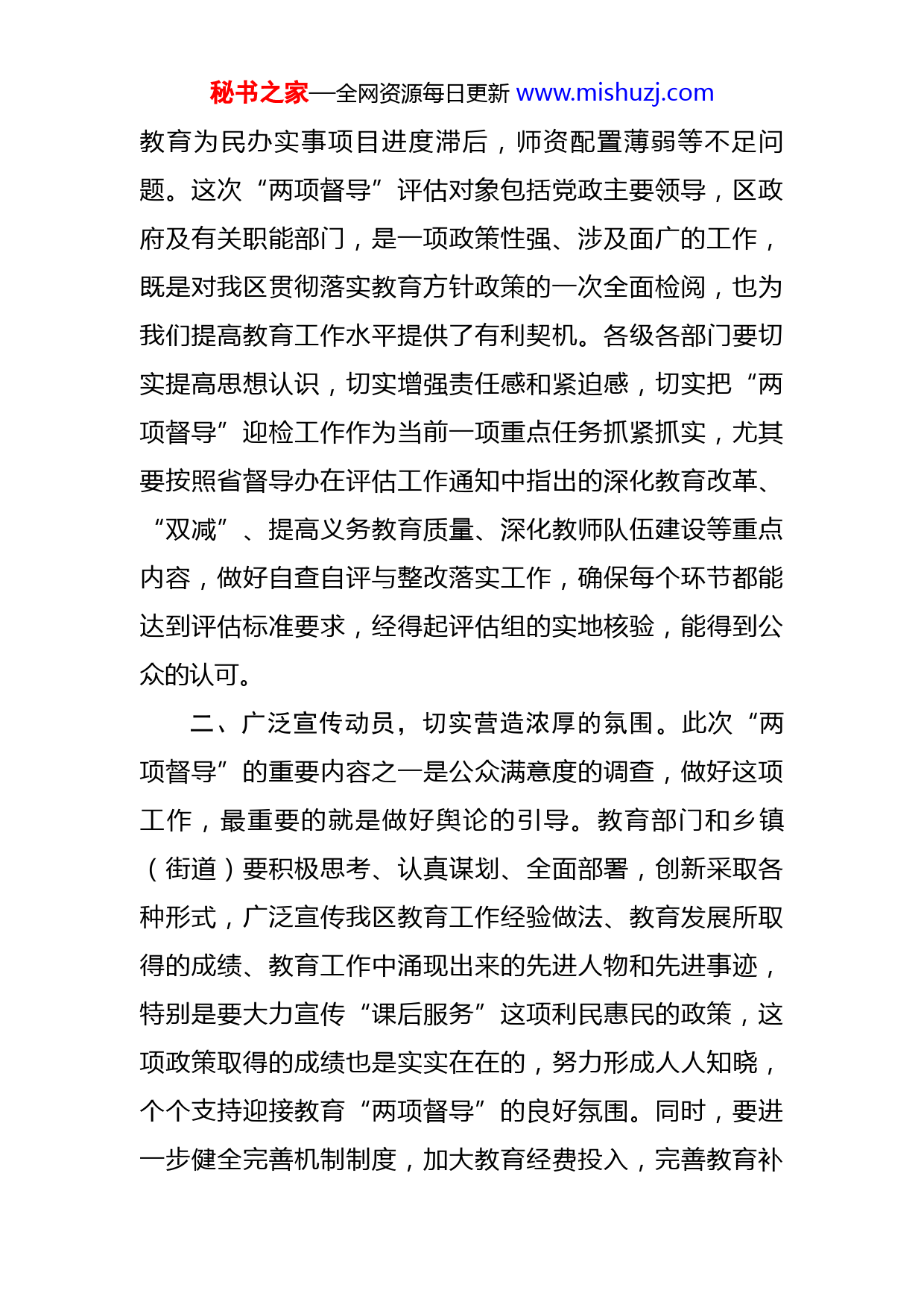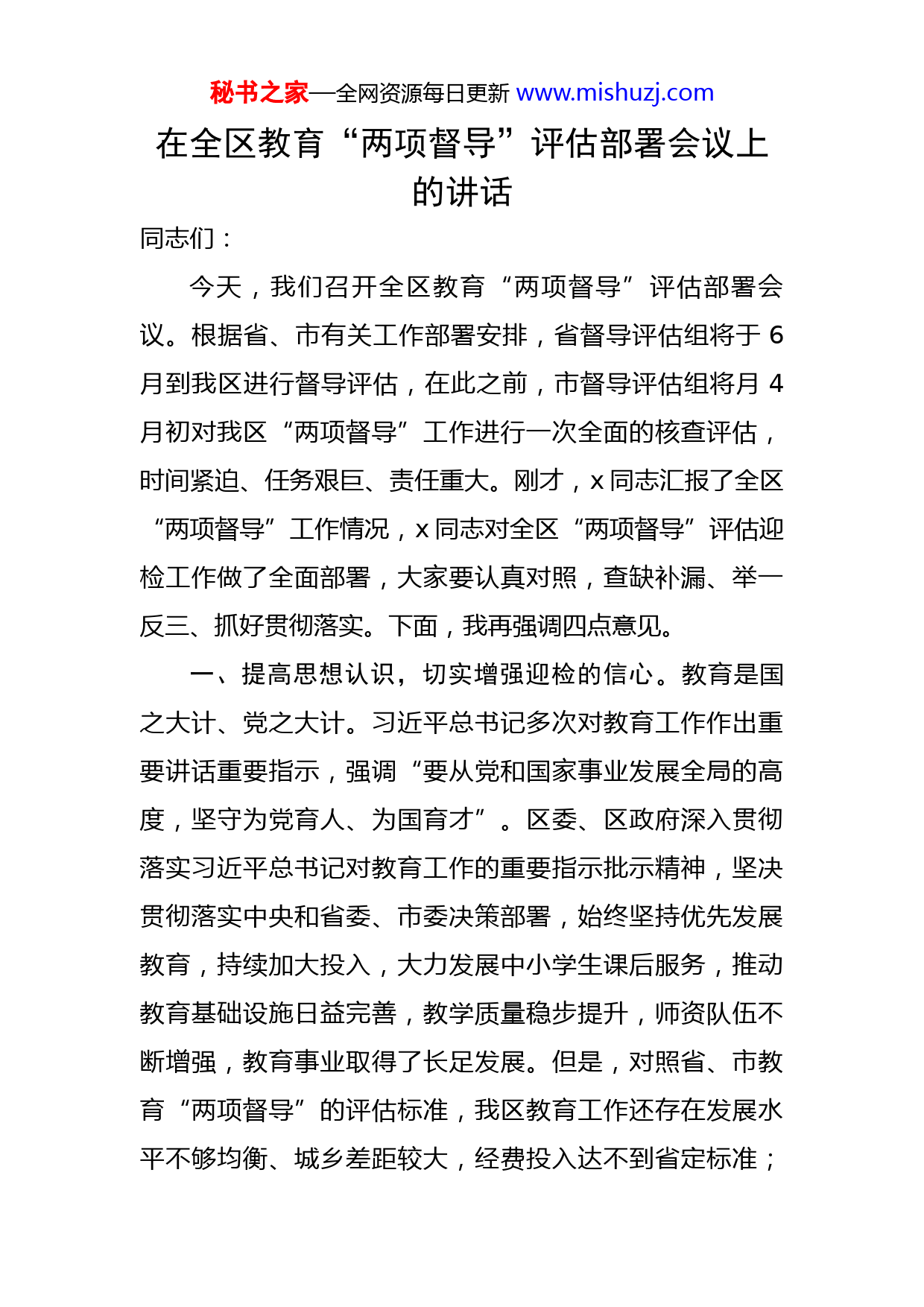 秘书之家—全网资源每日更新www.mishuzj.com在全区教育“两项督导”评估部署会议上的讲话同志们:今天,我们召开全区教育“两项督导”评估部署会议。根据省、市有关工作部署安排,省督导评估组将于6月到我区进行督导评估,在此之前,市督导评估组将月4月初对我区“两项督导”工作进行一次全面的核查评估,时间紧迫、任务艰巨、责任重大。刚才,x同志汇报了全区“两项督导”工作情况,x同志对全区“两项督导”评估迎检工作做了全面部署,大家要认真对照,查缺补漏、举一反三、抓好贯彻落实。下面,我再强调四点意见。一、提高思想认识,切实增强迎检的信心。教育是国之大计、党之大计。习近平总书记多次对教育工作作出重要讲话重要指示,强调“要从党和国家事业发展全局的高度,坚守为党育人、为国育才”。区委、区政府深入贯彻落实习近平总书记对教育工作的重要指示批示精神,坚决贯彻落实中央和省委、市委决策部署,始终坚持优先发展教育,持续加大投入,大力发展中小学生课后服务,推动教育基础设施日益完善,教学质量稳步提升,师资队伍不断增强,教育事业取得了长足发展。但是,对照省、市教育“两项督导”的评估标准,我区教育工作还存在发展水平不够均衡、城乡差距较大,经费投入达不到省定标准;秘书之家—全网资源每日更新www.mishuzj.com教育为民办实事项目进度滞后,师资配置薄弱等不足问题。这次“两项督导”评估对象包括党政主要领导,区政府及有关职能部门,是一项政策性强、涉及面广的工作,既是对我区贯彻落实教育方针政策的一次全面检阅,也为我们提高教育工作水平提供了有利契机。各级各部门要切实提高思想认识,切实增强责任感和紧迫感,切实把“两项督导”迎检工作作为当前一项重点任务抓紧抓实,尤其要按照省督导办在评估工作通知中指出的深化教育改革、“双减”、提高义务教育质量、深化教师队伍建设等重点内容,做好自查自评与整改落实工作,确保每个环节都能达到评估标准要求,经得起评估组的实地核验,能得到公众的认可。二、广泛宣传动员,切实营造浓厚的氛围。此次“两项督导”的重要内容之一是公众满意度的调查,做好这项工作,最重要的就是做好舆论的引导。教育部门和乡镇(街道)要积极思考、认真谋划、全面部署,创新采取各种形式,广泛宣传我区教育工作经验做法、教育发展所取得的成绩、教育工作中涌现出来的先进人物和先进事迹,特别是要大力宣传“课后服务”这项利民惠民的政策,这项政策取得的成绩也是实实在在的,努力形成人人知晓,个个支持迎接教育“两项督导”的良好氛围。同时,要进一步健全完善机制制度,加大教育经费投入,完善教育补秘书之家—全网资源每日更新www.mishuzj.com短板项目,不断加强家长与学校、社会与学校的合作,加大教育领域信访矛盾问题化解力度,以更加规范的学校管理和更加良好的师德师风争取社会各界更大支持,进一步营造尊师重教的氛围。三、狠抓措施落实,切实落实迎检的责任。“两项督导”是对区委、区政府教育实绩的评价,做好这项工作,不单单是教育部门一家的事,而是需要全区上下的共同努力。区教育局、教育督导室要担起牵头抓总责任,全面梳理总结,制定好“两份方案”,加强对各乡镇(街道)、各部门和各学校工作进展情况和职责落实情况的督查指导,对工作不力、进展缓慢的要及时通报、限期整改,确保工作不拖拉、任务不欠账。各相关单位要坚决克服松懈麻痹、盲目乐观和侥幸心理,认真对照《评估细则》和《评估标准》,细致检查各项指标完成情况,对薄弱环节和存在问题,落实全面自查整改。同时,各职能部门,尤其是财政、文旅、公安、市管、交通等部门要切实充分发挥职能,做好工作经费保障、校园周边环境和社会治安环境治理等工作,为“两项督导”工作提供必要支持。四、加强组织领导,切实办好满意的教育。教育工作功在当代、利在千秋。区委、区政府将一如既往地重视、支持教育,始终坚持经济社会发展规划优先安排教育发展、财政资金优先安排教育投入、公共资源优先满足教育秘书之家—全网资源每日更新www.mishuzj.com需要,加强农村教师定向培养和精准培训,深入实施乡村教师支持计划,真正形成共同推动教育发展的强大合力,切实办好人民群众满意的教育。区处级领导干部要带头落实好挂钩联系学校制度,经常深入学校调研指导,结合深化拓展党史学习教育“我为群众办实事”实践活动,每年争取为学校办好1-2件实事。同时,要慎终如始做好疫情防控工作,现在大中小学已全面开学,做好疫情防控工作仍然是教育教学的一项重点任务,各级各部门要做好学校常态化疫情防控,紧绷防疫这根弦,保障师生健康安全。总之,全区各级各部门要立即行动起来,以高度的责任感、求真务实的工作态度、严谨务实的工作作风,切实做好迎检充分准备,确保“两项督导”顺利通过验收。