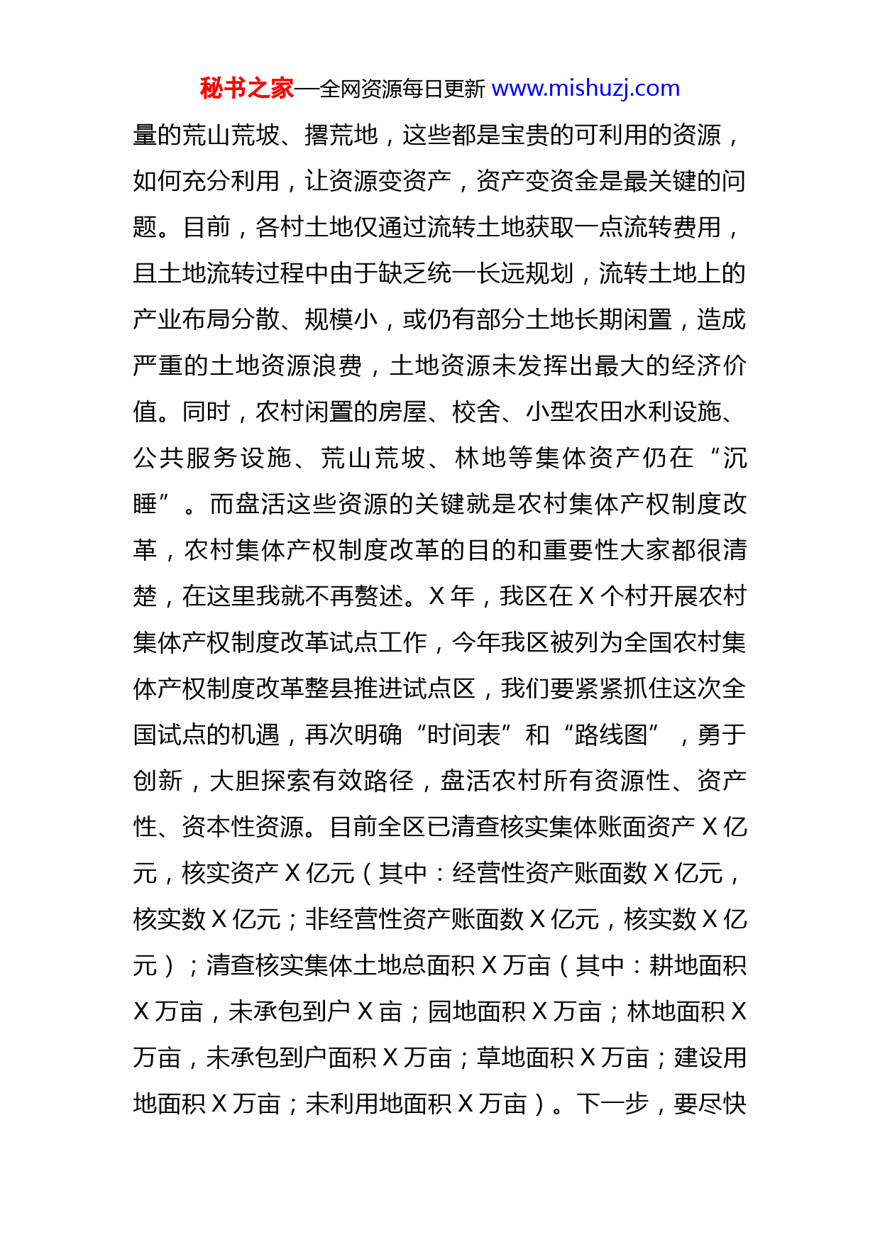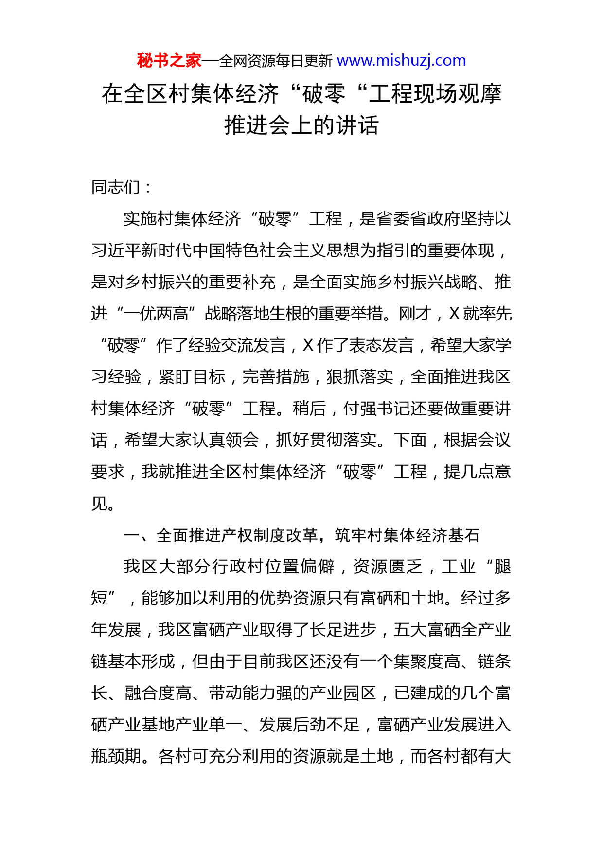 秘书之家—全网资源每日更新www.mishuzj.com在全区村集体经济“破零“工程现场观摩推进会上的讲话同志们:实施村集体经济“破零”工程,是省委省政府坚持以习近平新时代中国特色社会主义思想为指引的重要体现,是对乡村振兴的重要补充,是全面实施乡村振兴战略、推进“一优两高”战略落地生根的重要举措。刚才,X就率先“破零”作了经验交流发言,X作了表态发言,希望大家学习经验,紧盯目标,完善措施,狠抓落实,全面推进我区村集体经济“破零”工程。稍后,付强书记还要做重要讲话,希望大家认真领会,抓好贯彻落实。下面,根据会议要求,我就推进全区村集体经济“破零”工程,提几点意见。一、全面推进产权制度改革,筑牢村集体经济基石我区大部分行政村位置偏僻,资源匮乏,工业“腿短”,能够加以利用的优势资源只有富硒和土地。经过多年发展,我区富硒产业取得了长足进步,五大富硒全产业链基本形成,但由于目前我区还没有一个集聚度高、链条长、融合度高、带动能力强的产业园区,已建成的几个富硒产业基地产业单一、发展后劲不足,富硒产业发展进入瓶颈期。各村可充分利用的资源就是土地,而各村都有大秘书之家—全网资源每日更新www.mishuzj.com量的荒山荒坡、撂荒地,这些都是宝贵的可利用的资源,如何充分利用,让资源变资产,资产变资金是最关键的问题。目前,各村土地仅通过流转土地获取一点流转费用,且土地流转过程中由于缺乏统一长远规划,流转土地上的产业布局分散、规模小,或仍有部分土地长期闲置,造成严重的土地资源浪费,土地资源未发挥出最大的经济价值。同时,农村闲置的房屋、校舍、小型农田水利设施、公共服务设施、荒山荒坡、林地等集体资产仍在“沉睡”。而盘活这些资源的关键就是农村集体产权制度改革,农村集体产权制度改革的目的和重要性大家都很清楚,在这里我就不再赘述。X年,我区在X个村开展农村集体产权制度改革试点工作,今年我区被列为全国农村集体产权制度改革整县推进试点区,我们要紧紧抓住这次全国试点的机遇,再次明确“时间表”和“路线图”,勇于创新,大胆探索有效路径,盘活农村所有资源性、资产性、资本性资源。目前全区已清查核实集体账面资产X亿元,核实资产X亿元(其中:经营性资产账面数X亿元,核实数X亿元;非经营性资产账面数X亿元,核实数X亿元);清查核实集体土地总面积X万亩(其中:耕地面积X万亩,未承包到户X亩;园地面积X万亩;林地面积X万亩,未承包到户面积X万亩;草地面积X万亩;建设用地面积X万亩;未利用地面积X万亩)。下一步,要尽快秘书之家—全网资源每日更新www.mishuzj.com盘活并利用这些资源,抓紧时间完成成员身份界定和折股量化工作,成立村集体经济合作组织,完善“农户+集体经济合作组织”模式,建立利益联结机制,将村集体和农户有效地“统起来”,实现利益共享,共同增收。要抢抓农村改革政策机遇,按照“公司+合作社+农户”“公司+集体经济组织+农户”产业扶贫模式,以村集体经济合作组织为媒介,将集体所有的可利用资产、资源入股到经营主体,协商好股比和分红模式,在保证企业效益的同时,以让利分红的形式,不断增加村集体经济收入。二、持续加大政策扶持力度,提升村集体经济活力我区大部分行政村资金短缺、产业基础薄弱,短板依然突出,在发展村集体经济时往往心有余而力不足。各相关单位要积极向上争取国家各项惠农政策和资金,在农畜产品加工、种养殖等财政支持专项资金安排使用上优先考虑村级集体企业。要加强部门之间沟通协调,进一步加大资金整合力度,在不同渠道、不同部门的资金分配时,尽可能与村集体经济发展项目挂钩,充分发挥财政资金的集聚效应和杠杆作用,带动更多社会资本进入农村,集中资金办大事,推动村集体经济茁壮成长。要全力确保各级财政对村级的专项投入及时足额拨付到位,支持村集体经济发展。区财政、农业农村、水务、自然资源、扶贫等部门安排下达的涉农资金项目完成后形成的资产,要量化为村秘书之家—全网资源每日更新www.mishuzj.com集体或村集体经济组织的资产,选择合适的经营主体经营管理,以保障经营的稳定性和连续性。对于适宜就地发展精深加工、旅游等产业的村,各相关部门要安排留用一定比例的土地用于发展村集体经济,同时利用各村闲置的教育教学点资源,用于发展农副产品小加工、小作坊等产业,增加村集体经济收入,切实解决建设用地审批难等实际困难。要鼓励驻区各涉农金融机构针对村集体有效开展土地承包经营权、林权、村集体资产、农业生产设施等抵押贷款,积极推进农村承包土地经营权和农民住房财产权抵押贷款。结合农村信用体系创建工作,引导和鼓励涉农金融机构对符合条件的村级集体经济发展项目和信用户增加授信额度,给予利率优惠。三、突出村庄特色产业优势,丰富村集体经济内涵产业兴则集体经济兴,产业活则集体经济活。只有产业发展起来,村级集体经济才有生命力、才能可持久。各村要立足村情,坚持因村制宜、一村一策、一村一业,防止村集体经济同质化、单一化。要以市场为导向,以效益为中心,结合乡村振兴巩固提升工作,充分发挥平安的区位优势、富硒资源优势和丰富的文化旅游资源优势,做大做强特色鲜明的主导产业。目前,我区村集体经济中入股平