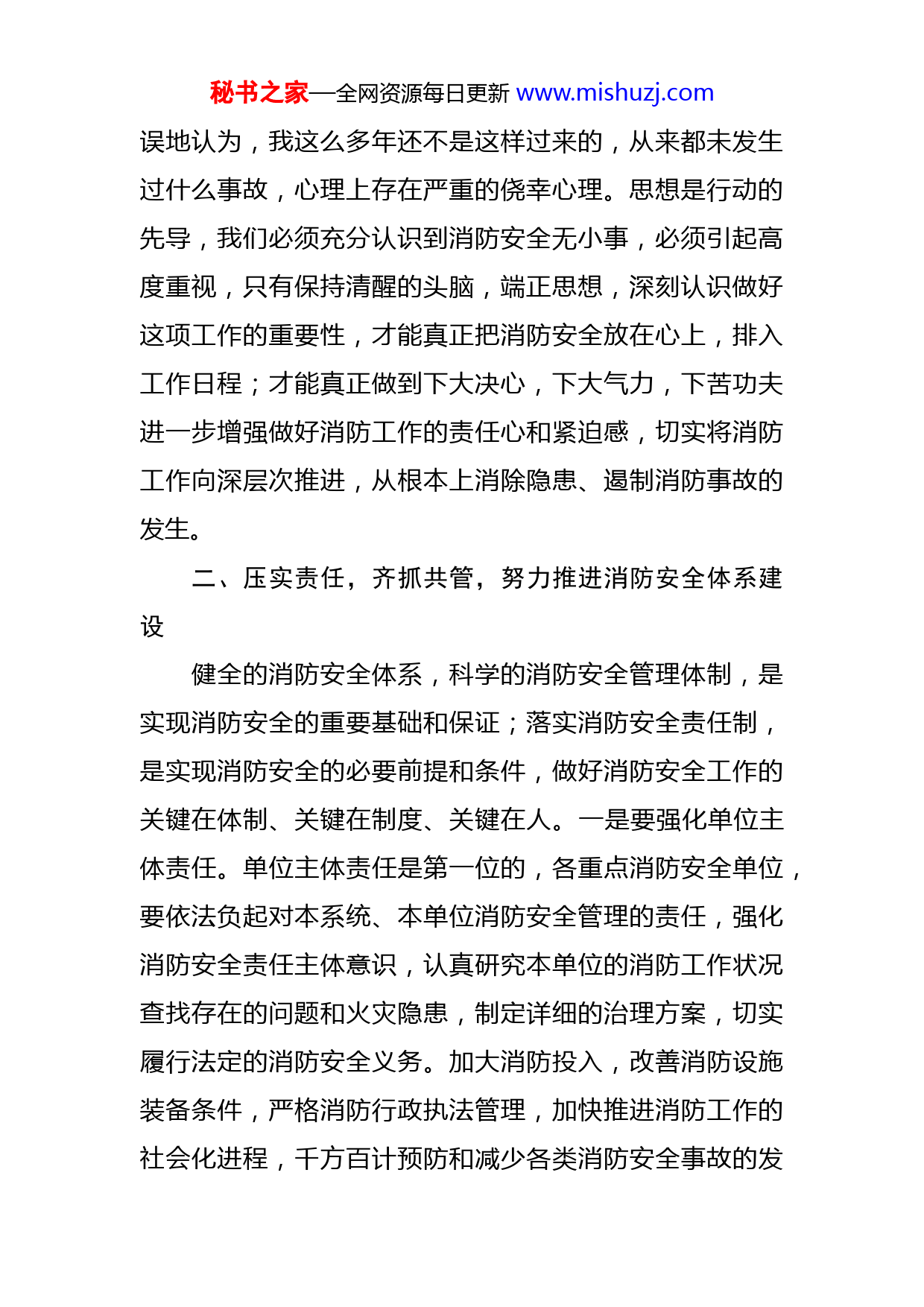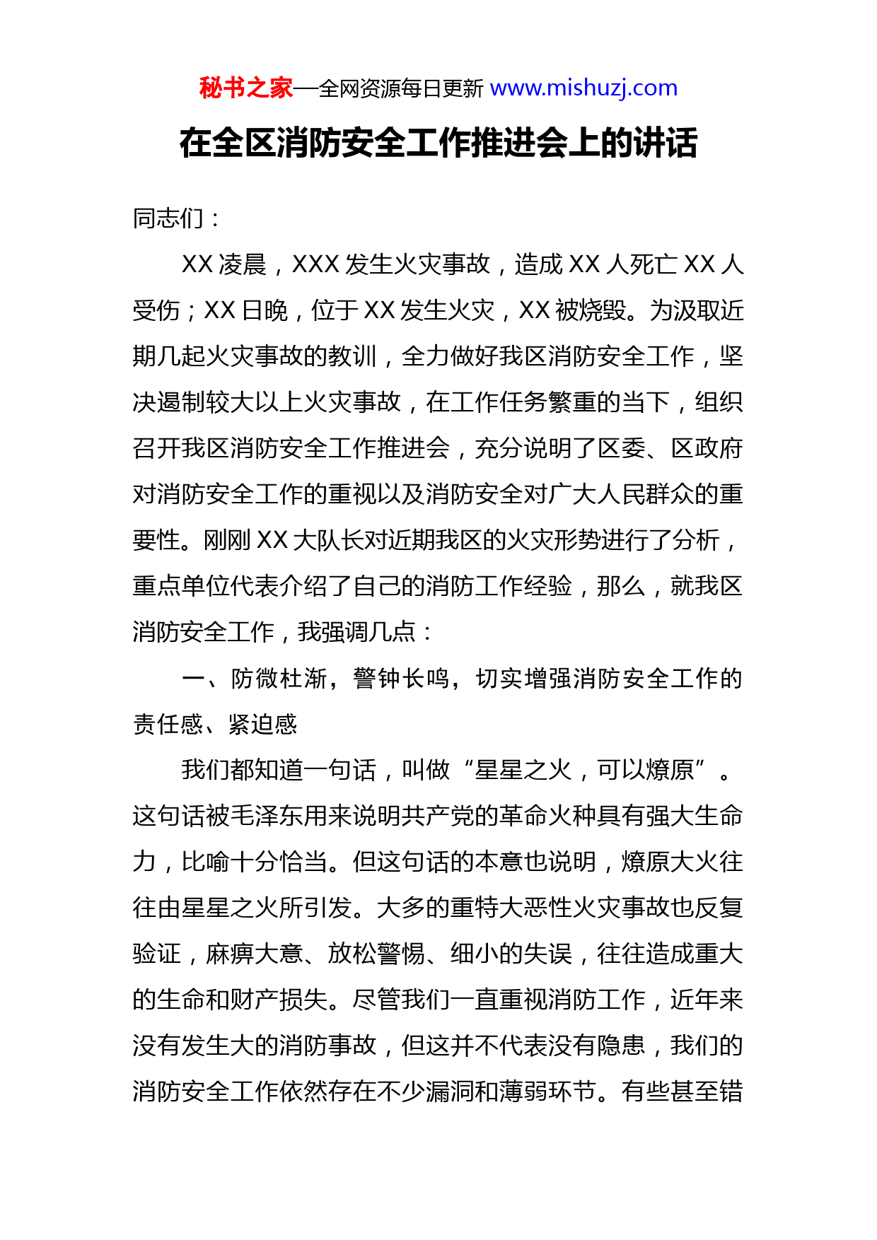 秘书之家—全网资源每日更新www.mishuzj.com在全区消防安全工作推进会上的讲话同志们:XX凌晨,XXX发生火灾事故,造成XX人死亡XX人受伤;XX日晚,位于XX发生火灾,XX被烧毁。为汲取近期几起火灾事故的教训,全力做好我区消防安全工作,坚决遏制较大以上火灾事故,在工作任务繁重的当下,组织召开我区消防安全工作推进会,充分说明了区委、区政府对消防安全工作的重视以及消防安全对广大人民群众的重要性。刚刚XX大队长对近期我区的火灾形势进行了分析,重点单位代表介绍了自己的消防工作经验,那么,就我区消防安全工作,我强调几点:一、防微杜渐,警钟长鸣,切实增强消防安全工作的责任感、紧迫感我们都知道一句话,叫做“星星之火,可以燎原”。这句话被毛泽东用来说明共产党的革命火种具有强大生命力,比喻十分恰当。但这句话的本意也说明,燎原大火往往由星星之火所引发。大多的重特大恶性火灾事故也反复验证,麻痹大意、放松警惕、细小的失误,往往造成重大的生命和财产损失。尽管我们一直重视消防工作,近年来没有发生大的消防事故,但这并不代表没有隐患,我们的消防安全工作依然存在不少漏洞和薄弱环节。有些甚至错秘书之家—全网资源每日更新www.mishuzj.com误地认为,我这么多年还不是这样过来的,从来都未发生过什么事故,心理上存在严重的侥幸心理。思想是行动的先导,我们必须充分认识到消防安全无小事,必须引起高度重视,只有保持清醒的头脑,端正思想,深刻认识做好这项工作的重要性,才能真正把消防安全放在心上,排入工作日程;才能真正做到下大决心,下大气力,下苦功夫进一步增强做好消防工作的责任心和紧迫感,切实将消防工作向深层次推进,从根本上消除隐患、遏制消防事故的发生。二、压实责任,齐抓共管,努力推进消防安全体系建设健全的消防安全体系,科学的消防安全管理体制,是实现消防安全的重要基础和保证;落实消防安全责任制,是实现消防安全的必要前提和条件,做好消防安全工作的关键在体制、关键在制度、关键在人。一是要强化单位主体责任。单位主体责任是第一位的,各重点消防安全单位,要依法负起对本系统、本单位消防安全管理的责任,强化消防安全责任主体意识,认真研究本单位的消防工作状况查找存在的问题和火灾隐患,制定详细的治理方案,切实履行法定的消防安全义务。加大消防投入,改善消防设施装备条件,严格消防行政执法管理,加快推进消防工作的社会化进程,千方百计预防和减少各类消防安全事故的发秘书之家—全网资源每日更新www.mishuzj.com生。同时,还要与消防部门紧密配合,通力协作,切实形成强有力的消防安全工作机制。二是要强化部门管理责任。《消防法》中明确规定了“行业和职能部门是所属单位消防安全管理的责任主体”。各机关、各部门,要按照“谁主管、谁负责”的原则,认真履行职责,各司其职,密切配合,切实加强对本部门、本行业所属单位的具体指导和检查、监督;强化消防安全监督管理职能,把整改火灾隐患的消防安全责任落到实处。三、扬长补短,抓住重点,创新推动我区消防工作新进展今年,在区委区政府的领导下,在各位的共同努力下在我们消防员夜以继日的艰辛付出下,全区消防安全形势持续向好,成绩值得充分肯定!但是,我们在看到成绩的同时,也应该看到不足,比如我区现在还有部分老旧城区存在消防设施老化且资金短缺无人维修的现象;部分物业管理水平需要提升;单位消控室持证上岗问题也有待加强消防工作任务繁重,涉及面广,必须紧紧抓住牵动消防工作全局的重点工作和重大问题,以点上的突破带动消防工作实现全面新发展。首先是街道社区以及重点单位的主体责任的落实问题。街道社区与千家万户的联络最为紧密,因此要抓好消防安全网格化建设,夯实火灾防控基础,预防和减少火灾事故的发生。各重点单位要重点对照“六个秘书之家—全网资源每日更新www.mishuzj.com一”措施,开展消防安全自查自纠,建立和运行微型消防站,安排消控室值班人员培训并持证上岗,提升消防安全重点单位自身管理水平和安全意识。其次是消防安全宣传教育问题。我们要立足实效,多渠道提高全民消防意识,消防宣传培训教育是提高全民消防素质、推进消防工作社会化、减少火灾发生的重要途径和措施,依托政府购买宣教服务,做到人人懂消防,各单位负责人更是要成为懂消防法律法规、懂消防建设、懂消防管理、懂火灾扑救的消防工作“带头人”“明白人”。现在全区各中小学校也都已经开学了,各个学校也要开展好消防宣传活动,加强青少年消防安全教育,达到“教育一个学生、带动一个家庭影响整个社会”的效果。同志们,消防工作任务艰巨,责任重大,关键还是在于落实。各部门、各单位要树立强烈的政治意识、责任意识和忧患意识,把思想和行动统一到区委、区政府的工作部署上来,以更加坚决的态度、更加饱满的精神、更加有力的措施、更加扎实的作风,进一步开创我区消防工作的新局面,为我区创造更加优良的消防安全环境。