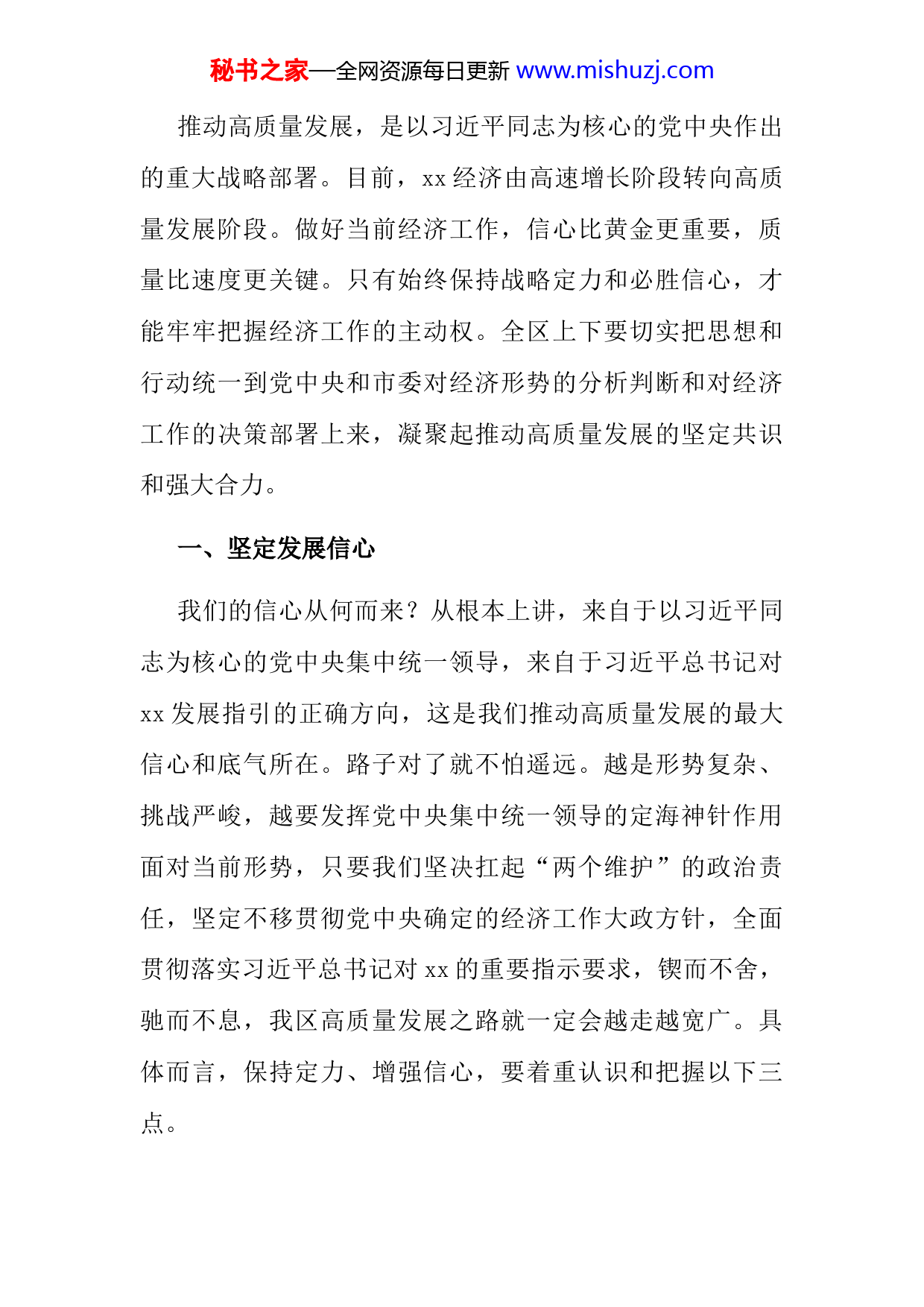 秘书之家—全网资源每日更新www.mishuzj.com推动高质量发展,是以习近平同志为核心的党中央作出的重大战略部署。目前,xx经济由高速增长阶段转向高质量发展阶段。做好当前经济工作,信心比黄金更重要,质量比速度更关键。只有始终保持战略定力和必胜信心,才能牢牢把握经济工作的主动权。全区上下要切实把思想和行动统一到党中央和市委对经济形势的分析判断和对经济工作的决策部署上来,凝聚起推动高质量发展的坚定共识和强大合力。一、坚定发展信心我们的信心从何而来?从根本上讲,来自于以习近平同志为核心的党中央集中统一领导,来自于习近平总书记对xx发展指引的正确方向,这是我们推动高质量发展的最大信心和底气所在。路子对了就不怕遥远。越是形势复杂、挑战严峻,越要发挥党中央集中统一领导的定海神针作用面对当前形势,只要我们坚决扛起“两个维护”的政治责任,坚定不移贯彻党中央确定的经济工作大政方针,全面贯彻落实习近平总书记对xx的重要指示要求,锲而不舍,驰而不息,我区高质量发展之路就一定会越走越宽广。具体而言,保持定力、增强信心,要着重认识和把握以下三点。秘书之家—全网资源每日更新www.mishuzj.com(一)要在抓住用好战略机遇中保持定力、增强信心。当今世界面临着百年未有之大变局。习近平总书记在中央经济工作会议上强调,我国发展仍处于并将长期处于重要战略机遇期的基本判断是正确的,要求我们紧扣重要战略机遇期的新内涵,坚定不移抓机遇、用机遇。机遇就在眼前,发展正当其时。我们一定要善于发现新机遇、把握新机遇、用好新机遇,努力把机遇转化为项目实体,转化为发展动能,转化为民生福祉,转化为高质量发展的实际成果。要抓住用好加快经济结构优化升级带来的新机遇。当前,全球新一轮科技革命和产业变革方兴未艾,新产业新业态层出不穷,大家都站在同一条起跑线上。xx产业基础雄厚,主城区位优势明显,开放平台众多,拥有丰富的科教和人才资源,这些是我们推动经济结构优化升级的独特优势。我们要顺应发展大势,加快改造提升传统产业,加快培育发展新兴产业,推动产业向价值链中高端迈进,构建起面向未来的经济结构。要抓住用好提升科技创新能力带来的新机遇。科技无界,创新无疆。当前,全球科技创新进入空前密集活跃时期,世界主要经济体纷纷抢占发展制高点,正在重构全球创新秘书之家—全网资源每日更新www.mishuzj.com版图、重塑全球经济结构。我们有信息产业发展的良好基础,有中国智谷这块金字招牌。我们要抓住契机,深入实施以大数据智能化为引领的创新驱动发展战略行动计划,为经济高质量发展增添新的动能和优势。要抓住用好深化改革开放带来的新机遇。改革开放是推动经济高质量发展的关键一招。我们对标对表中央和市委要求,深化行政审批、投融资、国企等领域改革,用好xx经开区、自贸区等开放平台,改革开放各项事业稳步推进这些举措,既增加了体制机制活力,也为我区发展打开了新空间、提供了新动力。我们要乘势而上,通过深化改革破除体制机制障碍,通过扩大开放倒逼相关改革,变压力为推动经济高质量发展的动力。要抓住用好加快绿色发展带来的新机遇。加强生态文明建设、加强环境治理本身就是新形势下经济发展的重要推动力。xx具有好山好水自然基础,拥有xx等重要生态资源,发展生态产业的条件良好。我们要学好用好绿水青山就是金山银山“两山论”,从大生态破题,走深走实产业生态化、生态产业化“两化路”,加快构建以产业生态化和生态产业化为主体的生态经济体系,实现百姓富、生态美两者有机统一。秘书之家—全网资源每日更新www.mishuzj.com要抓住用好宏观调控政策带来的新机遇。今年中央将继续实施稳健的货币政策,发展多层次资本市场,提高直接融资比重,解决好民营企业和小微企业融资难、融资贵问题;继续实施积极的财政政策,着力实施更大规模的减税降费、更大力度优化财政支出结构、更加有效发挥地方政府债券作用。特别是较大幅度增加地方政府专项债券规模为保障重点项目建设、防范风险提供了有力支持。(二)要在巩固提升良好态势中保持定力、增强信心。面对疫情冲击,过去一年,在市委、市政府的坚强领导下我们保持定力、坚定信心、推动转型,经济发展做实向优xx建设起步良好,xx等重点项目扎实推进,招商引资取得显著突破,城市提升与乡村振兴协调发展,改革开放不断深化,生态文明建设力度加强,社会事业和民生改善持续推进,区域经济在困难中向高质量发展迈进,应该说我们是抓住了重要的战略窗口期,为未来发展埋下了“种子”增添了后劲。当前的xx政治生态持续向好、干部群众精神状态积极向上、经济社会发展各项事业稳步向前,全区上下发展的力度空前,干事创业的氛围日益浓厚,攻坚克难的正能量更加强劲。秘书之家—全网资源每日更新www.mishuzj.com通过深化供给侧结构性改革,发展质量效率正稳步提高。以“三去一降一补”为重点,打好破、立、降组合拳,着力化解过剩产能,切实降低企业成本,加快补齐短板,积极防范各类风险,企业生产效率有所提升,税收质量逐步改善。通过推进大数据智能化创新,发展新动能正积极释放。深入实施以大数据智能化为引领的创新驱动发展战略行动计划,推动数字