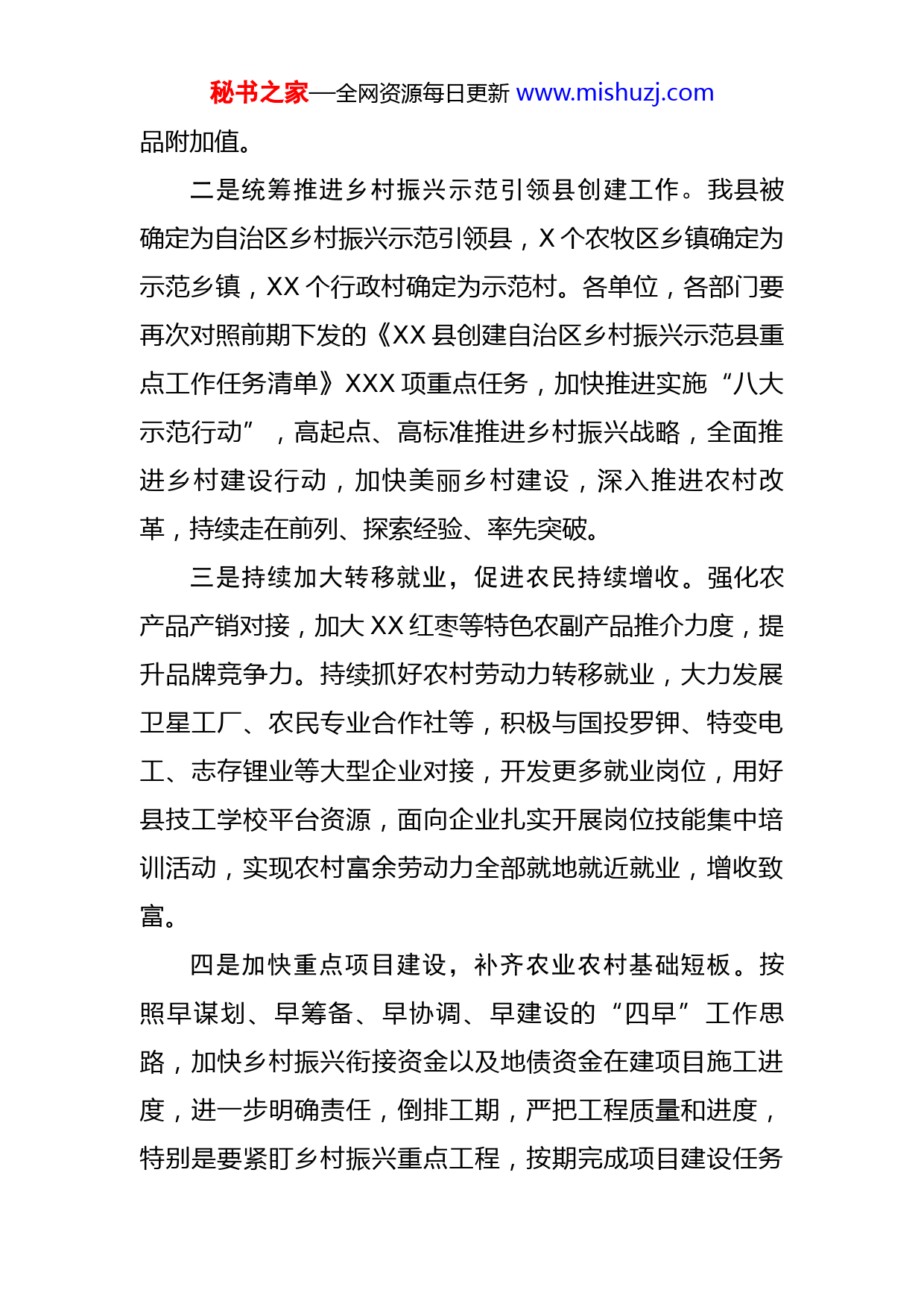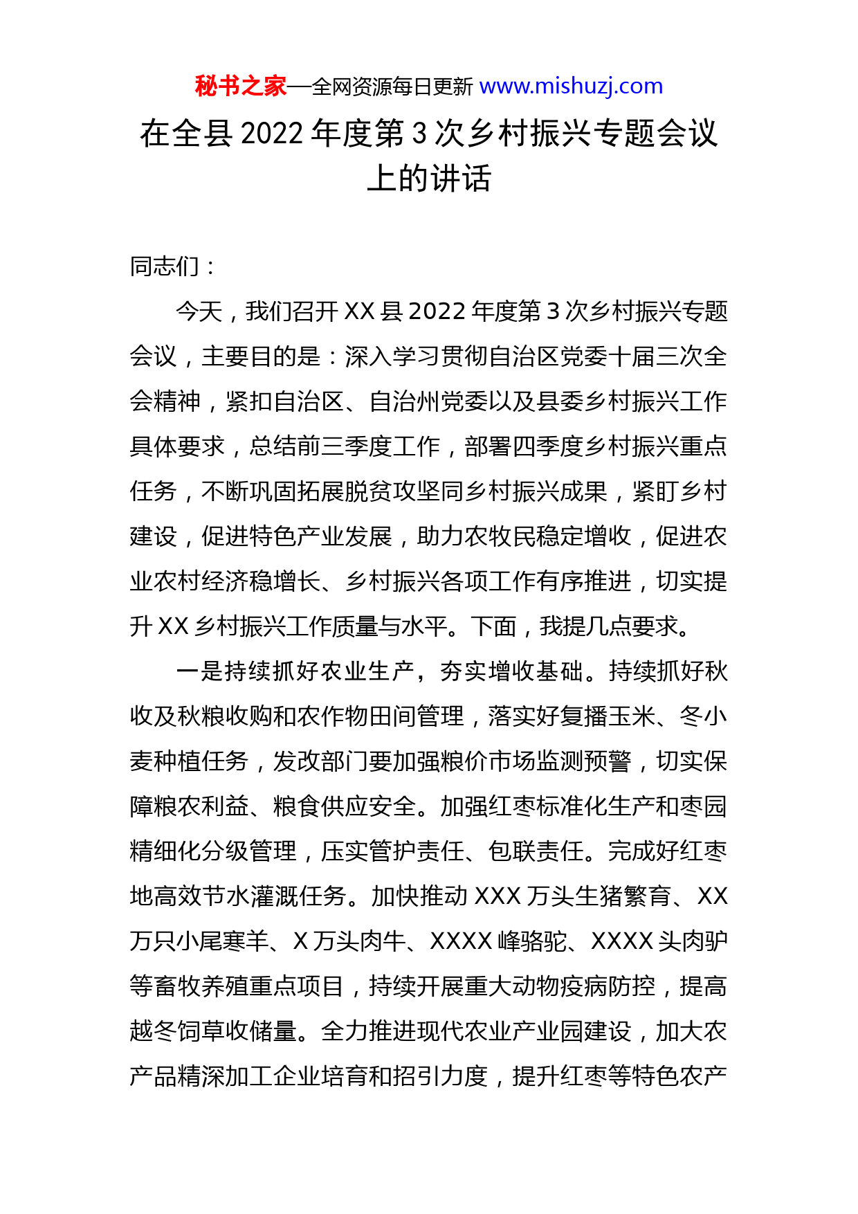 秘书之家—全网资源每日更新www.mishuzj.com在全县2022年度第3次乡村振兴专题会议上的讲话同志们:今天,我们召开XX县2022年度第3次乡村振兴专题会议,主要目的是:深入学习贯彻自治区党委十届三次全会精神,紧扣自治区、自治州党委以及县委乡村振兴工作具体要求,总结前三季度工作,部署四季度乡村振兴重点任务,不断巩固拓展脱贫攻坚同乡村振兴成果,紧盯乡村建设,促进特色产业发展,助力农牧民稳定增收,促进农业农村经济稳增长、乡村振兴各项工作有序推进,切实提升XX乡村振兴工作质量与水平。下面,我提几点要求。一是持续抓好农业生产,夯实增收基础。持续抓好秋收及秋粮收购和农作物田间管理,落实好复播玉米、冬小麦种植任务,发改部门要加强粮价市场监测预警,切实保障粮农利益、粮食供应安全。加强红枣标准化生产和枣园精细化分级管理,压实管护责任、包联责任。完成好红枣地高效节水灌溉任务。加快推动XXX万头生猪繁育、XX万只小尾寒羊、X万头肉牛、XXXX峰骆驼、XXXX头肉驴等畜牧养殖重点项目,持续开展重大动物疫病防控,提高越冬饲草收储量。全力推进现代农业产业园建设,加大农产品精深加工企业培育和招引力度,提升红枣等特色农产秘书之家—全网资源每日更新www.mishuzj.com品附加值。二是统筹推进乡村振兴示范引领县创建工作。我县被确定为自治区乡村振兴示范引领县,X个农牧区乡镇确定为示范乡镇,XX个行政村确定为示范村。各单位,各部门要再次对照前期下发的《XX县创建自治区乡村振兴示范县重点工作任务清单》XXX项重点任务,加快推进实施“八大示范行动”,高起点、高标准推进乡村振兴战略,全面推进乡村建设行动,加快美丽乡村建设,深入推进农村改革,持续走在前列、探索经验、率先突破。三是持续加大转移就业,促进农民持续增收。强化农产品产销对接,加大XX红枣等特色农副产品推介力度,提升品牌竞争力。持续抓好农村劳动力转移就业,大力发展卫星工厂、农民专业合作社等,积极与国投罗钾、特变电工、志存锂业等大型企业对接,开发更多就业岗位,用好县技工学校平台资源,面向企业扎实开展岗位技能集中培训活动,实现农村富余劳动力全部就地就近就业,增收致富。四是加快重点项目建设,补齐农业农村基础短板。按照早谋划、早筹备、早协调、早建设的“四早”工作思路,加快乡村振兴衔接资金以及地债资金在建项目施工进度,进一步明确责任,倒排工期,严把工程质量和进度,特别是要紧盯乡村振兴重点工程,按期完成项目建设任务秘书之家—全网资源每日更新www.mishuzj.com和资金拨付,补齐农业基础短板,努力扩大农业有效投资。加大涉农领域招商力度,加快培育、扶持一批涉农牧业龙头企业,促进红枣、蜂蜜、猪肉等农畜产品加工业与餐饮、旅游等产业融合,推进乡村民宿、田园观光采摘发展,拓展农业增值空间。紧盯X个乡村振兴试点乡镇关键点,辐射带动全县乡村形成工农互促、城乡互补、协调发展、共同繁荣的新型工农城乡关系,加快农业农村现代化。五是建立健全乡村振兴组织领导机制。严格实行“双组长制”,各乡镇、各乡村振兴成员单位党政主要负责同志要负总责、亲自抓,当好乡村振兴“总指挥”,分管负责同志分工抓、具体抓,做到分工明确、责任到人;县委农村工作领导小组和乡村振兴领导小组落实统筹责任,发挥好牵头抓总、统筹协调作用,要强化领导小组办公室决策参谋、统筹协调、政策指导、推动落实、督促检查等职能,领导小组成员单位分工负责、形成合力;农业农村局牵头负责产业振兴工作,乡村振兴局具体负责巩固拓展脱贫攻坚成果、统筹推进实施乡村振兴战略有关具体工作,要继续落实好县直部门单位联系包联村帮扶机制,深入开展“千企帮千村”活动,持续推进国有企业、民营企业“一对一”包联帮扶行政村机制,提升对口帮扶和包联成效。严格实行乡村振兴战略实施情况报告制度,领导小组秘书之家—全网资源每日更新www.mishuzj.com成员单位要定期向县乡村振兴领导小组报告推进实施乡村振兴战略进展情况。要将推进乡村振兴战略实绩纳入各乡镇、各有关部门单位领导班子、领导干部年度绩效考核重要内容,加强考核结果应用,健全问责约谈制度,强化专项督查、交叉考核、群众满意度调查,切实推动政策举措落实到位。同志们,做好今年乡村振兴工作,时间紧、任务重,大家要充分发扬“为民服务孺子牛、创新发展拓荒牛、艰苦奋斗老黄牛”三牛精神,真抓实干、埋头苦干,奋力开创XX县全面推进乡村振兴新局面,以优异成绩迎接党的二十大胜利召开!